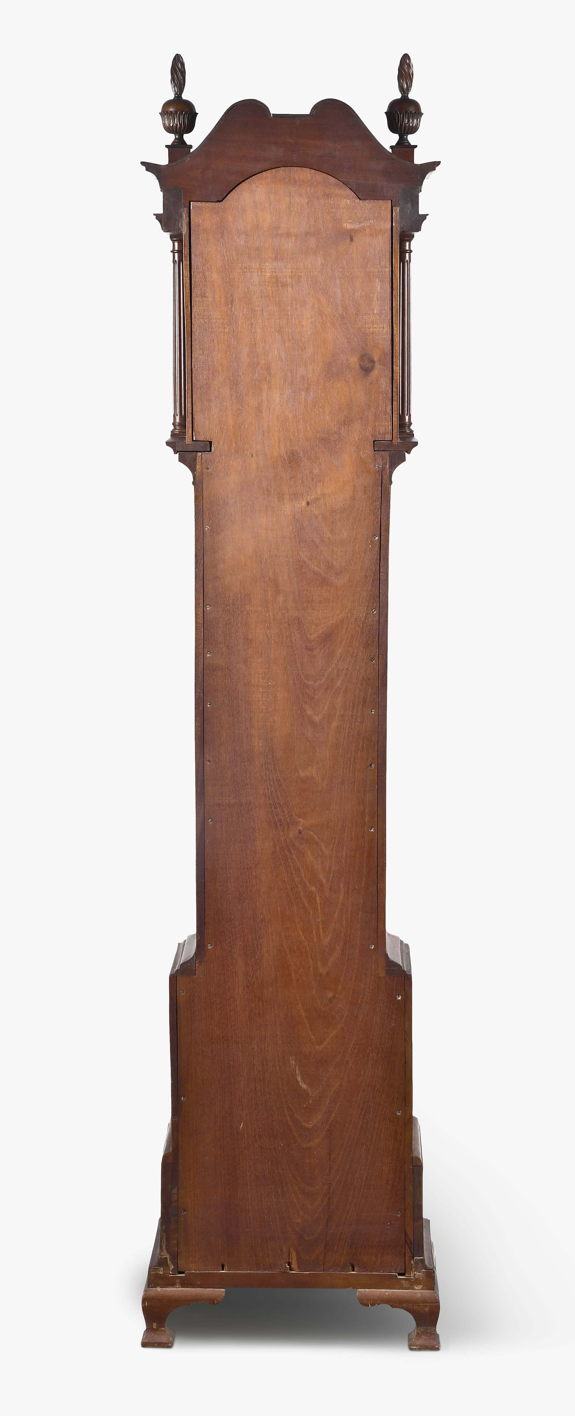 J.W. Shepherd, Waltham, Mass., bench made grandmother clock done as an approximately a two thirds scale copy of a mid eighteenth century Thomas Claggett of Newport, Rhode Island tall clock, in a well made solid cherry case with scalloped trunk door, bracket feet, reeded hood columns, scroll top and turned flame finials, 7.5in x 10in brass dial with cast brass spandrels, engraved silvered chapter ring with roman and arabic numerals, silvered boss with figural image in arch, silvered date aperture and blued steel hands, well made weight driven movement of eight day duration striking on a bell, brass clad pendulum bob, detailed schematic plans included