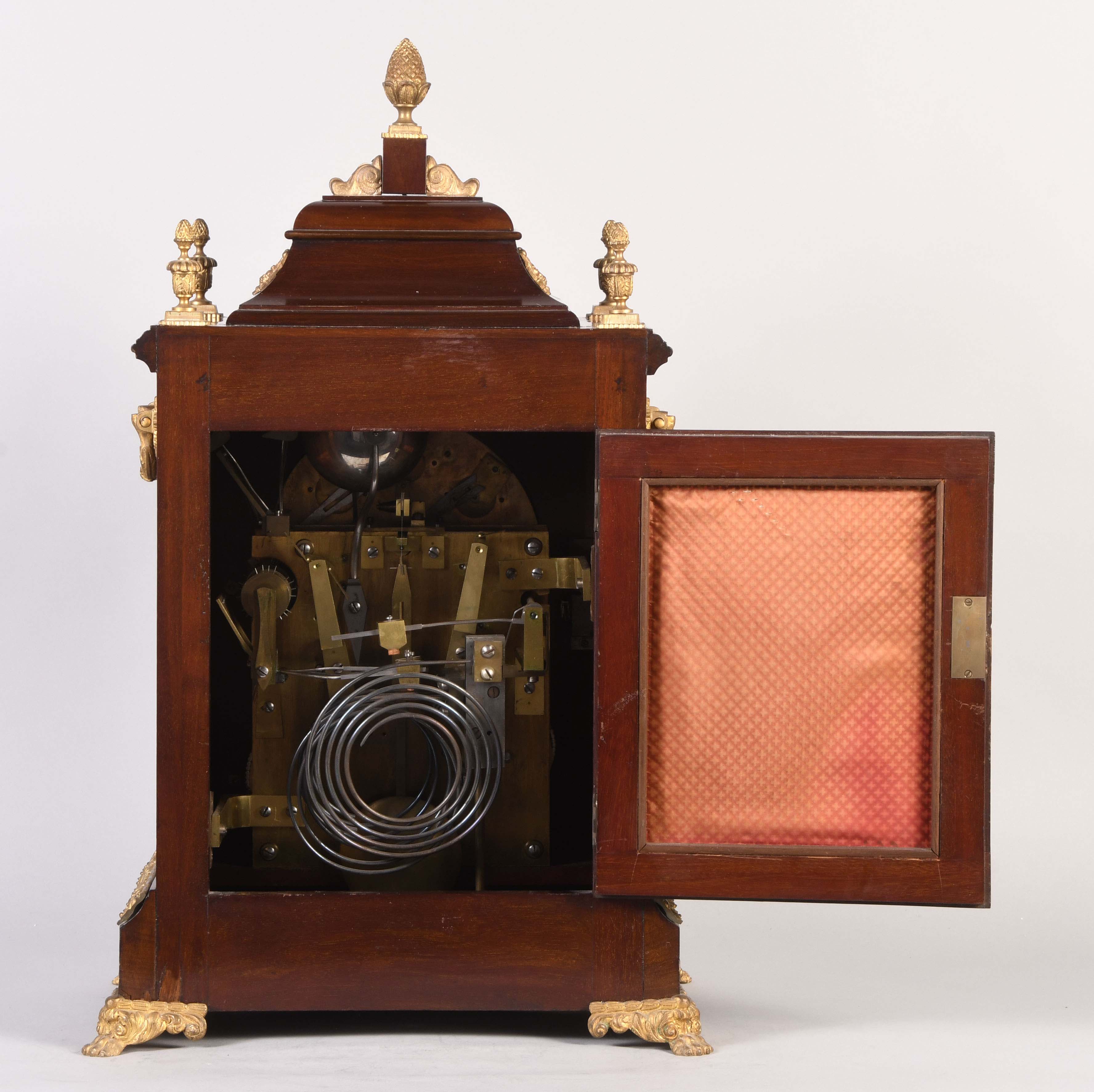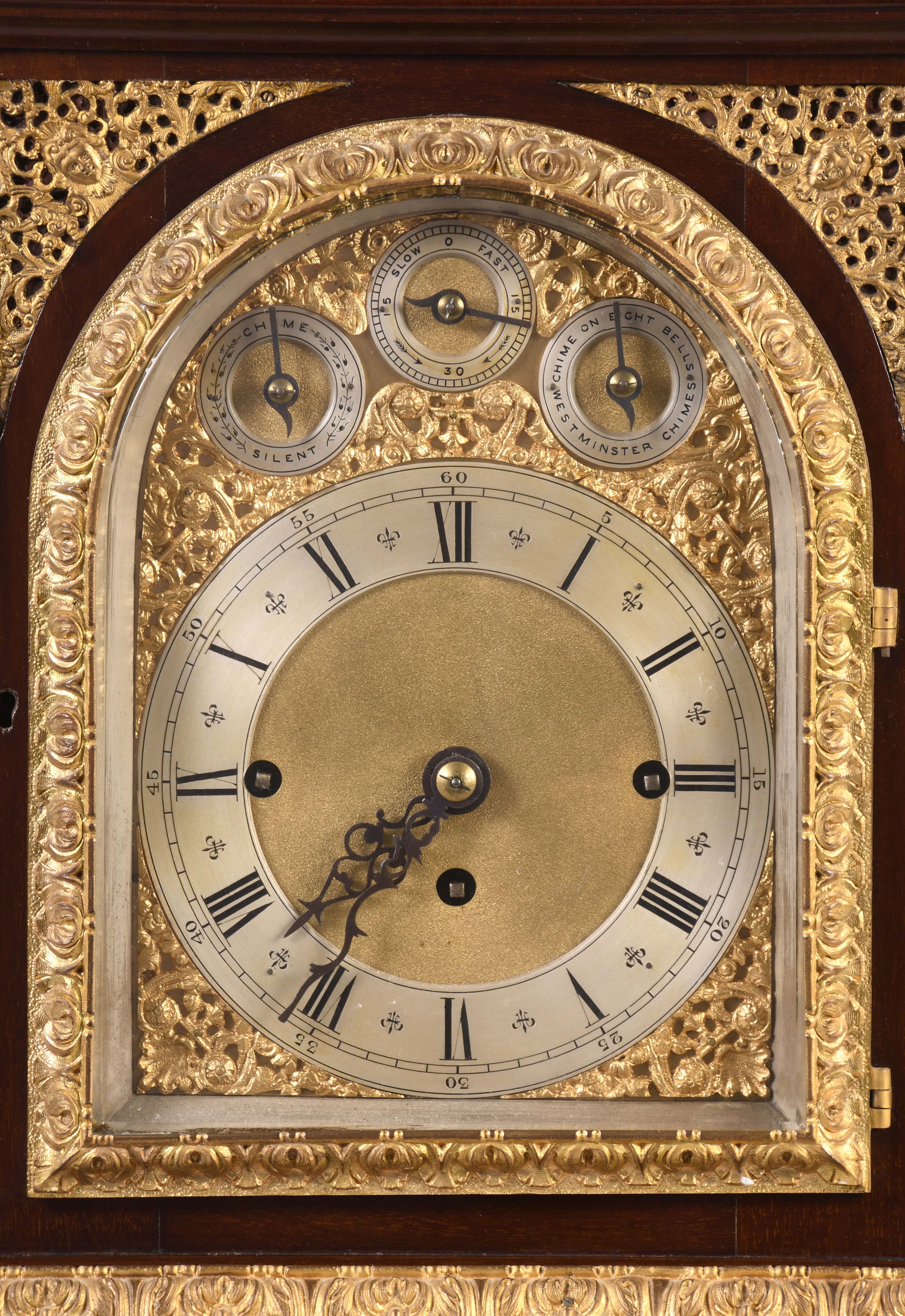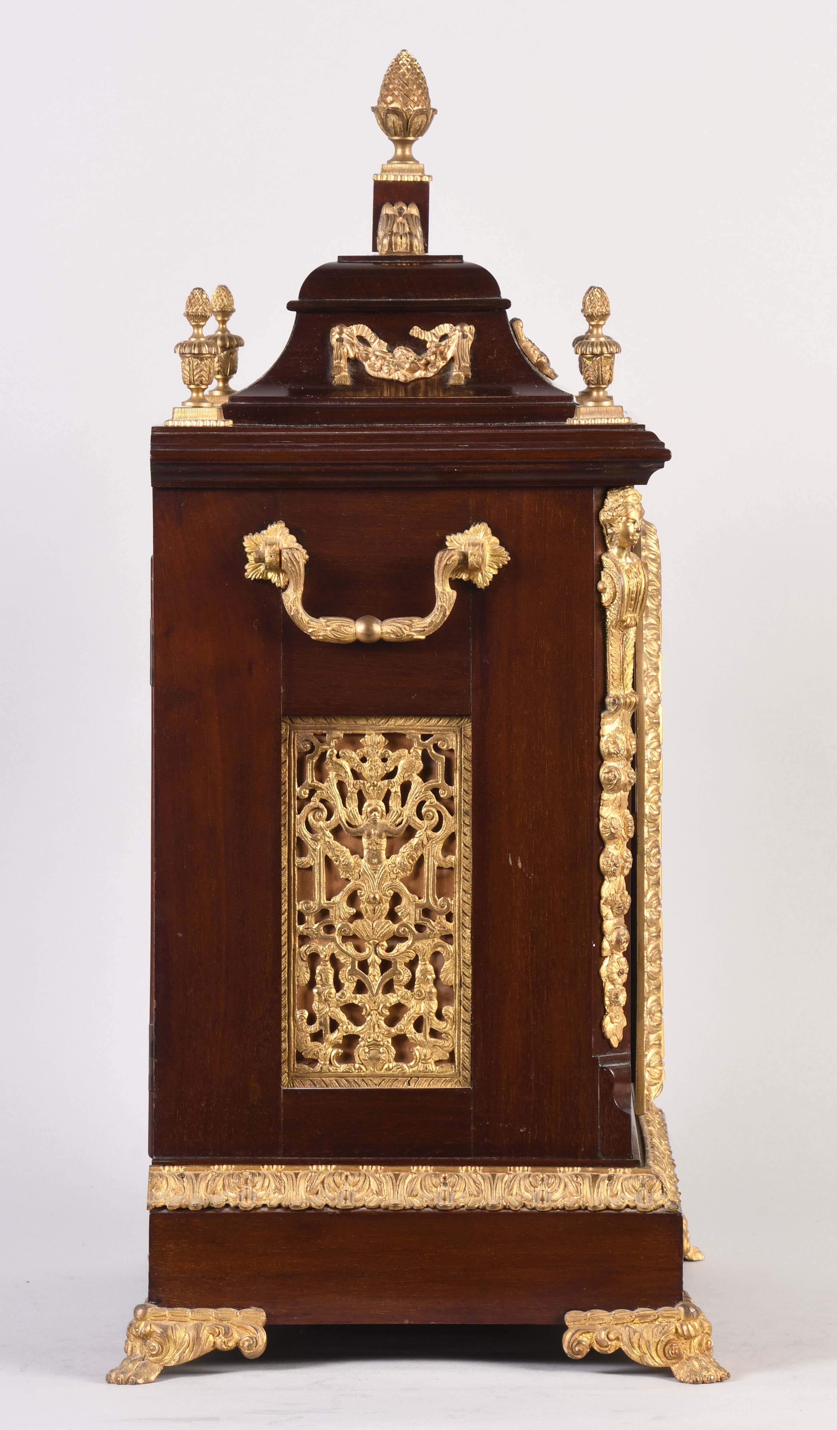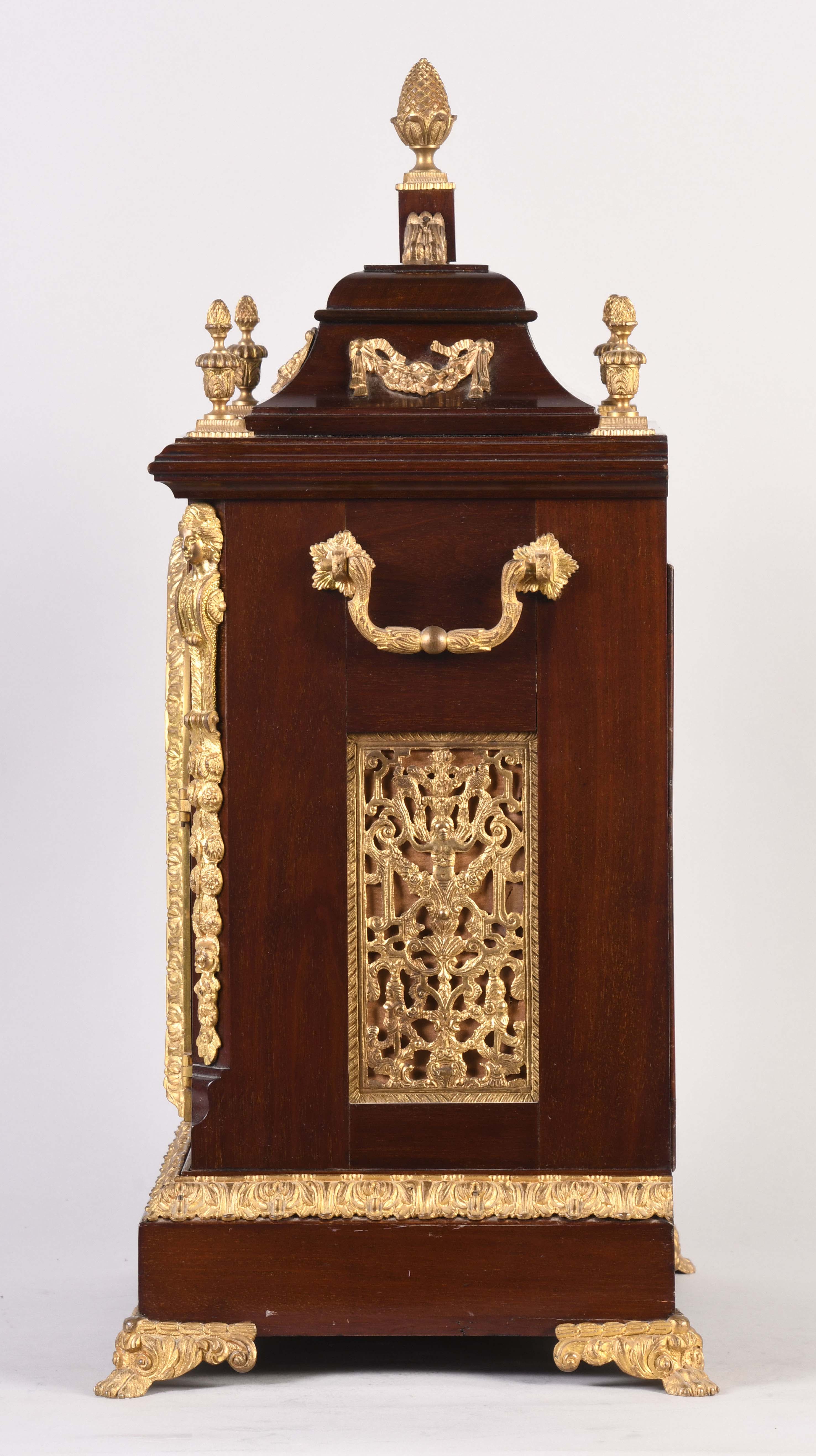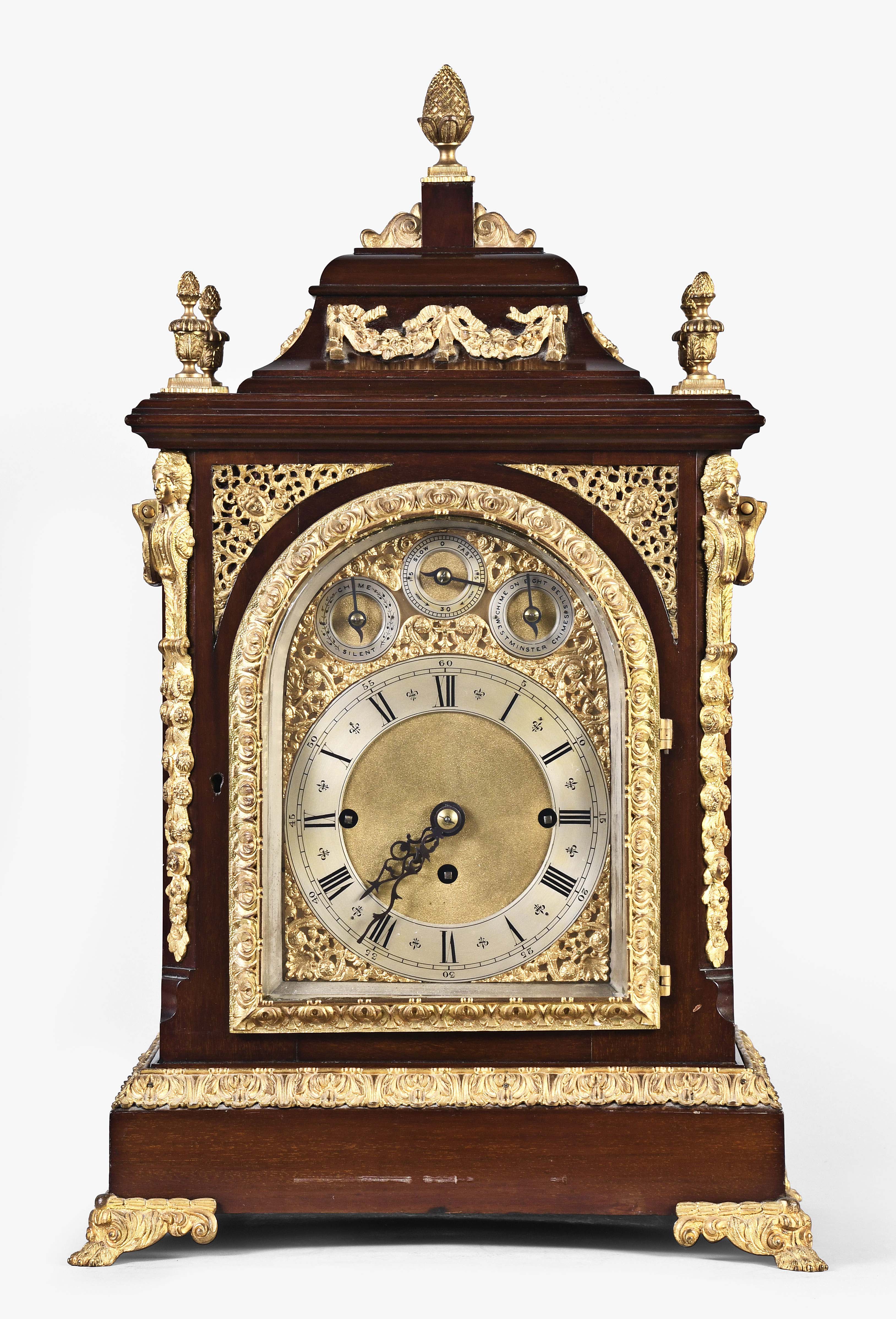 England, a late 19th century quarter striking bracket clock, mahogany veneer case on brass paw feet, caryatids and side frets with religious ornamentation, cornice garland appliqué, gilt band on the base, cast pineapple finials, composite dial with roman numeral silvered chapter ring, matted center and subsidiaries in the break arch for chimes, gilt mask spandrels, blued steel foliate hands, triple chain fusee movement, gongs for the hours and