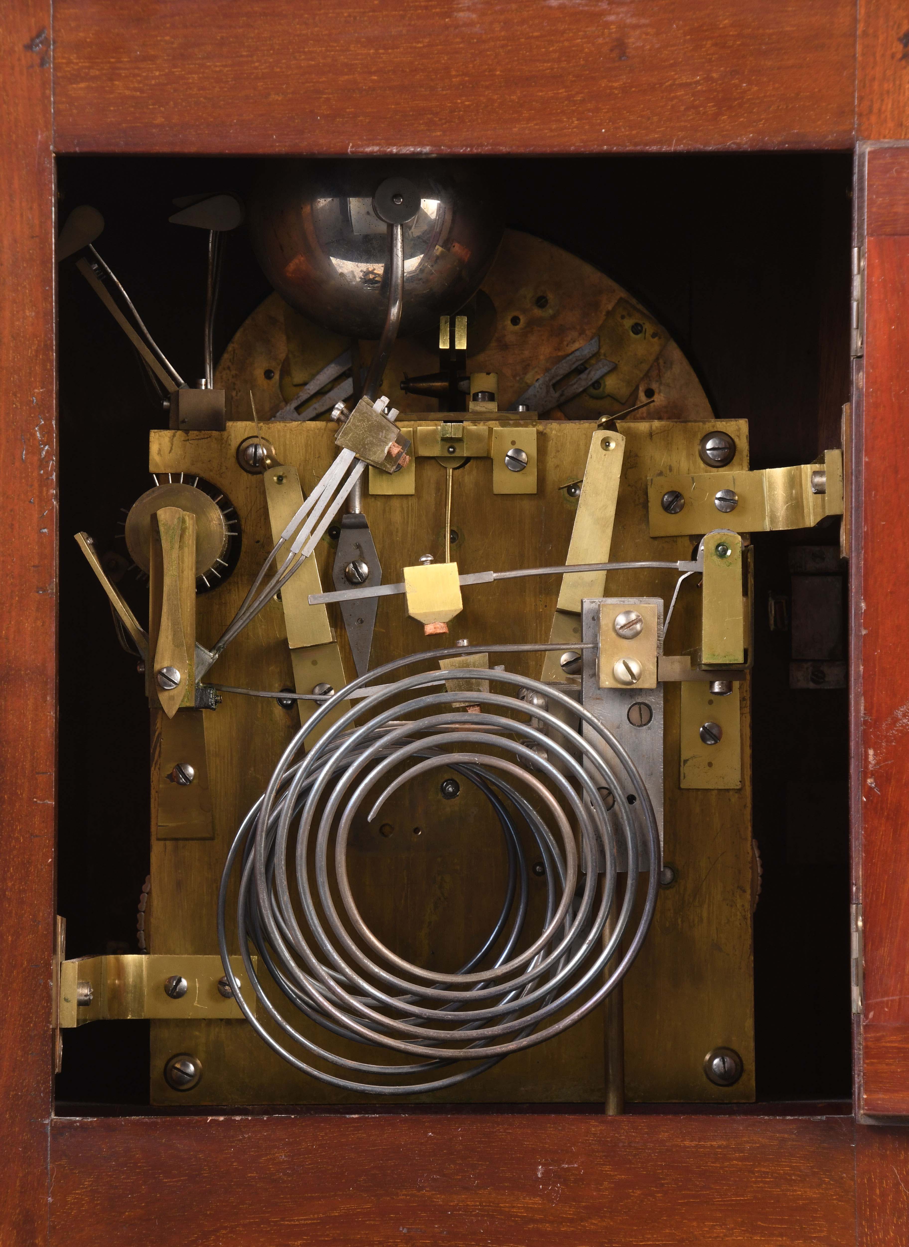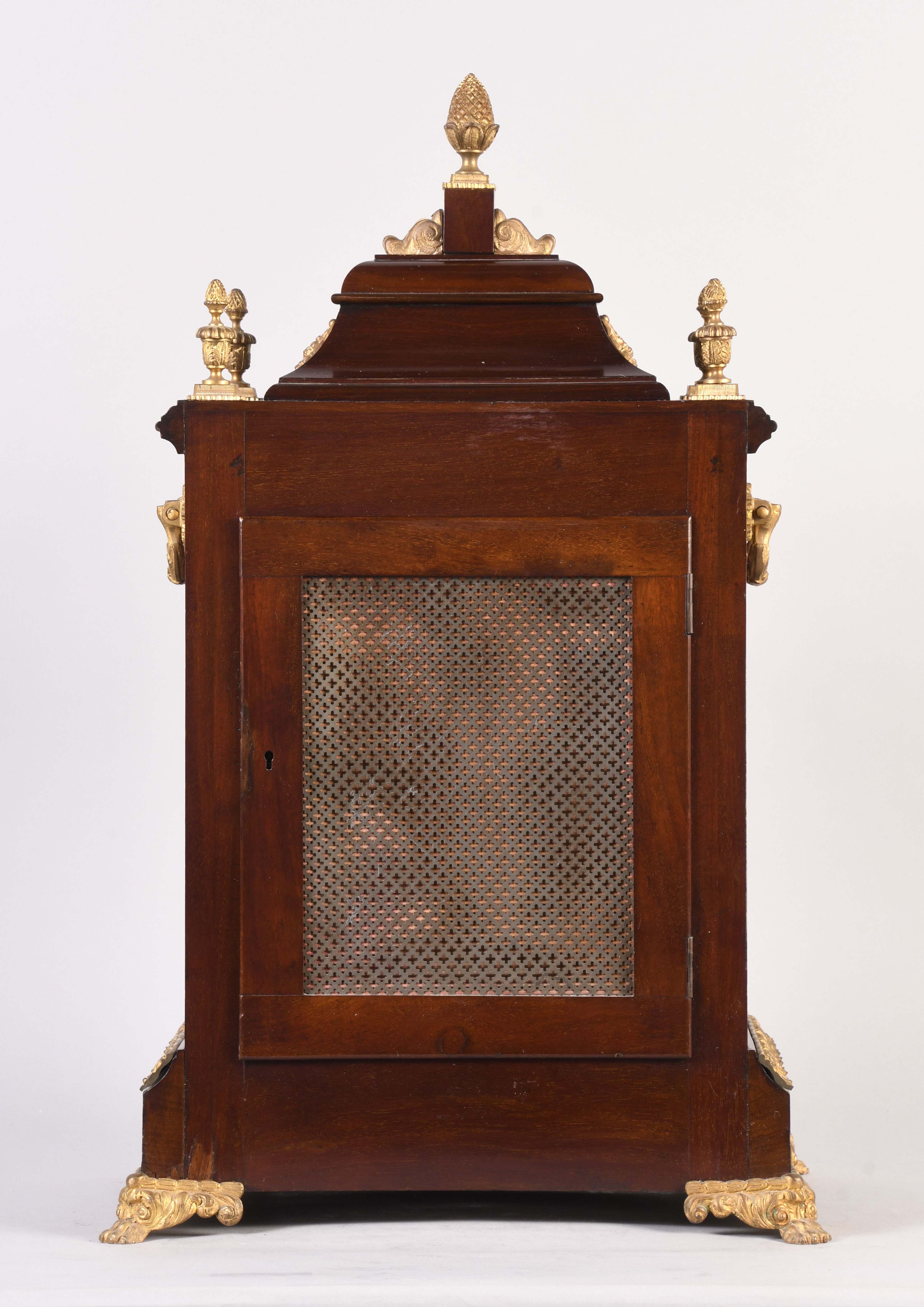 tarnish on gilt ornaments, case in overall good shape with minor losses and a scratch on the front base, both doors lacking keys and the front door is locked, one of the finials is loose and is included; minor tears in the fret fabric, unused holes in the base; movement is dirty, strike side fusee wheel has a tooth improperly repaired, movement is unsigned
