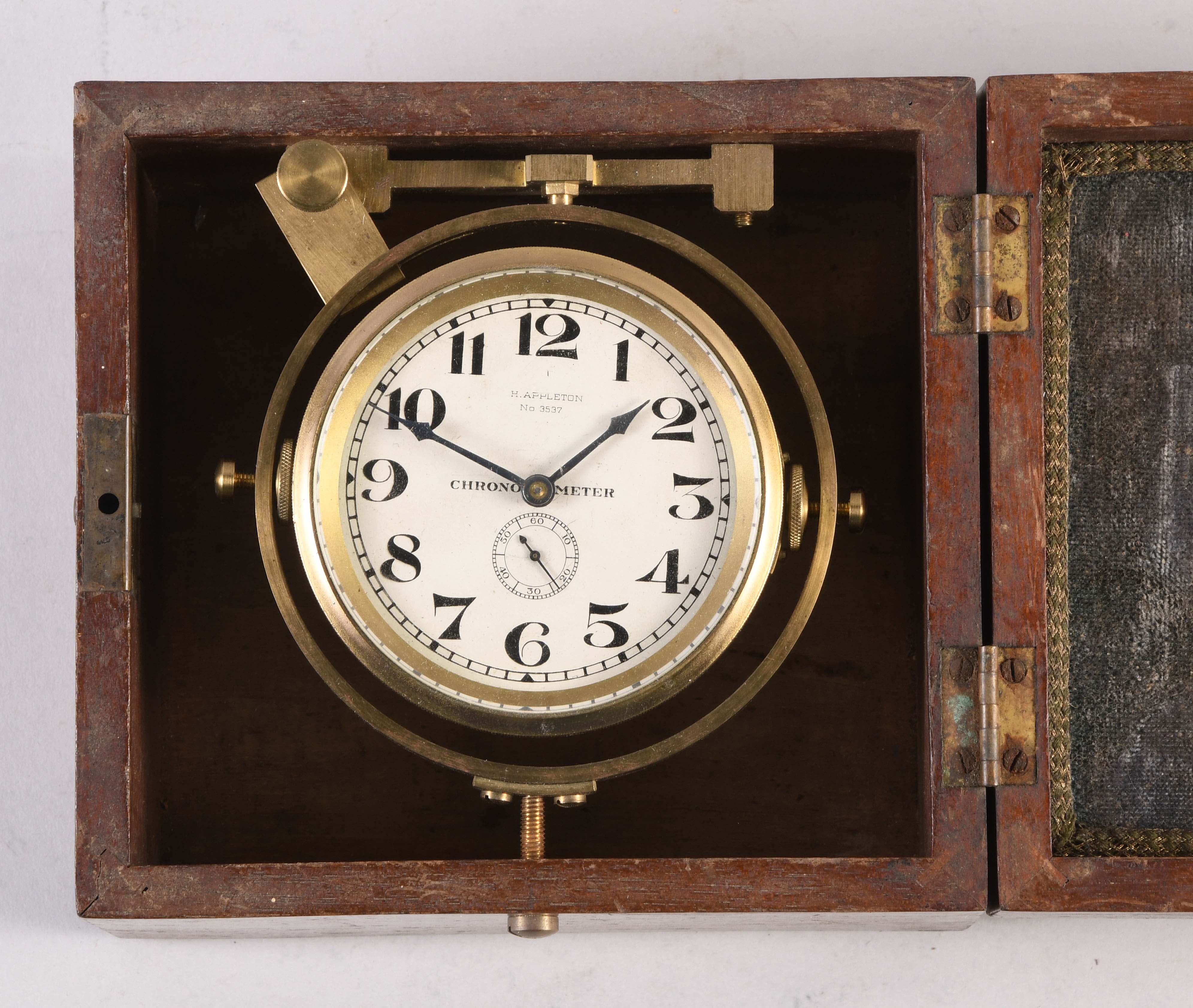 Henry Appleton, London, a mid 19th century pocket chronometer movement mounted for deck use, 15 jewel, key wound and set, gilt half plate fusee movement with freesprung cut bimetallic balance and helical spring, diamond endstone, and Earnshaw's escapement, mounted in a gimballed, weighted brass bowl, the signed arabic numeral silvered dial with subsidiary seconds and blued steel hands, all contained in a hardwood box, serial #5537