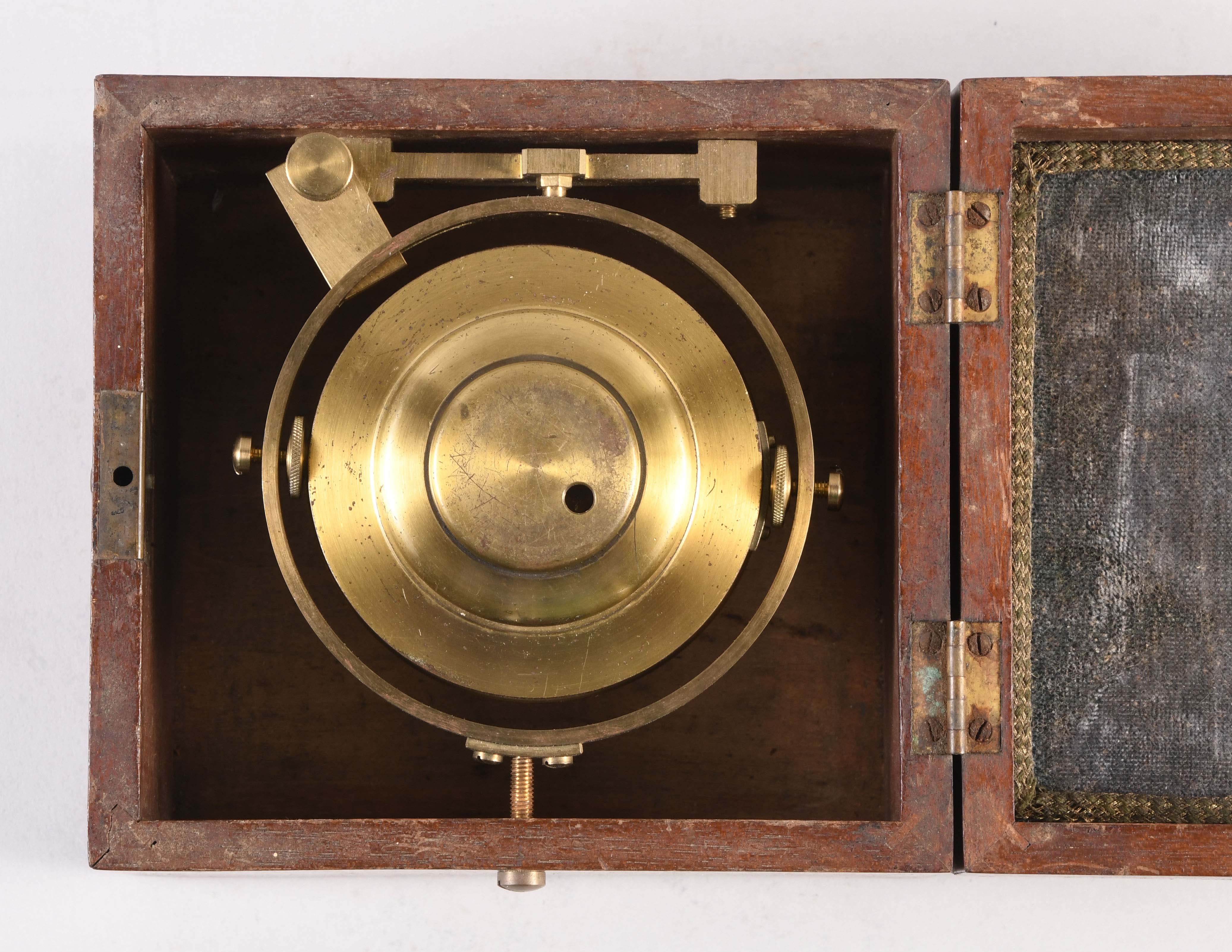 box with significant scratches and losses to finish; dial with a few very minor scratches, glass with scratches, gimbal, bowl and hardware with minor discoloration and tarnish; running