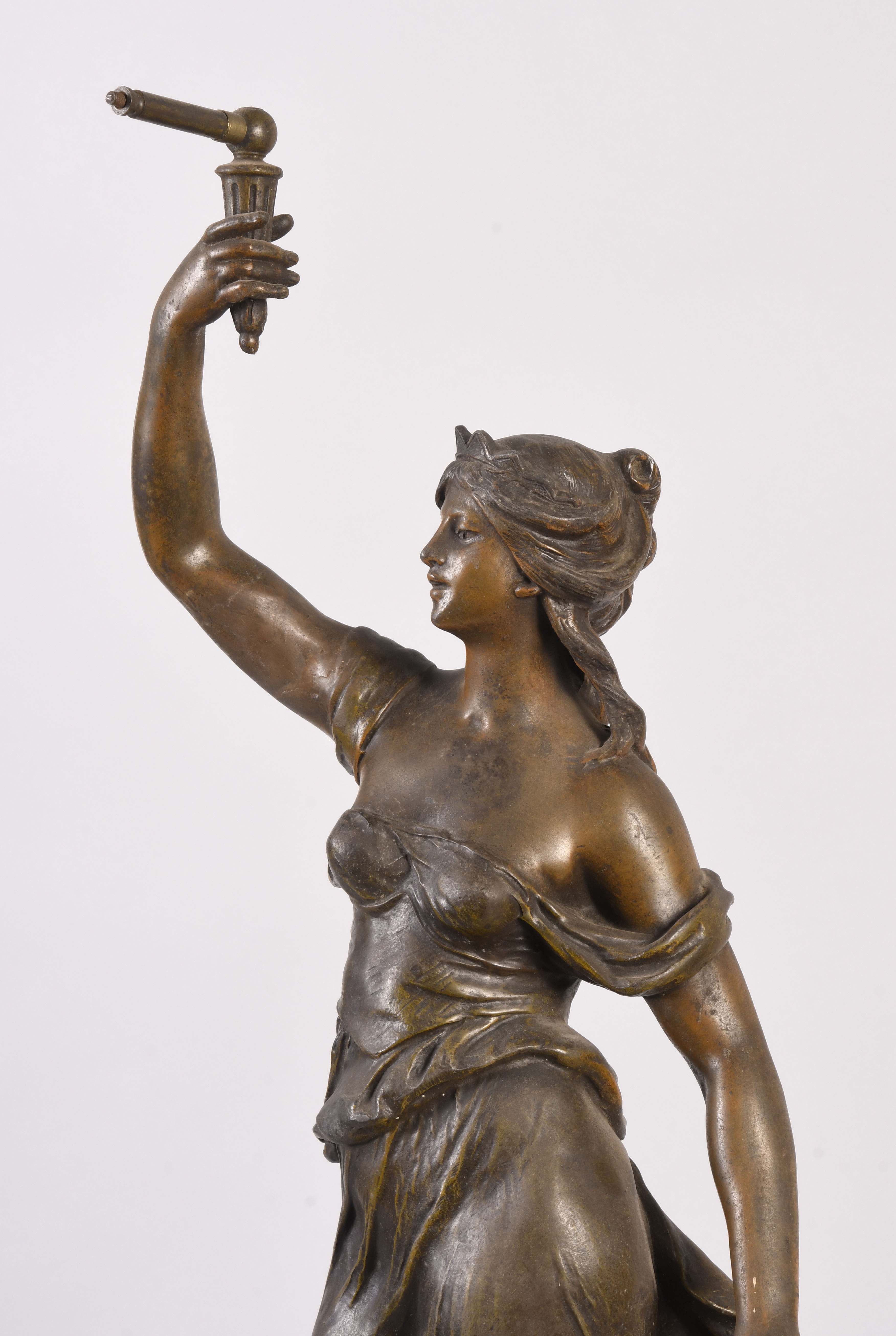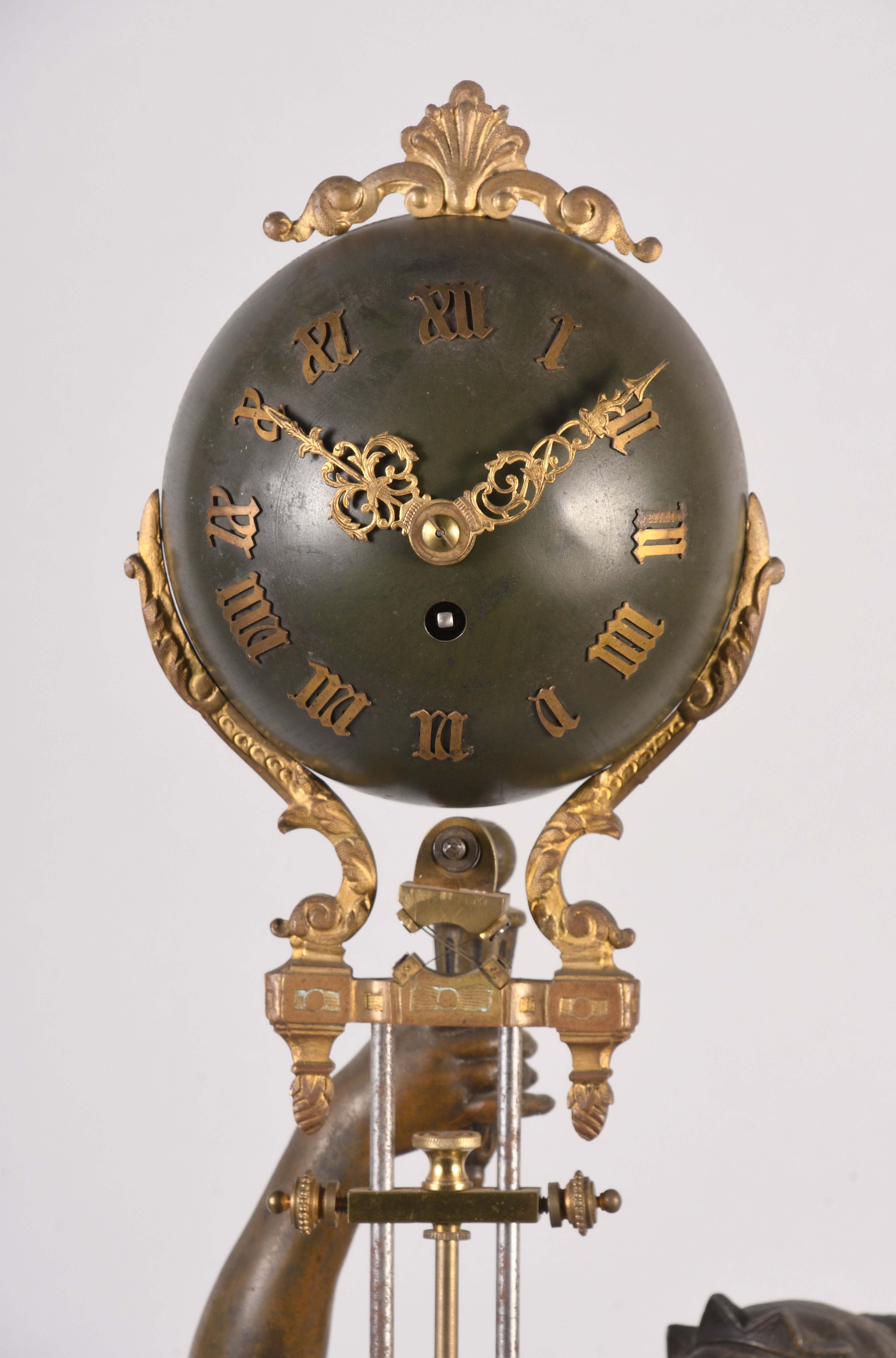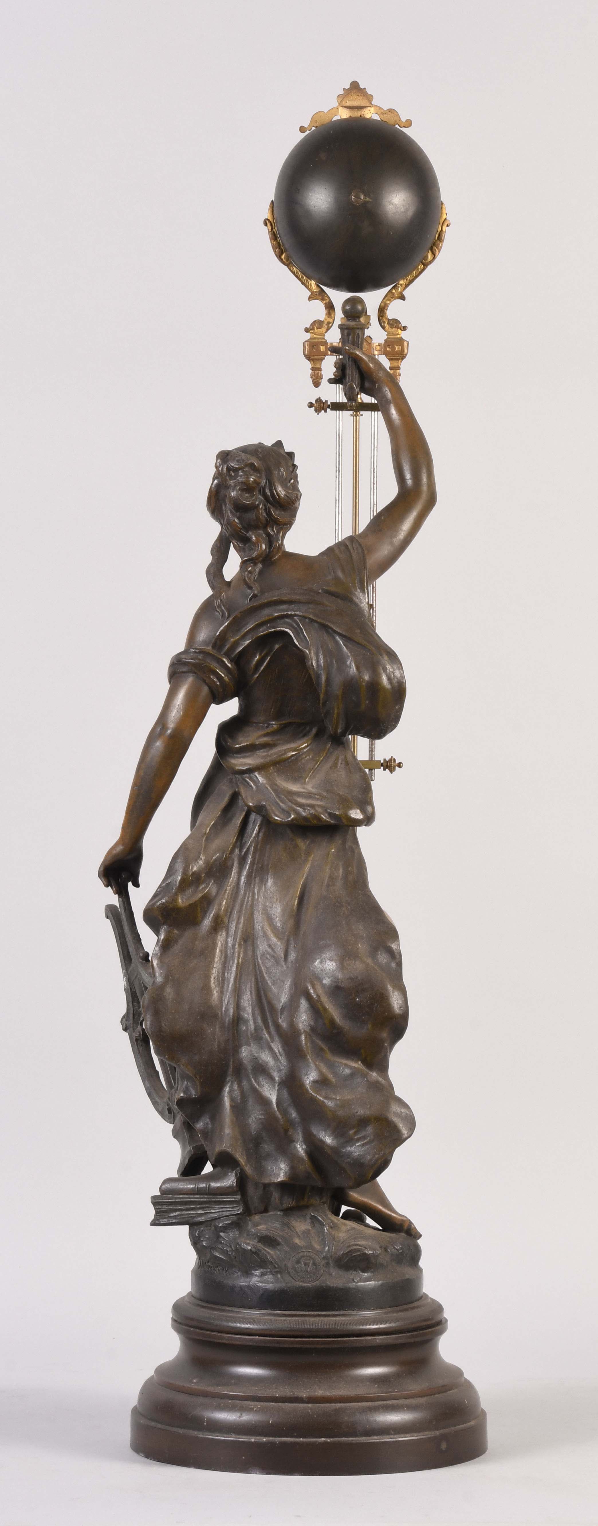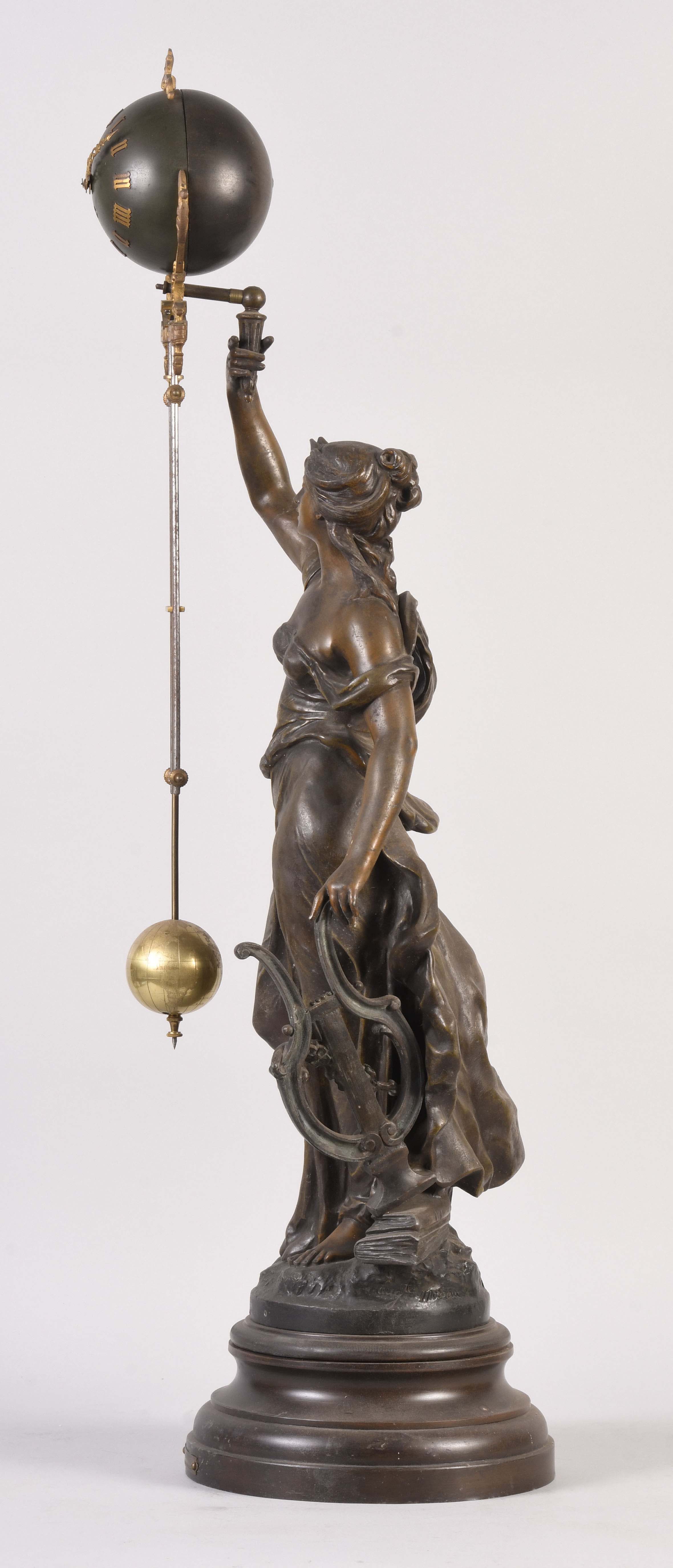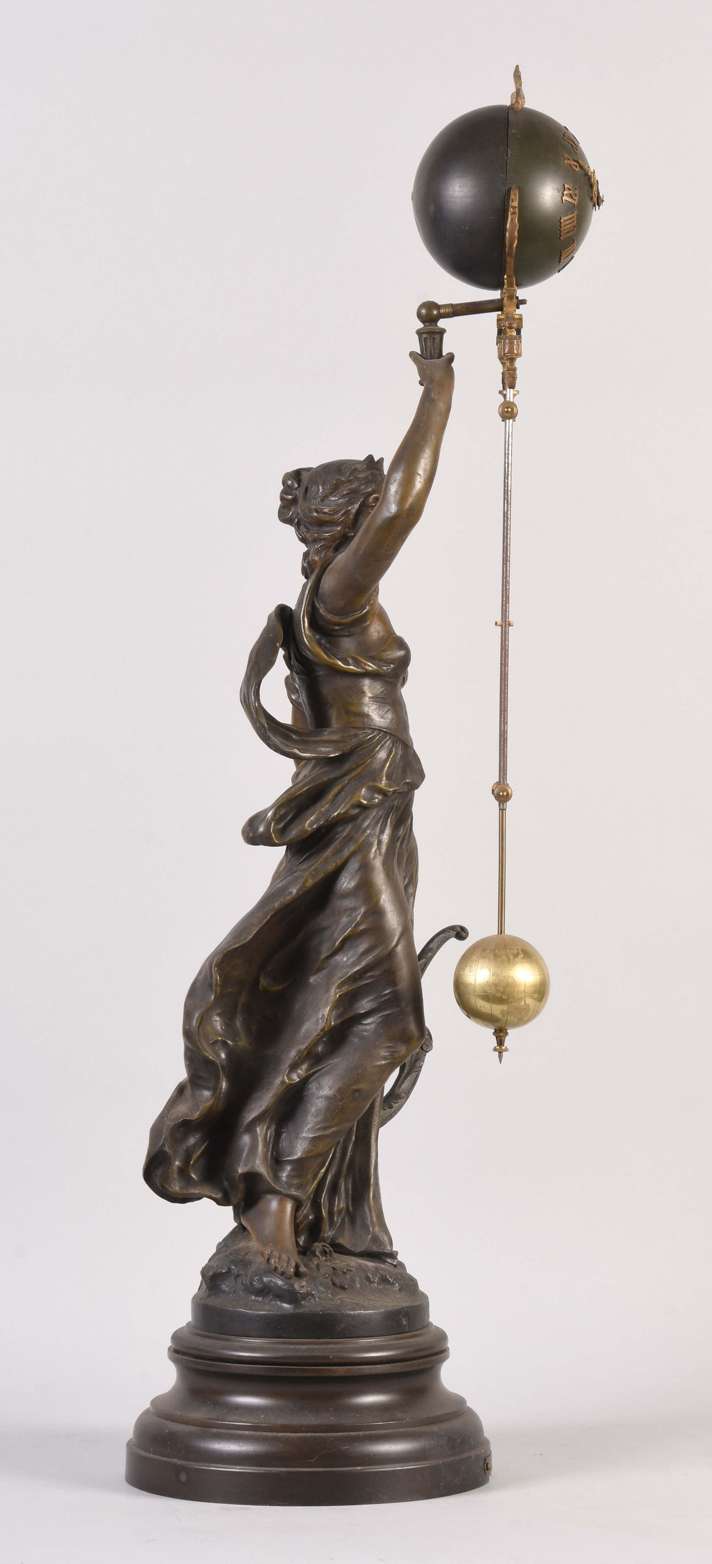 France, an early 20th century swinging mystery clock, the patinated spelter standing female figure with lyre and books at her feet, the round, molded plinth with engraved plaque reading "L'Eloquence Par A. Moreau Med. D'Or", her right arm held aloft and supporting the swinging compound pendulum, the eight day timepiece contained in the patinated, upper sphere, with gothic roman numerals and Louis XIV style hands above the three rod, gridiron style pendulum with spherical bob with terrestrial globe engraving