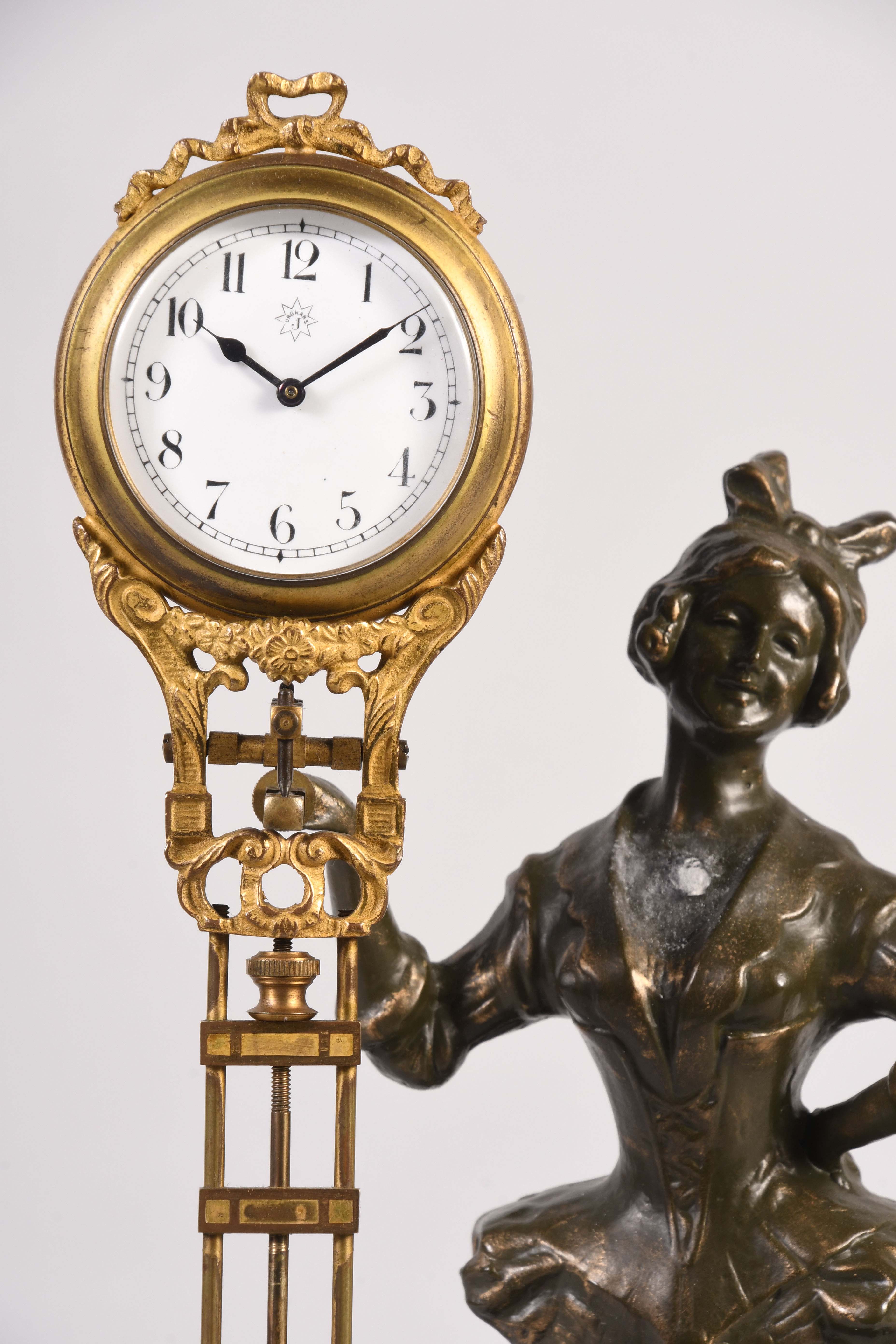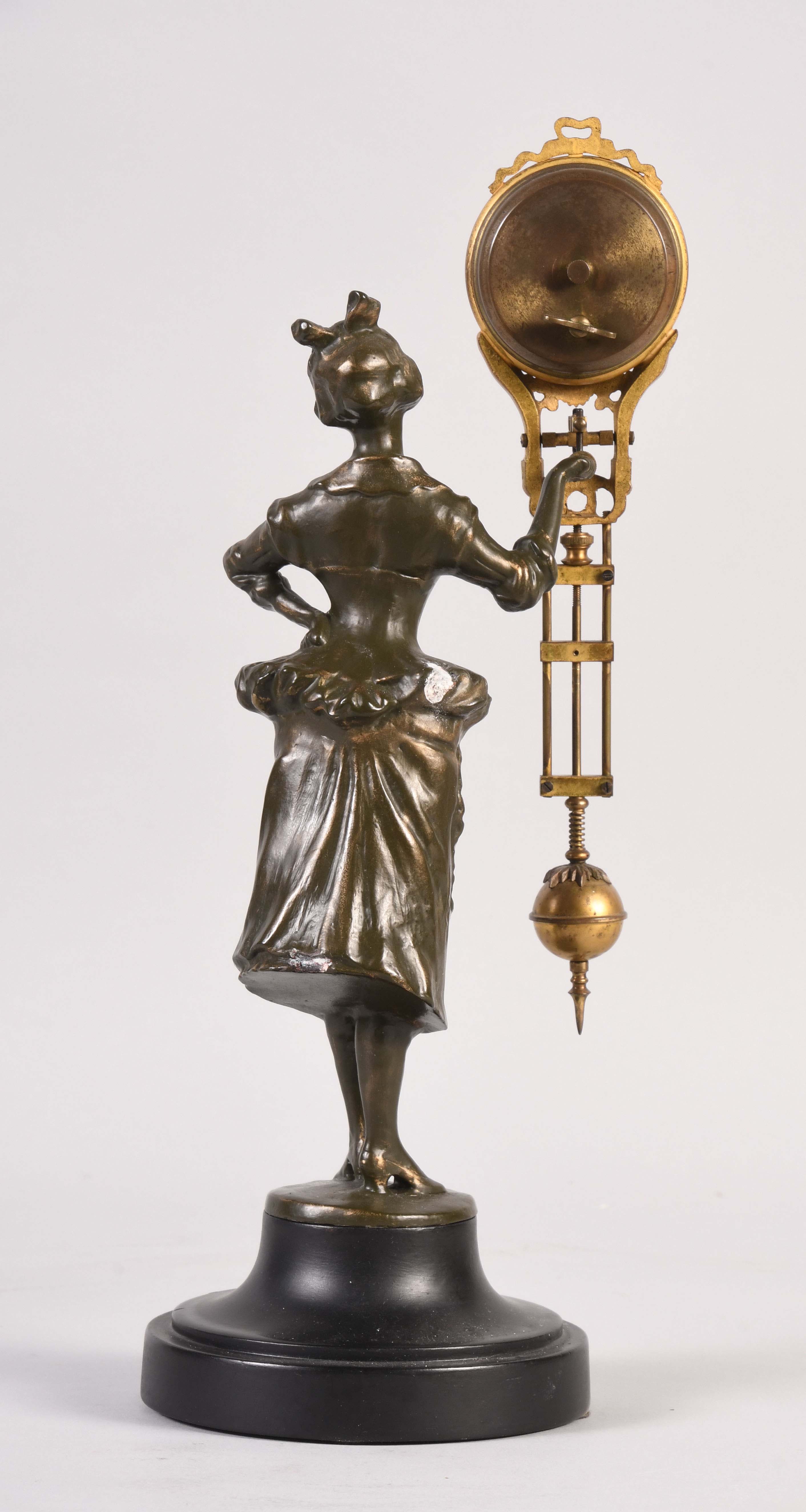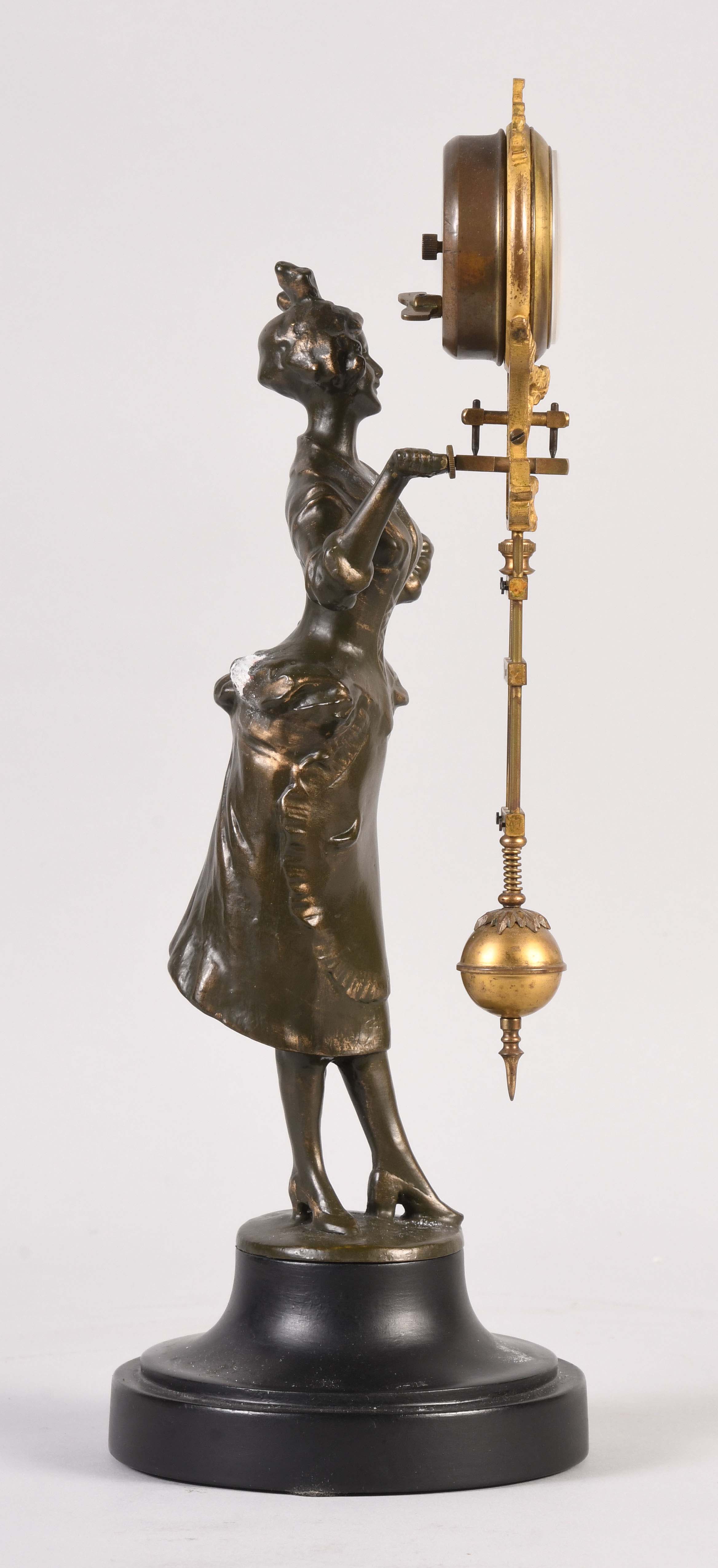 Junghans, Germany, "Barmaid" swinging mystery clock, the figure standing on a turned, ebonized base and supporting a gilt #1 compound pendulum, white enamel arabic numeral dial with JJ" trademark, blued spade and pointer hands, and eight day time only, spring driven movement