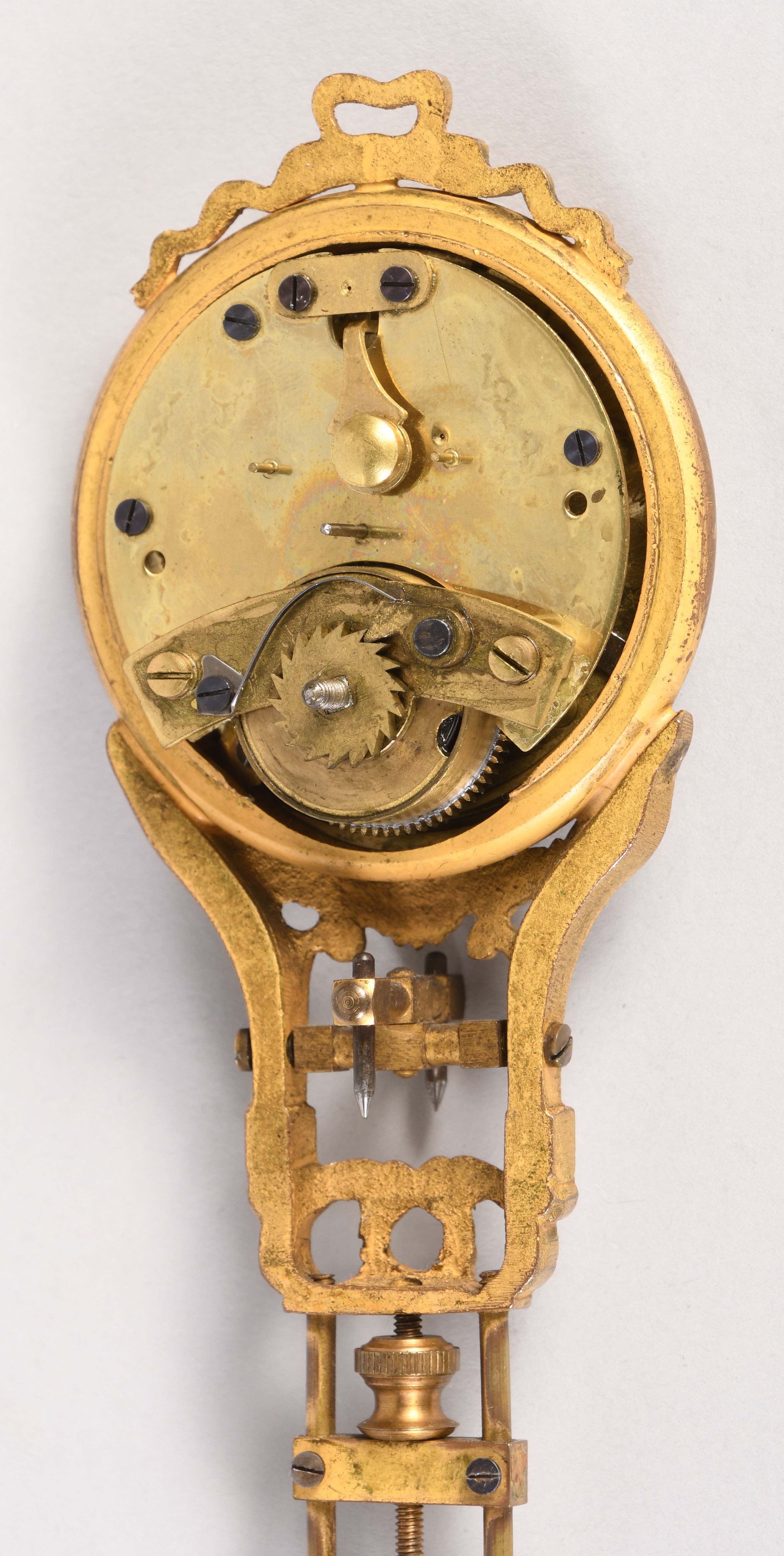 Figure has loss of patina and has two chips on the backside and one on the chest; pendulum in good condition with a some loss of gilt; glass, dial and hands very good; clock will tick