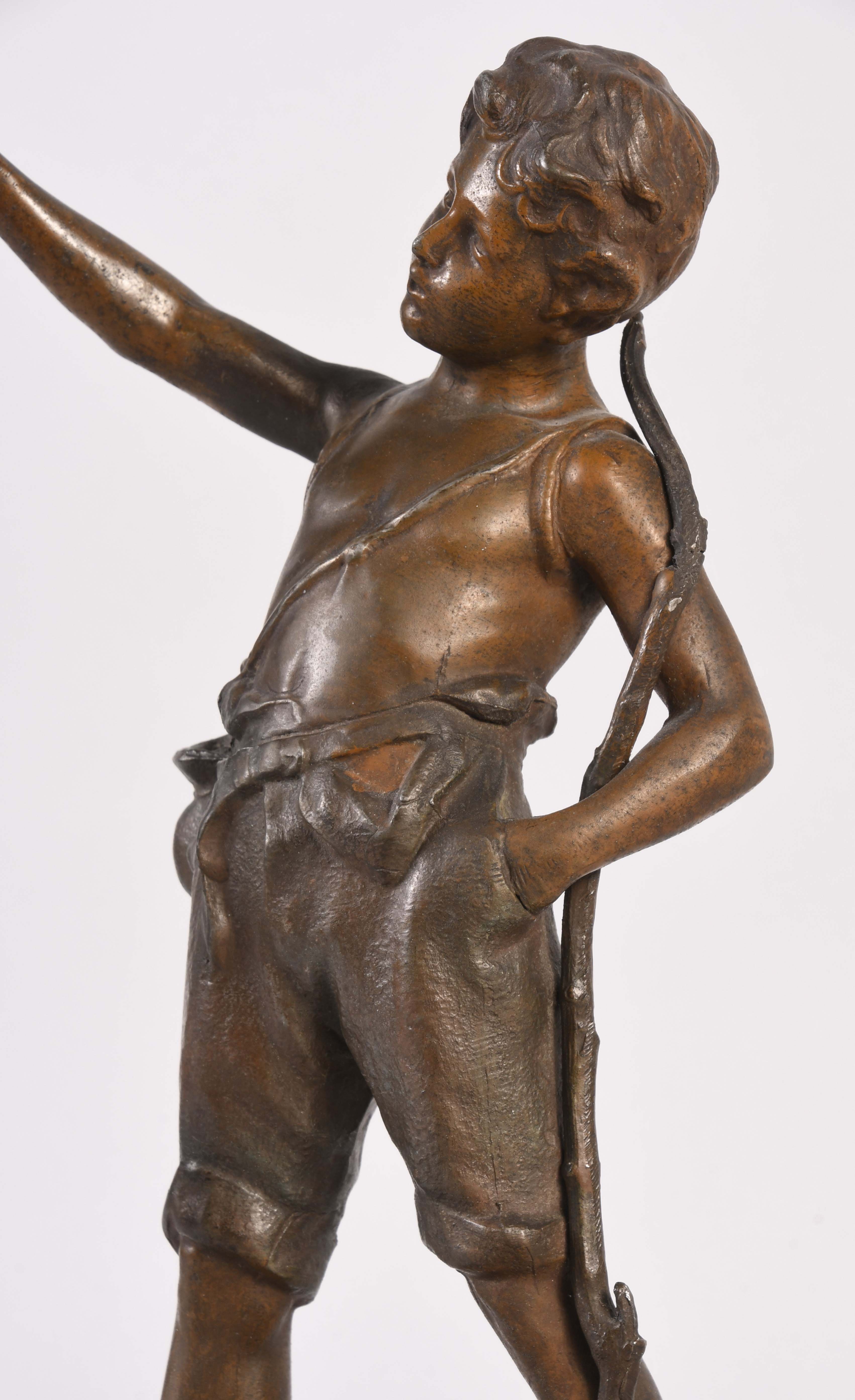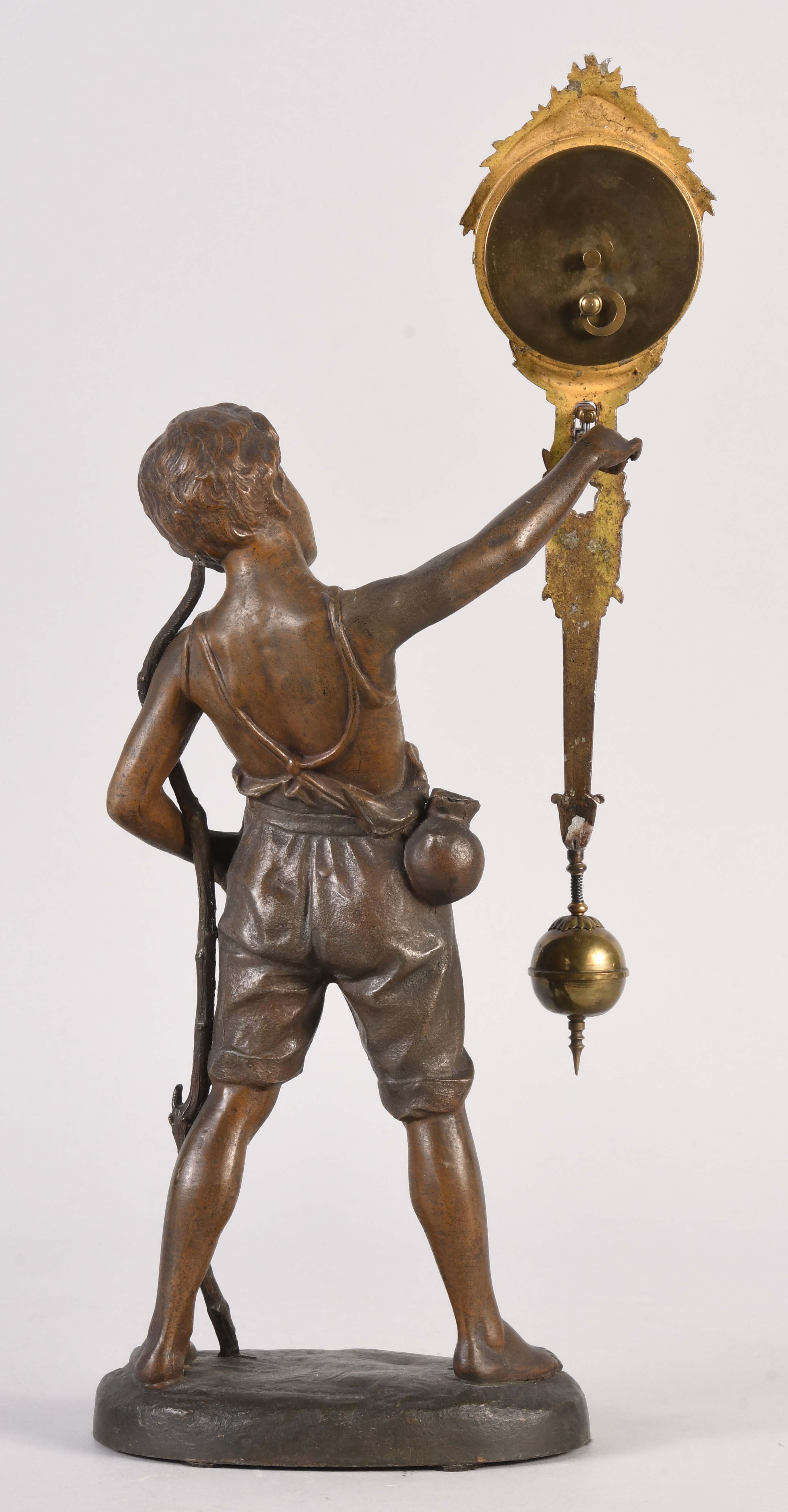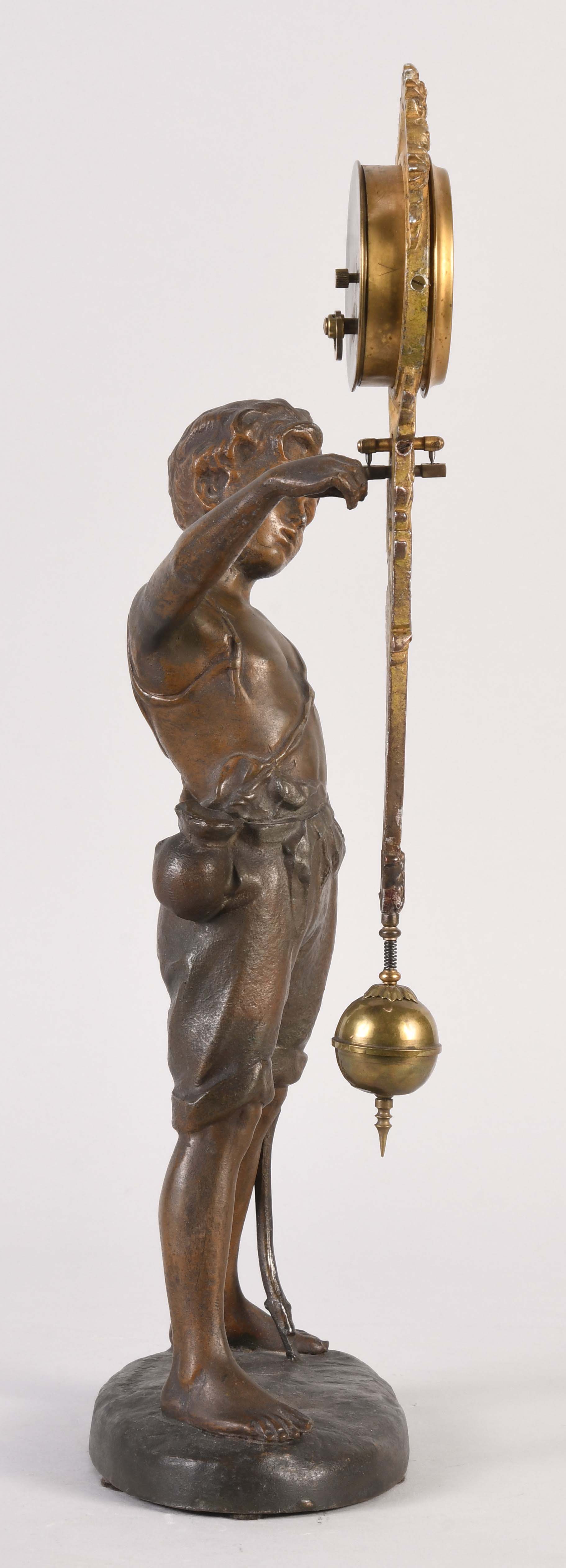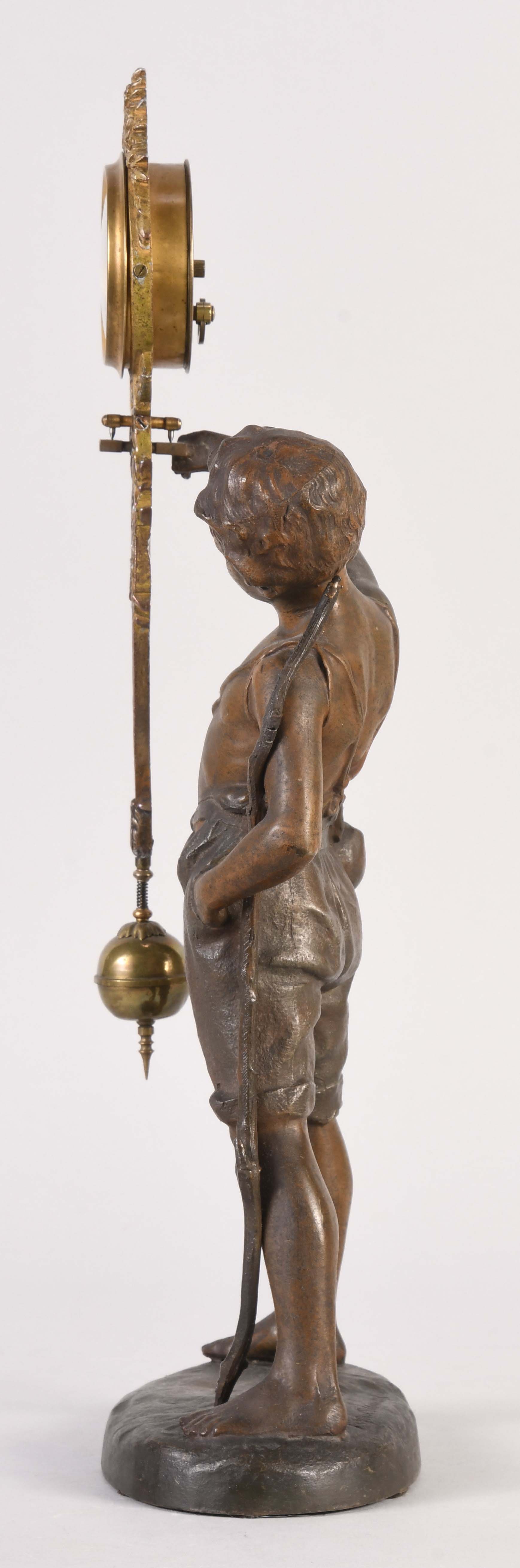 Junghans, Germany, "Birichino" swinging mystery clock, patinated spelter figure of a boy with a walking stick supporting a compound pendulum with white enamel dial, arabic numerals and blued spade and pointer hands, and containing eight day spring driven timepiece