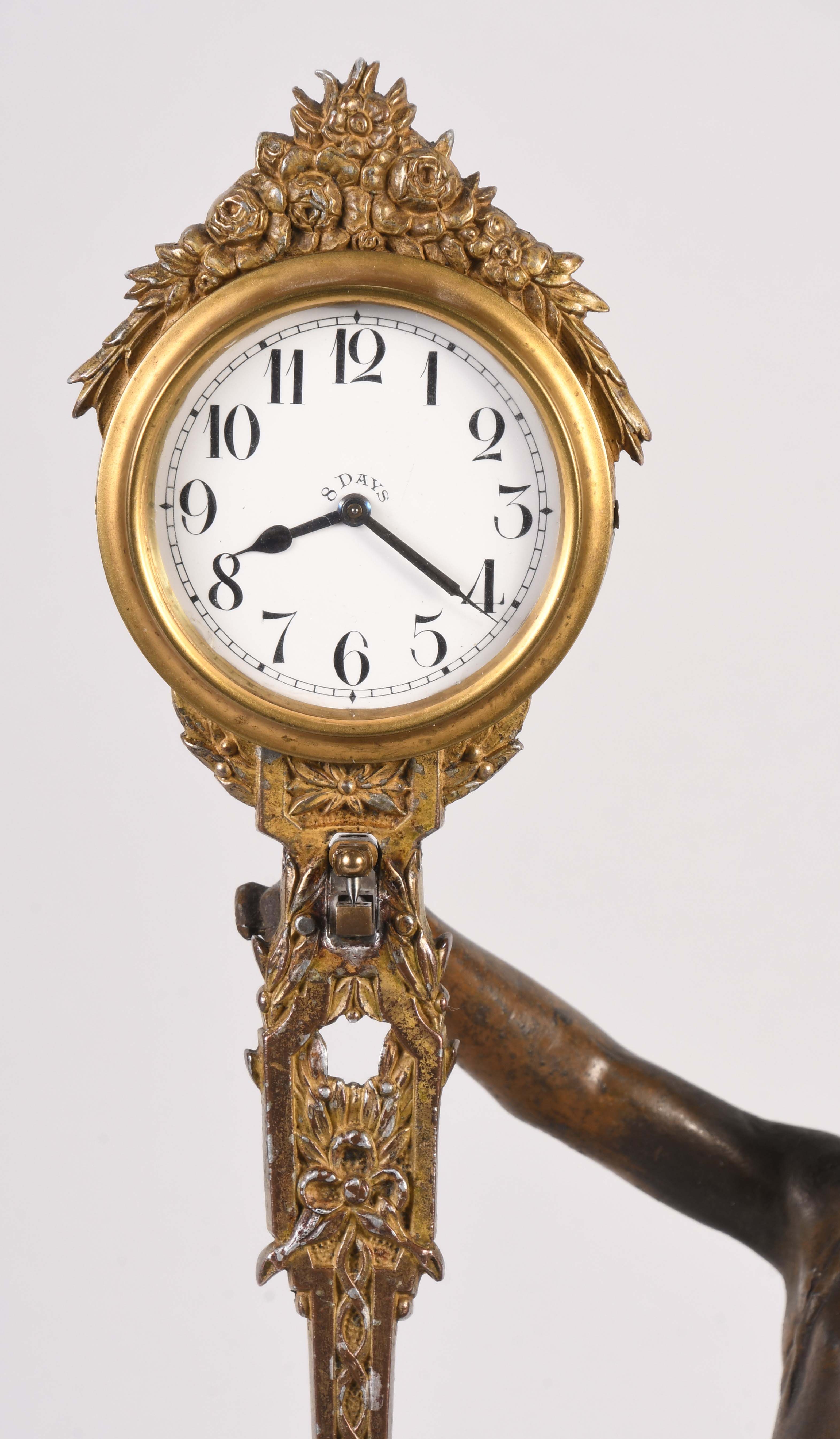 Figure very good with loss of patina but no breaks; pendulum has loss of gilt and some peeling on the back, dial glass has a hairline scratch, dial and hands are in good condition