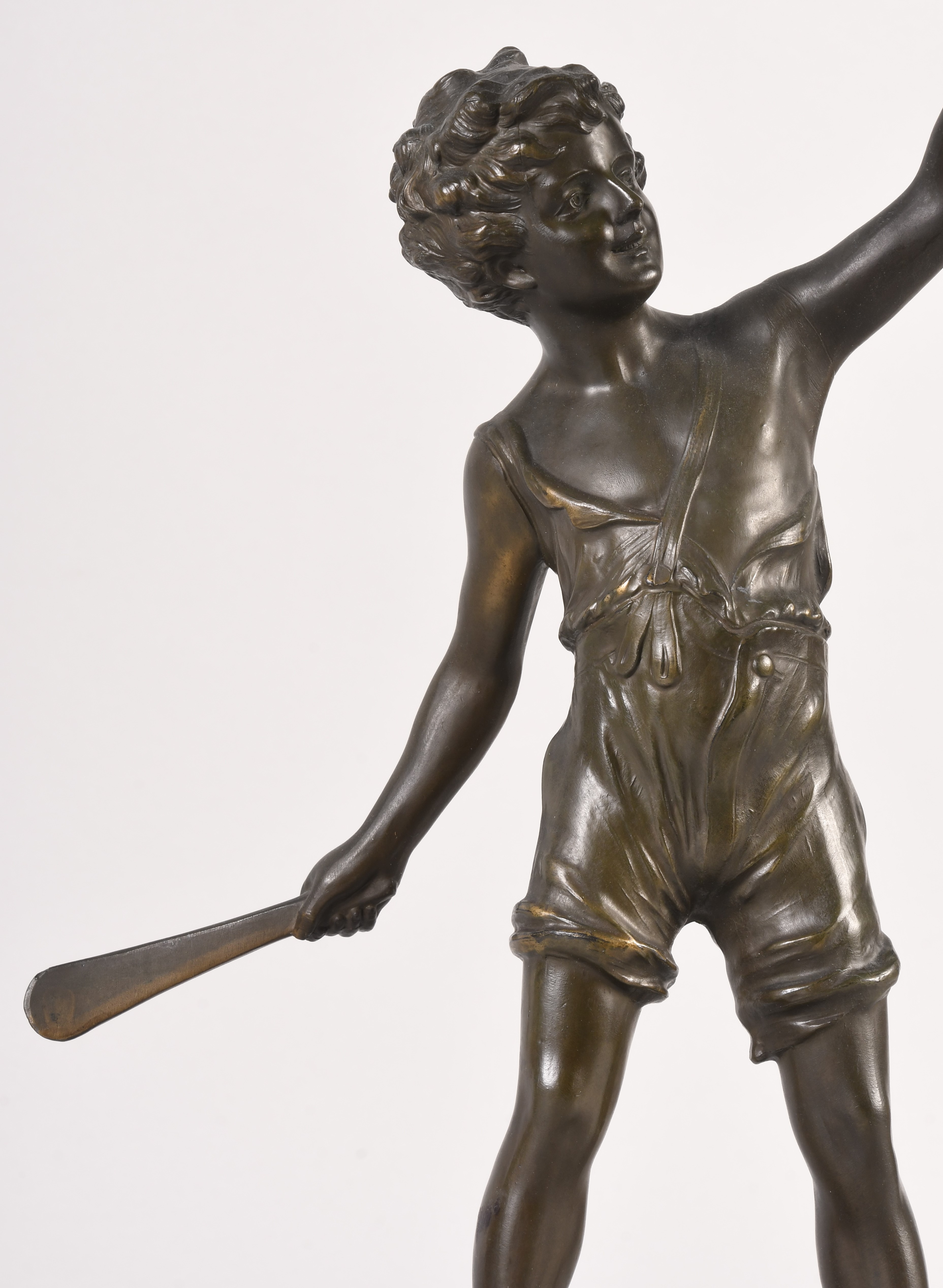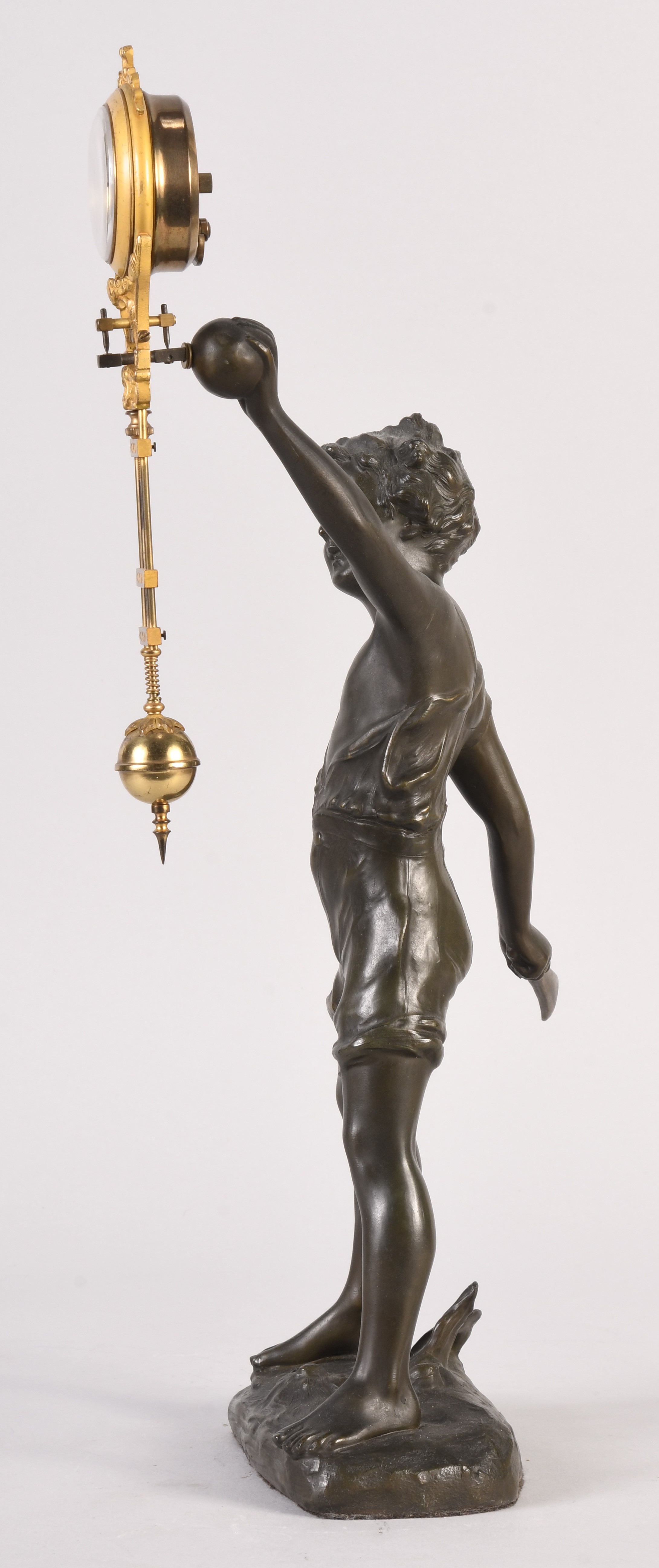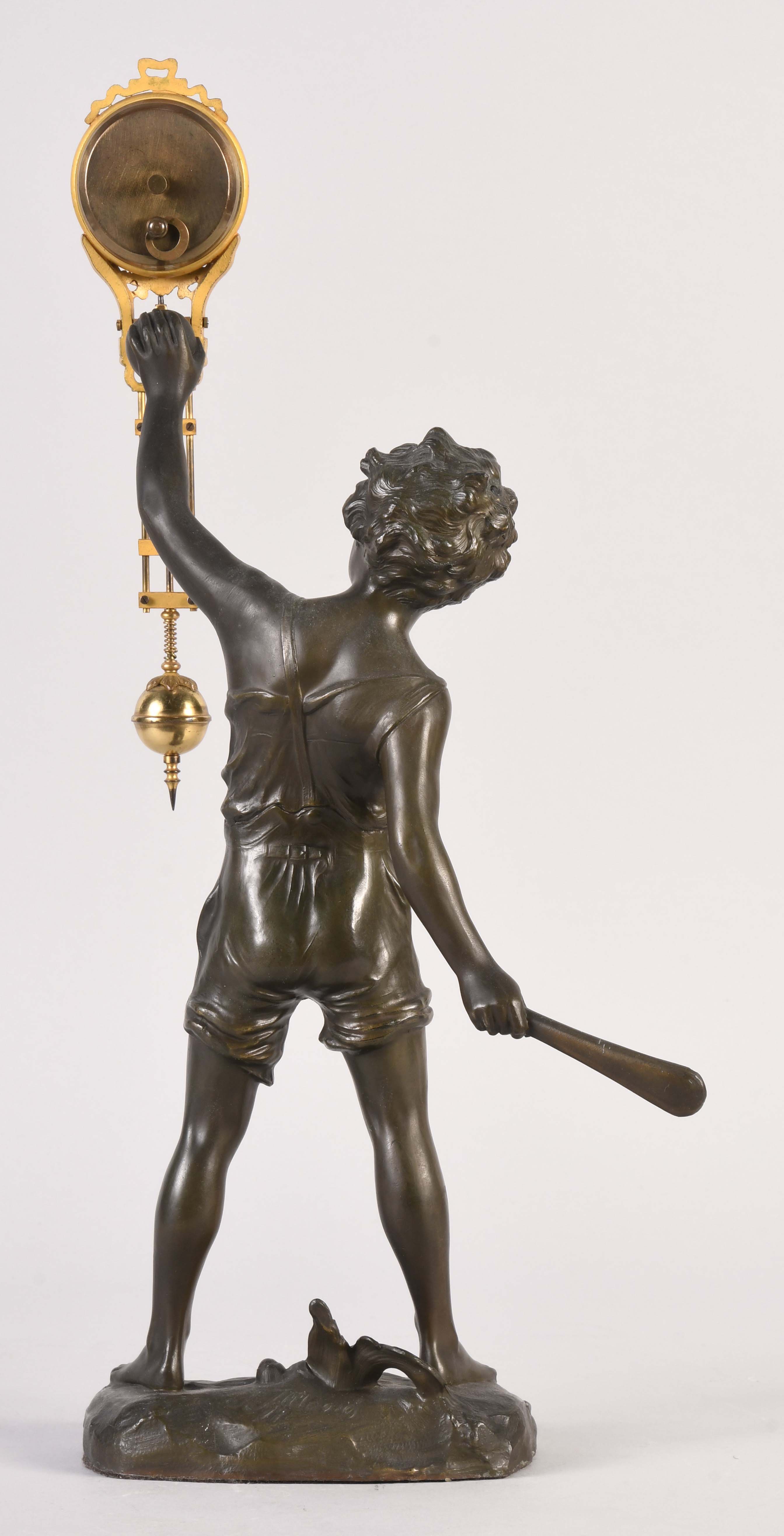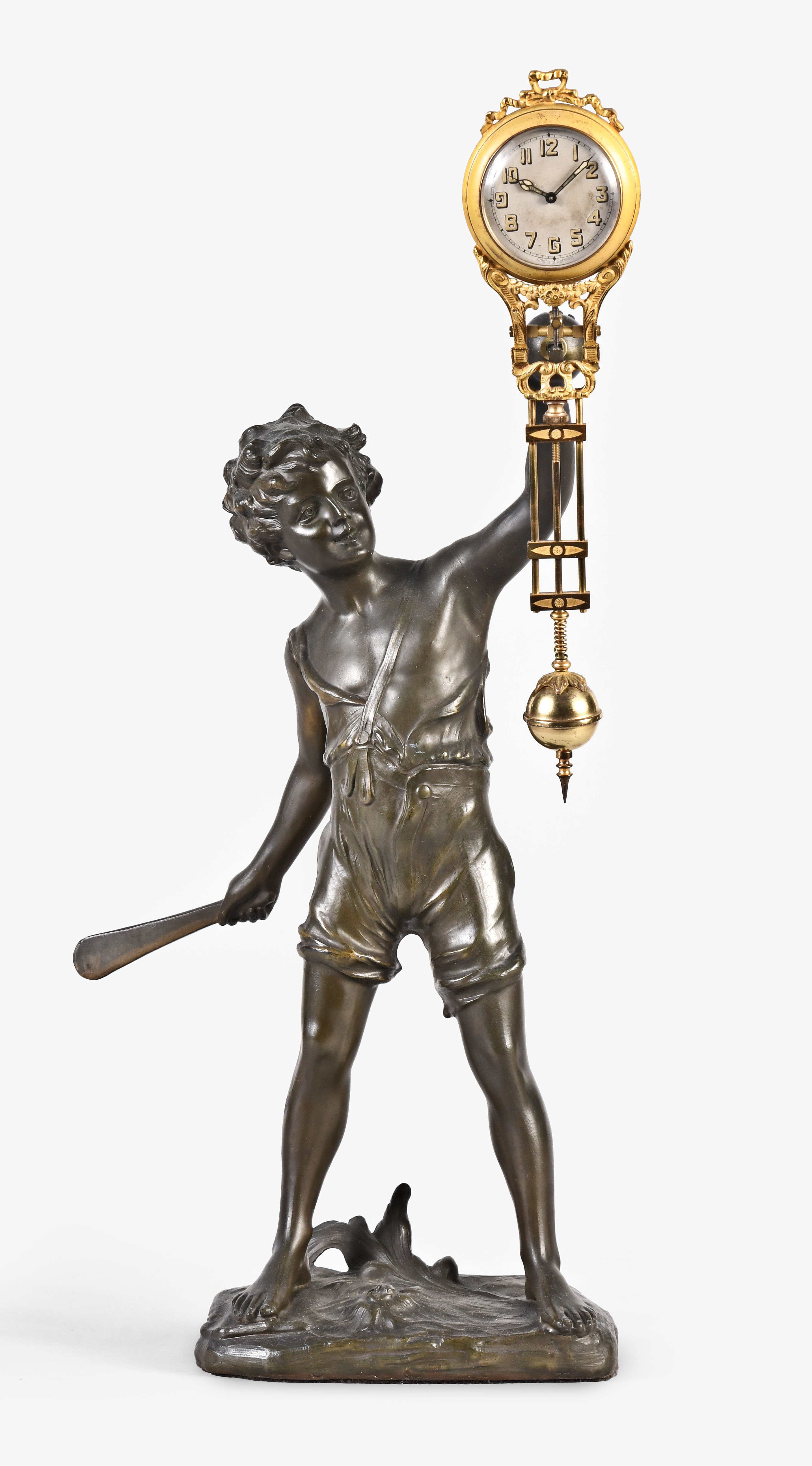 Junghans, Germany, "Cricket Boy" swinging mystery clock, the patinated spelter figure with a bat in his right hand, his raised left arm holding a ball and supporting a gilt #1 compound pendulum, white enamel dial with luminous arabic numeral and hands, and eight day spring driven timepiece