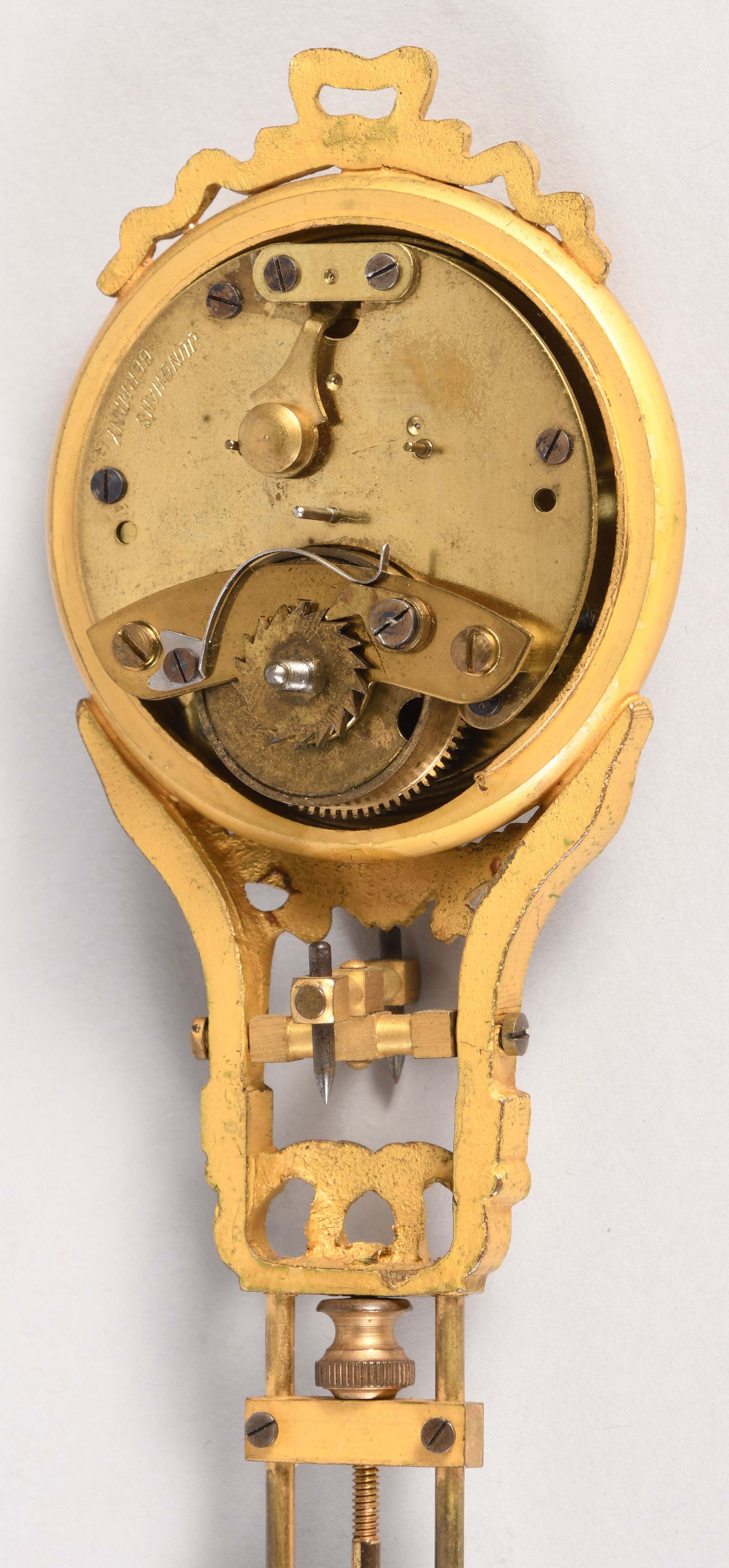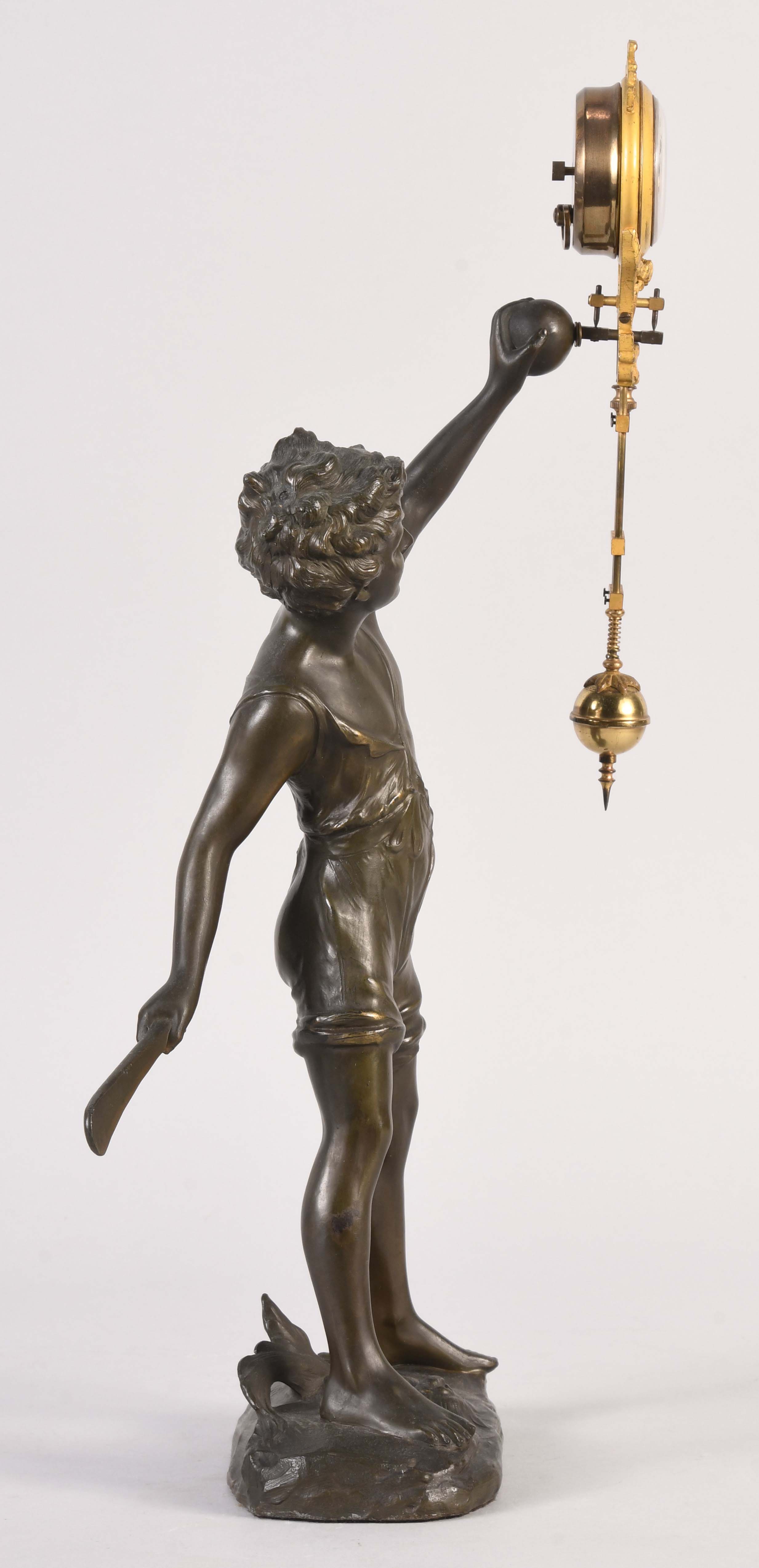 Figure with loss of patina but no breaks, the nut on the jewel bar appears to have been replaced with washers; swinging arm has minor loss of gilt, dial does have some dirt and loss of finish, hands a bit dirty; clock will tick