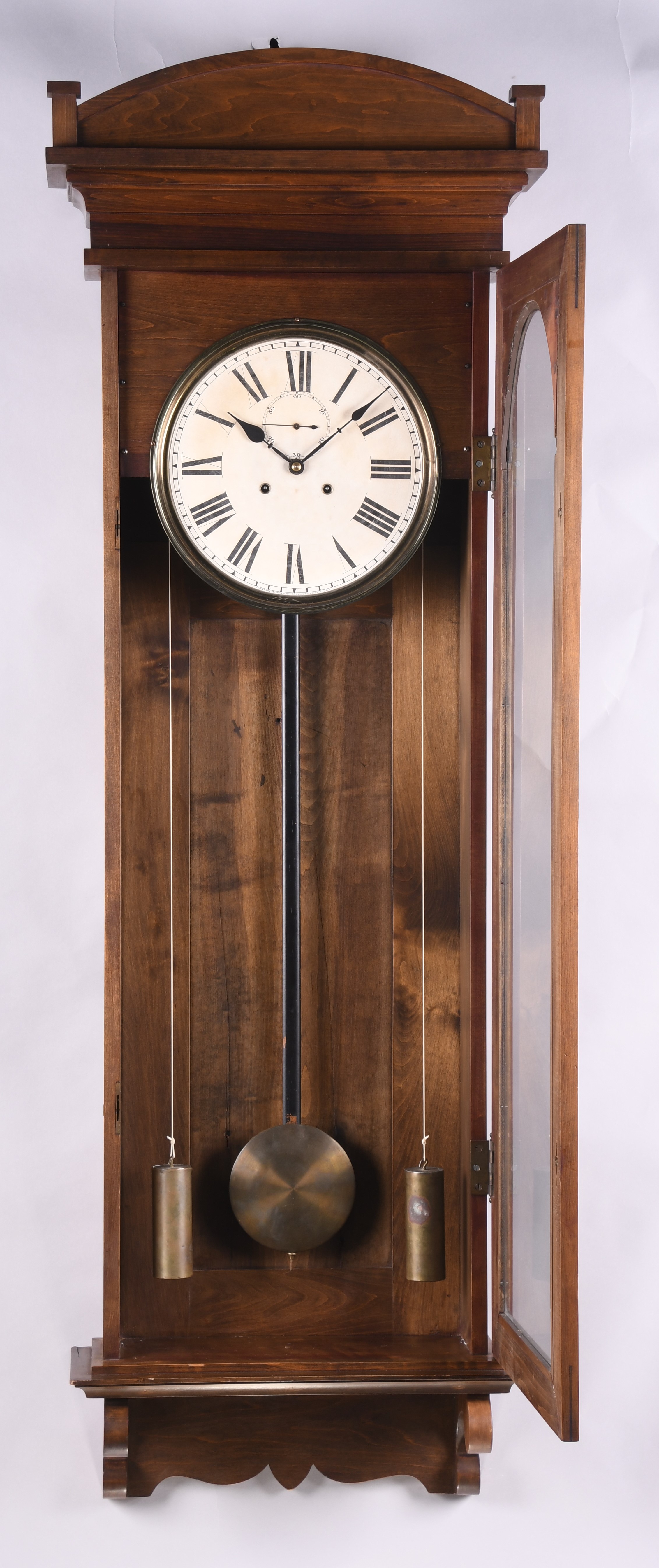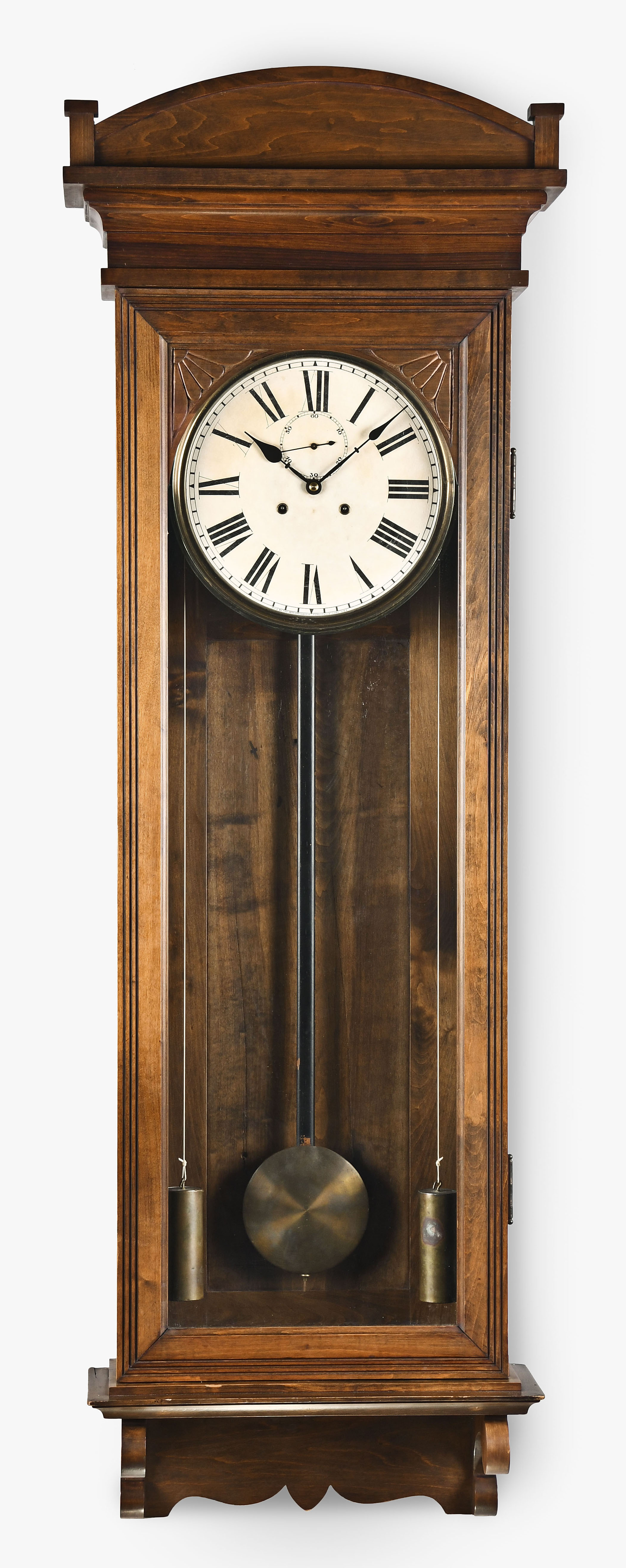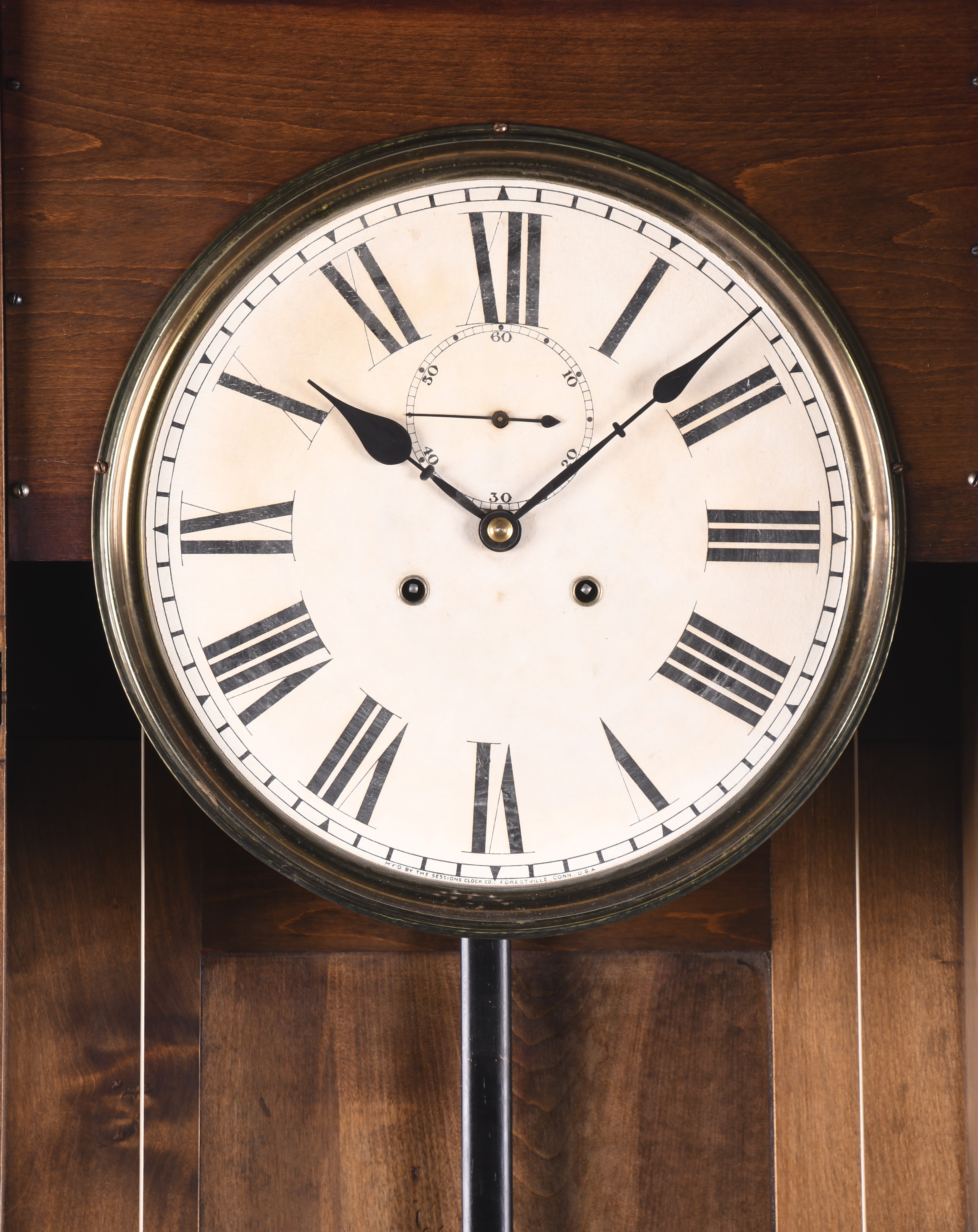 Sessions Clock Co., Forestville, Conn., "Regulator No. 6" hanging clock in a hardwood case, papered metal dial, spade hands, eight day double wind weight driven brass movement with a deadbeat escapement
