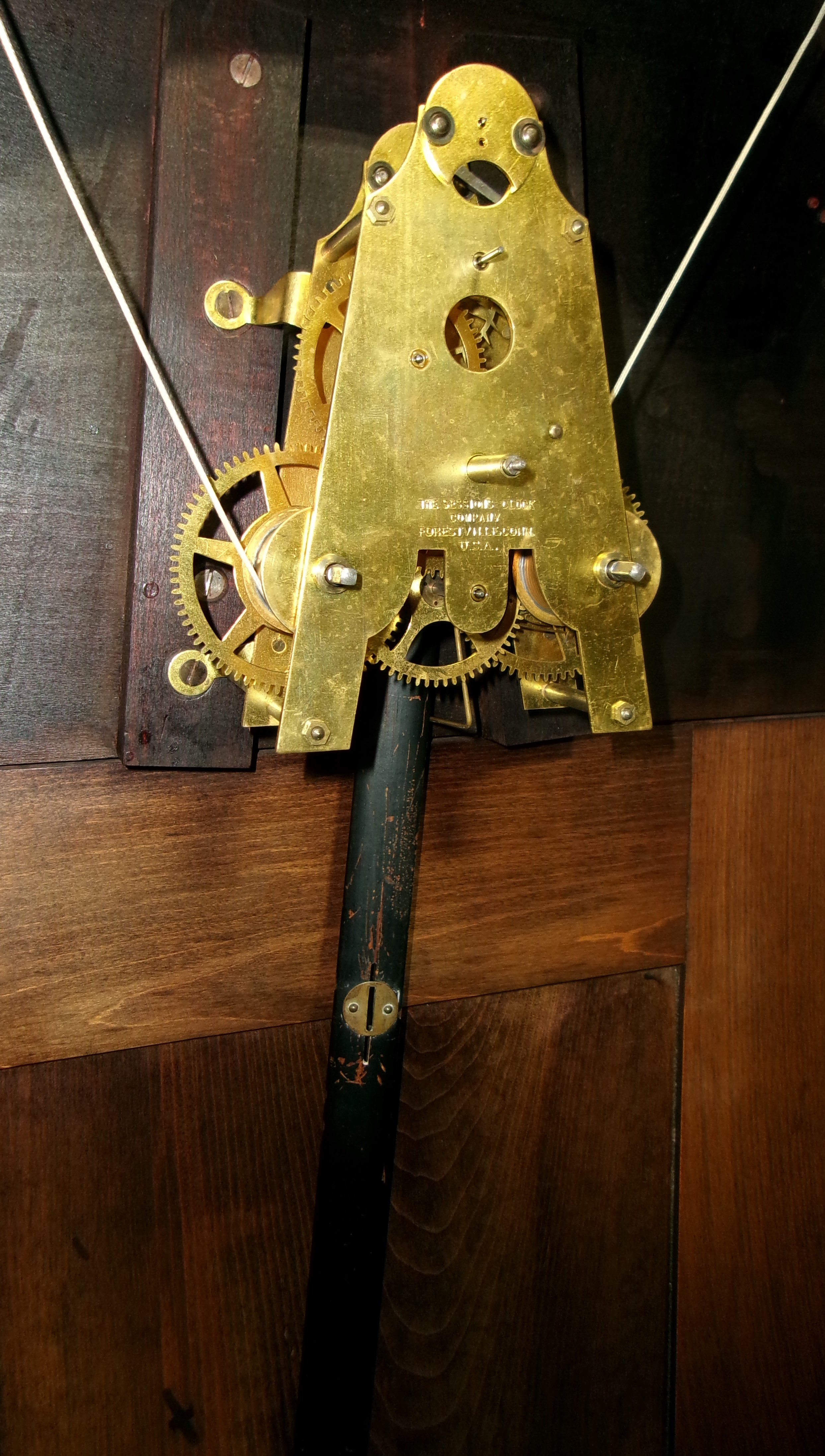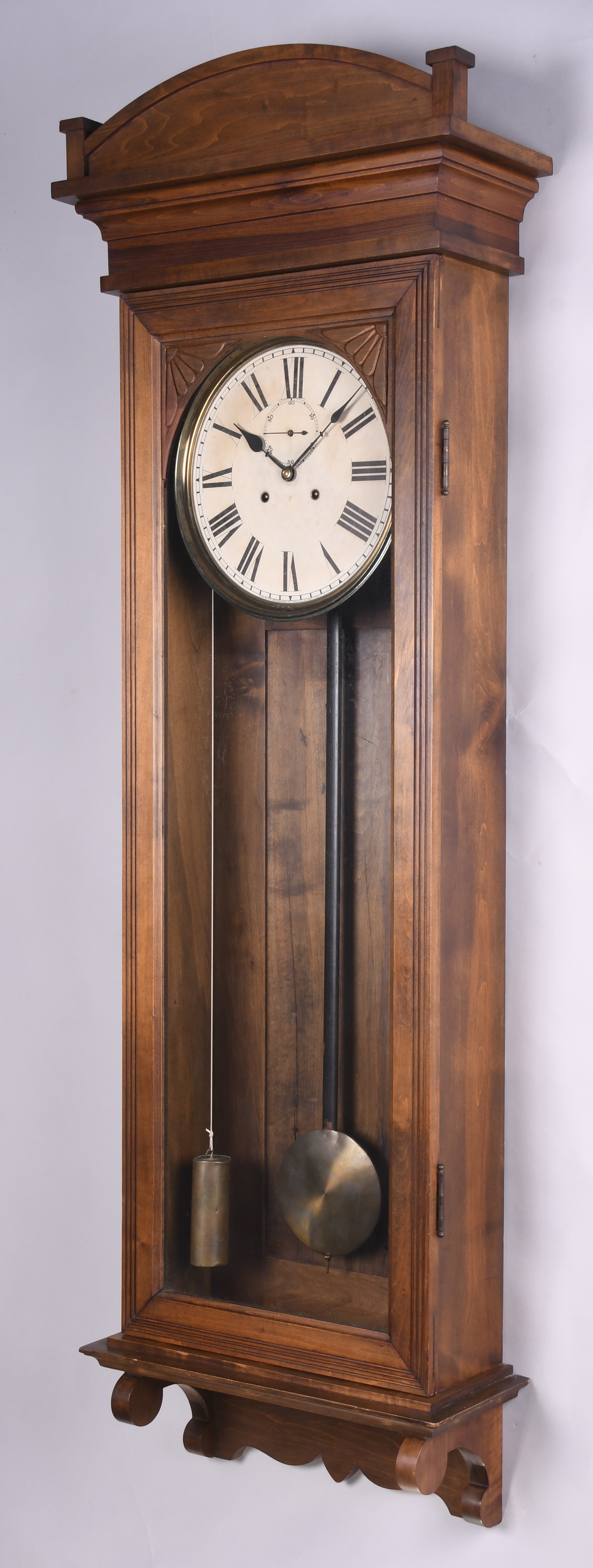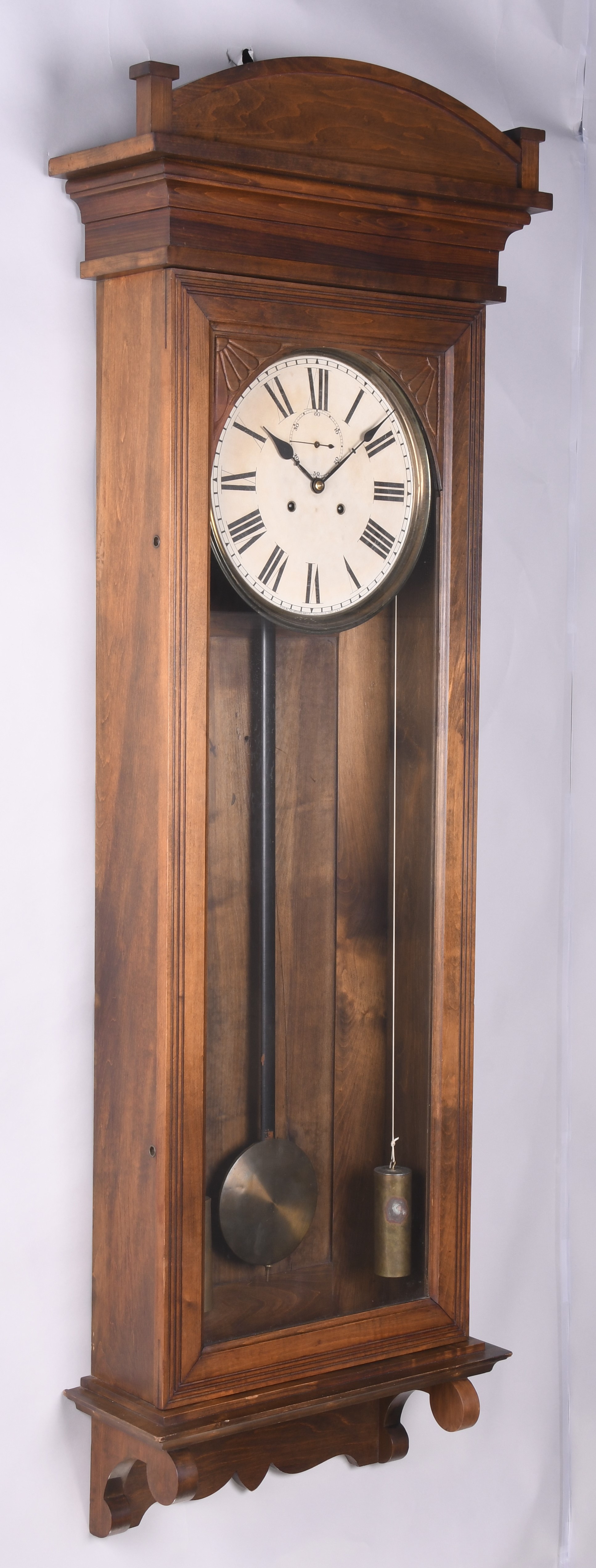 Sessions Clock Co., Forestville, Conn., "Regulator No. 6" hanging clock in a hardwood case, papered metal dial, spade hands, eight day double wind weight driven brass movement with a deadbeat escapement