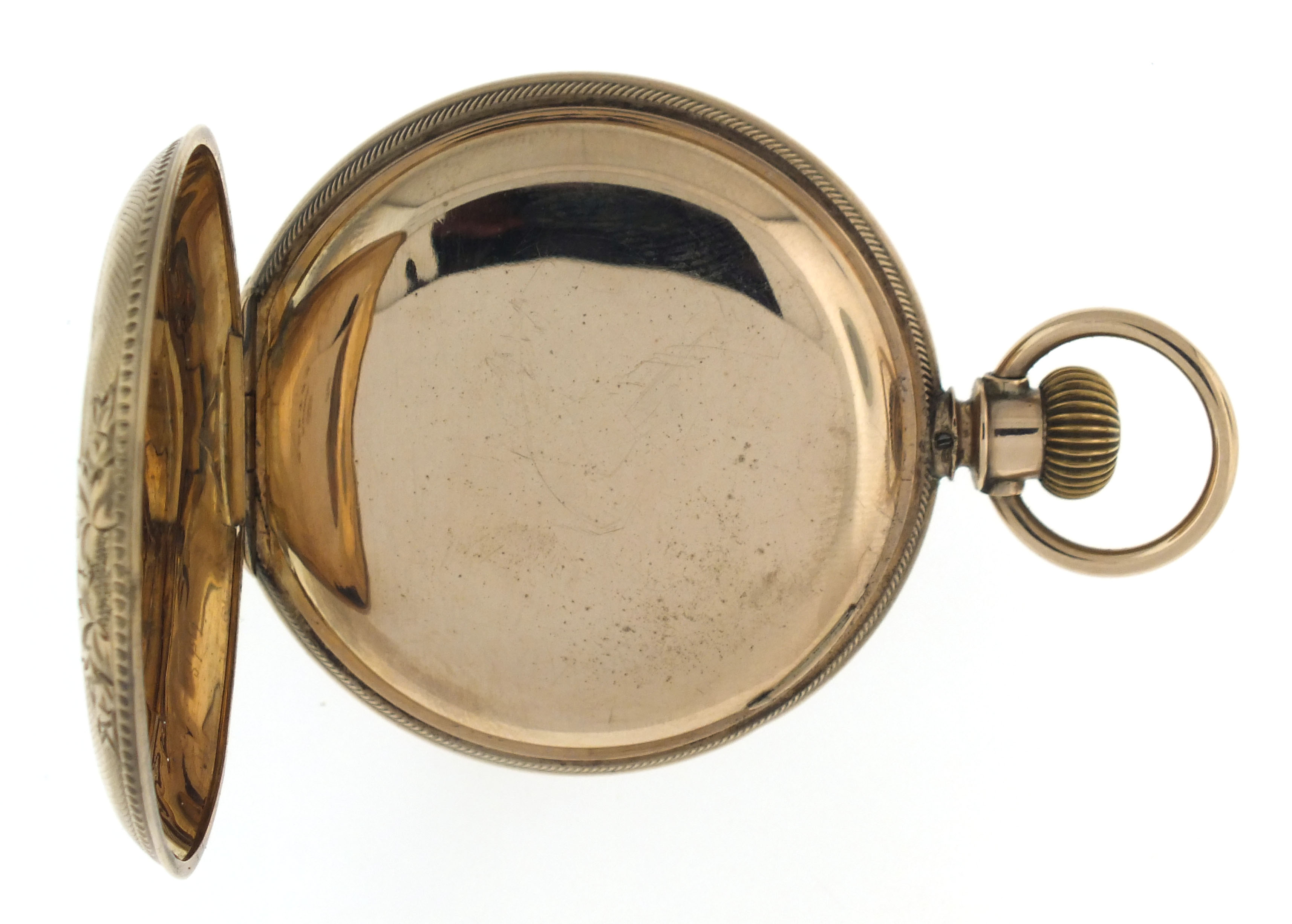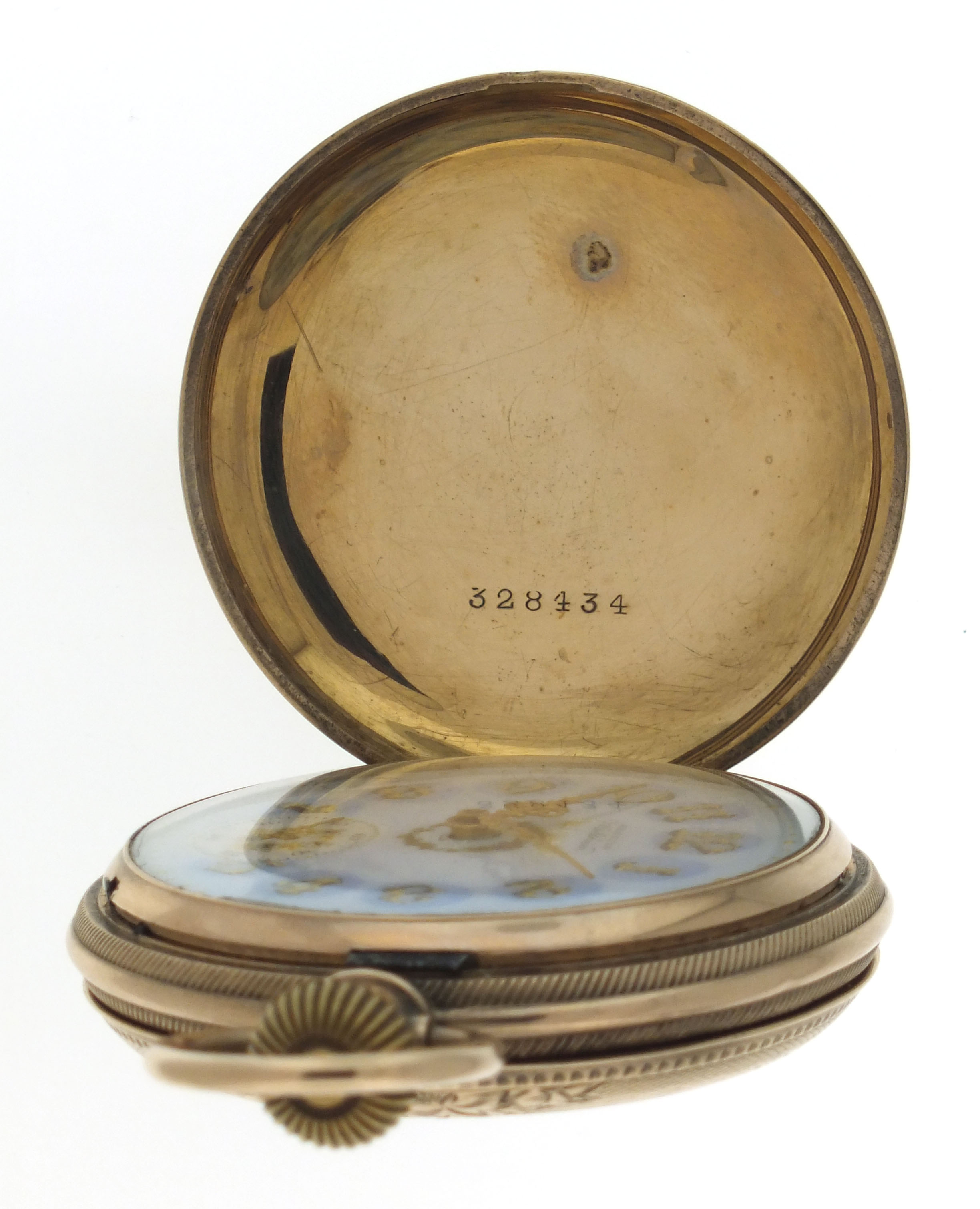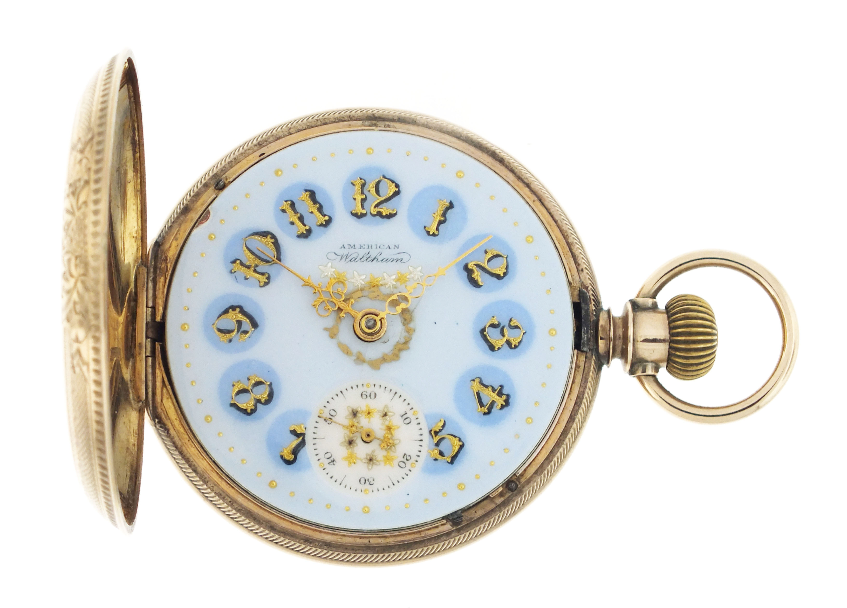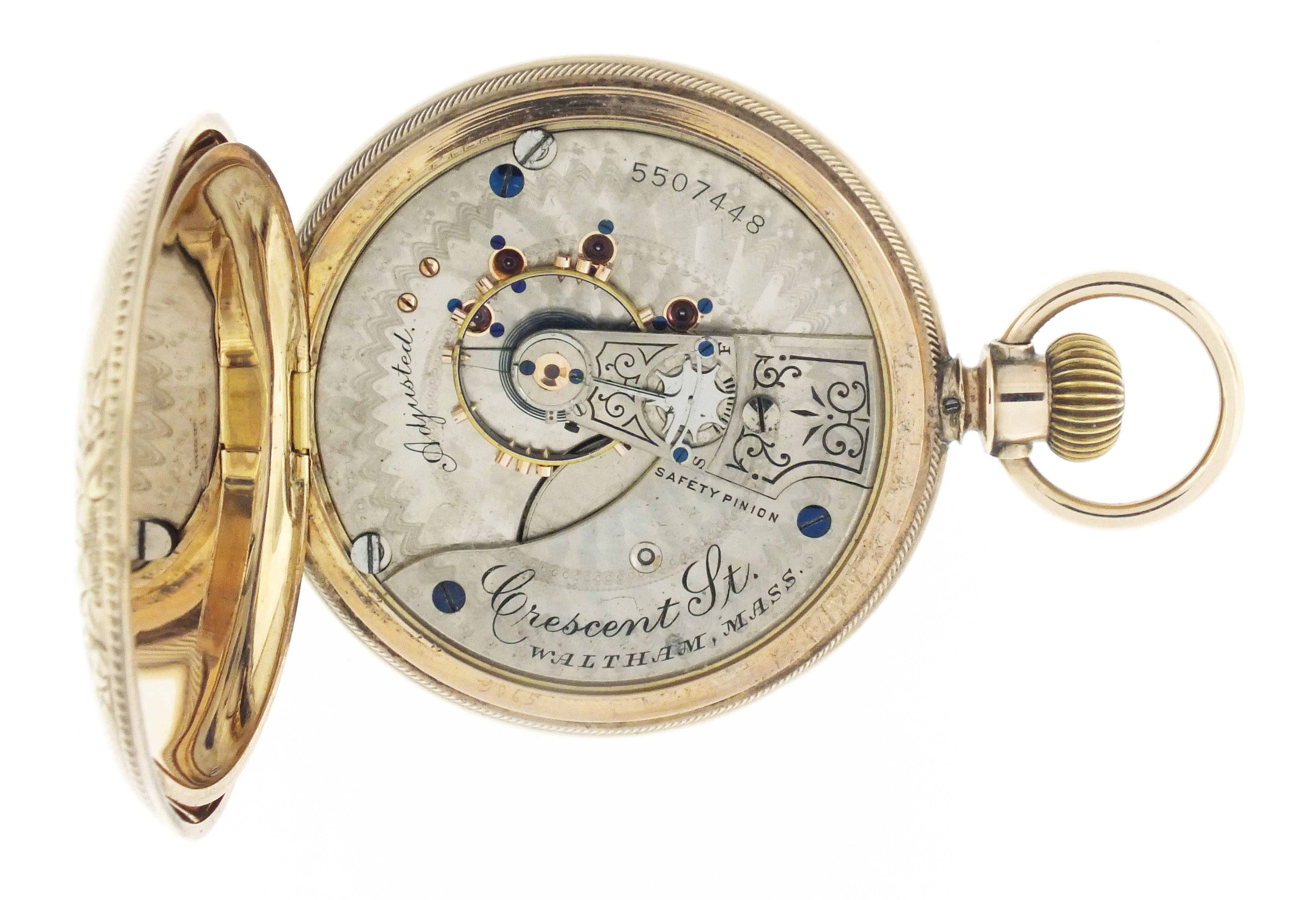 American Waltham Watch Co., Waltham, Mass., a late 19th century model 1883 "Crescent St." pocket watch, 18 size, 15 jewels, stem wind and lever set, adjusted, damascened nickel plate movement with lever escapement, cut bimetallic balance with gold screws, and Church micrometric regulator in an 8 karat, yellow gold, engine turned and engraved hunting case, arabic numeral, single sunk O'Hara style multicolor enamel dial with gilt Louis XIV style hands, serial #5507448, 109.7g TW