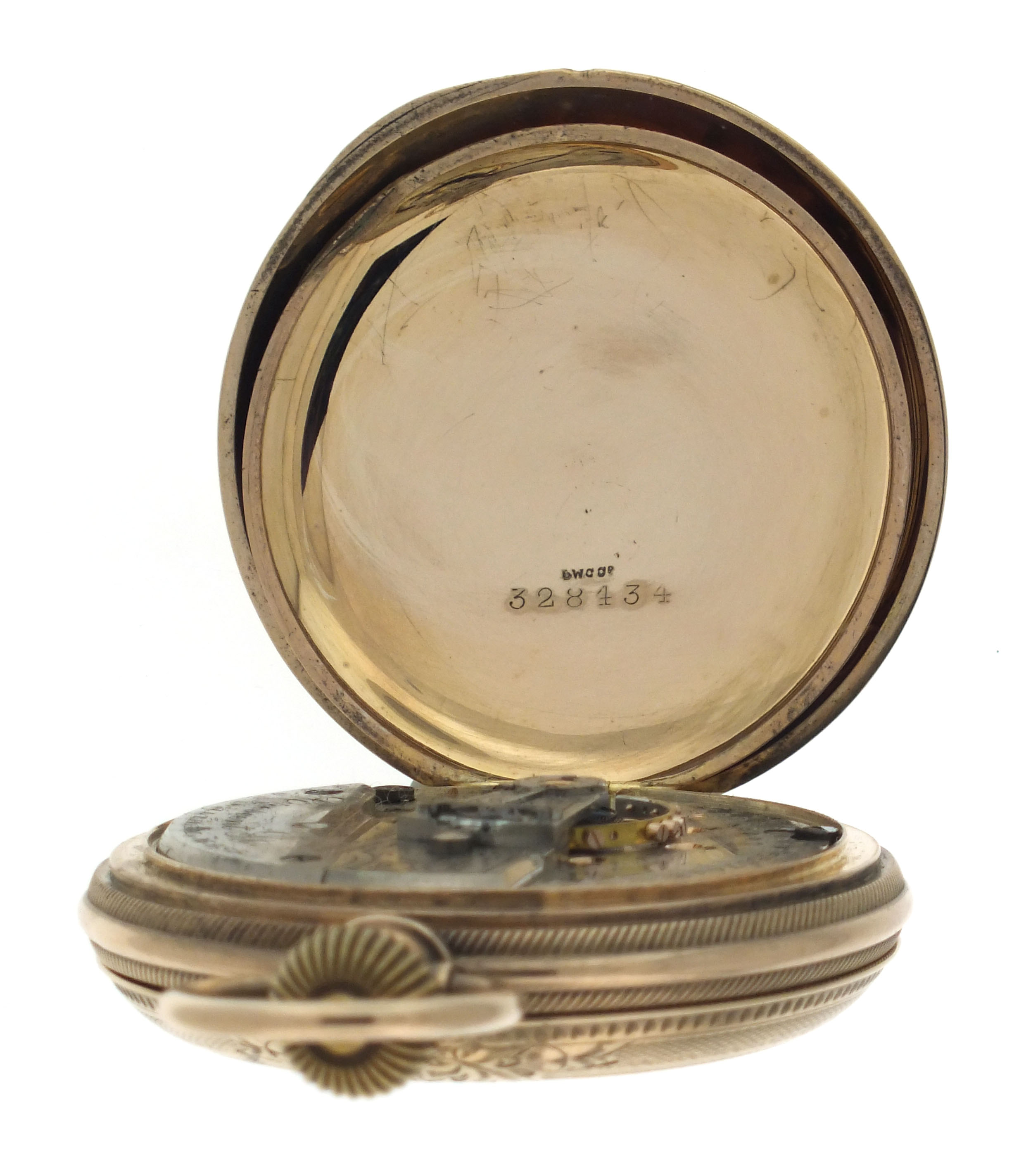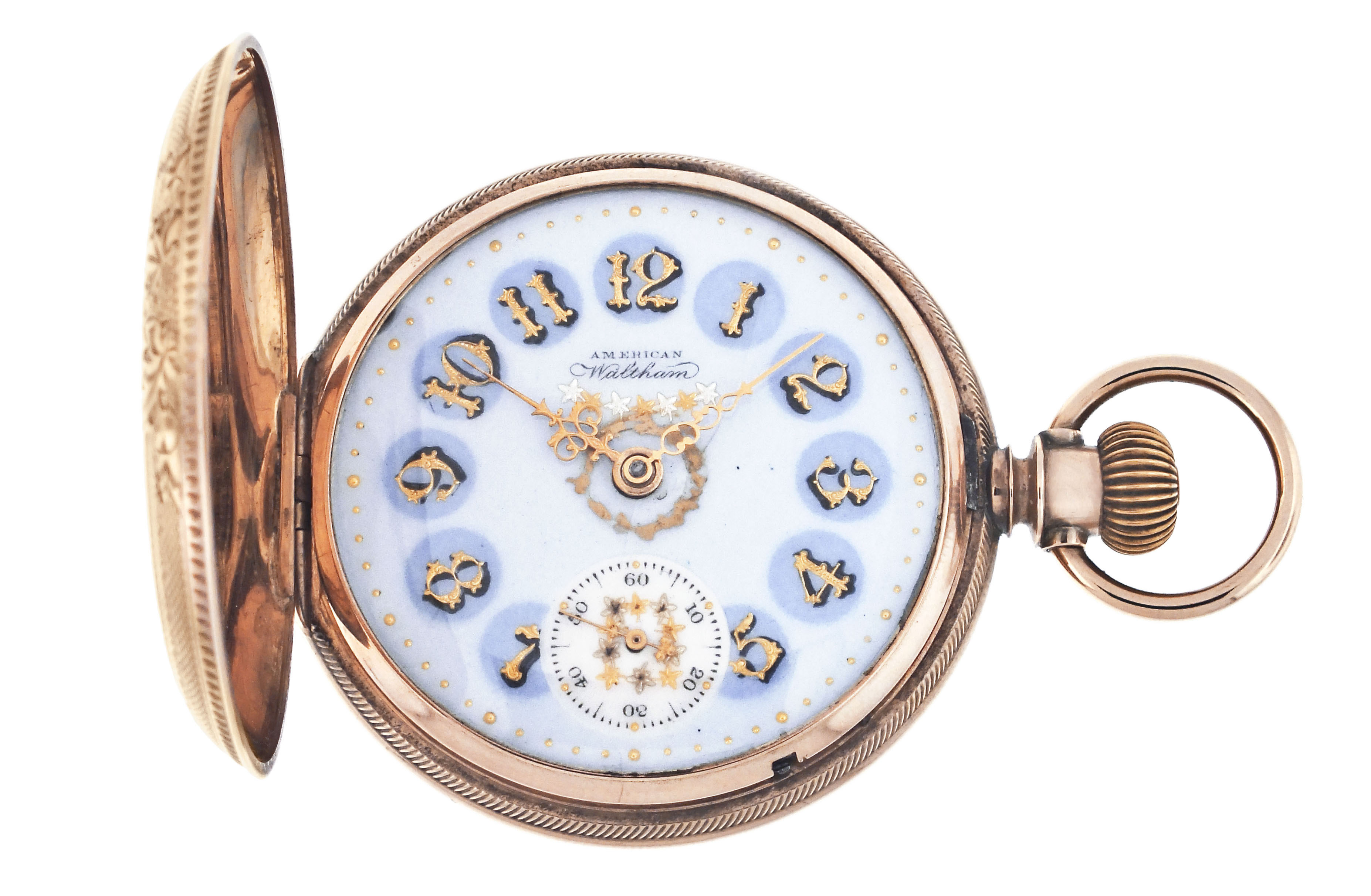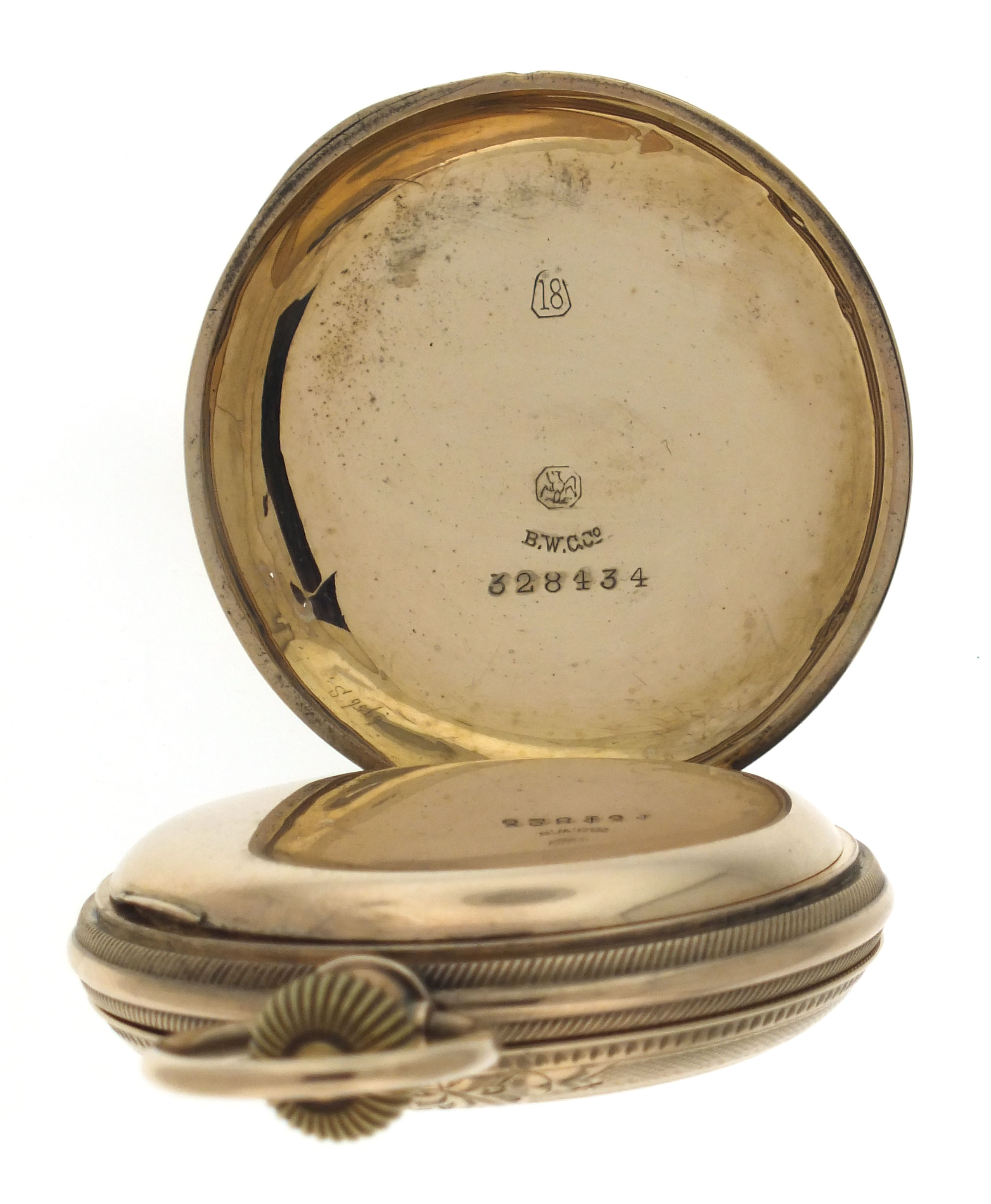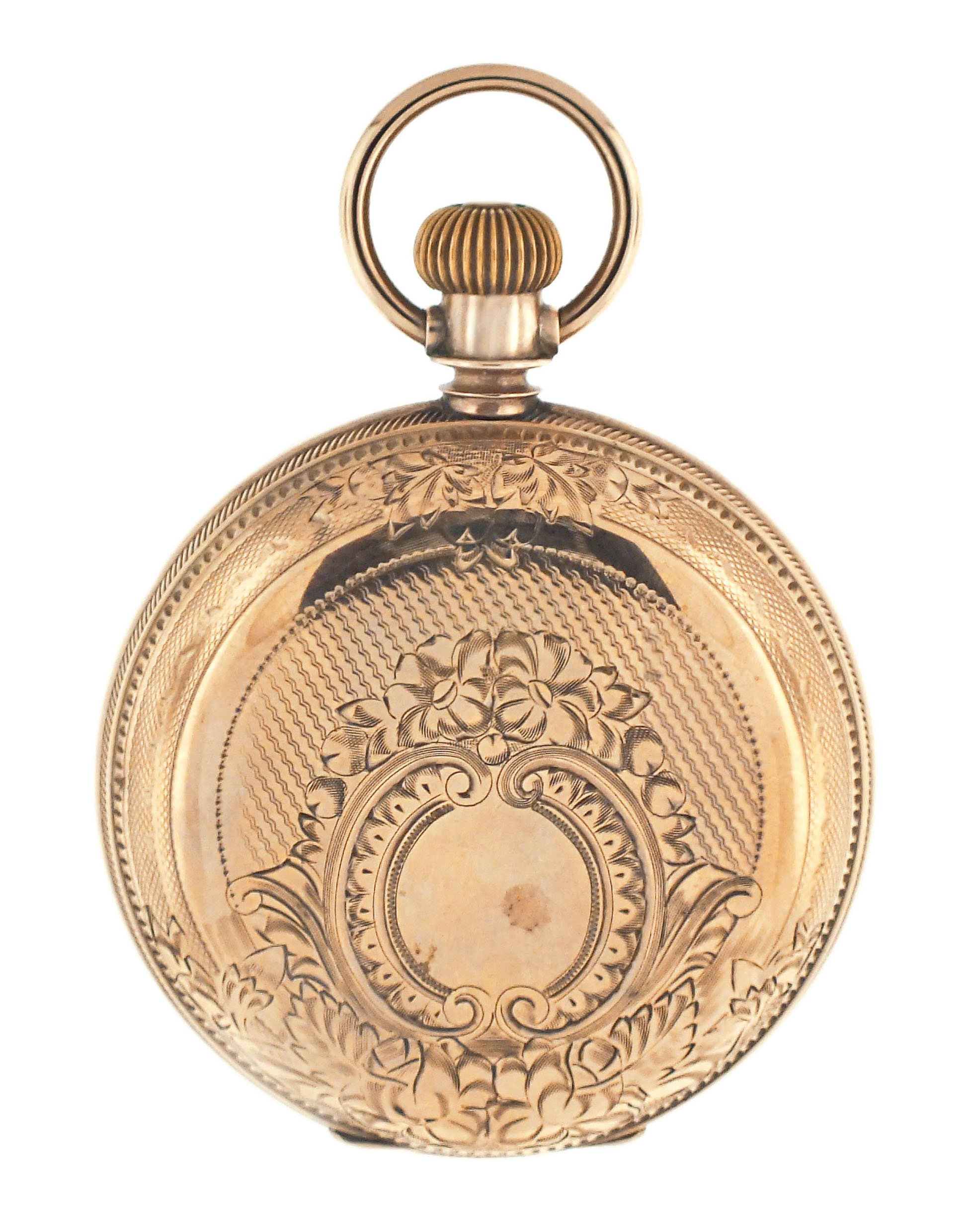 American Waltham Watch Co., Waltham, Mass., a late 19th century model 1883 "Crescent St." pocket watch, 18 size, 15 jewels, stem wind and lever set, adjusted, damascened nickel plate movement with lever escapement, cut bimetallic balance with gold screws, and Church micrometric regulator in an 8 karat, yellow gold, engine turned and engraved hunting case, arabic numeral, single sunk O'Hara style multicolor enamel dial with gilt Louis XIV style hands, serial #5507448, 109.7g TW