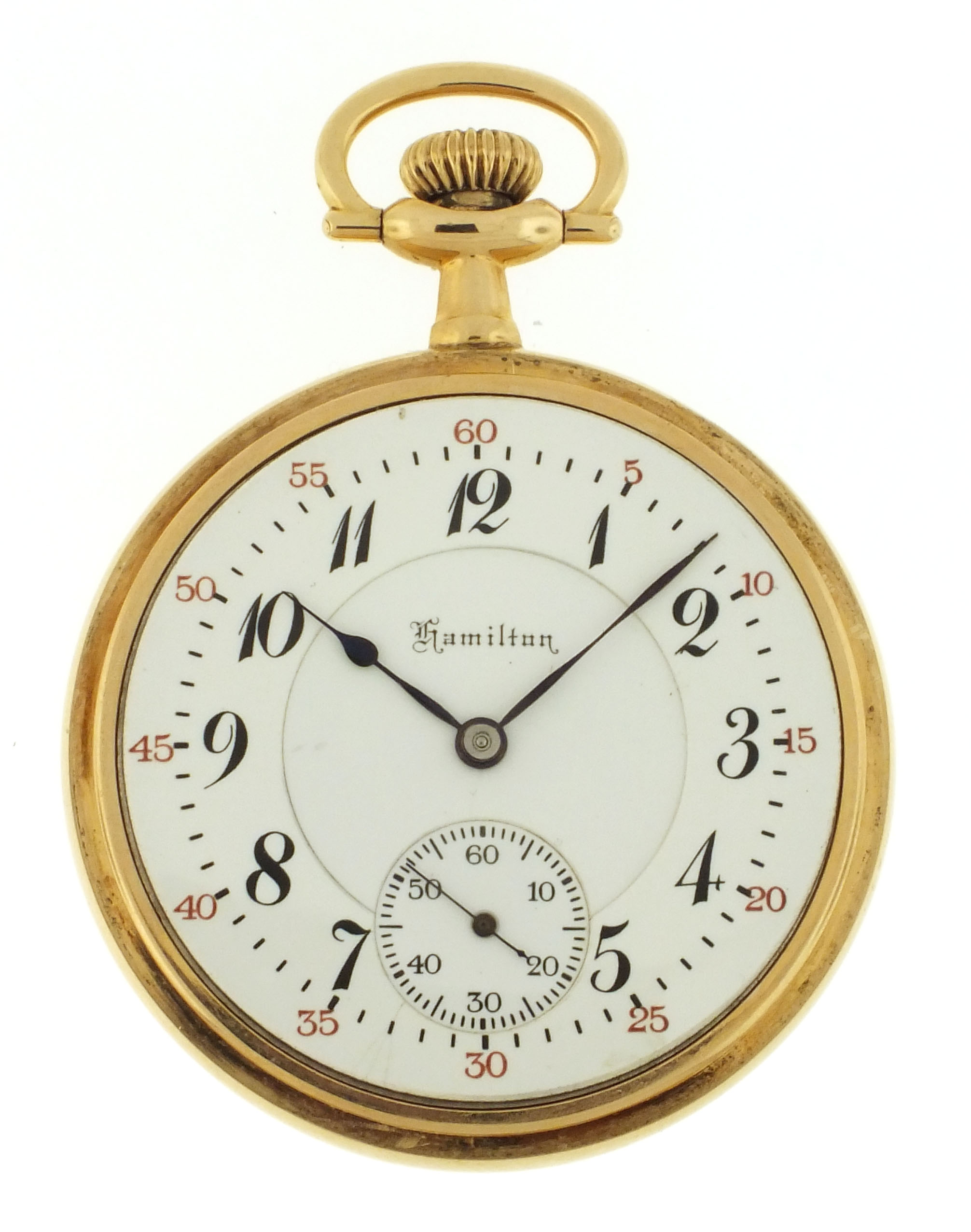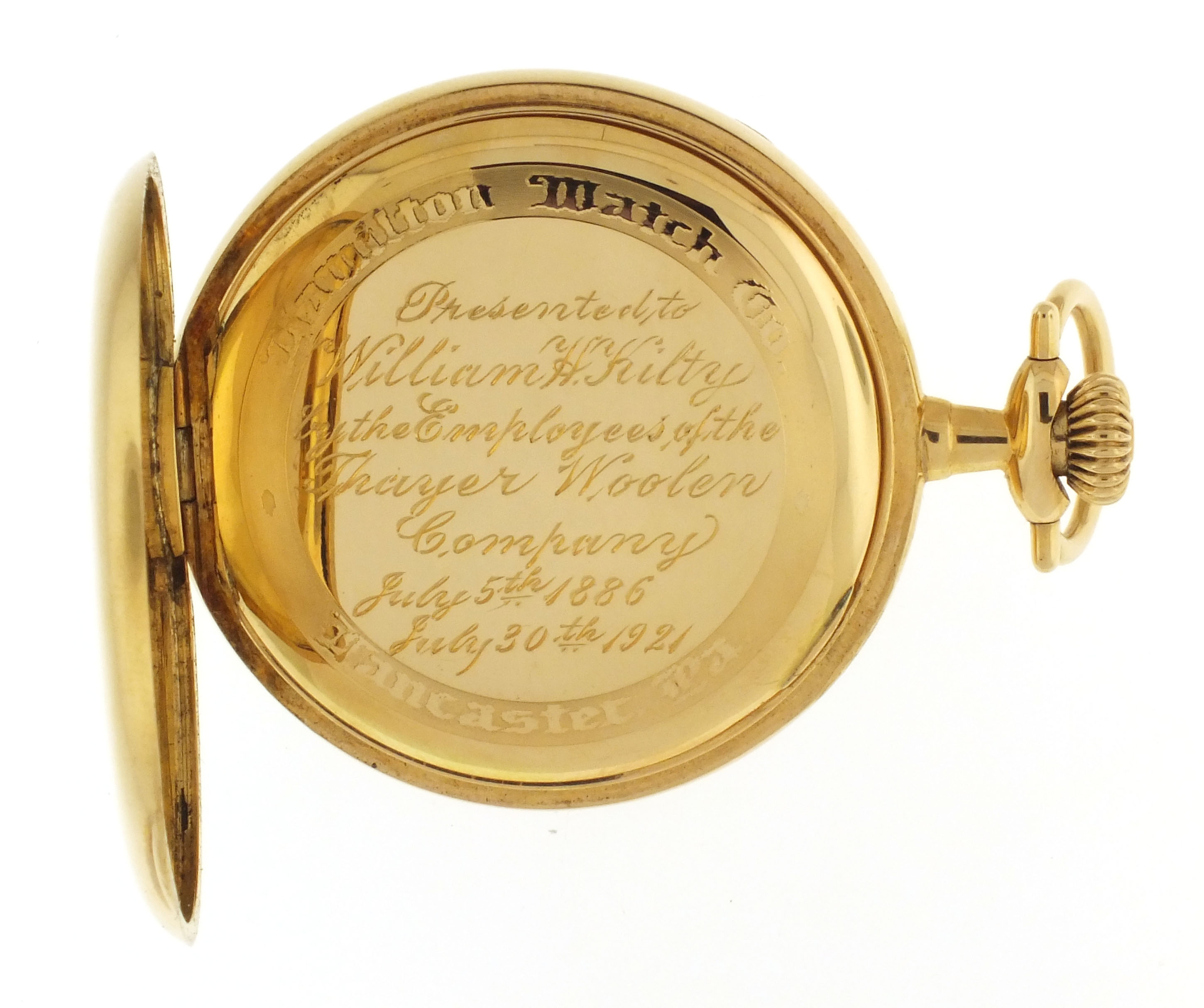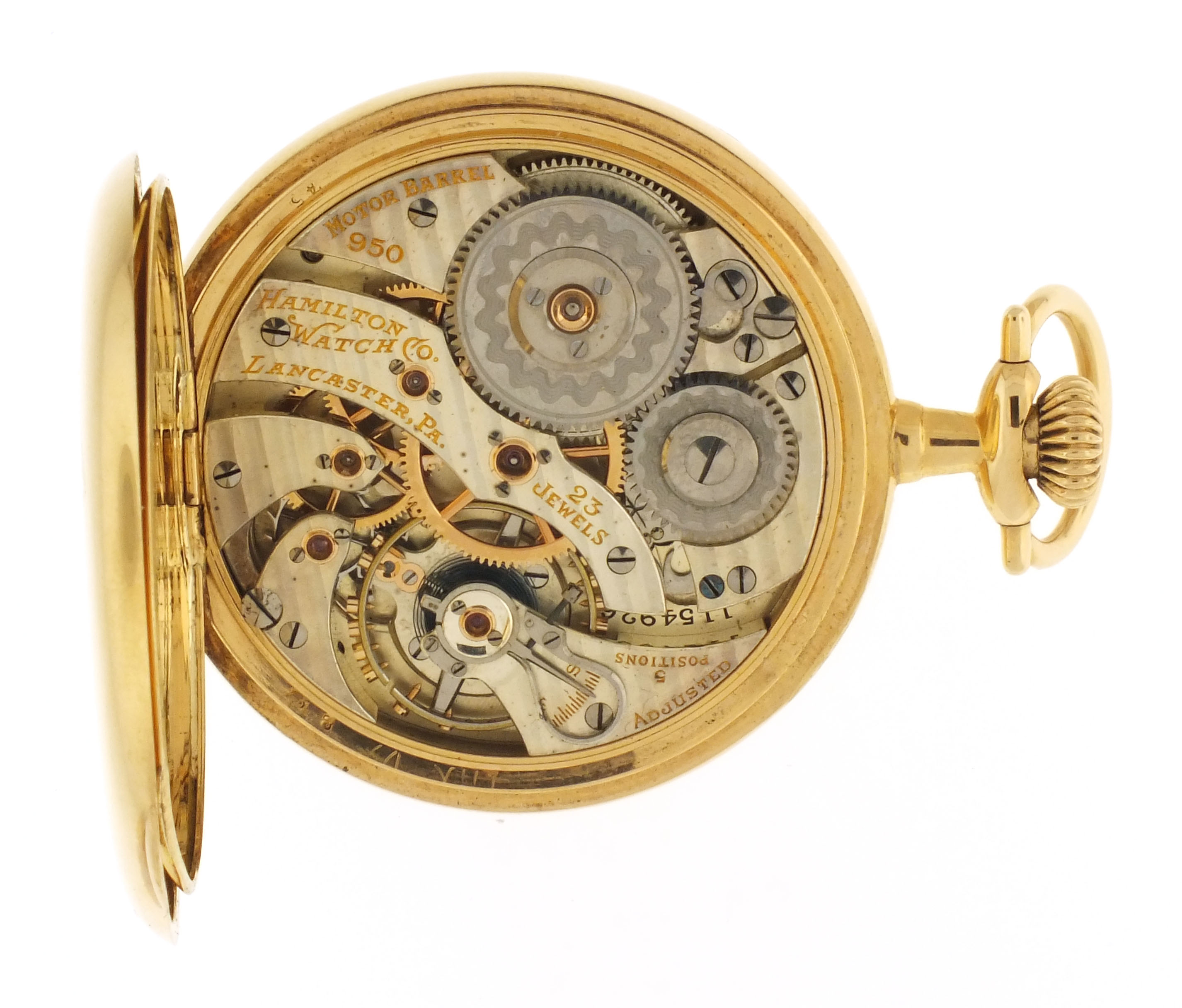 Hamilton Watch Co., Lancaster, Penn., a gold grade "950" pocket watch, 16 size, 23 jewels, stem wind and set, adjusted to 5 positions, temperature and isochronism, damascened nickel plate movement with lever escapement, cut bimetallic balance with gold screws, gold jewel settings, gold wheel train and whiplash micrometric regulator in a 14 karat, yellow gold, plain polished open face case with engraved monogram on back cover and engraved presentation on gold cuvette, arabic numeral, outer red 5-minute markers, double sunk white enamel dial with plum colored steel whip and spade hands, serial #1154926, 99.4g TW