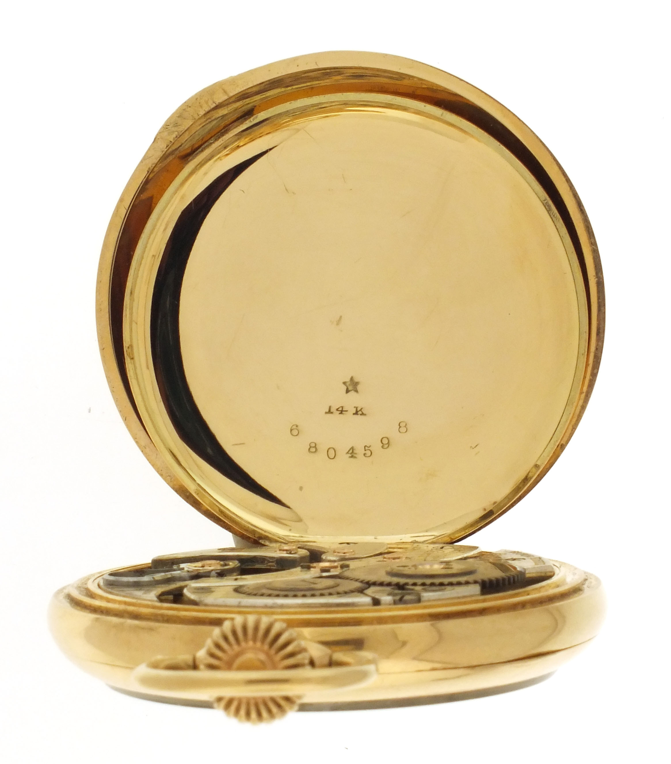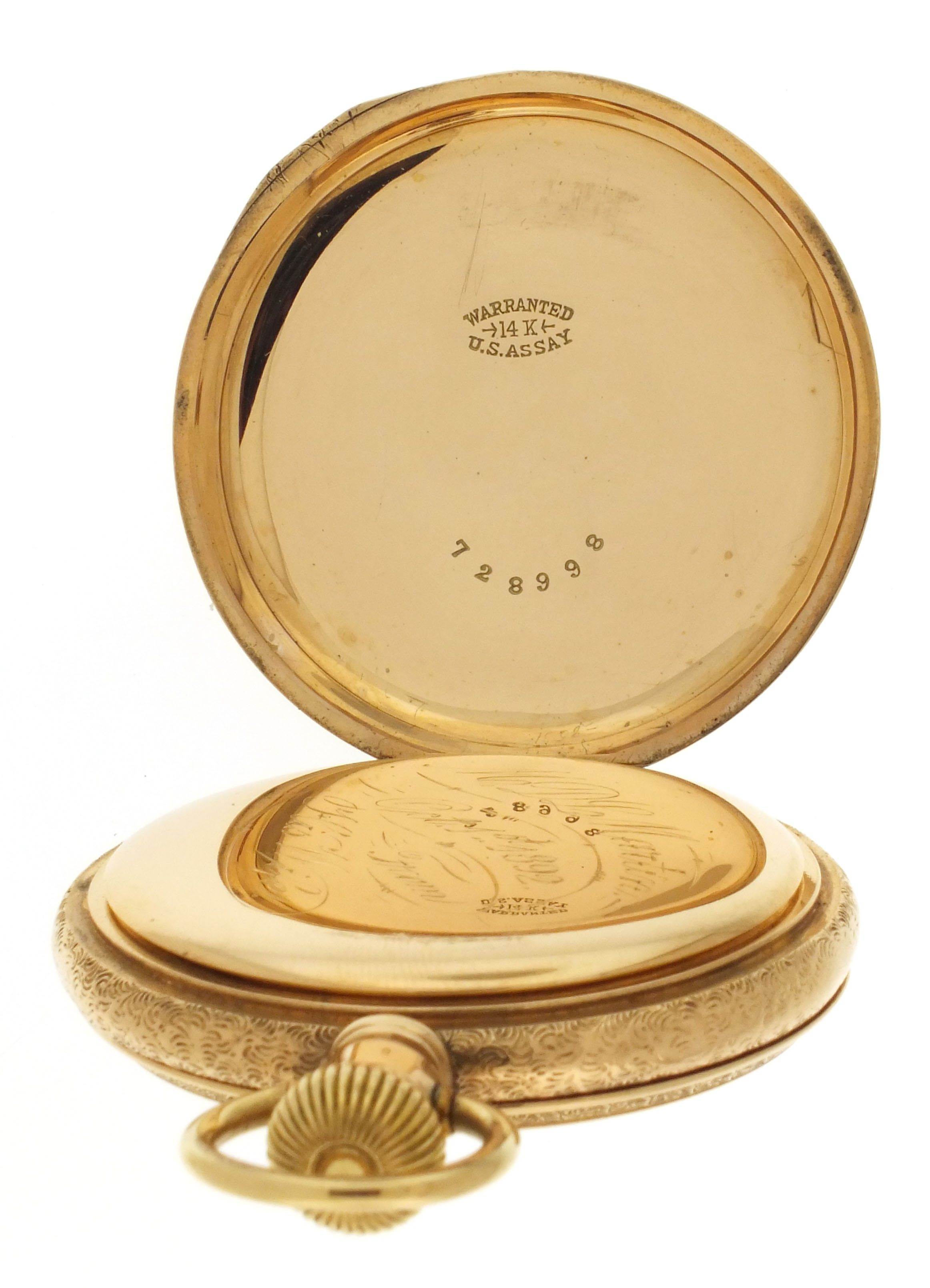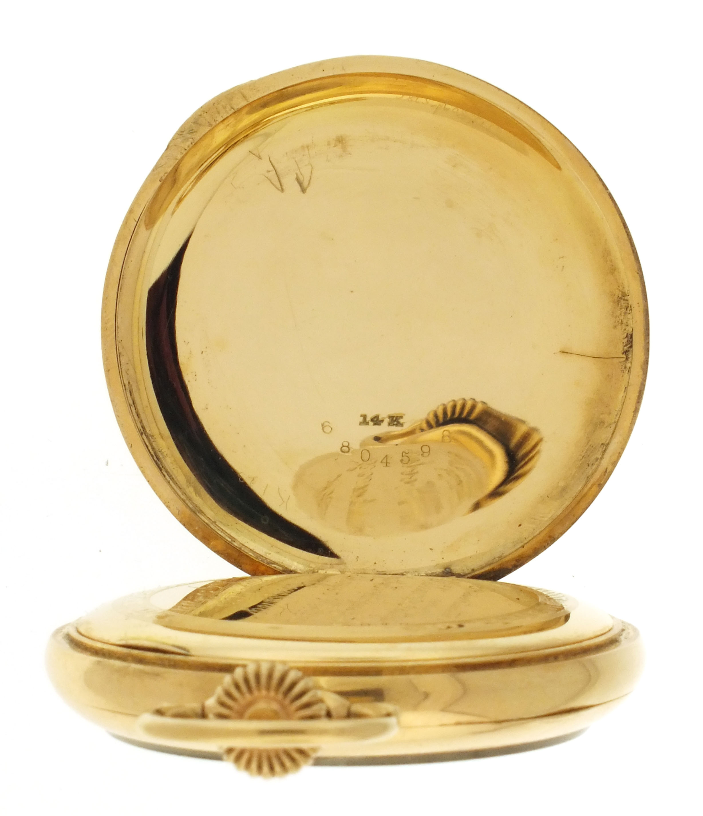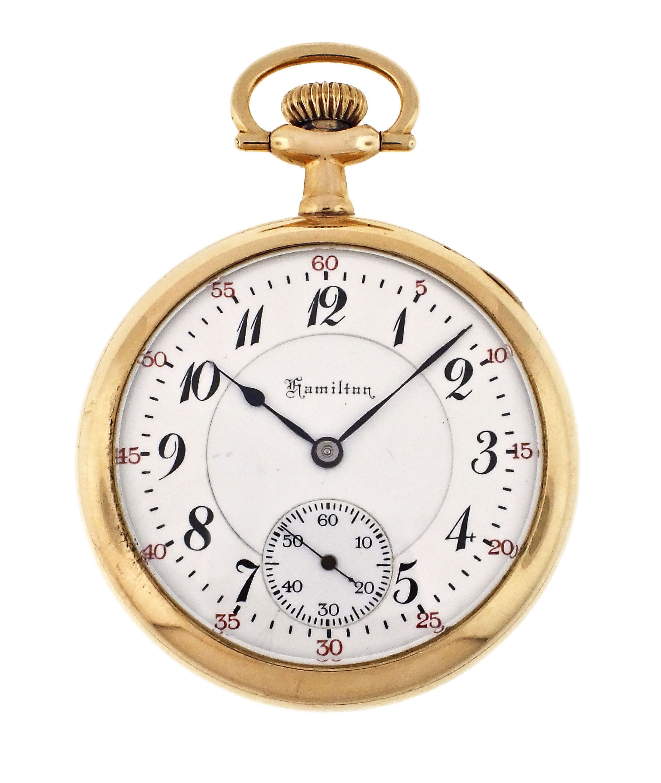 Hamilton Watch Co., Lancaster, Penn., a gold grade "950" pocket watch, 16 size, 23 jewels, stem wind and set, adjusted to 5 positions, temperature and isochronism, damascened nickel plate movement with lever escapement, cut bimetallic balance with gold screws, gold jewel settings, gold wheel train and whiplash micrometric regulator in a 14 karat, yellow gold, plain polished open face case with engraved monogram on back cover and engraved presentation on gold cuvette, arabic numeral, outer red 5-minute markers, double sunk white enamel dial with plum colored steel whip and spade hands, serial #1154926, 99.4g TW