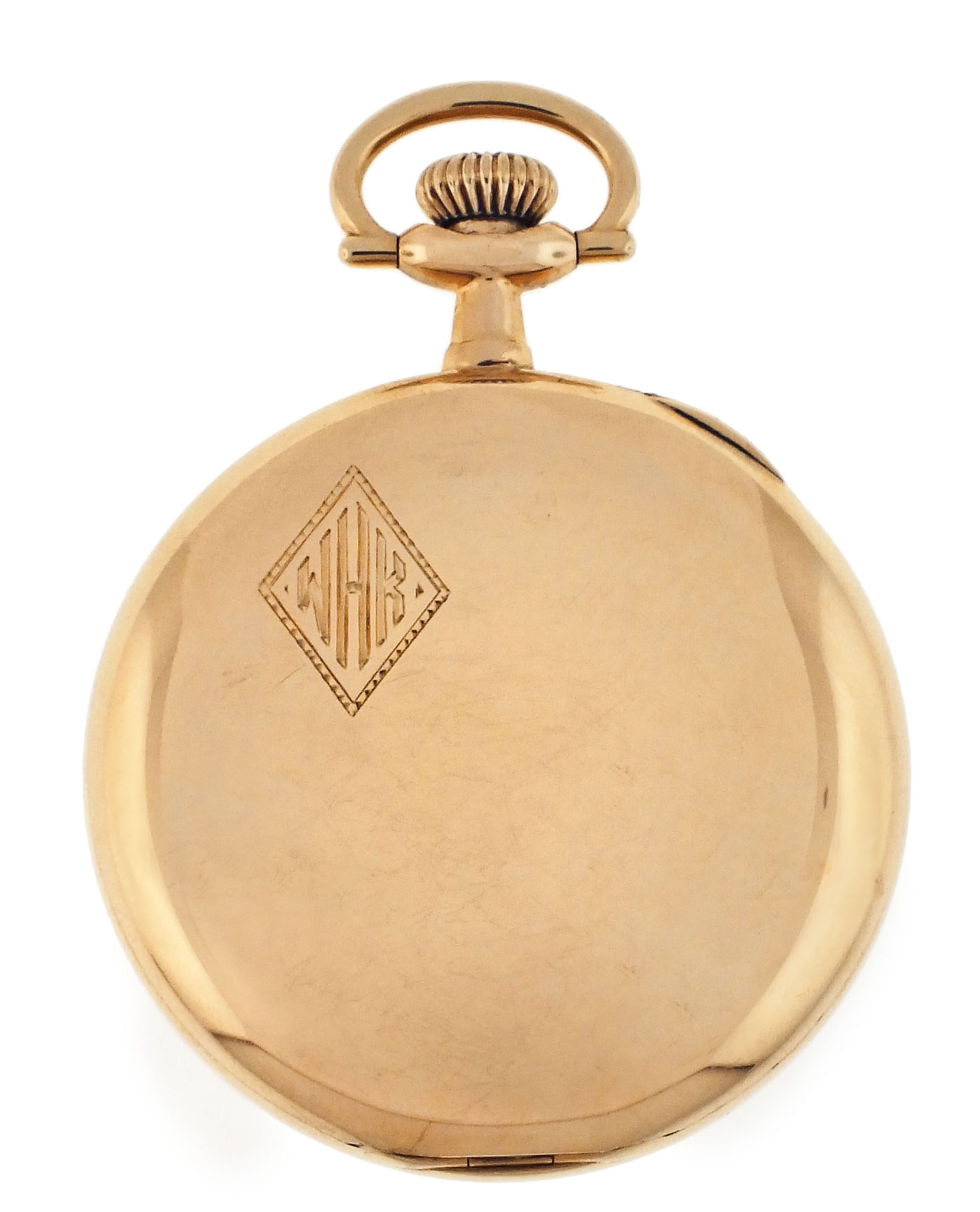CASE: Very fine scratches on outer surface of case; A few case knife scratches on bezel; A few scratches on inside of case back; Crown with wear; Precious metal content marked. DIAL: Faint hairlines, 6:30. HANDS: Minor oxide, minute. MOVEMENT PLATES: Fine marks and scratches on plate; Short gouge on barrel bridge; A few small spots on center bridge and fourth wheel cock; Patch of oxide on regulator spring. MOVEMENT FUNCTION: Running order (winds, sets and ticks).