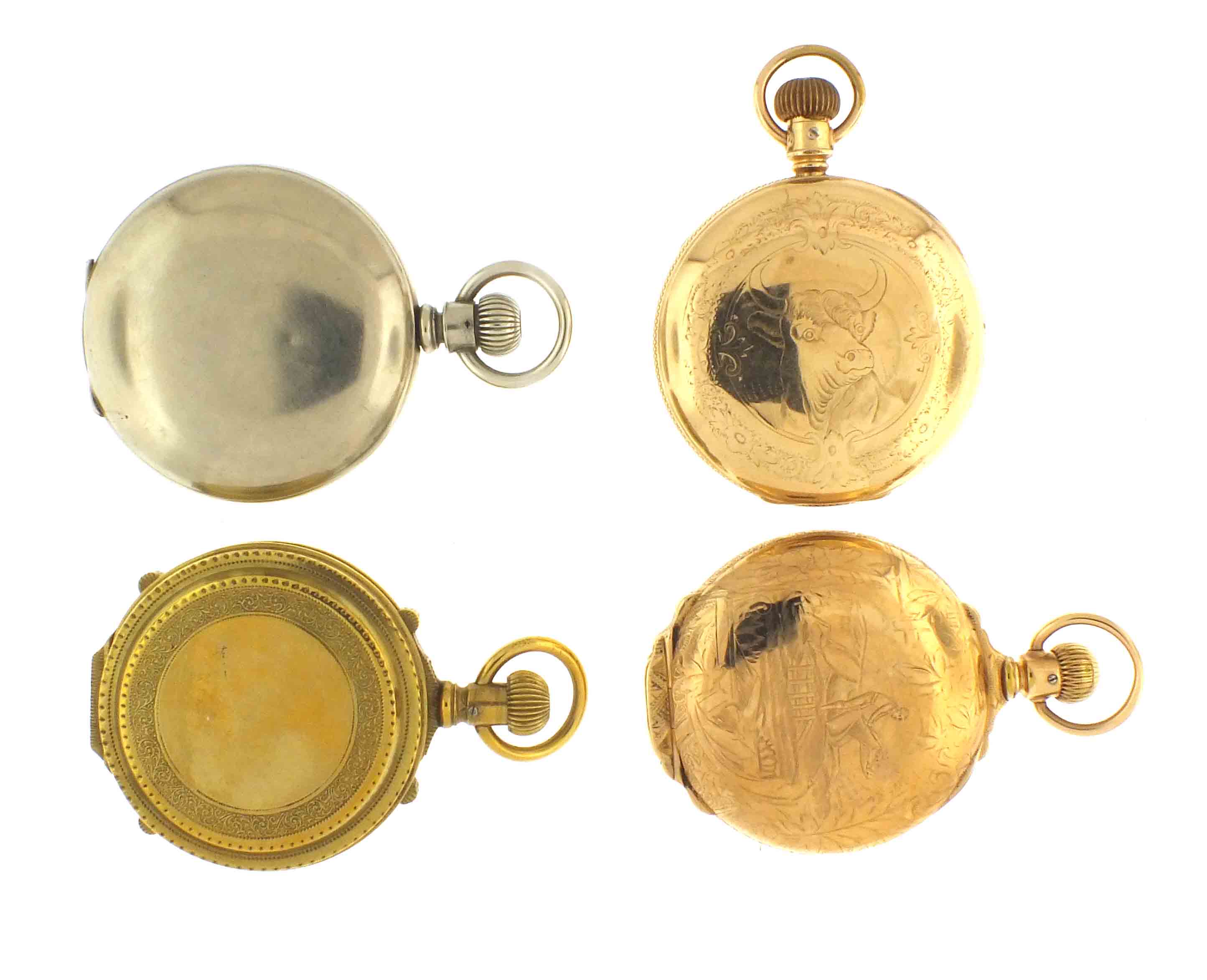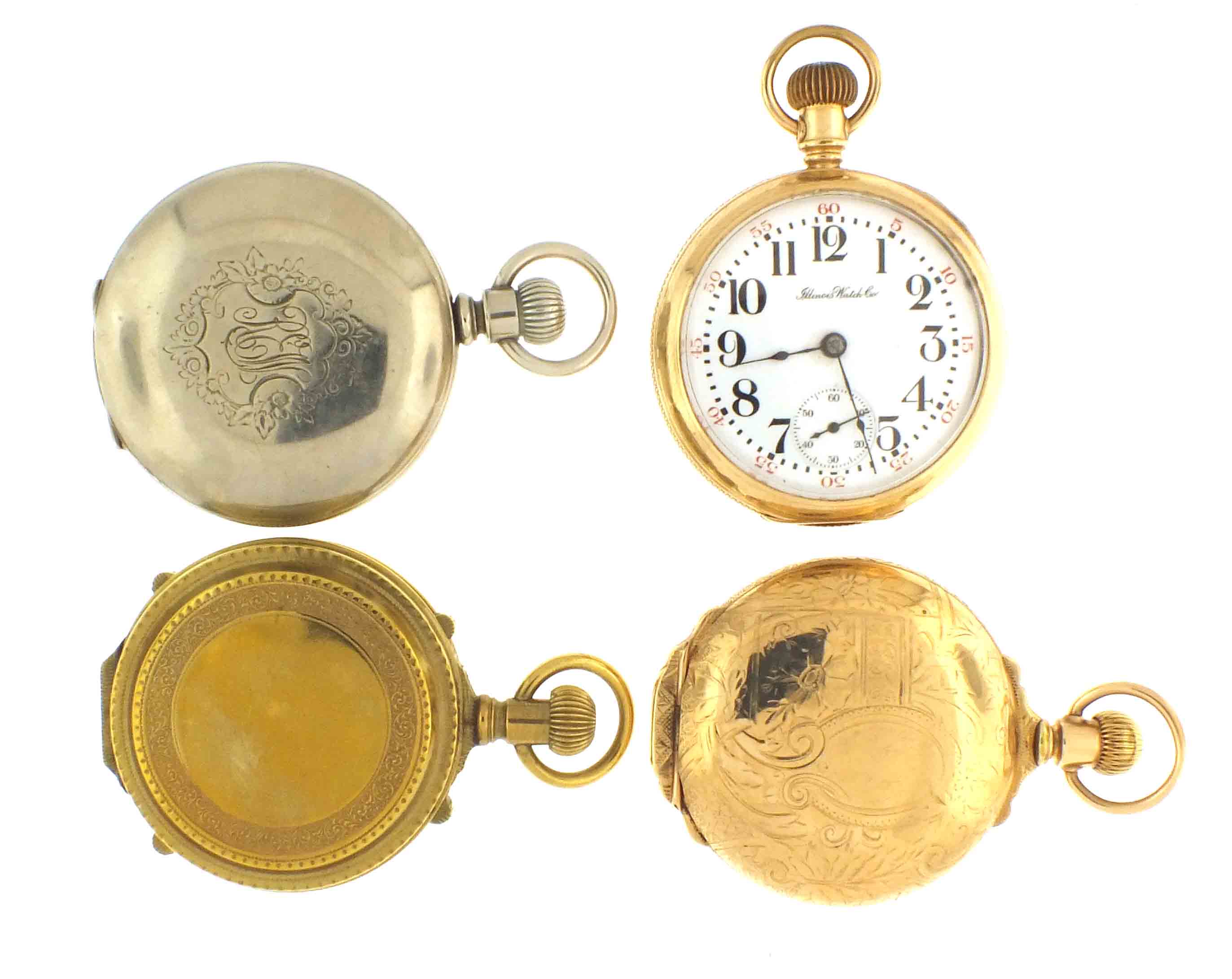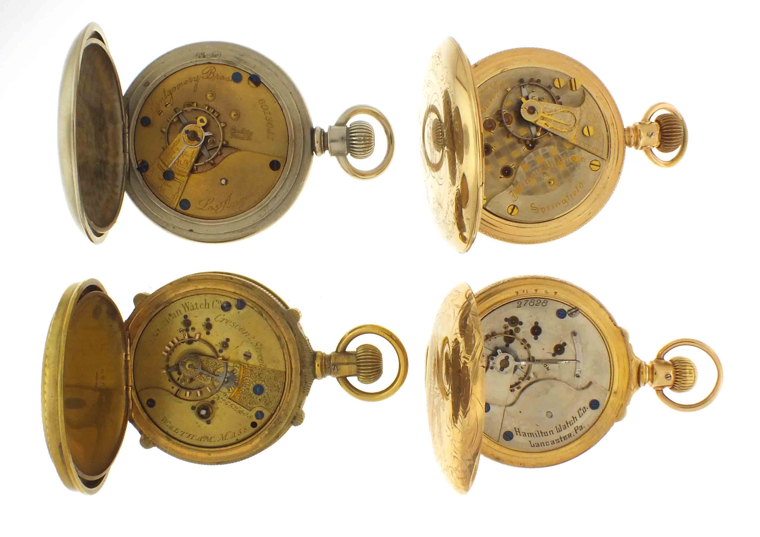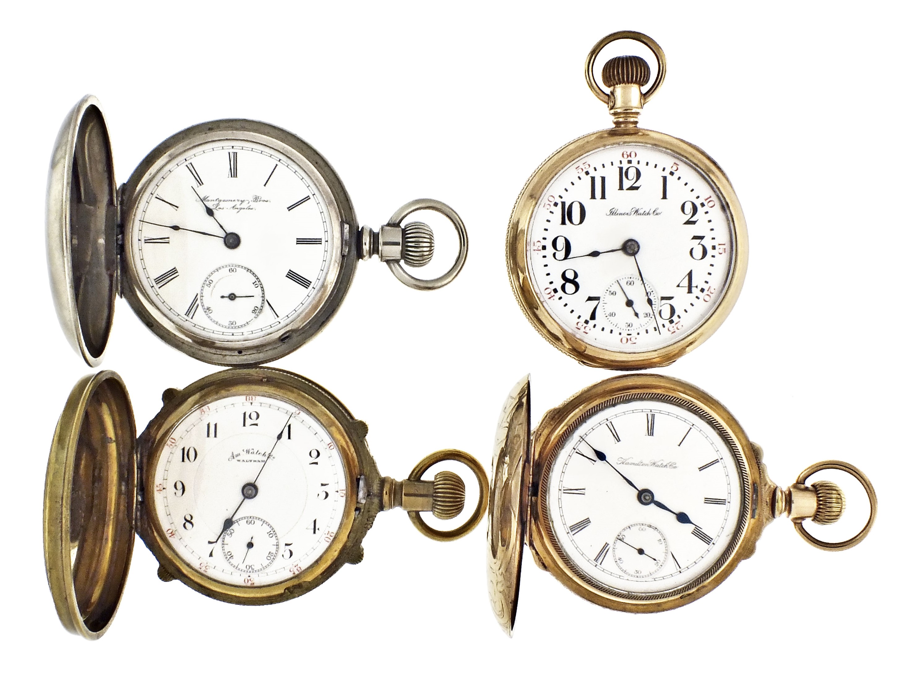 4 (Four) pocket watches, 18 size, including an Illinois, grade 89, 21 jewel two-toned movement in gold filled hunting case, serial #2317314, an Elgin watch for retailer Montgomery Bros., grade 96, 7 jewel movement in nickel hunting case, serial #6013641, a Hamilton "929", 15 jewel movement in gold filled hunting case, serial #27828, and a Waltham, "Crescent St.", 15 jewel movement in gold filled hunting case, serial #552408