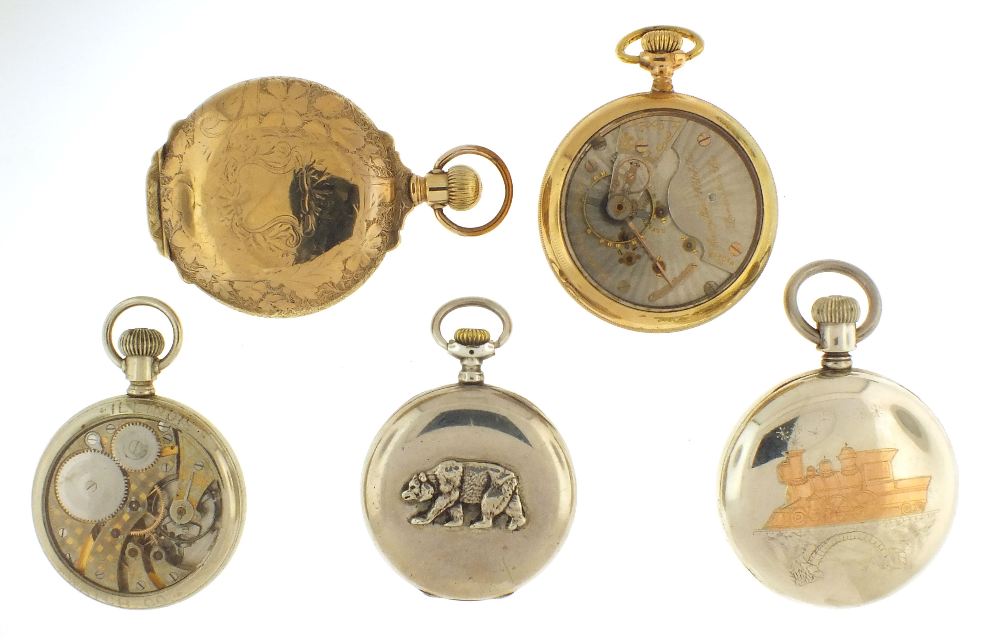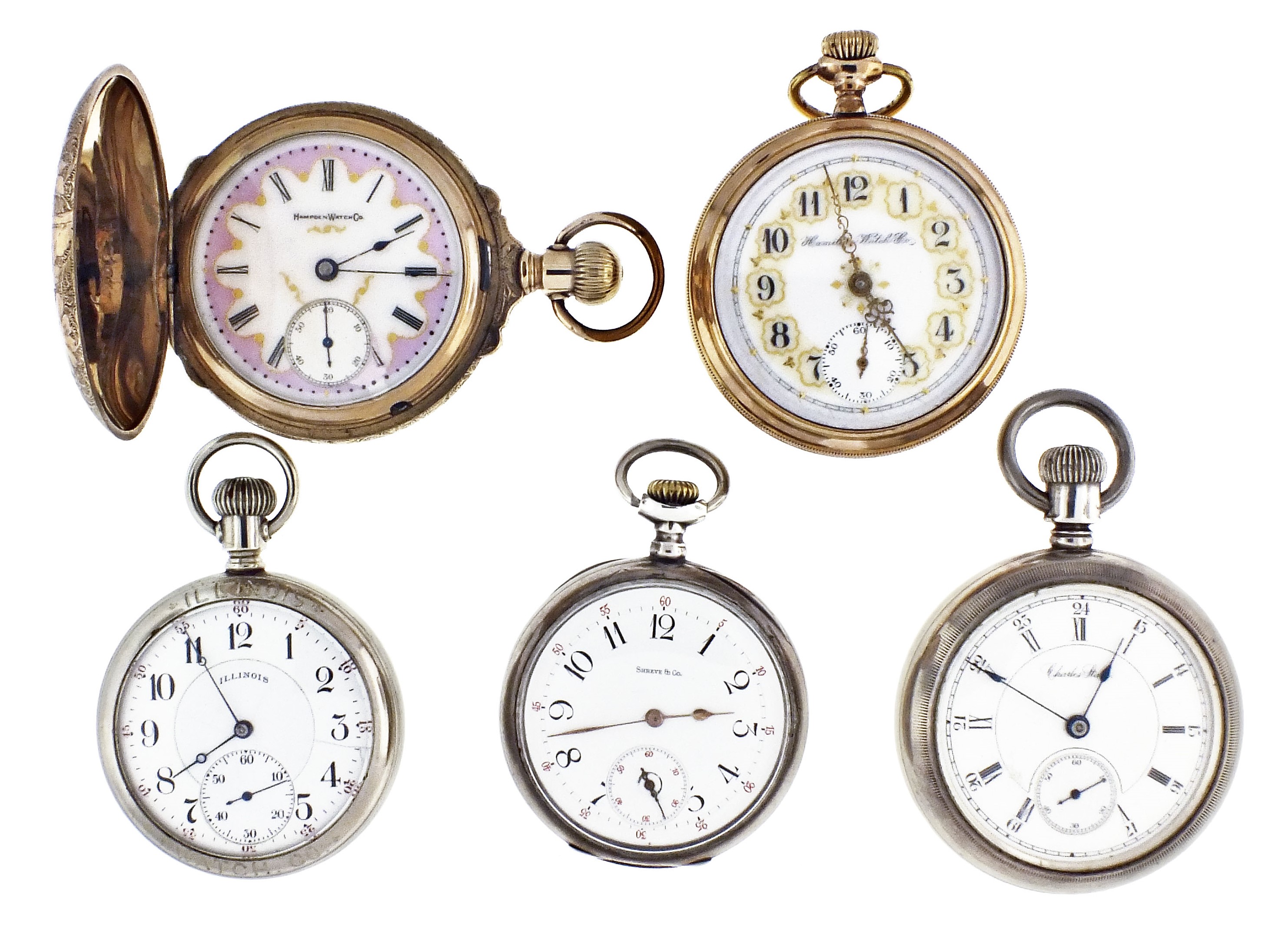 5 (Five) pocket watches, makers including Hamilton, Hampden, Illinois, Rockford and others, 16-18 size, 15-17 jewel movements, roman and arabic numeral enamel dials including two multicolor O'Hara style, nickel, nickel and gold filled display cases, open face and hunting cases