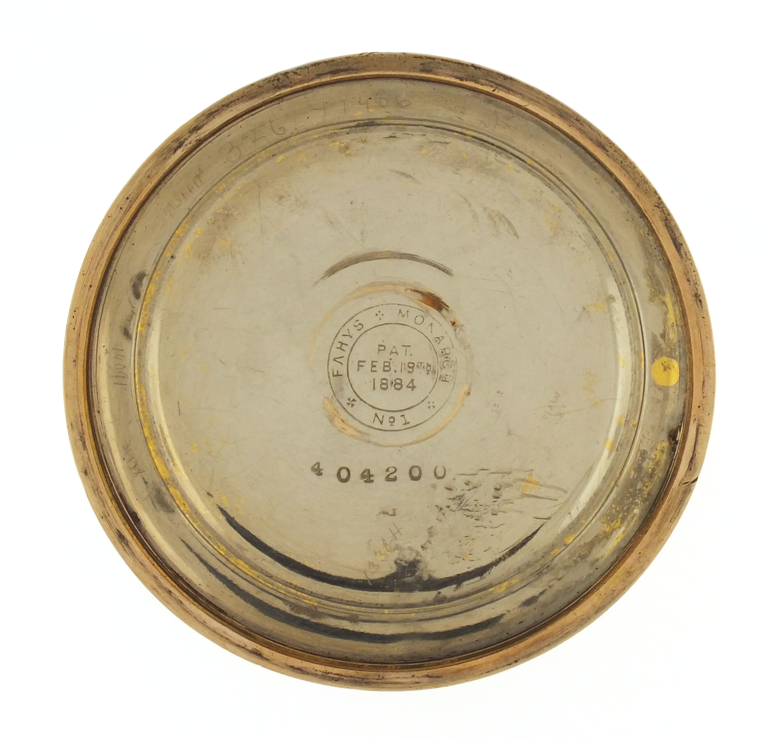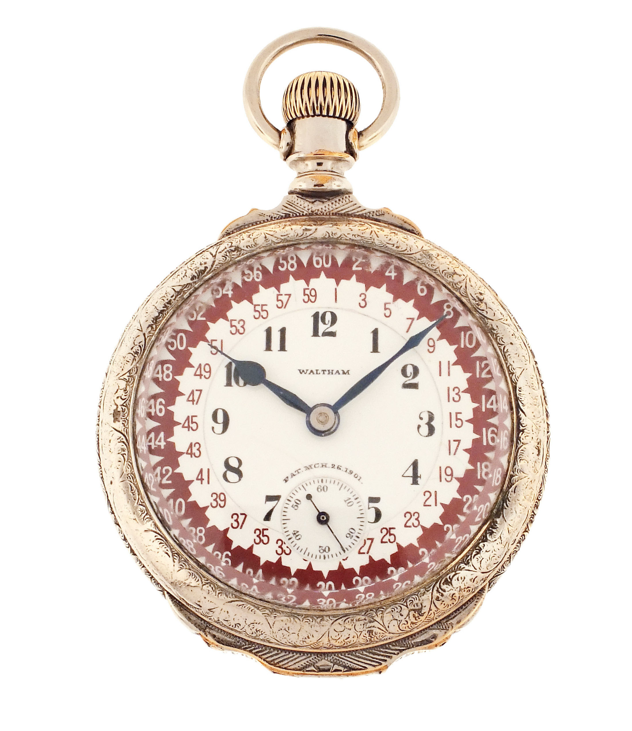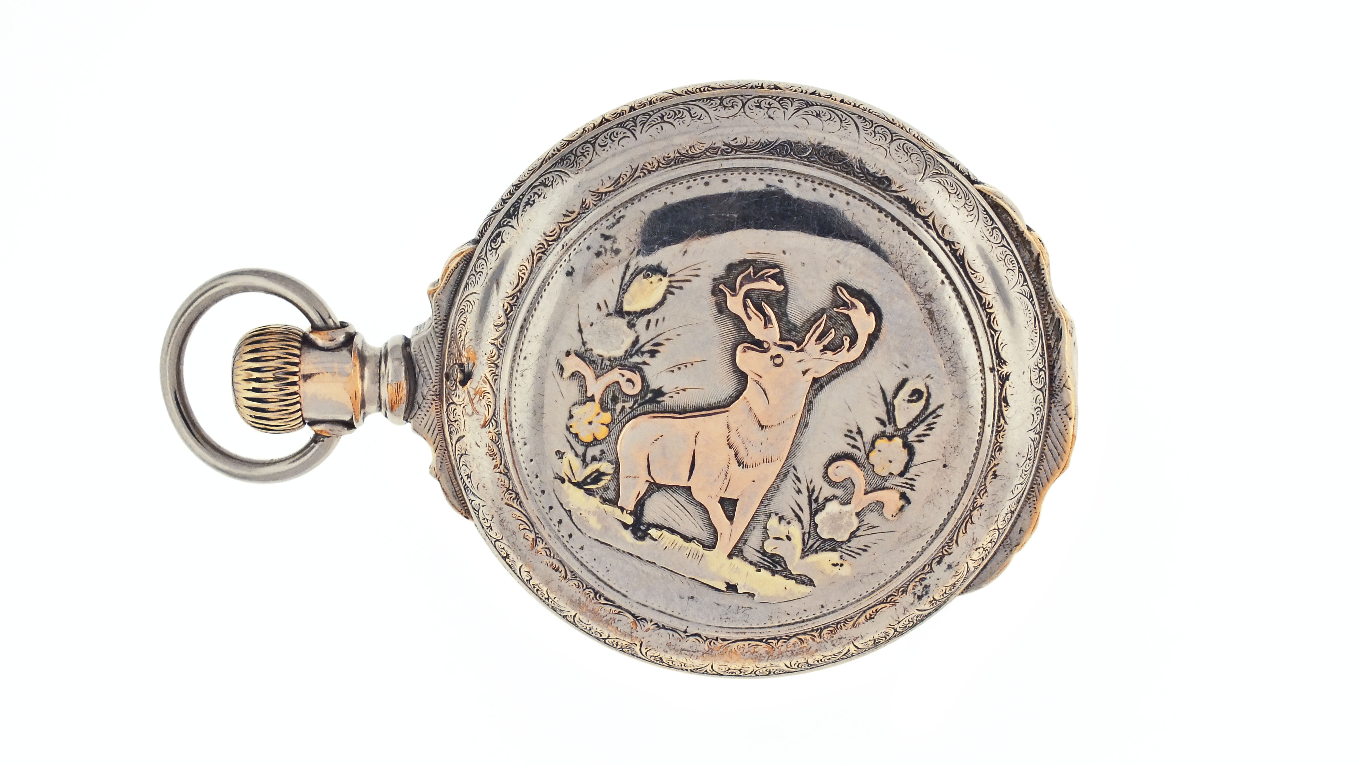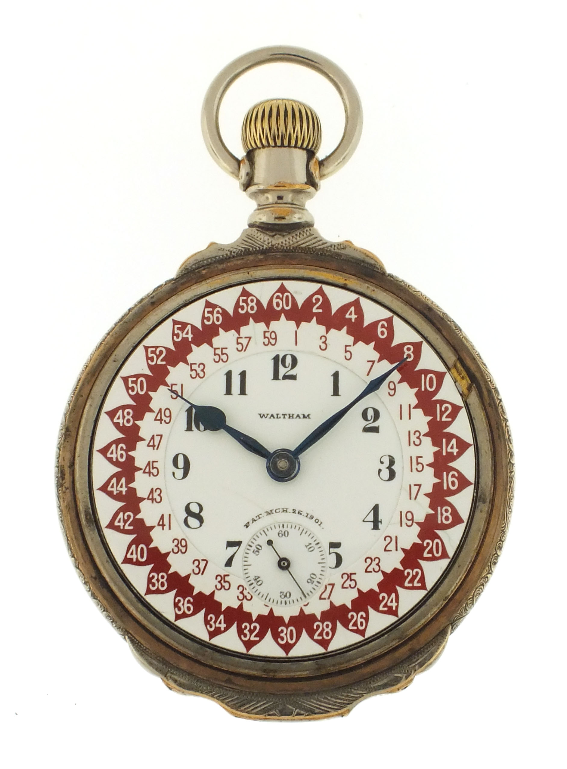 American Waltham Watch Co., Waltham, Mass., an early 20th century model 1892 "Crescent St." pocket watch, 18 size, 21 jewel, stem wind and lever set, adjusted, damascened nickel plate movement with lever escapement, cut bimetallic balance with gold screws, gold jewel settings, and Church micrometric regulator in a gold filled, screw back and bezel, engraved open face case, the back with gold buck and multicolor foliage, arabic numeral, double sunk, Fitch patent staggered marginal minute white enamel dial with blued steel spade and poker hands, serial #11001765