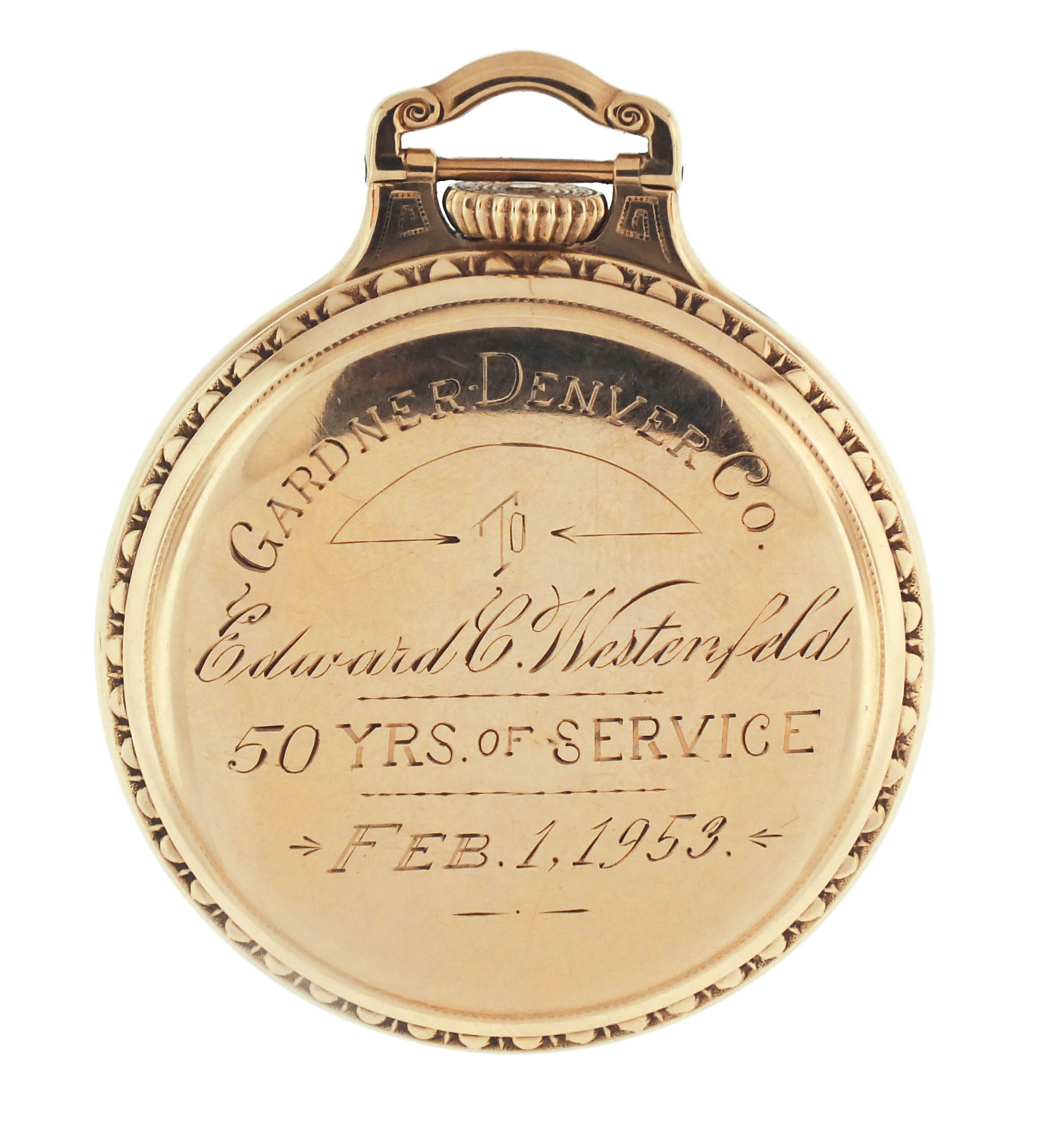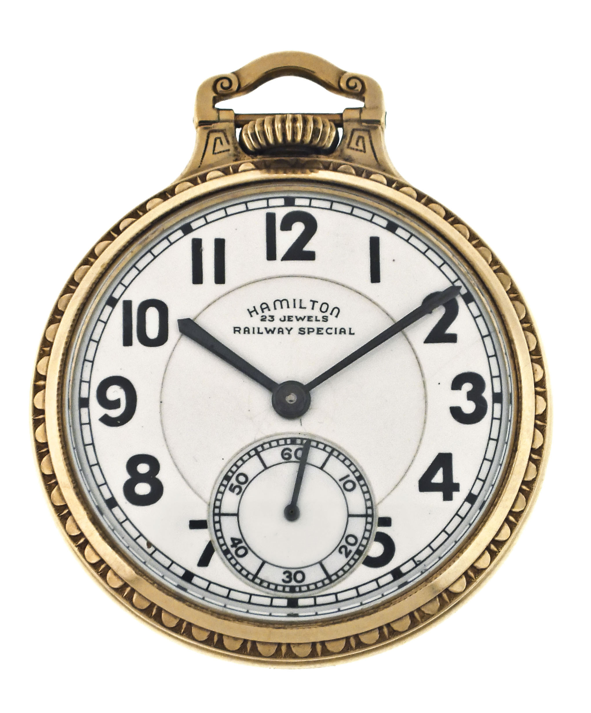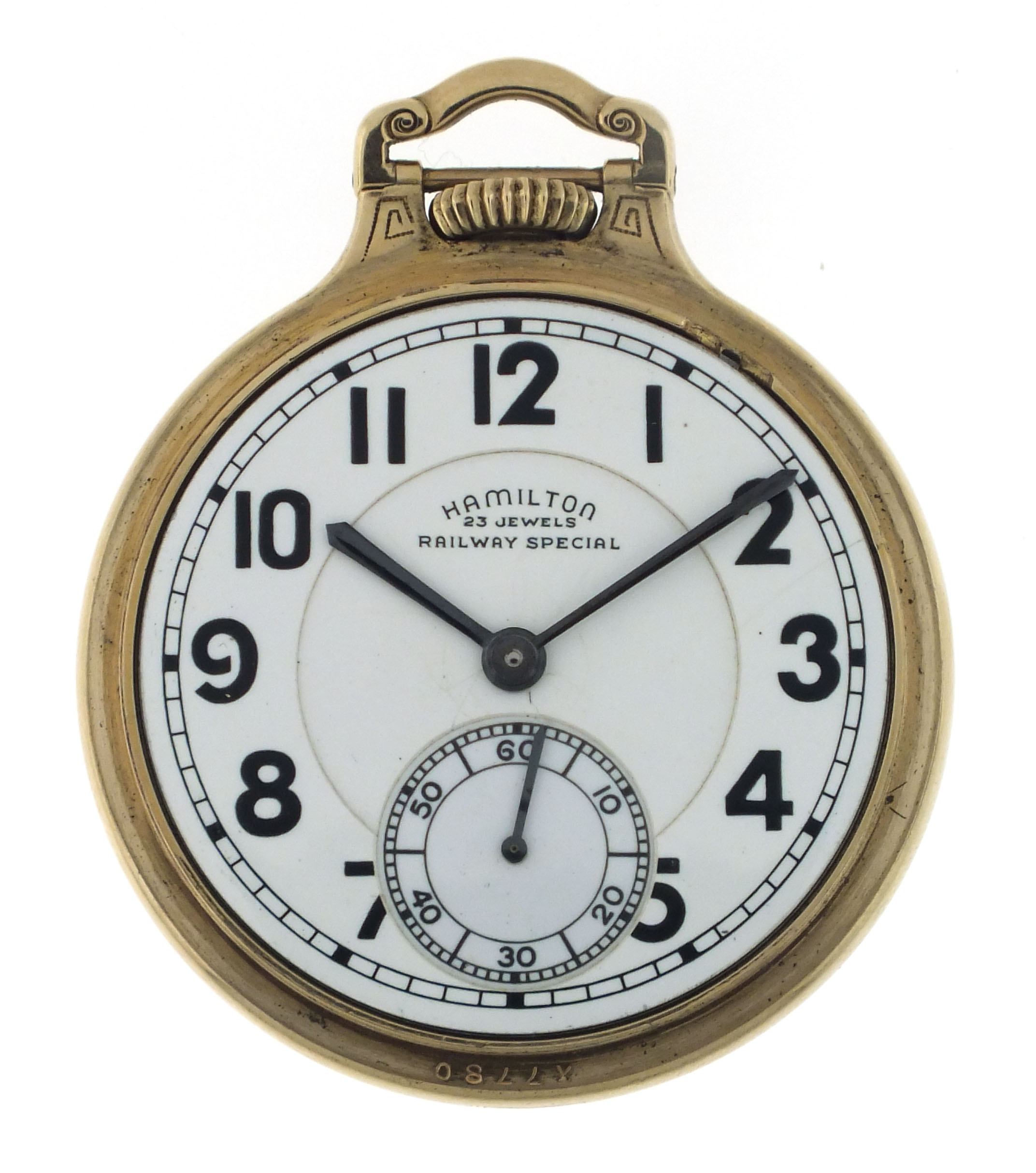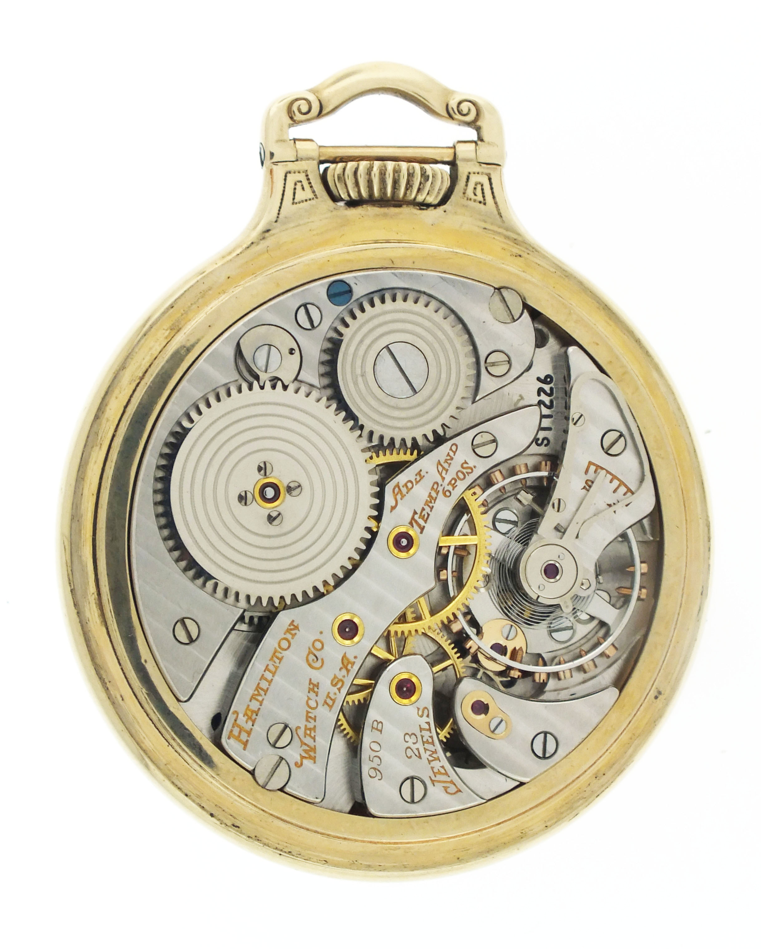 Hamilton Watch Co., Lancaster, Penn., a mid 20th century grade "950B" pocket watch, 16 size, 23 jewels, stem wind and lever set, adjusted to 6 positions, temperature and isochronism damascened nickel plate movement with lever escapement, monometallic balance with gold screws and whiplash micrometric regulator in a gold filled, screw back and bezel, open face bar over crown case with engraved presentation on back, arabic numeral, double sunk white enamel dial marked "Hamilton 23 Jewels Railway Special", with black baton hands, serial #S11226