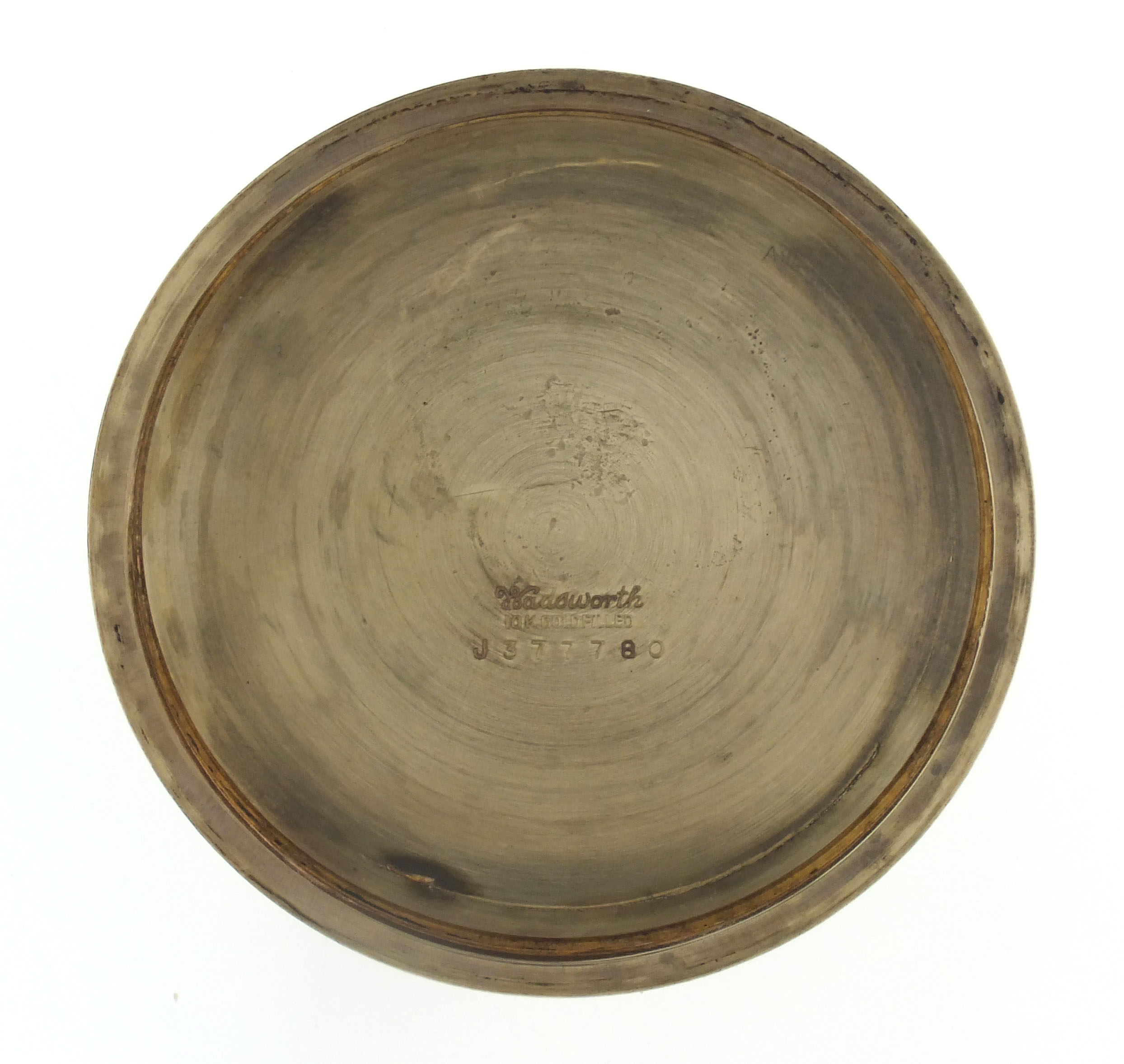 CASE: Dings, band; Very fine scratches on outer surface of case; Dings on inner surface of case; Inside of back with case screw scratch; Gold filled with very minor brassing. DIAL: Faint hairline, 2:30; Faint hairlines at center. HANDS: Good. MOVEMENT PLATES: Very fine marks and scratches on plate. MOVEMENT FUNCTION: Running order (winds, sets and ticks).
