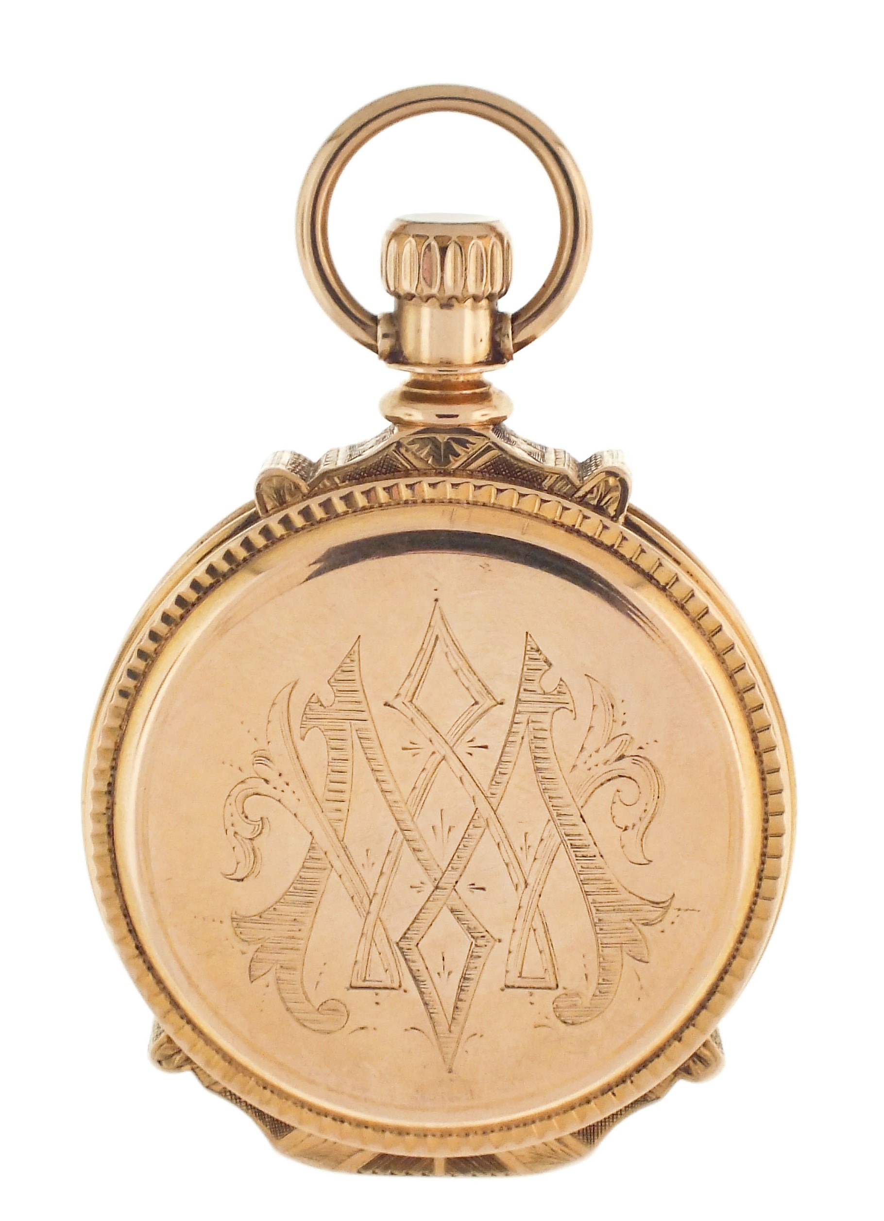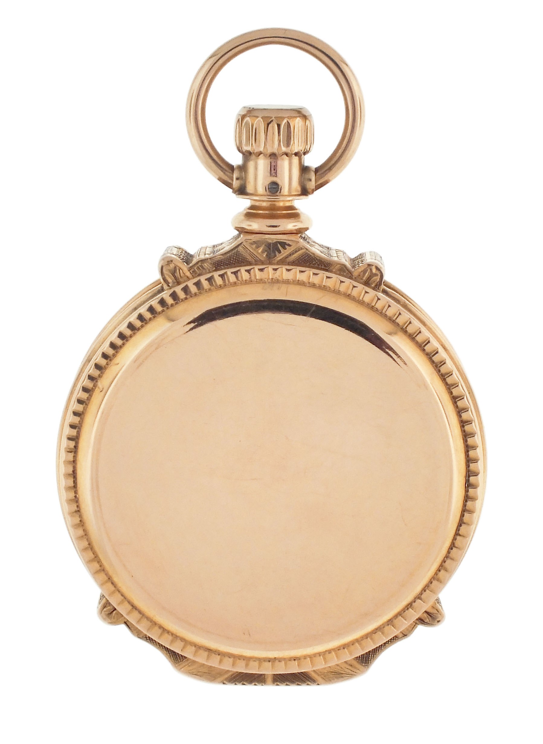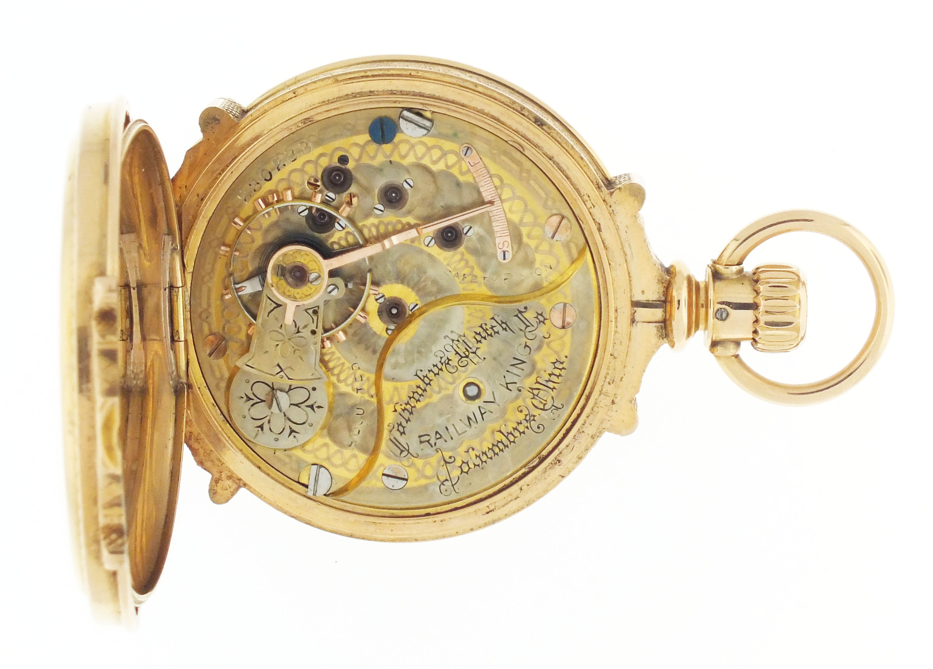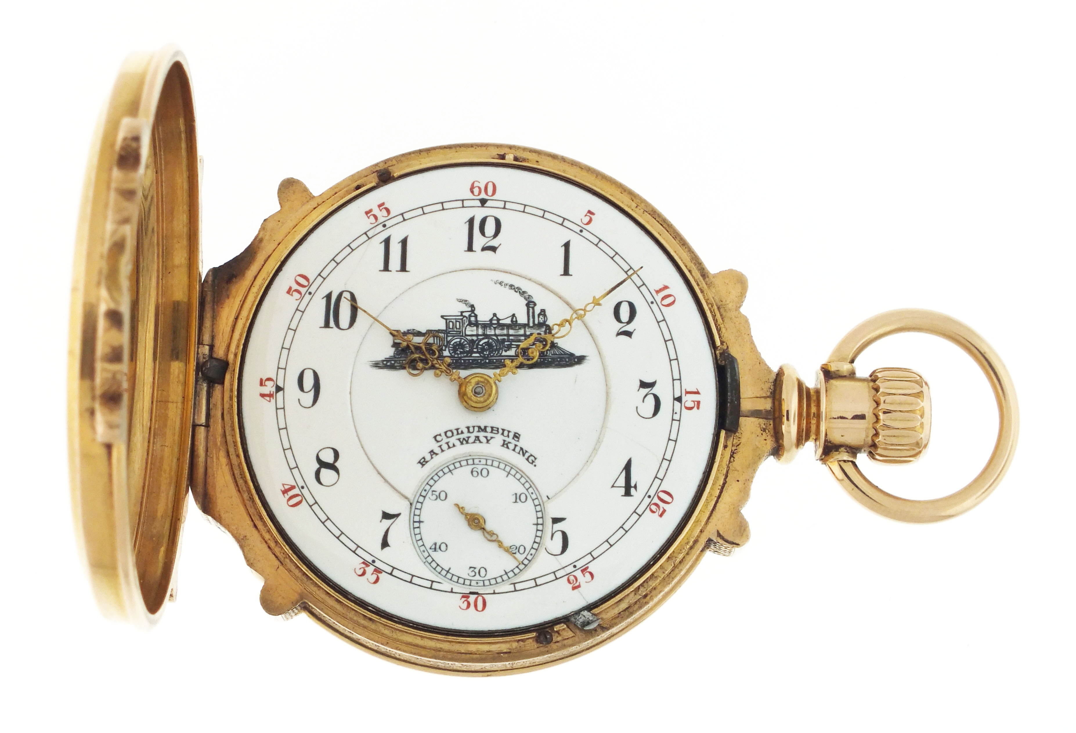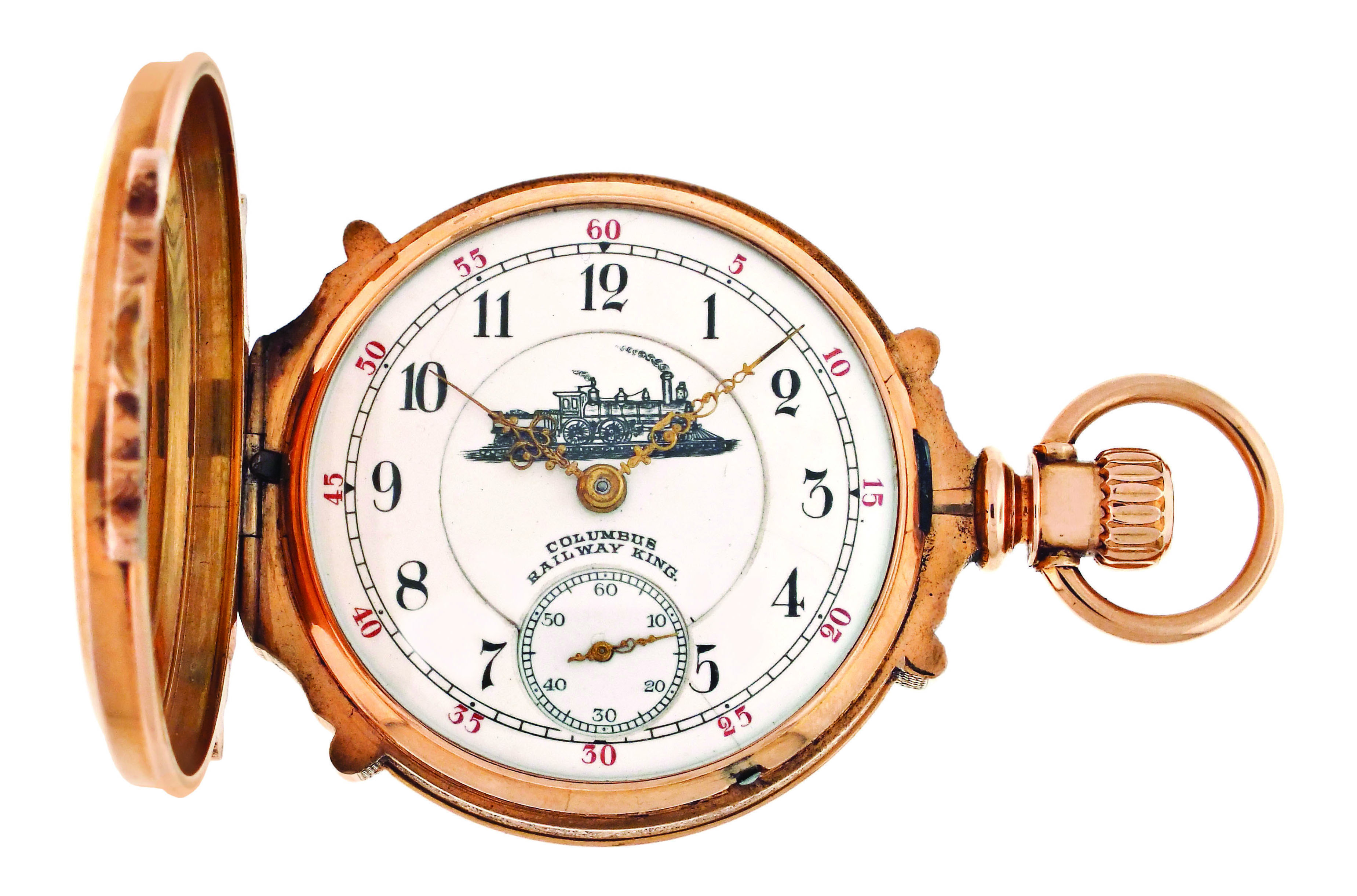 Columbus Watch Co., Columbus, Ohio, a good "Columbus Railway King" pocket watch, 18 size, 16 jewels, stem wind and lever set, adjusted to 5 positions, two tone damascened nickel plate movement with lever escapement, cut bimetallic balance with gold screws, gold jewel settings and micrometric regulator in a heavy, 18 karat rose gold, engraved hunting case with engraved cipher on front cover, arabic numeral, outer red 5-minute markers, double sunk white enamel dial with locomotive and marked "Columbus Railway King", gilt Louis XIV hands, serial #230233, 170.7g TW