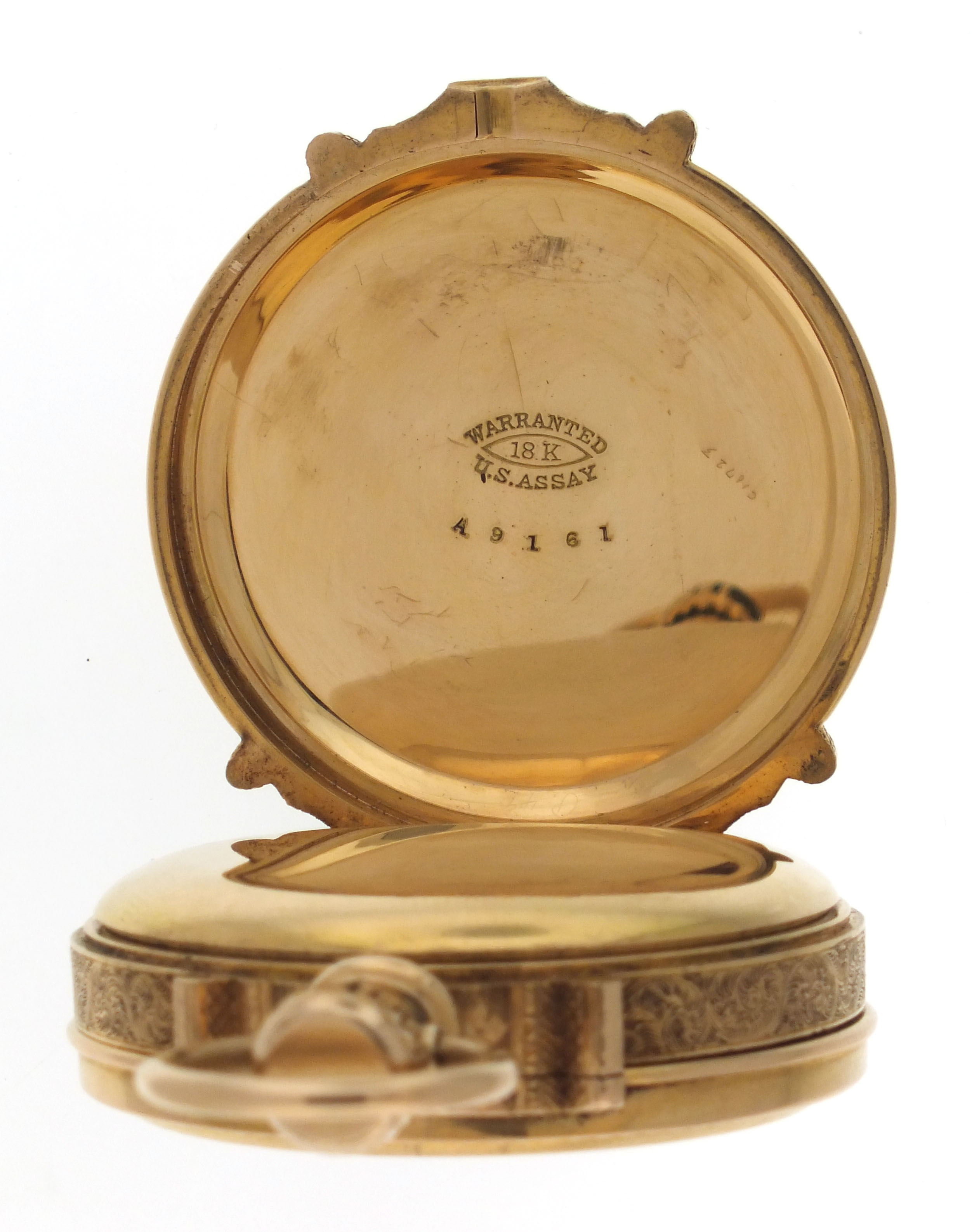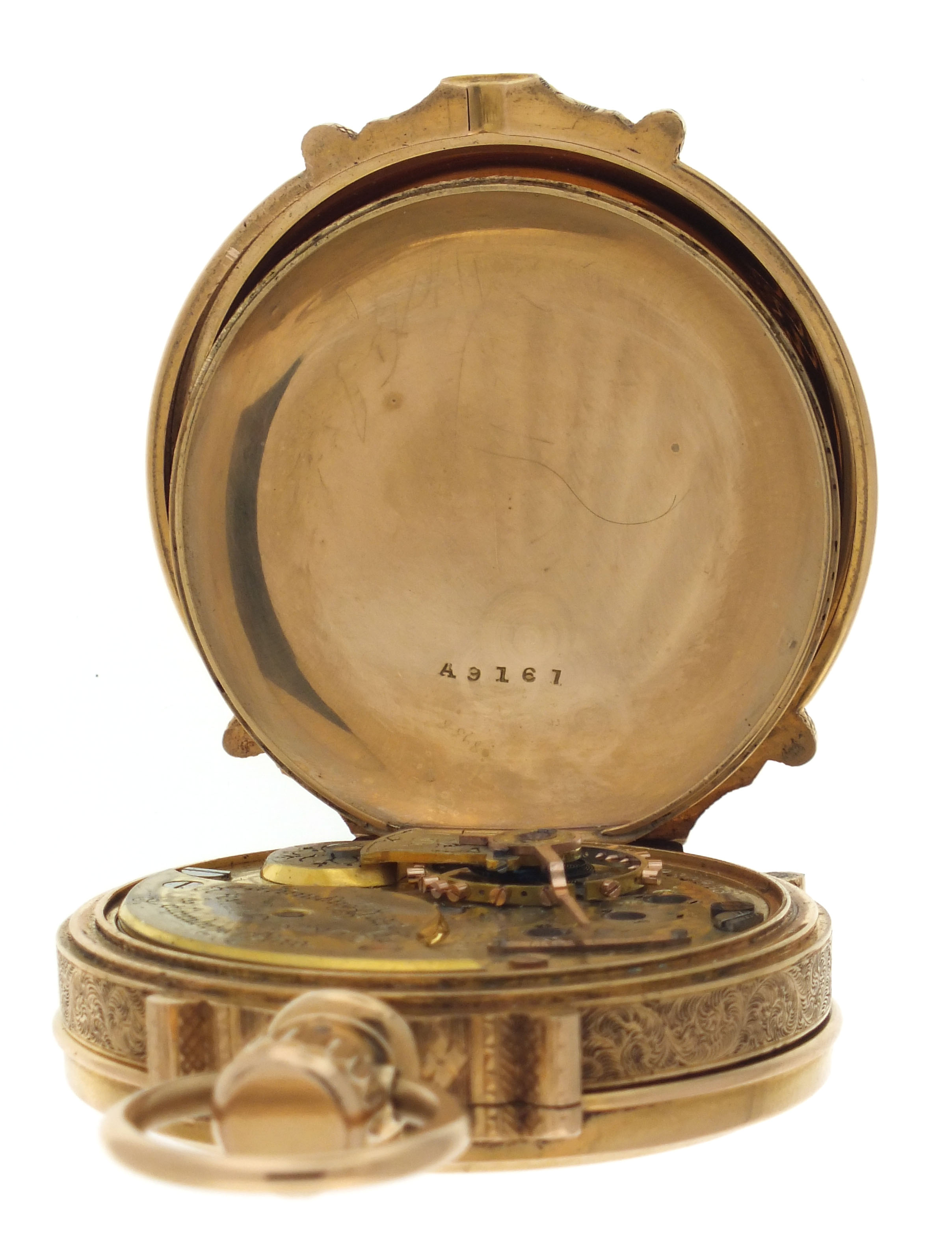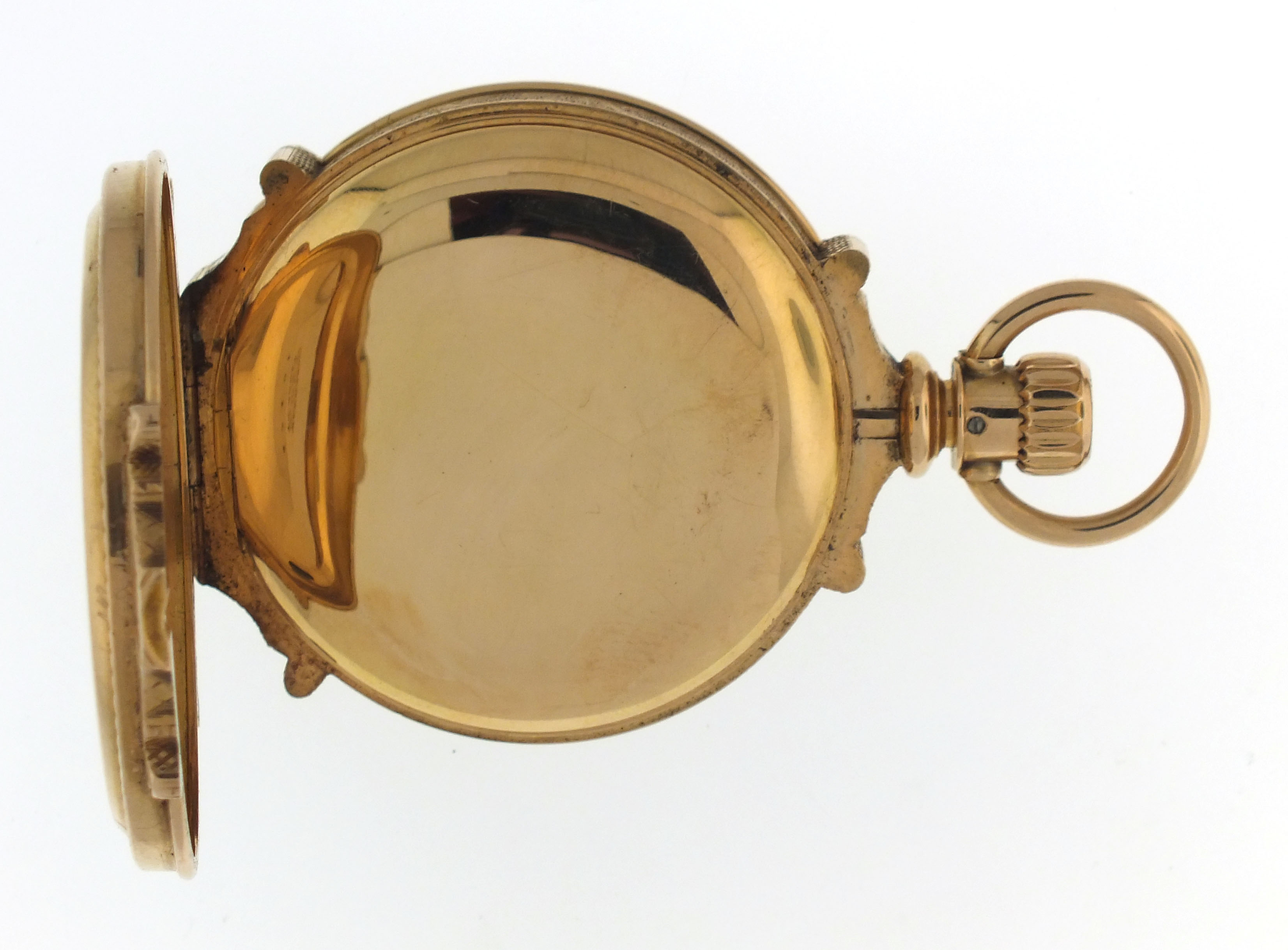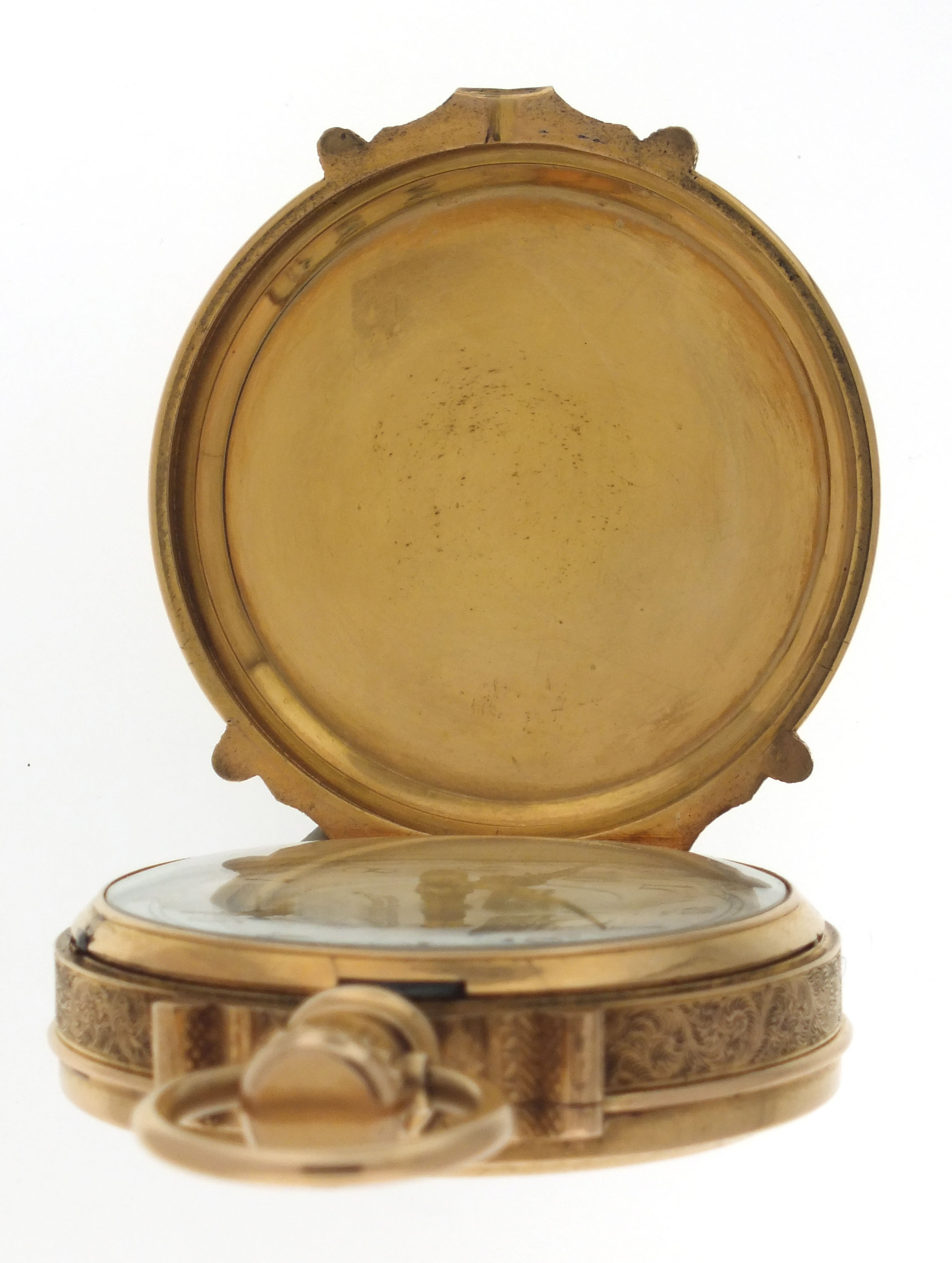 CASE: Case has housed another movement; A few shallow dents, back; Fine scratches on outer surface of case; Two short scratches on front cover, below pendant; A few short scratches on back cover; Very fine scratches on cuvette; Fine scratches on inner surface of case back; Front cover with gap at band when closed; Crystal loose; Bow and hinges tight; Crown worn; Precious metal content marked. DIAL: Hairlines at 4, 5, and 10:00; Minor scratches. HANDS: Replaced. MOVEMENT PLATES: Fine scratches on barrel bridge; Losses to gold plating on bridge screws; Losses to blacking in engraving; Regulator spring missing; Specks of dirt. MOVEMENT FUNCTION: Running order (winds, sets and ticks).
