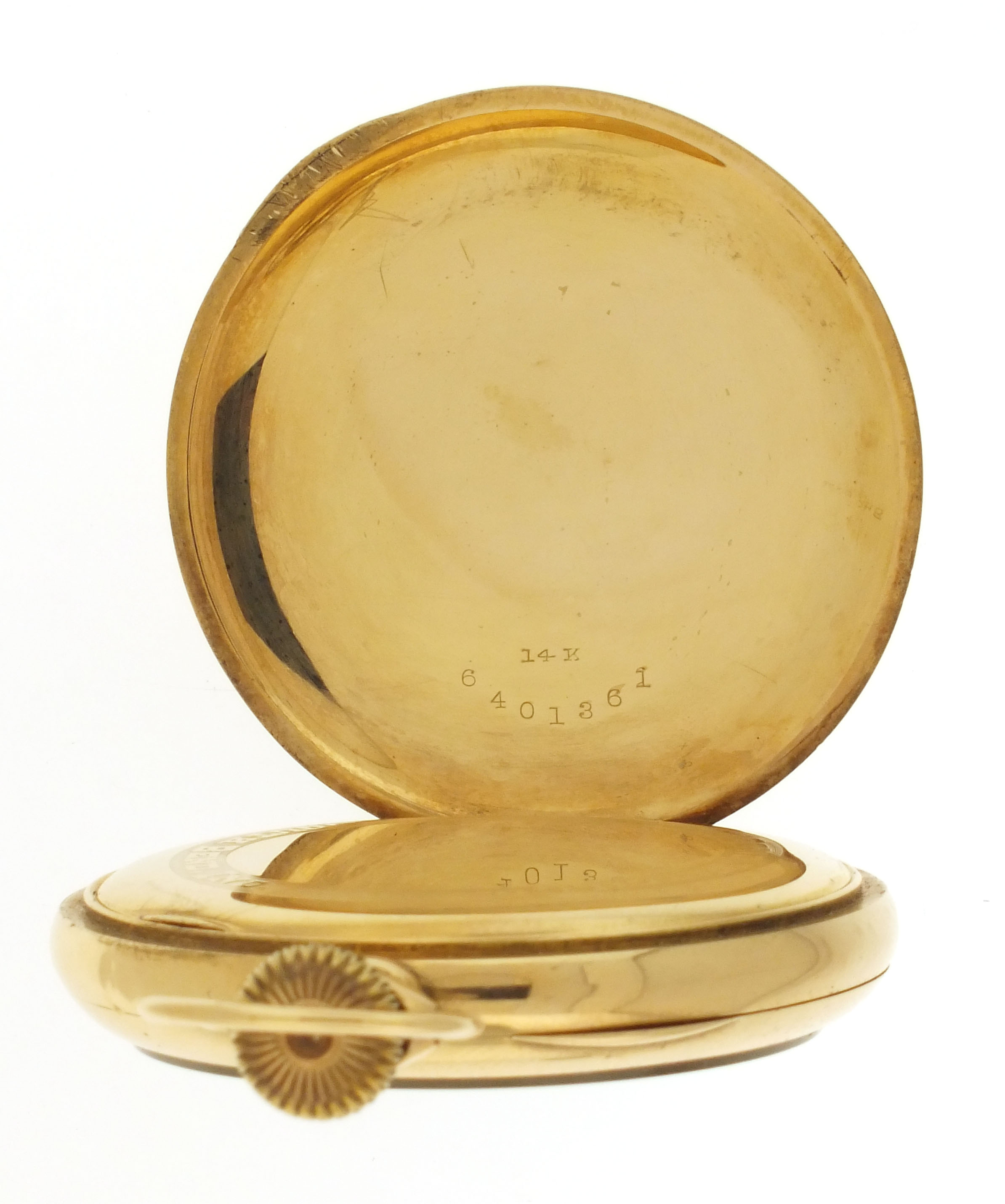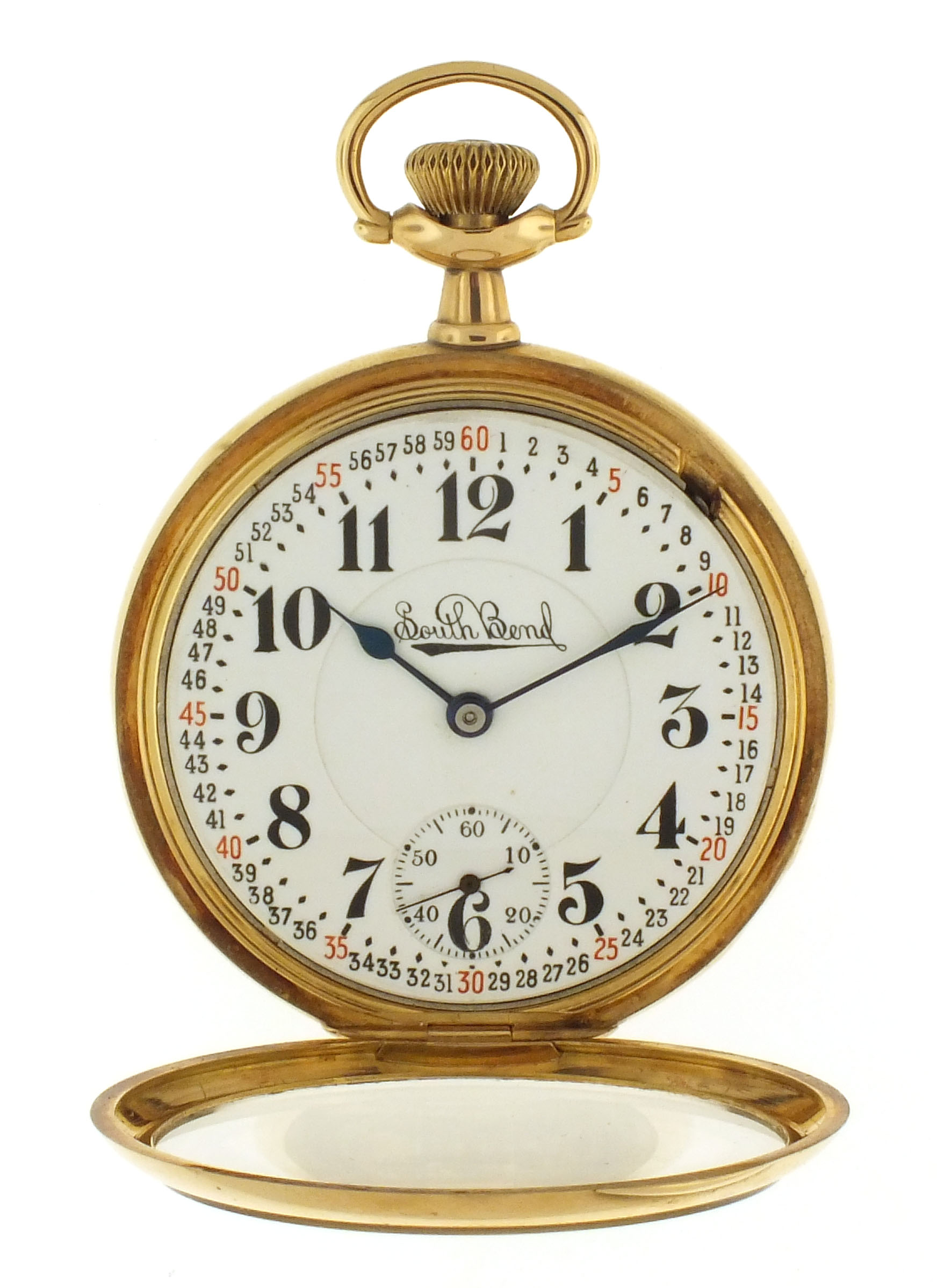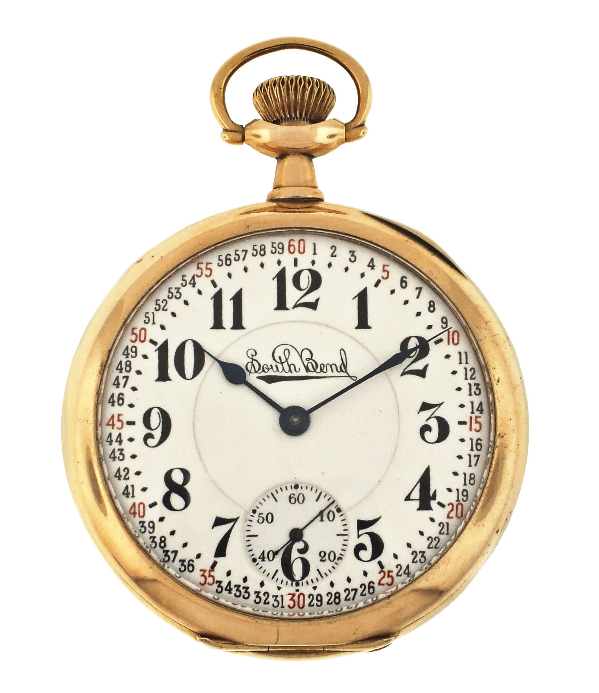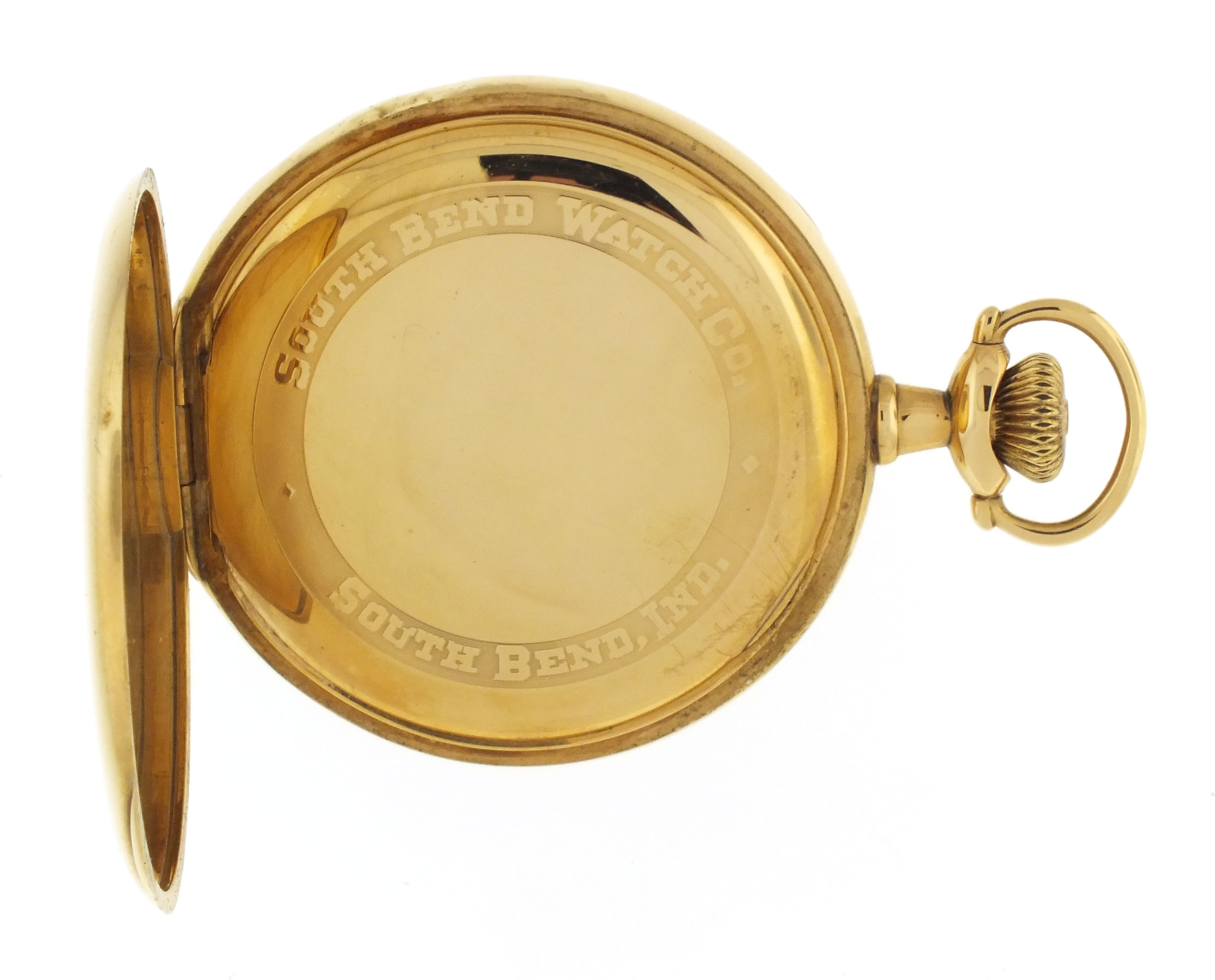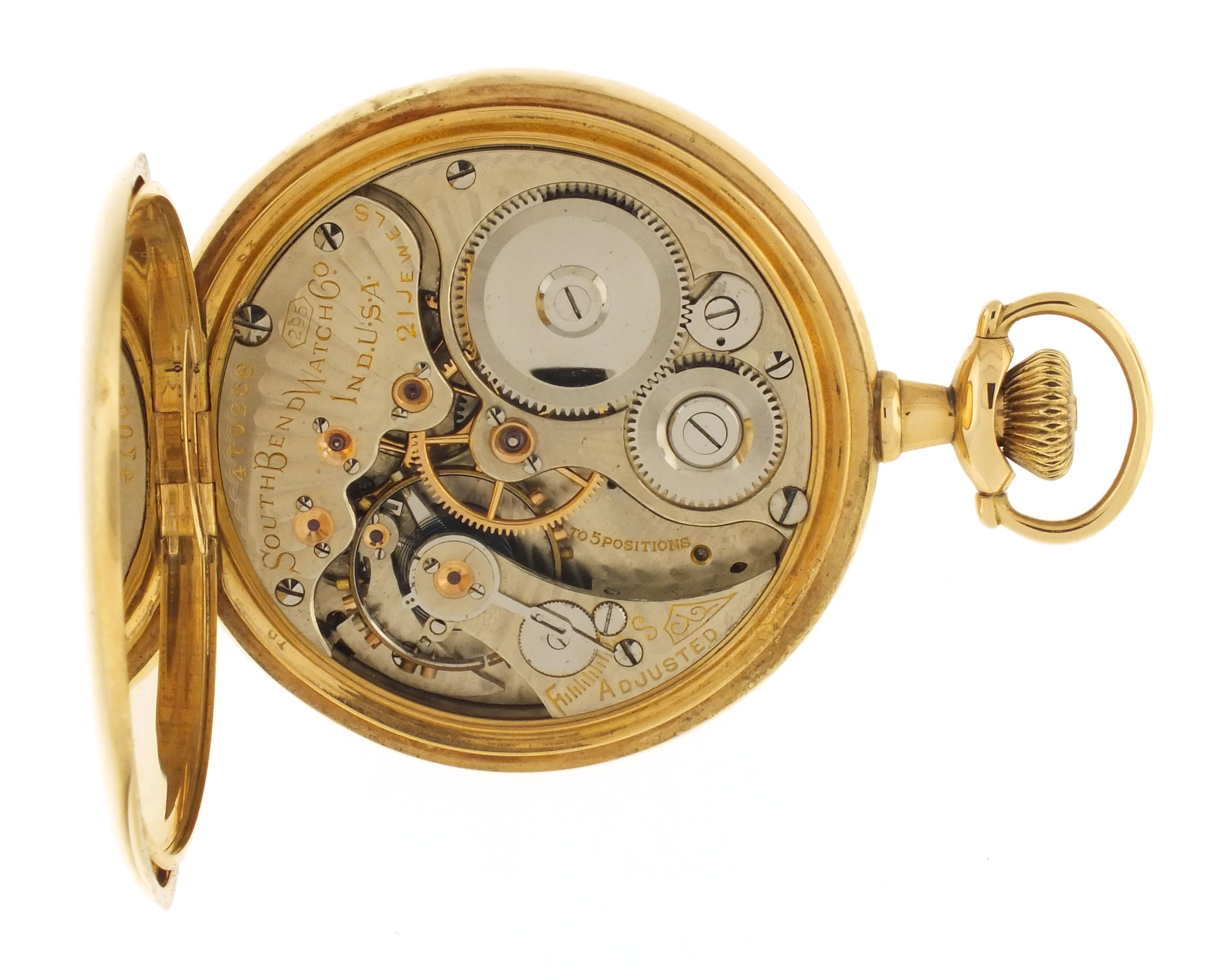 South Bend Watch Co., South Bend, Indiana, an early 20th century grade 295 pocket watch, 16 size, 21 jewels, stem wind and lever set, adjusted to 5 positions, temperature and isochronism, damascened nickel plate movement with lever escapement, cut bimetallic balance with gold screws, gold jewel settings, gold wheel train, and micrometric regulator in a 14 karat, yellow gold, plain polished open face case with makers details on gold cuvette, Montgomery arabic numeral, double sunk white enamel dial with blued steel spade and poker hands, serial #470258, 88.2g TW