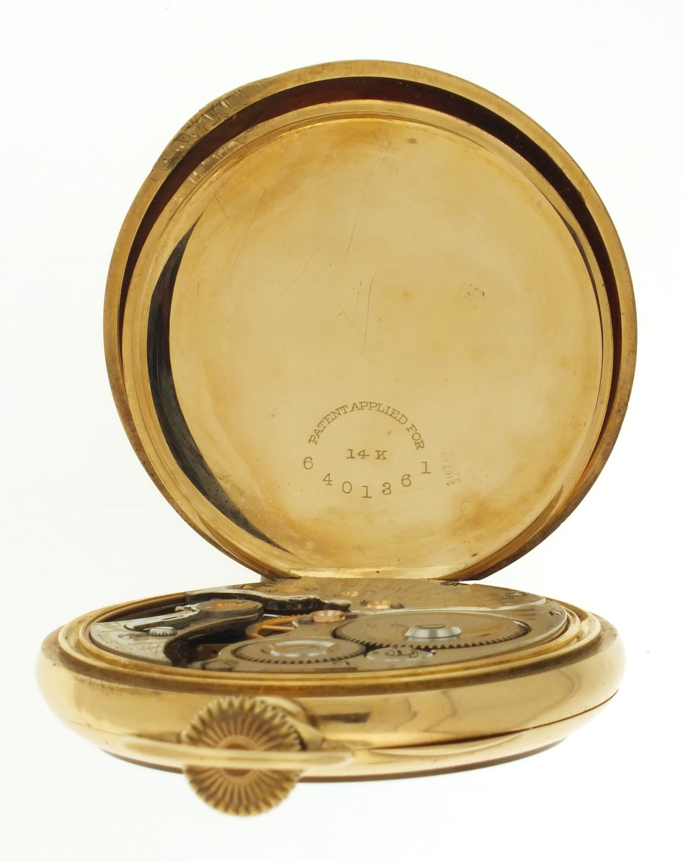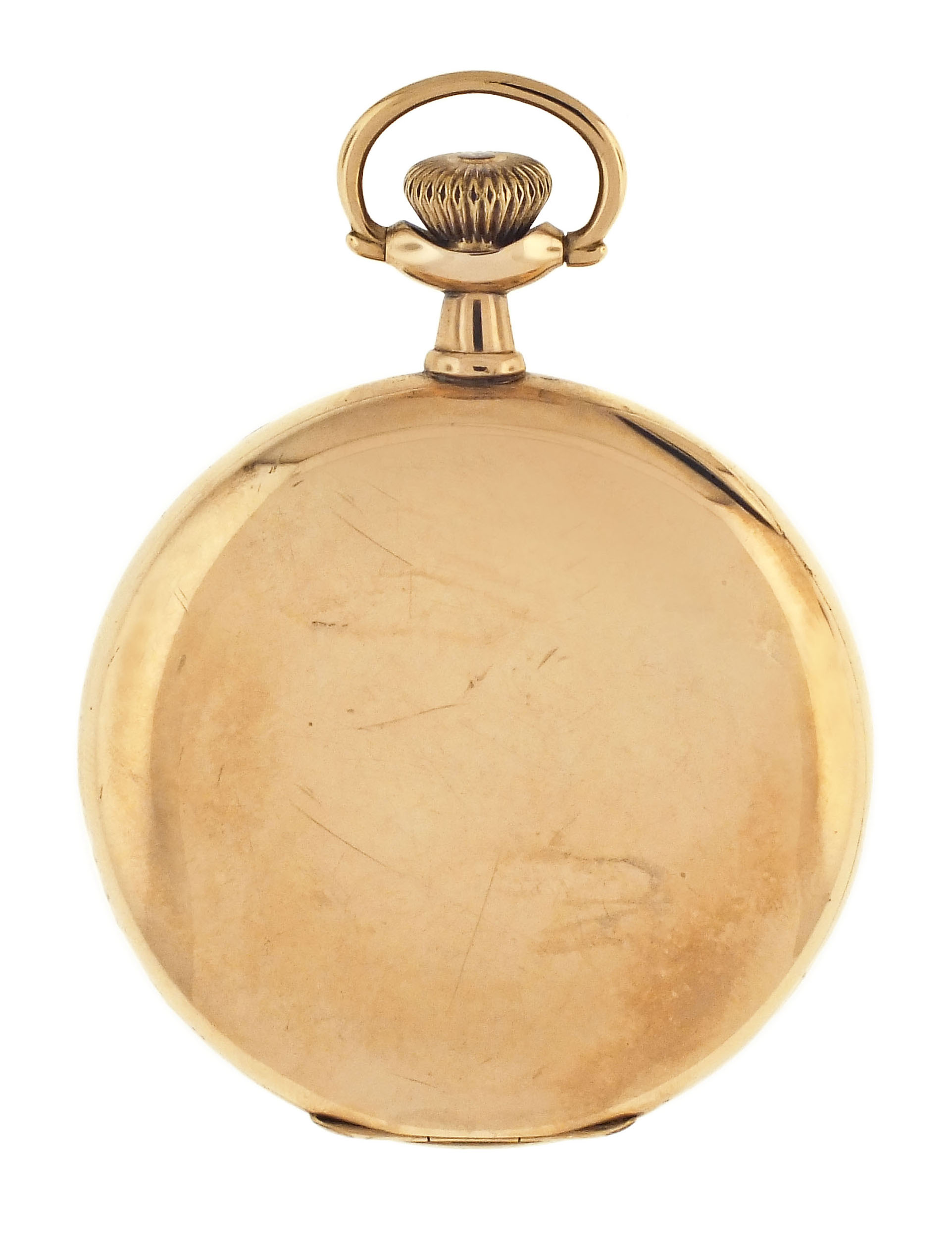 CASE: Dents; Dings; Fine scratches on outer surface of case; Fine scratches on inner surface of case; Case knife scratches on cuvette; Bow with minor wear; Stem bent; Crown shell worn through; Precious metal content marked. DIAL: Very good. HANDS: Very good. MOVEMENT PLATES: Very fine scratches on plate; More significant scratches and marks on balance cock, at bridge screws and near center arbor; Ratchet wheel with very fine scratches; Click with patch of oxide; Regulator assembly with specks of oxide. MOVEMENT FUNCTION: Running order (winds, sets and ticks); Low amplitude, needs service.