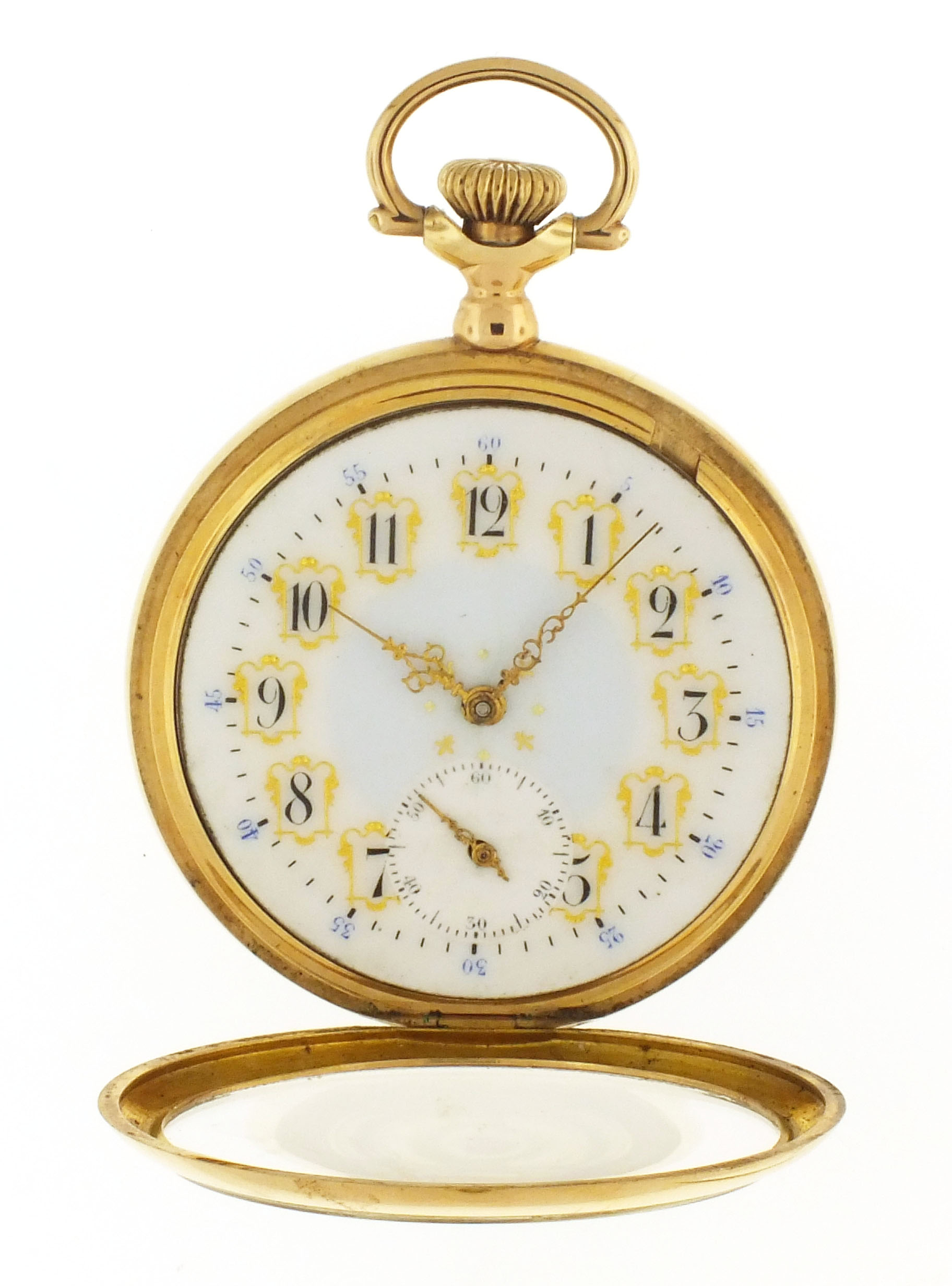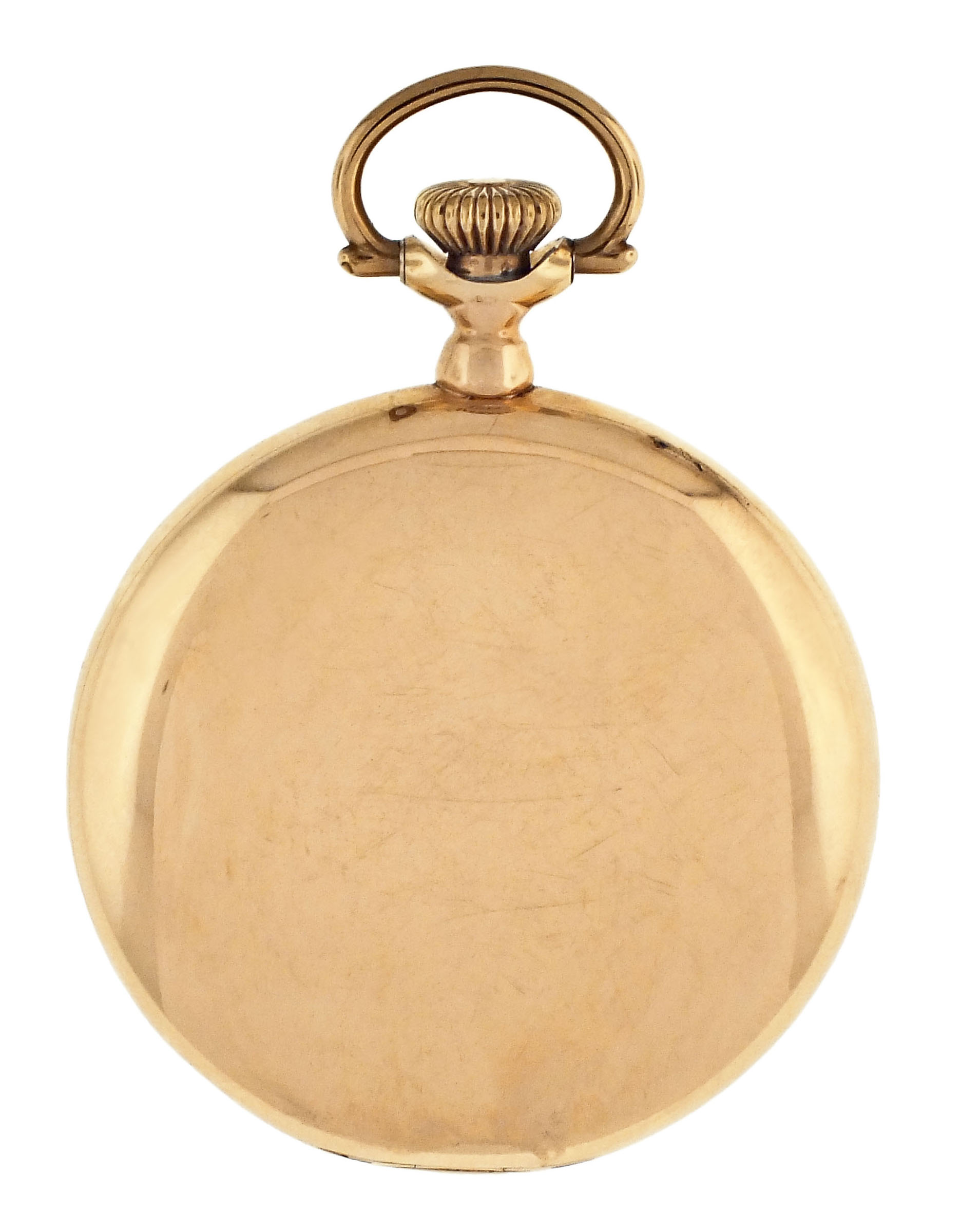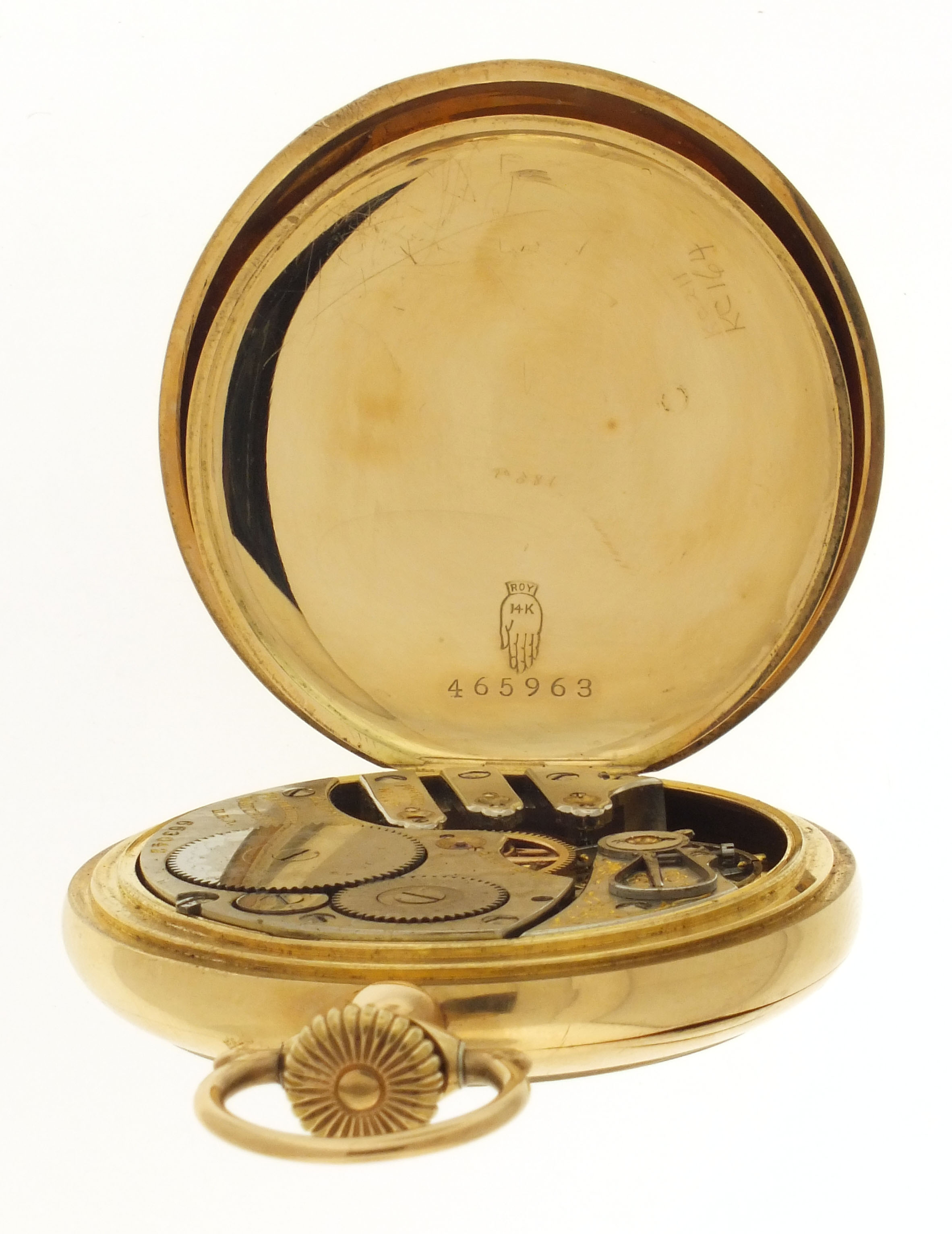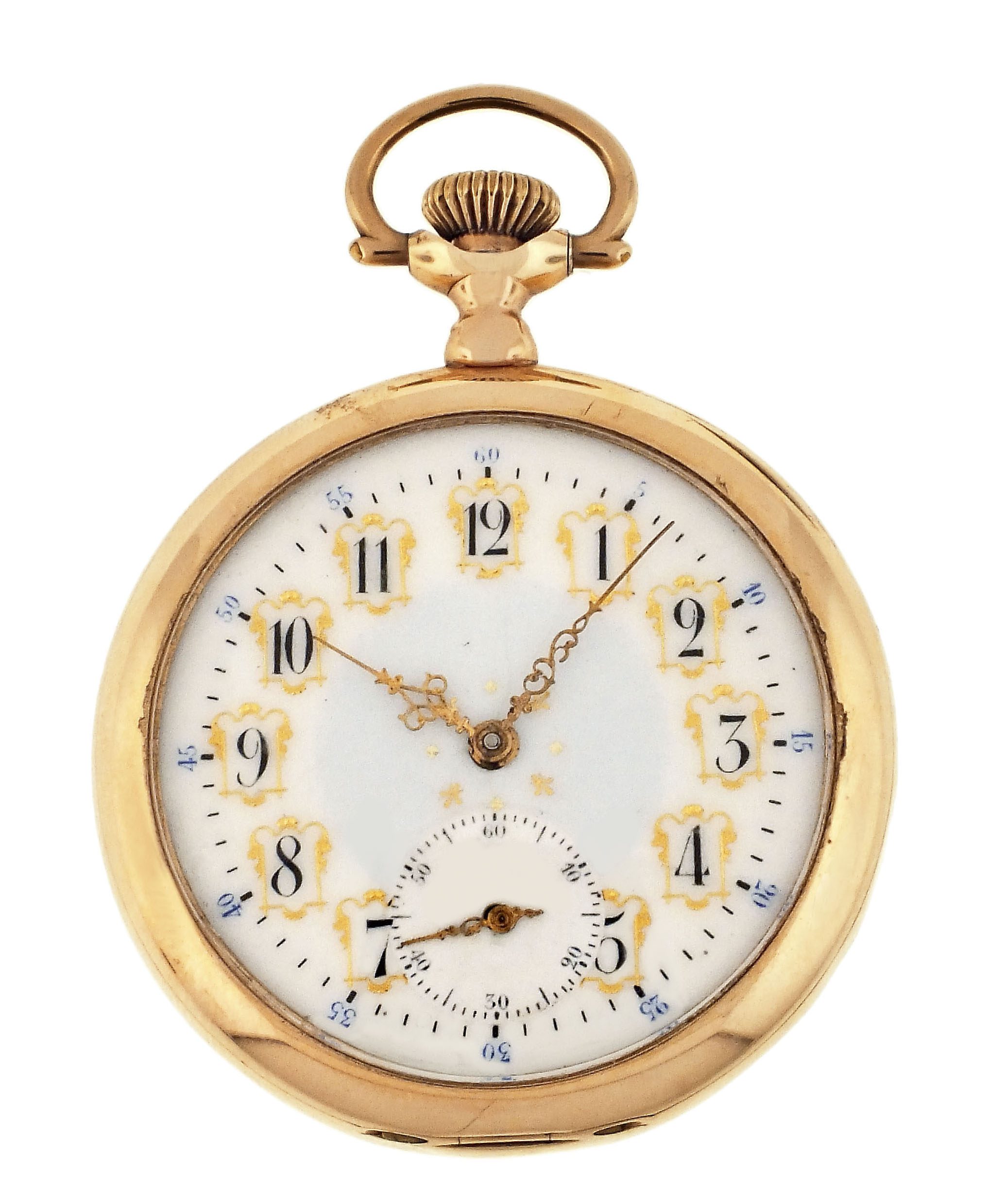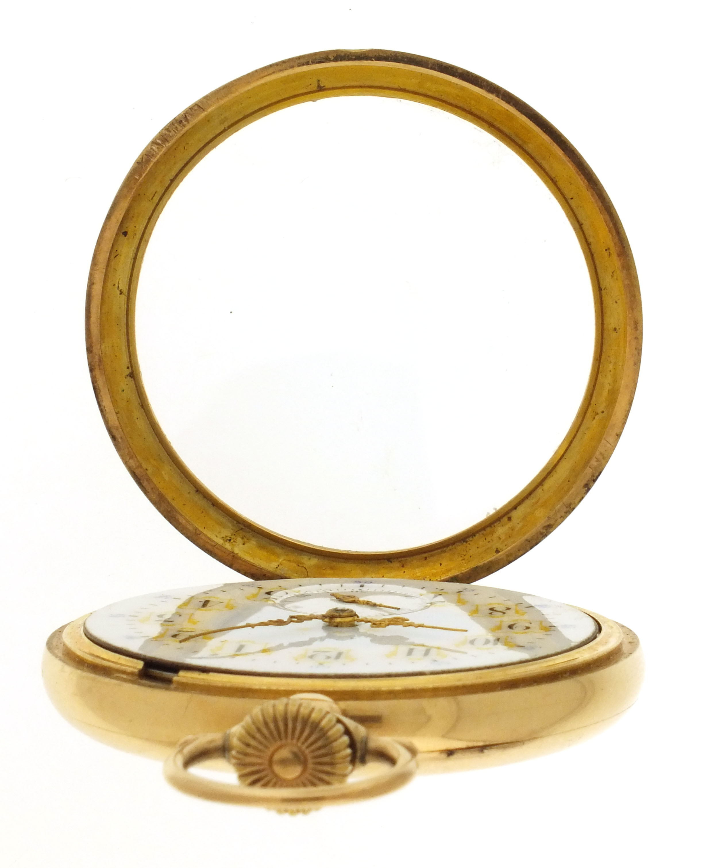 Rockford Watch Co., Rockford, Illinois, an early 20th century Plymouth Watch Co. "Prince of Wales" pocket watch, 16 size, 21 jewels, stem wind and set, adjusted, damascened nickel plate movement with lever escapement, cut bimetallic balance, and whiplash micrometric regulator in a 14 karat, yellow gold, hinged back and bezel, plain polished open face case, arabic numeral, single sunk O'Hara style multicolor enamel dial with gilt Louis XIV style hands, serial #663042, 93.1g TW