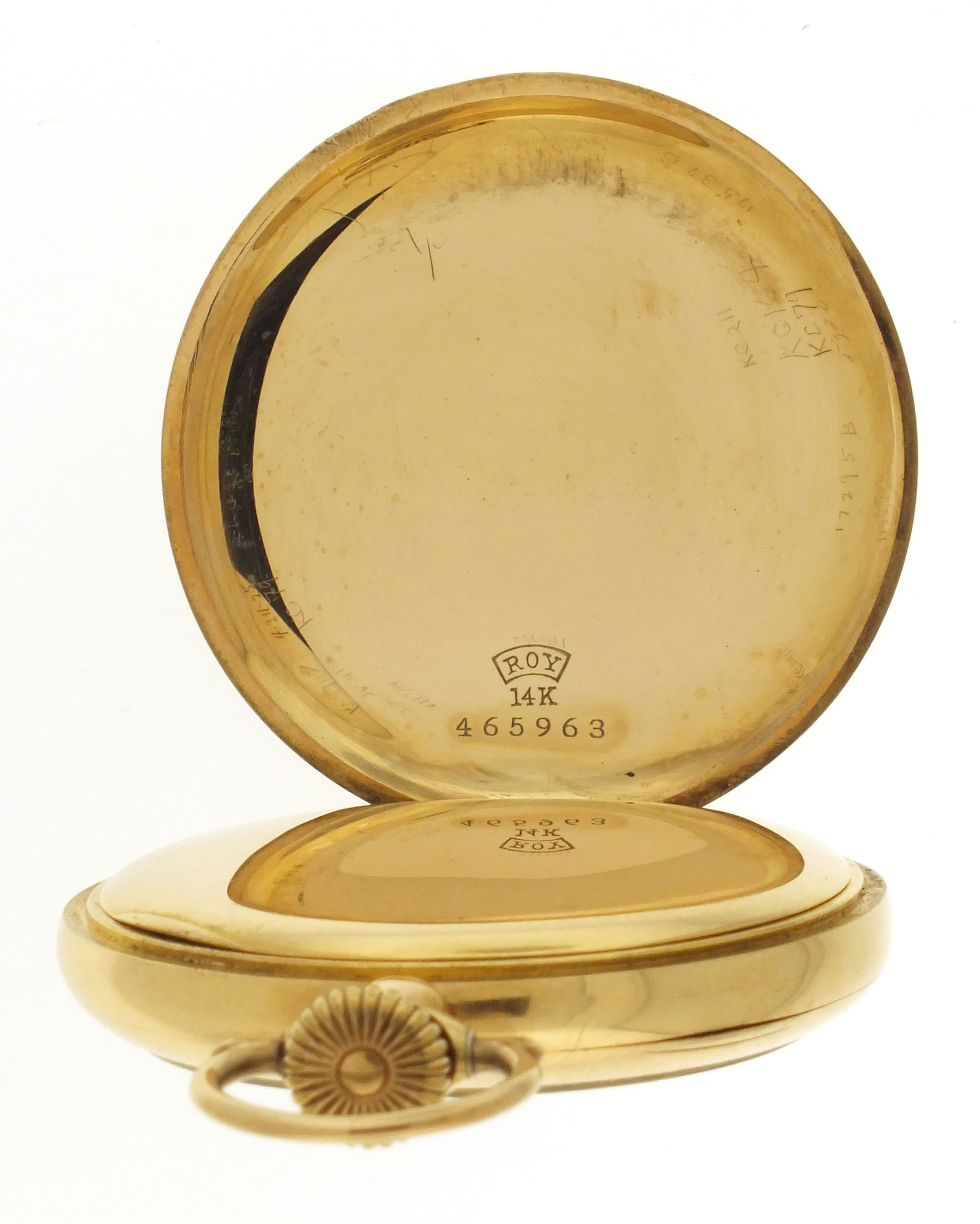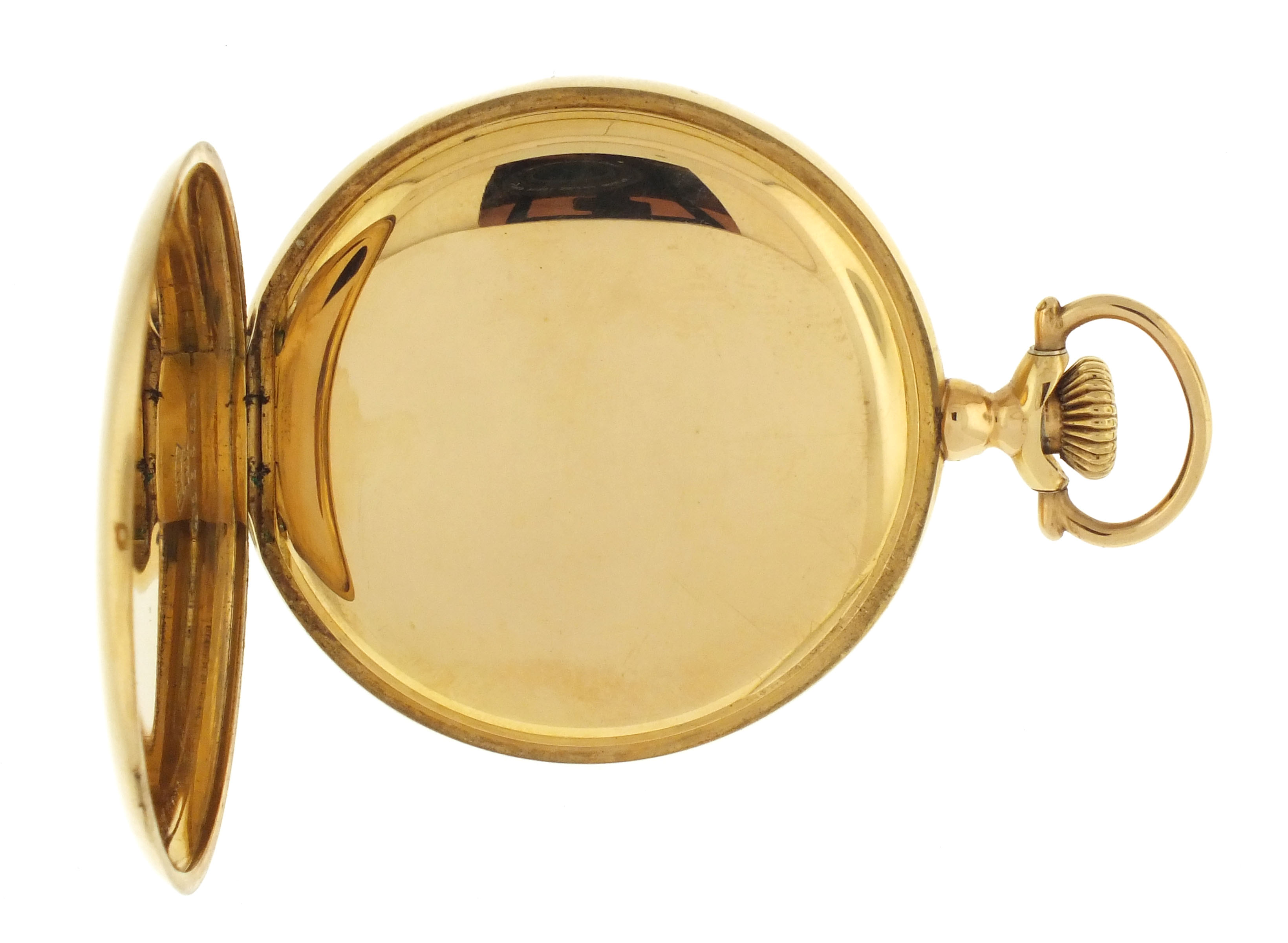 CASE: A few dents, band; Fine scratches on outer surface of case; Rear cover lacking lip; Hinge pins replaced, lacking plugs; Very fine scratches on cuvette; Bow with wear at joint; Crown replaced. DIAL: A few faint hairlines. HANDS: Minor bends, minute. MOVEMENT PLATES: Fine scratches on plate; Ratchet wheel with fine scratches; Crown wheel with broken tooth; Winding wheels with oxide; Regulator assembly with oxide. MOVEMENT FUNCTION: Running order (winds, sets and ticks).