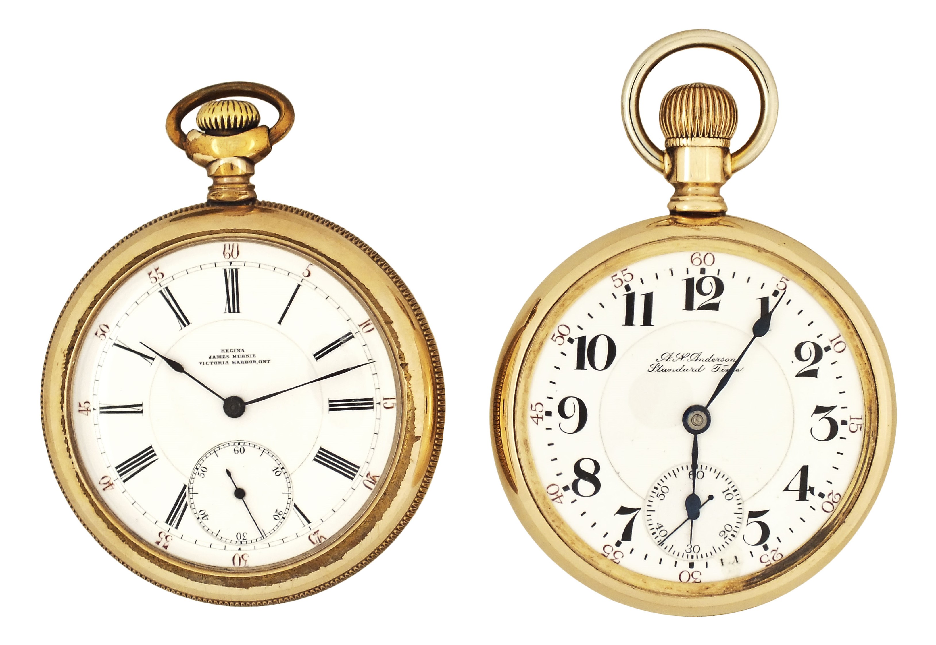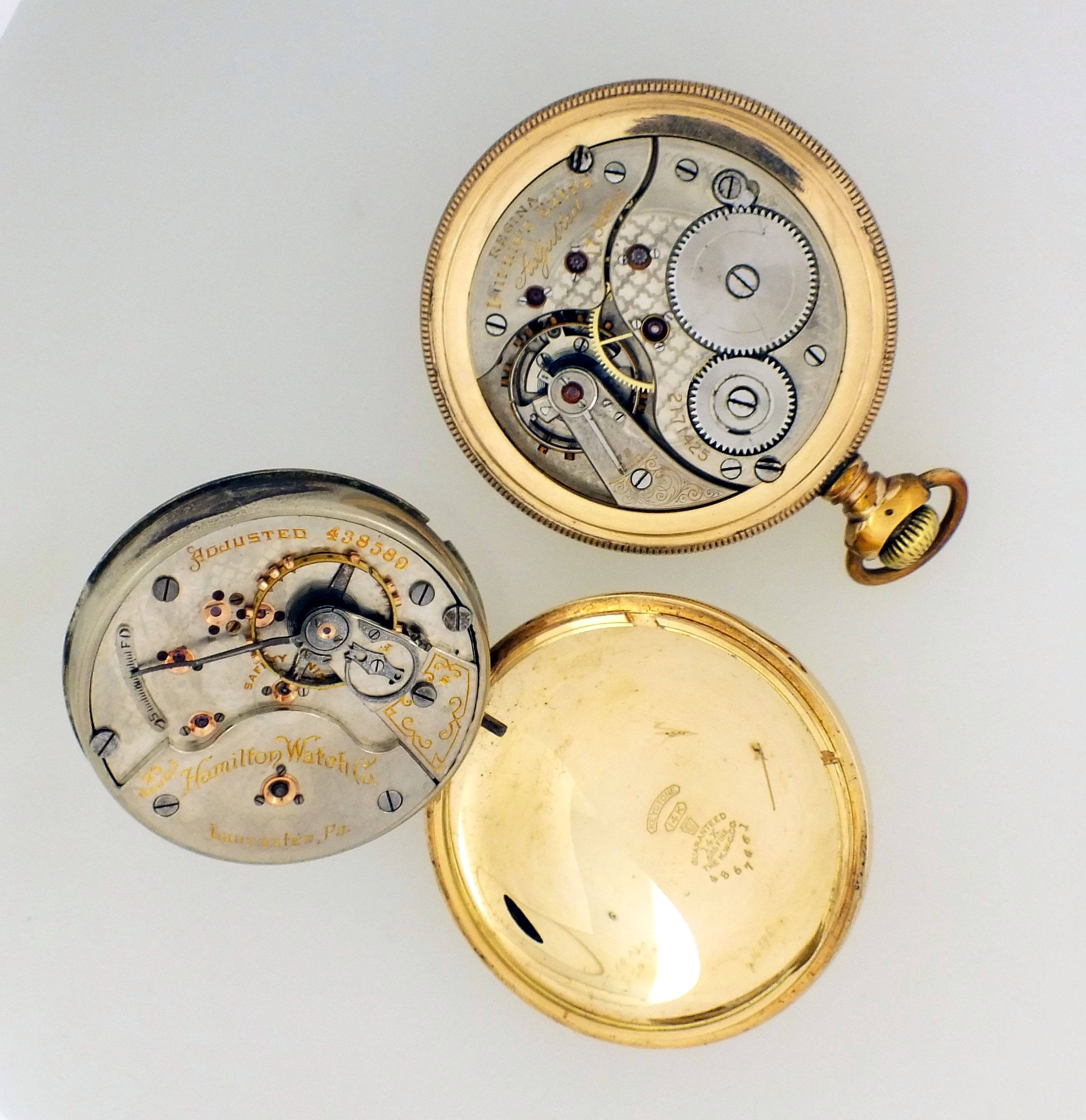 Regina has some tarnish on the case, both are ticking, although the Hamilton will run for a short period; sold as is