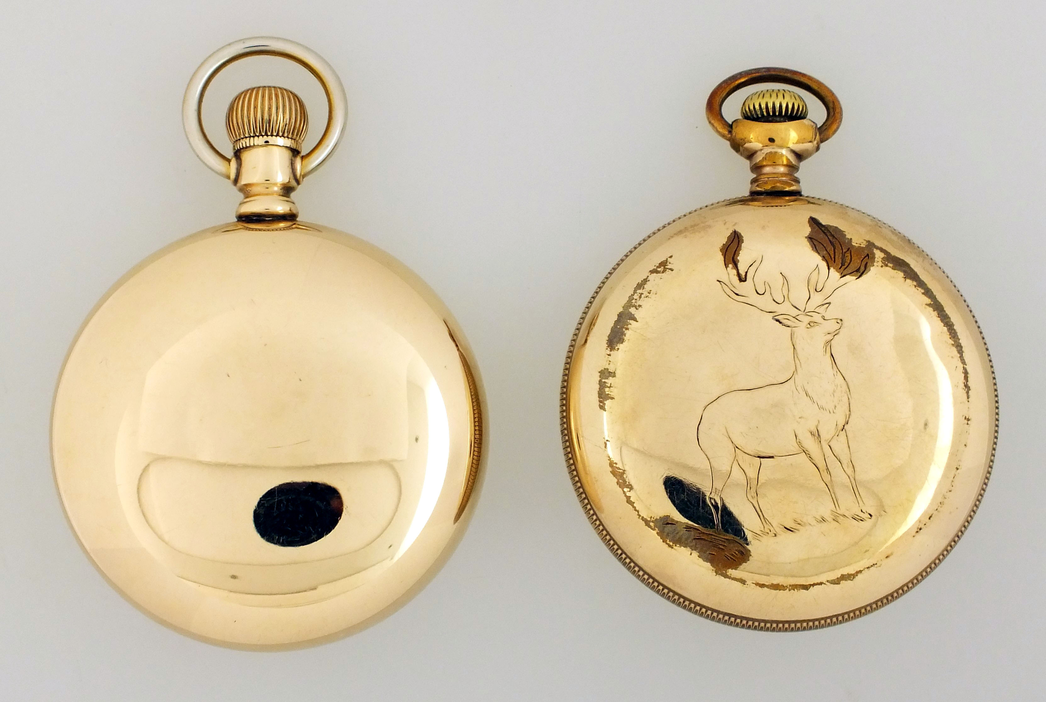 2 (Two) pocket watches, 18 size, arabic and roman numeral enamel dials, damascened nickel movements in gold filled open face cases, including an Omega, "Regina" brand watch manufactured in Canada, 17 jewel, stag design on case, serial #2171425, and Hamilton, model 1, grade 946, 23 jewel, serial #438589