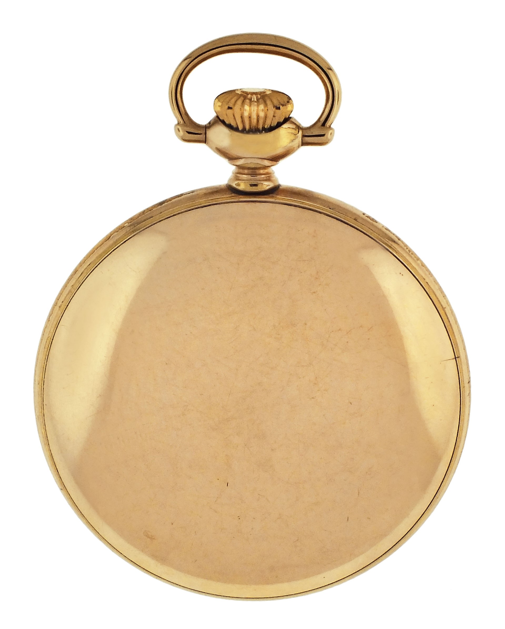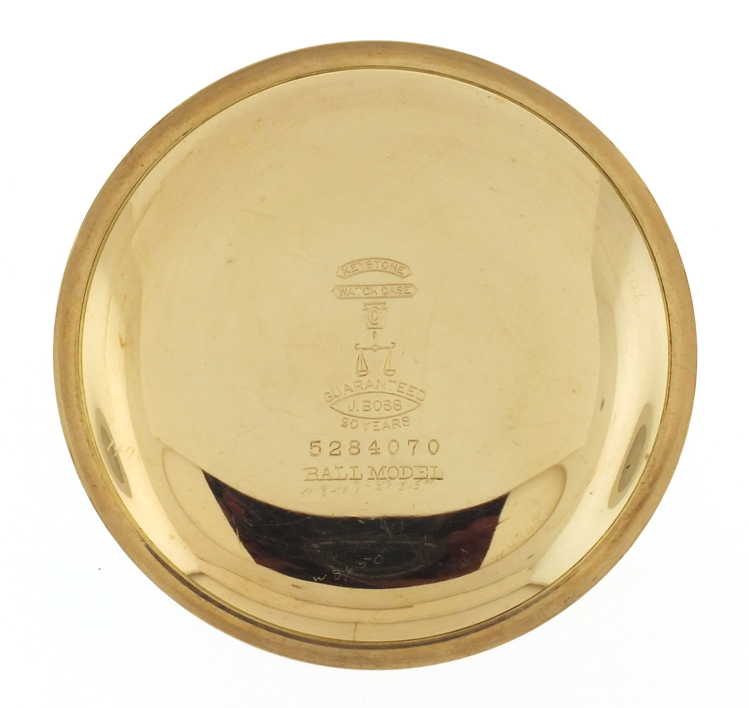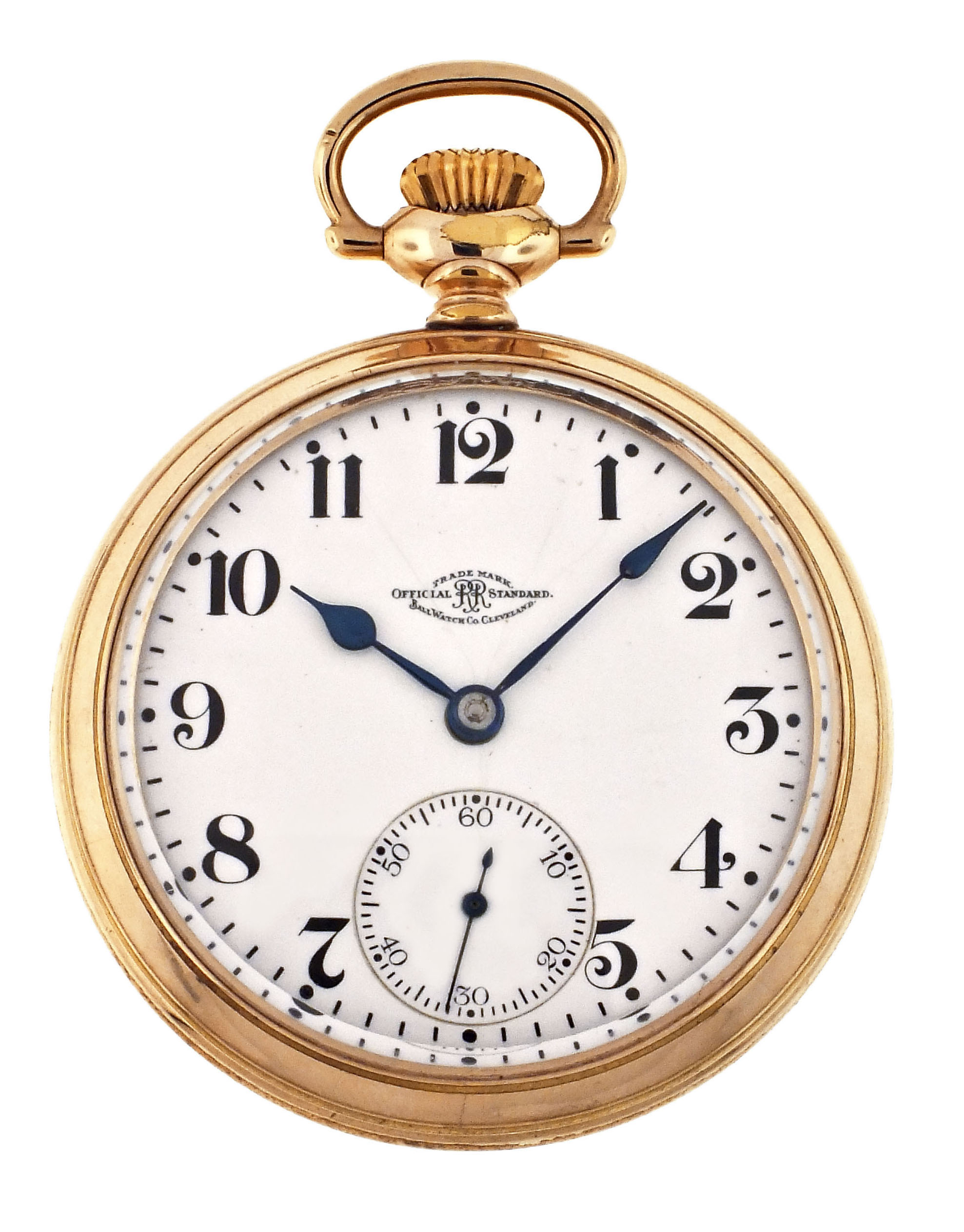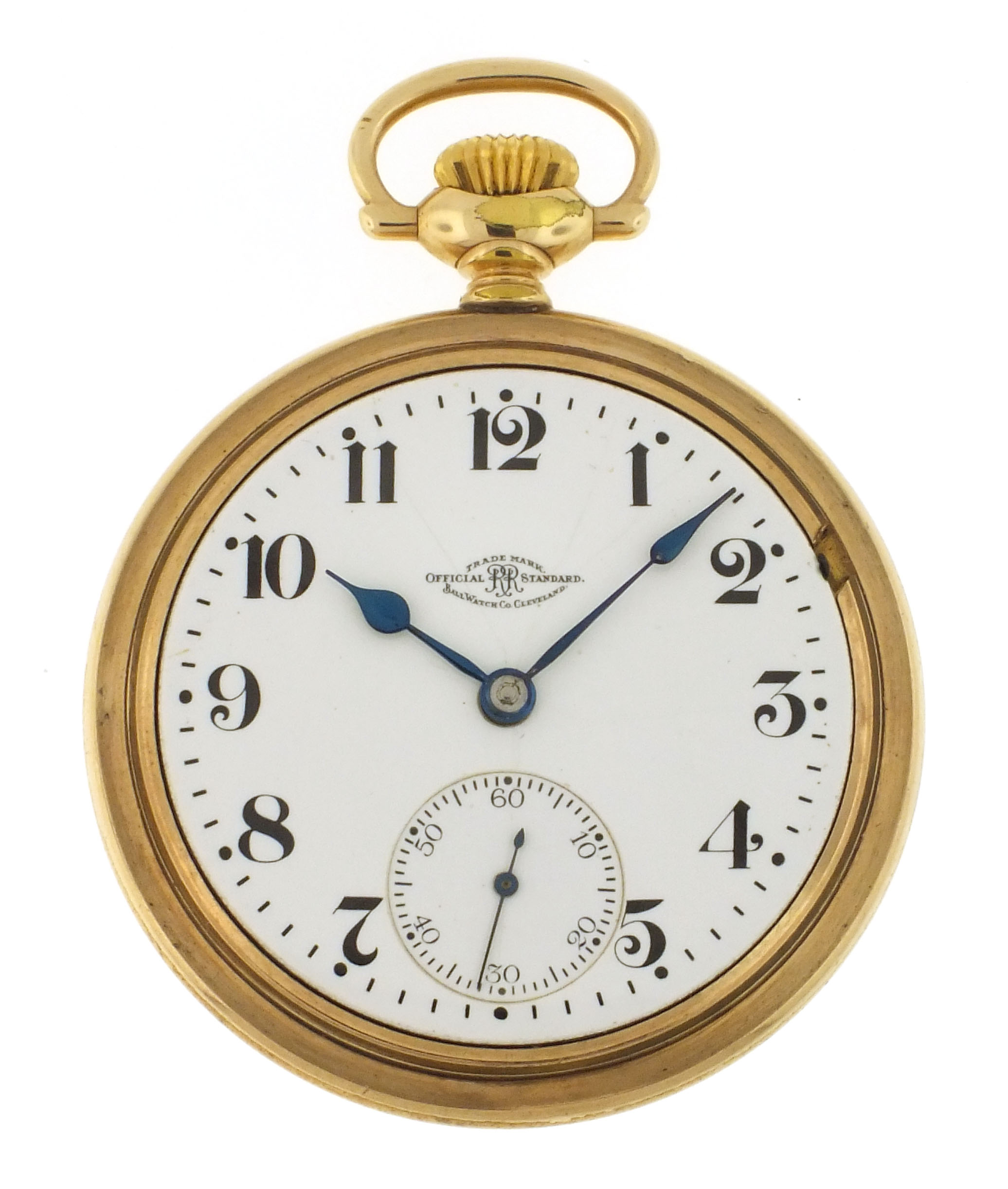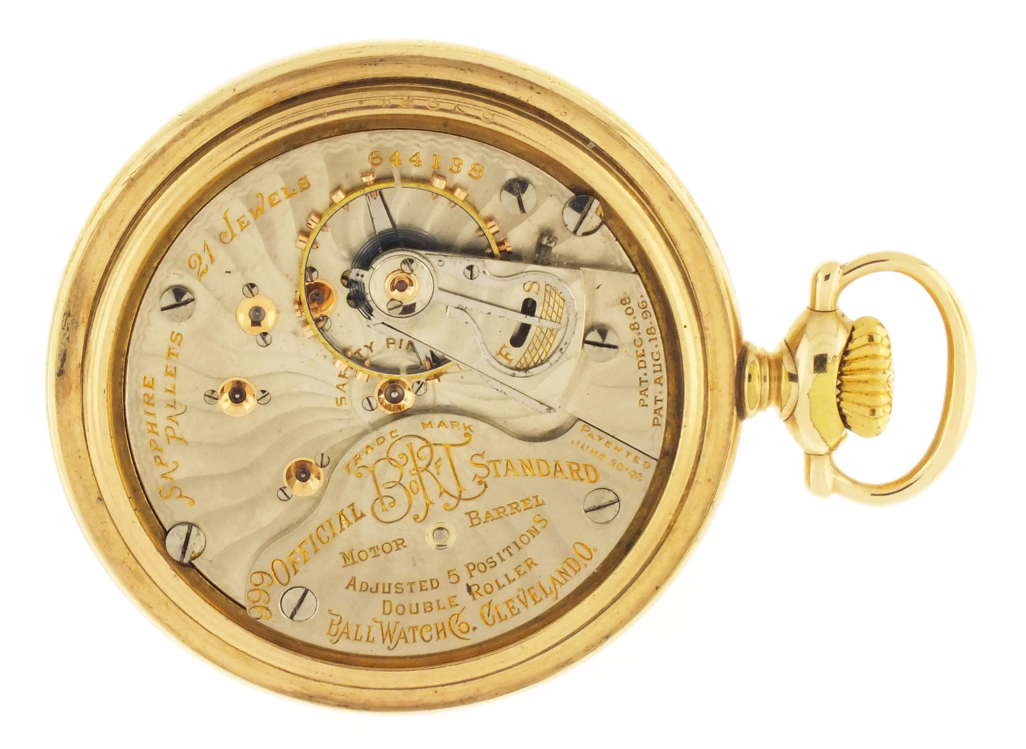Ball Watch Co., Cleveland, Ohio, a Hamilton 999A "Brotherhood of Railroad Trainmen" pocket watch, 18 size, 21 jewels, stem wind and lever set, adjusted to 5 positions and temperature, sunburst damascened nickel plate movement with lever escapement, cut bimetallic balance with gold screws, gold jewel settings, and micrometric regulator in a gold filled, screw back and bezel Ball Model open face case, arabic numeral, single sunk white enamel dial with blued steel spade hands, serial #644138
