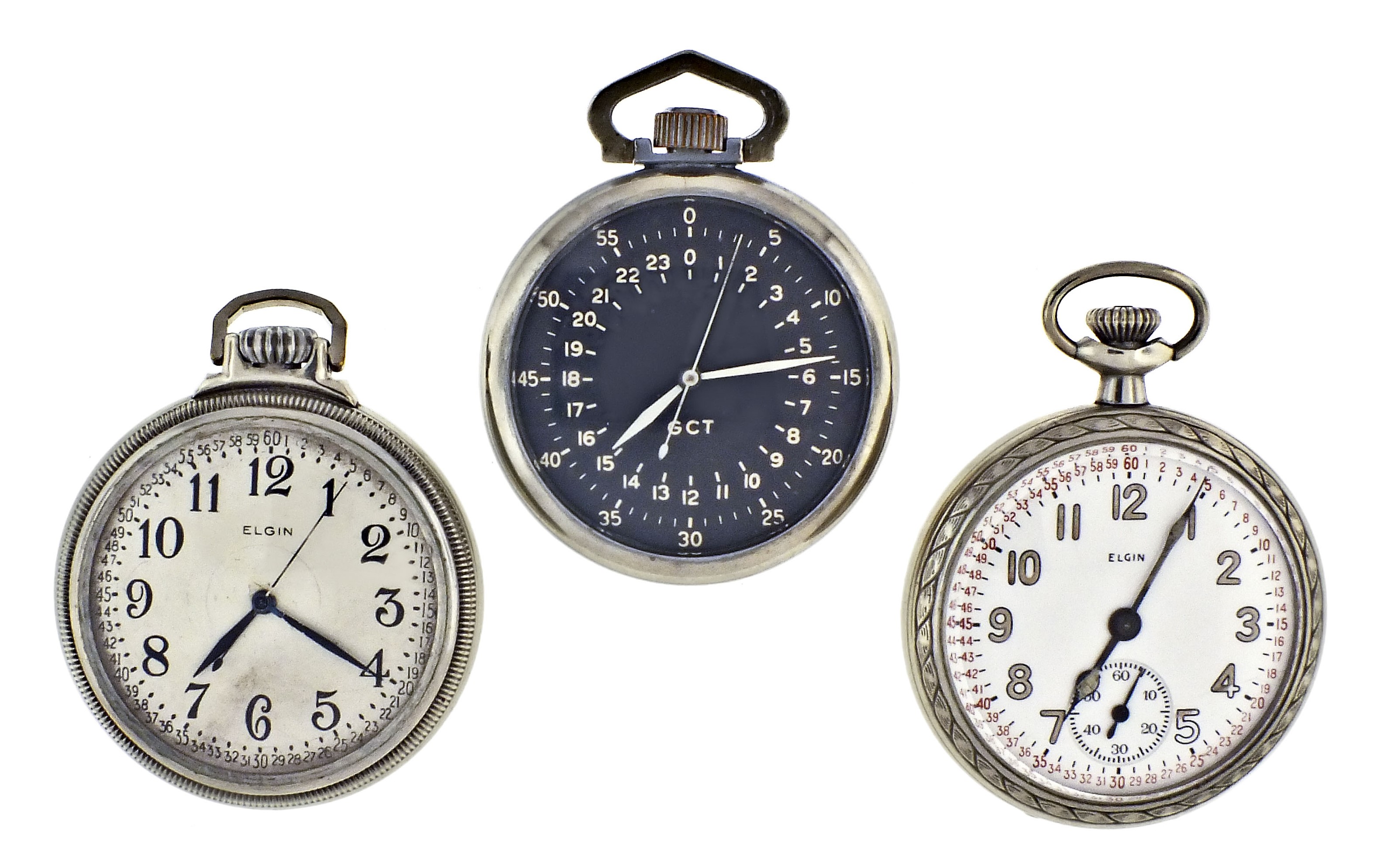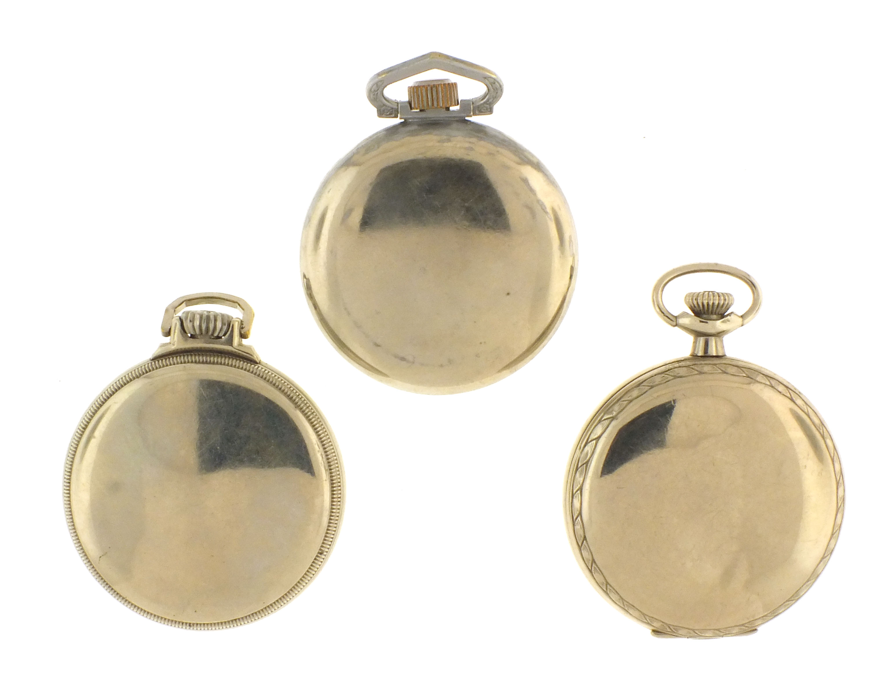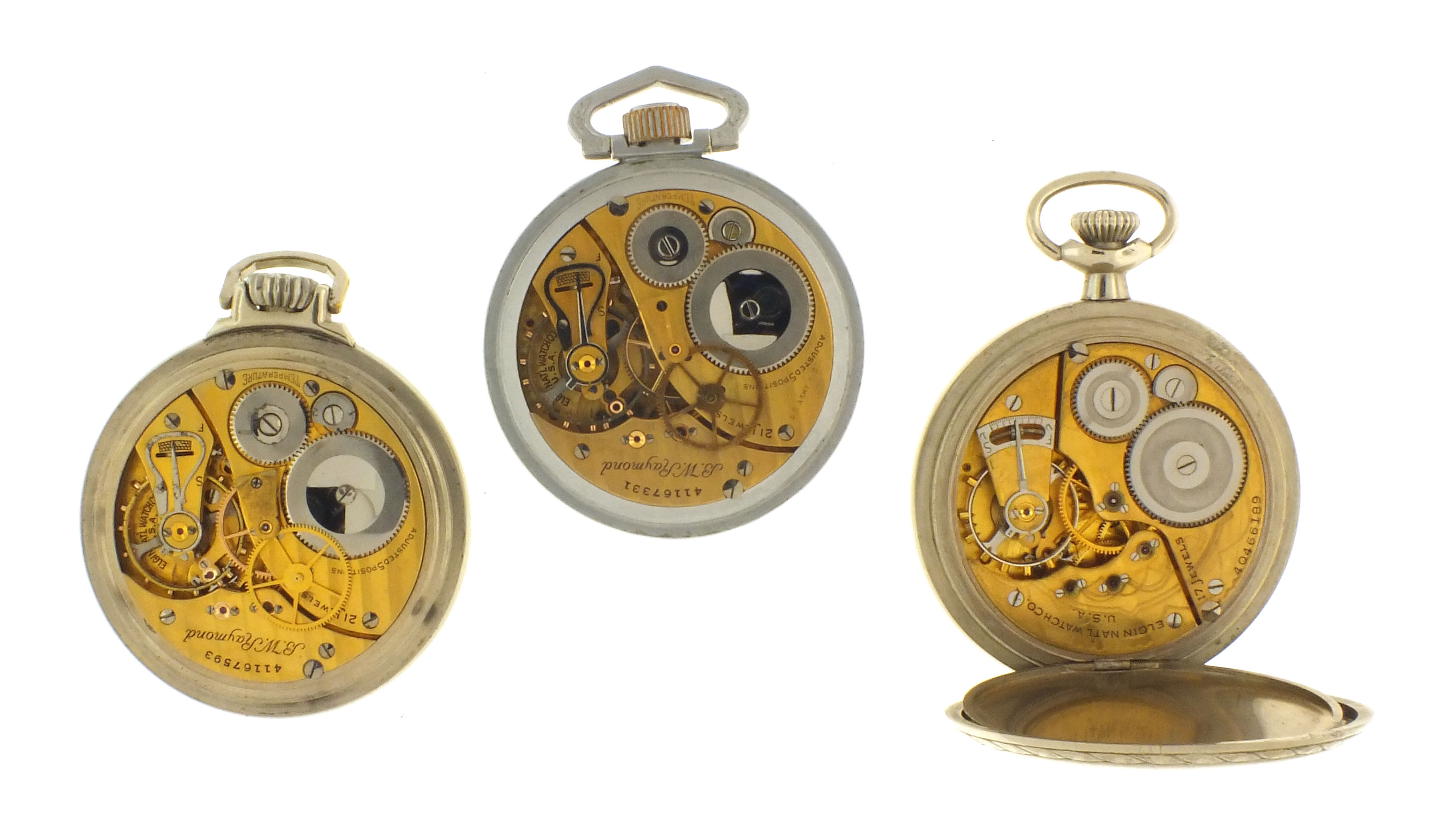 3 (Three) Elgin pocket watches, 16 size, including a B.W. Raymond grade 581, 21 jewel movement in nickel case, serial #41167331, a B.W. Raymond grade 581, 21 jewel movement in a nickel case, serial #41167593 and a grade 387,17 jewel movement in a nickel case, serial #40466189