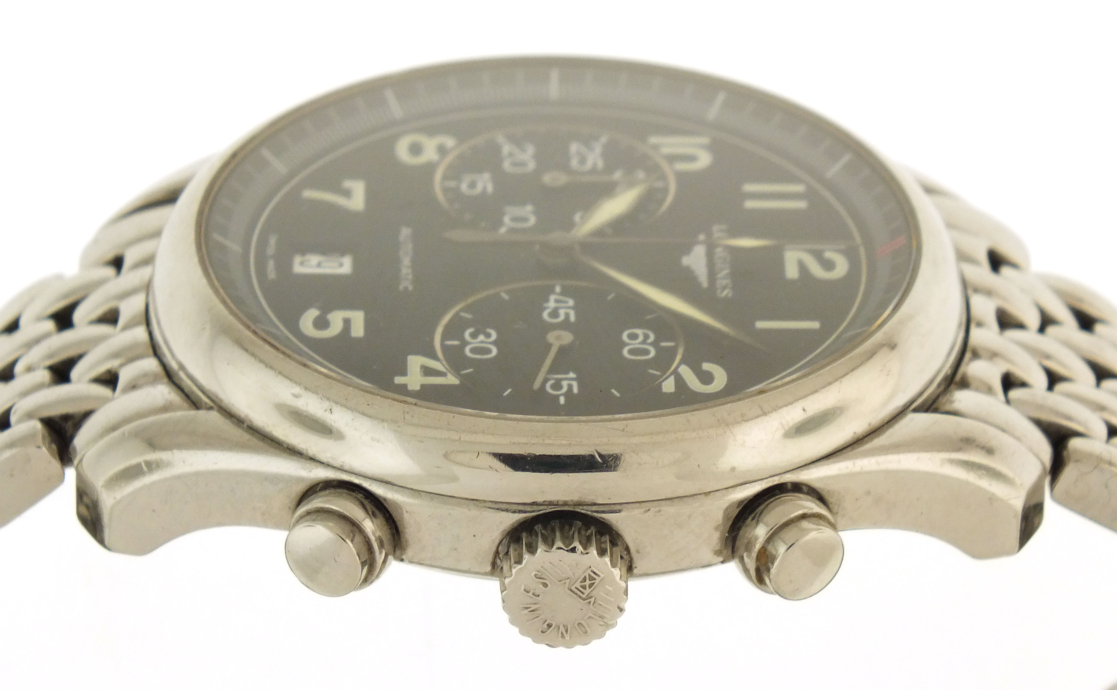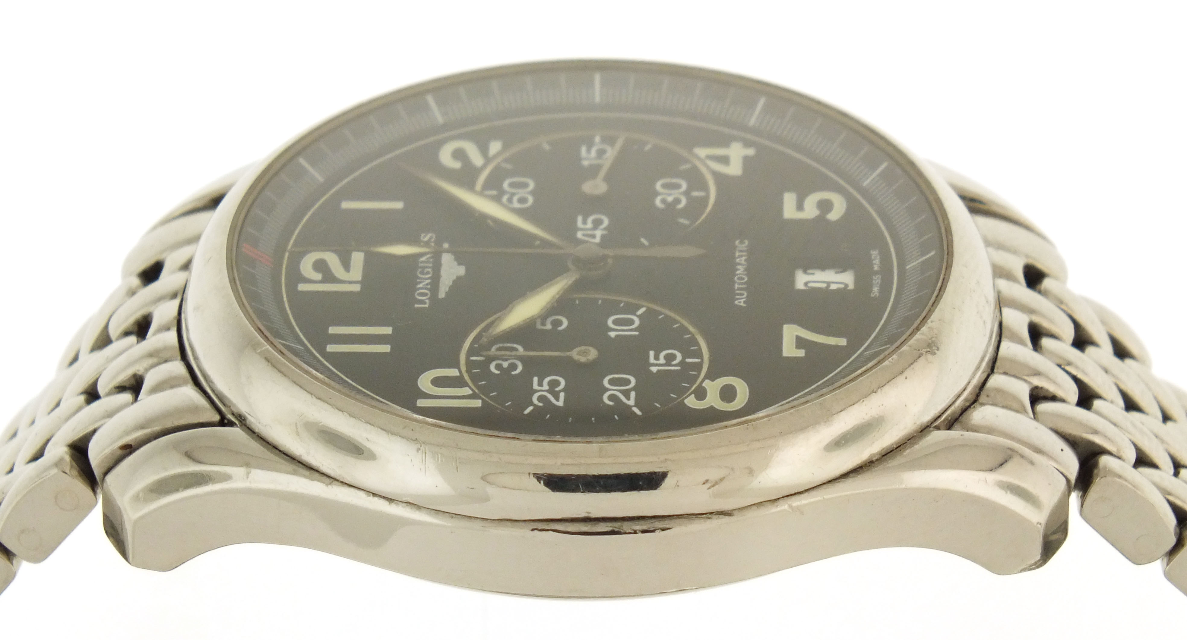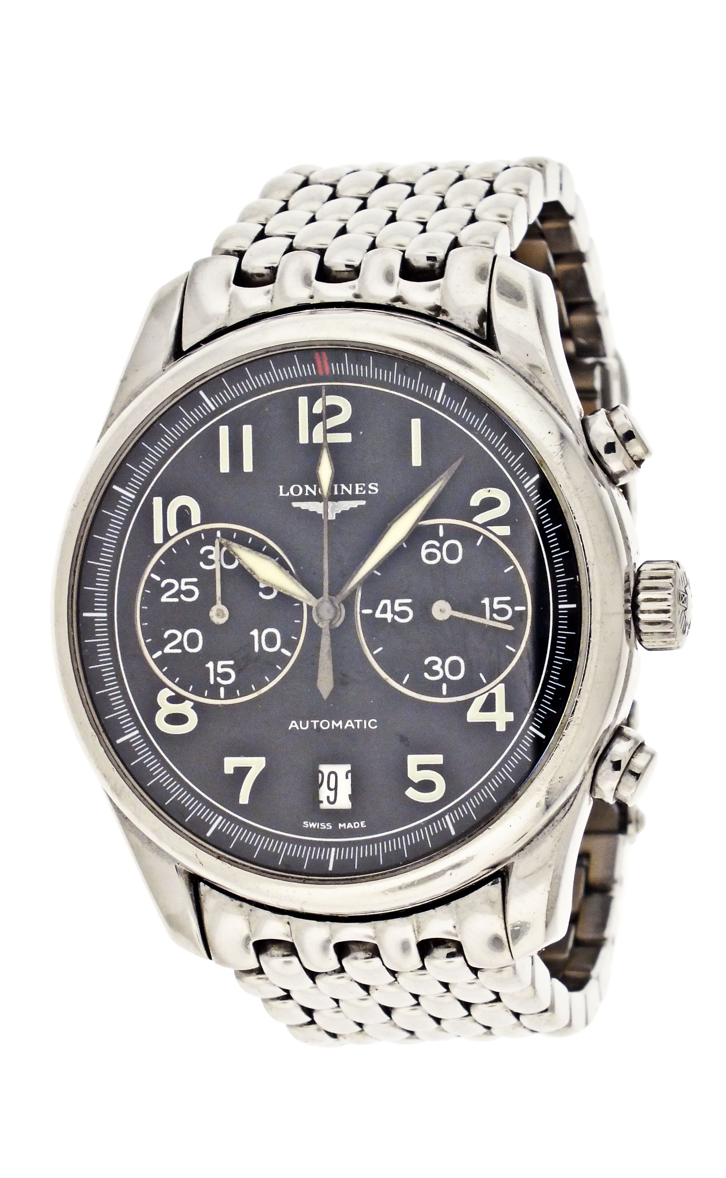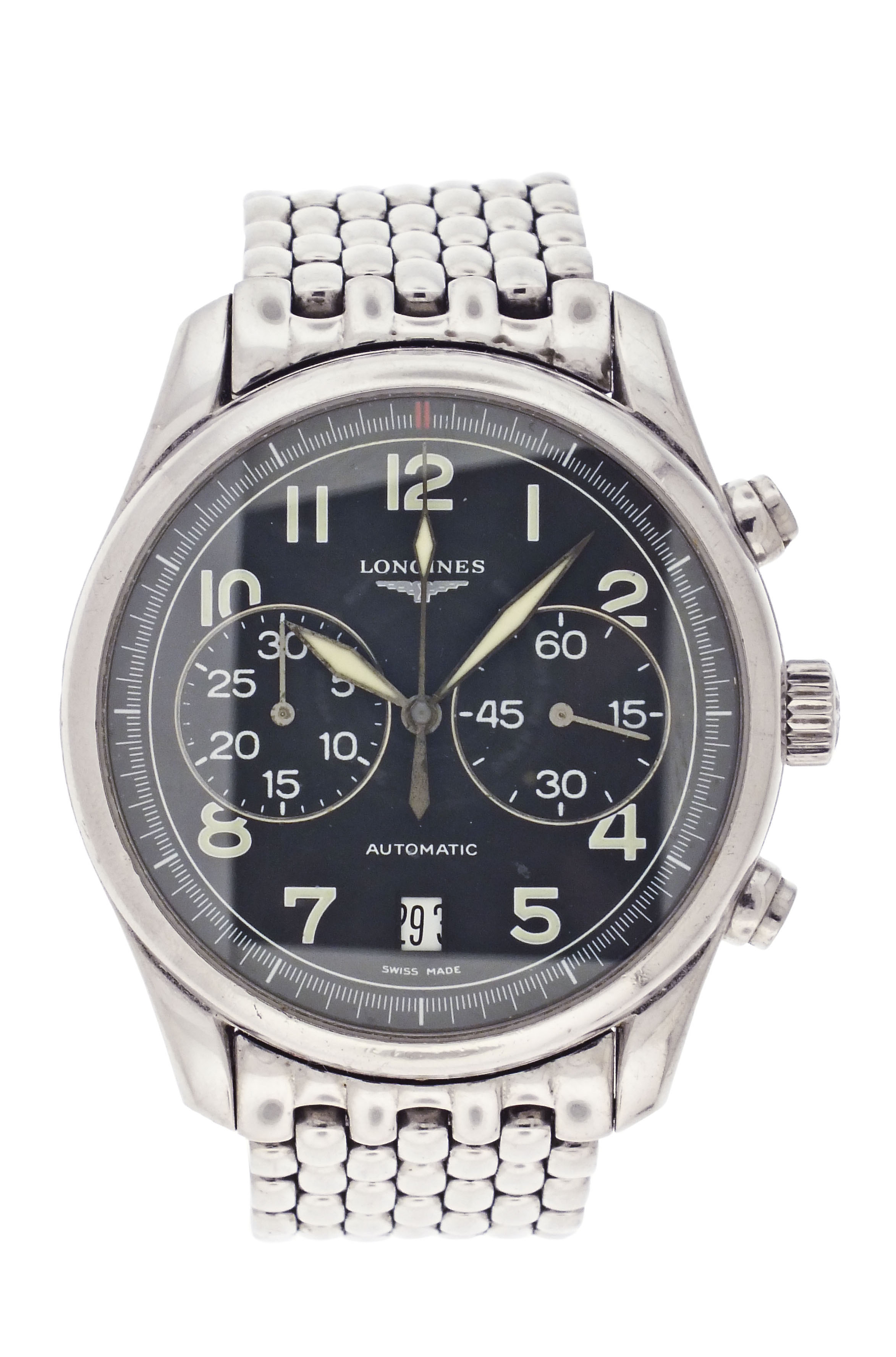 Longines, Switzerland, an early 21st century ref. L2.629.4 wrist chronograph, 37 jewels, automatic winding, spotted rhodium plated ETA cal. 2894-2 movement with lever escapement, in a round stainless steel case with glazed back and beads of rice bracelet, arabic numeral double sunk black dial with date aperture at 6:00 and luminous lozenge hands, serial #30716020, 40mm