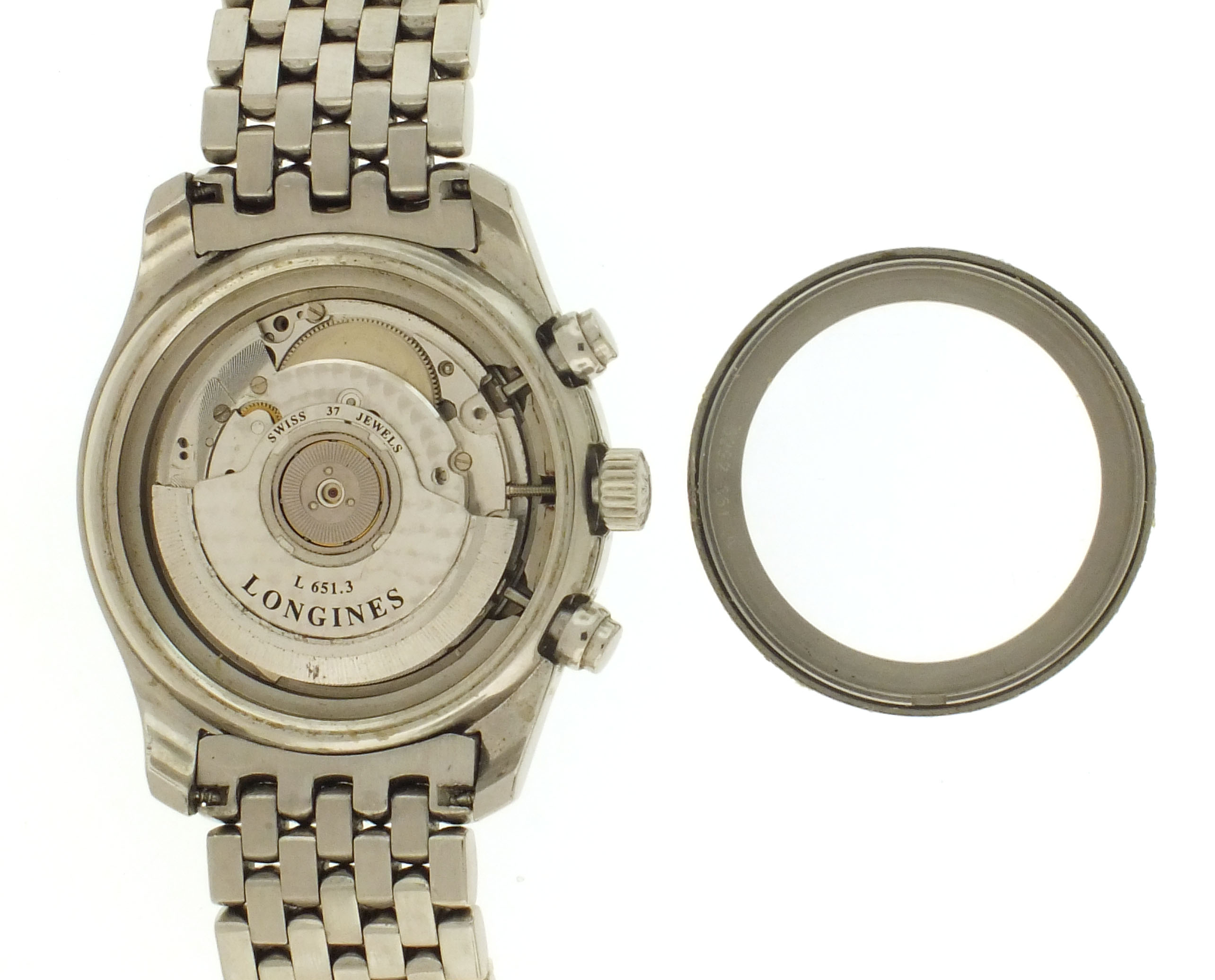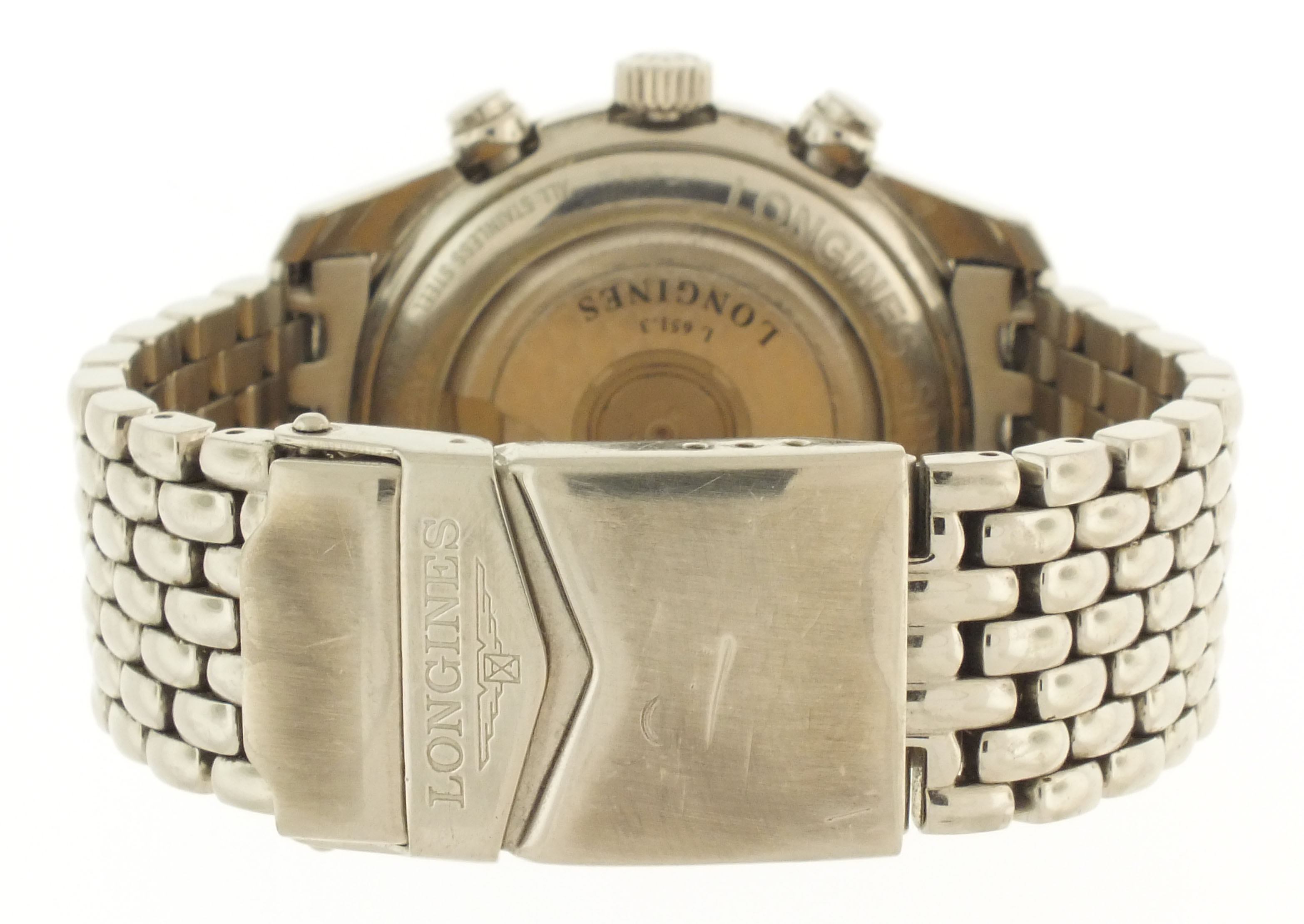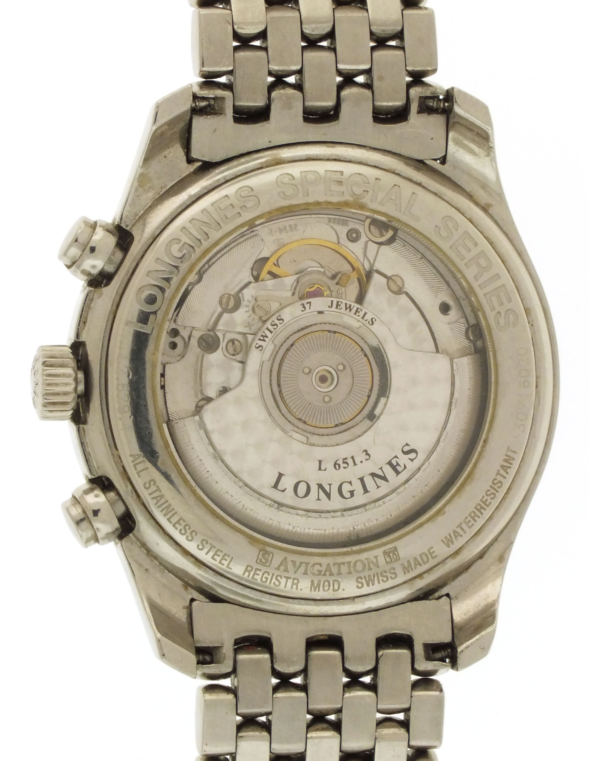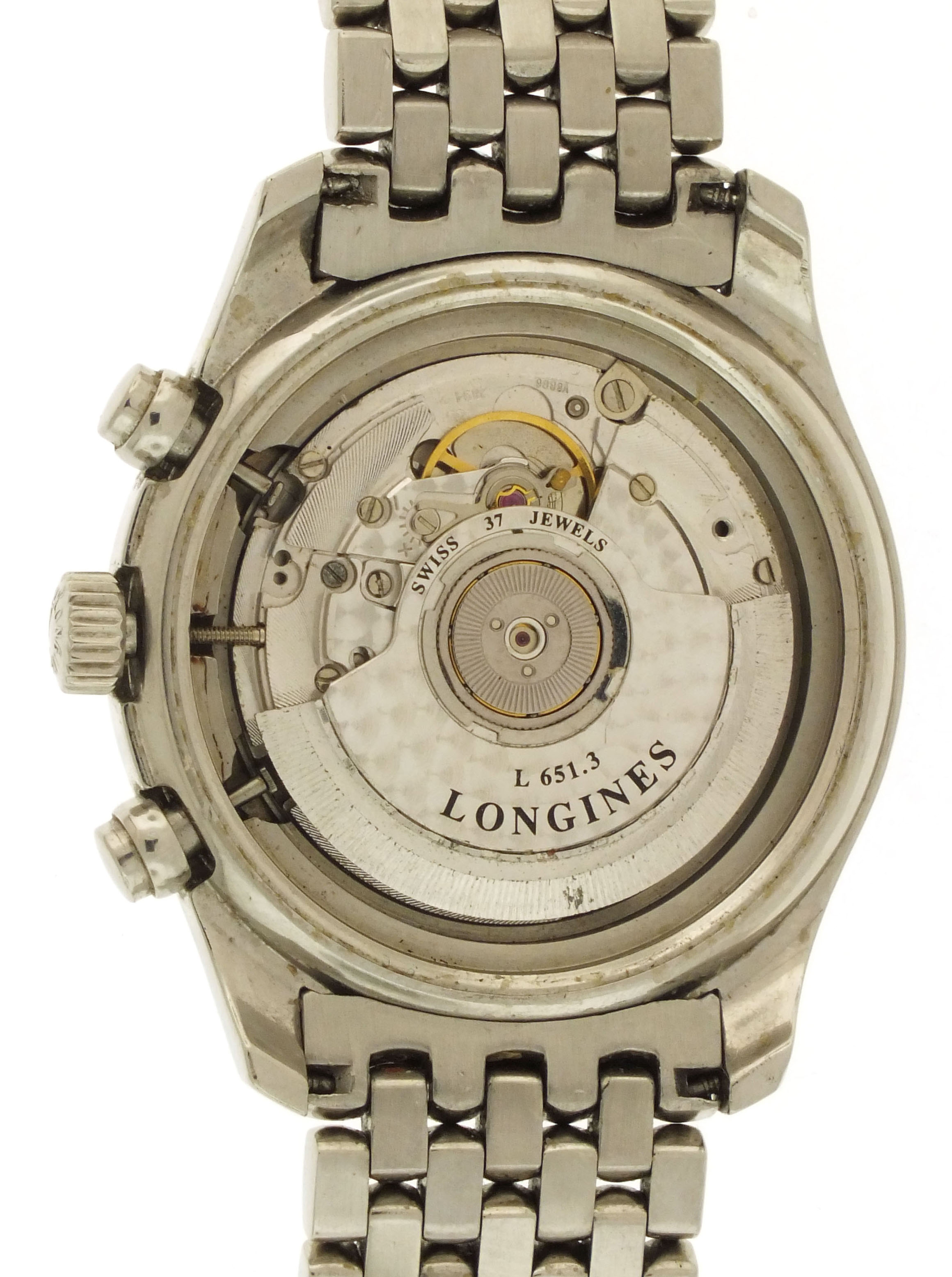 Longines, Switzerland, an early 21st century ref. L2.629.4 wrist chronograph, 37 jewels, automatic winding, spotted rhodium plated ETA cal. 2894-2 movement with lever escapement, in a round stainless steel case with glazed back and beads of rice bracelet, arabic numeral double sunk black dial with date aperture at 6:00 and luminous lozenge hands, serial #30716020, 40mm