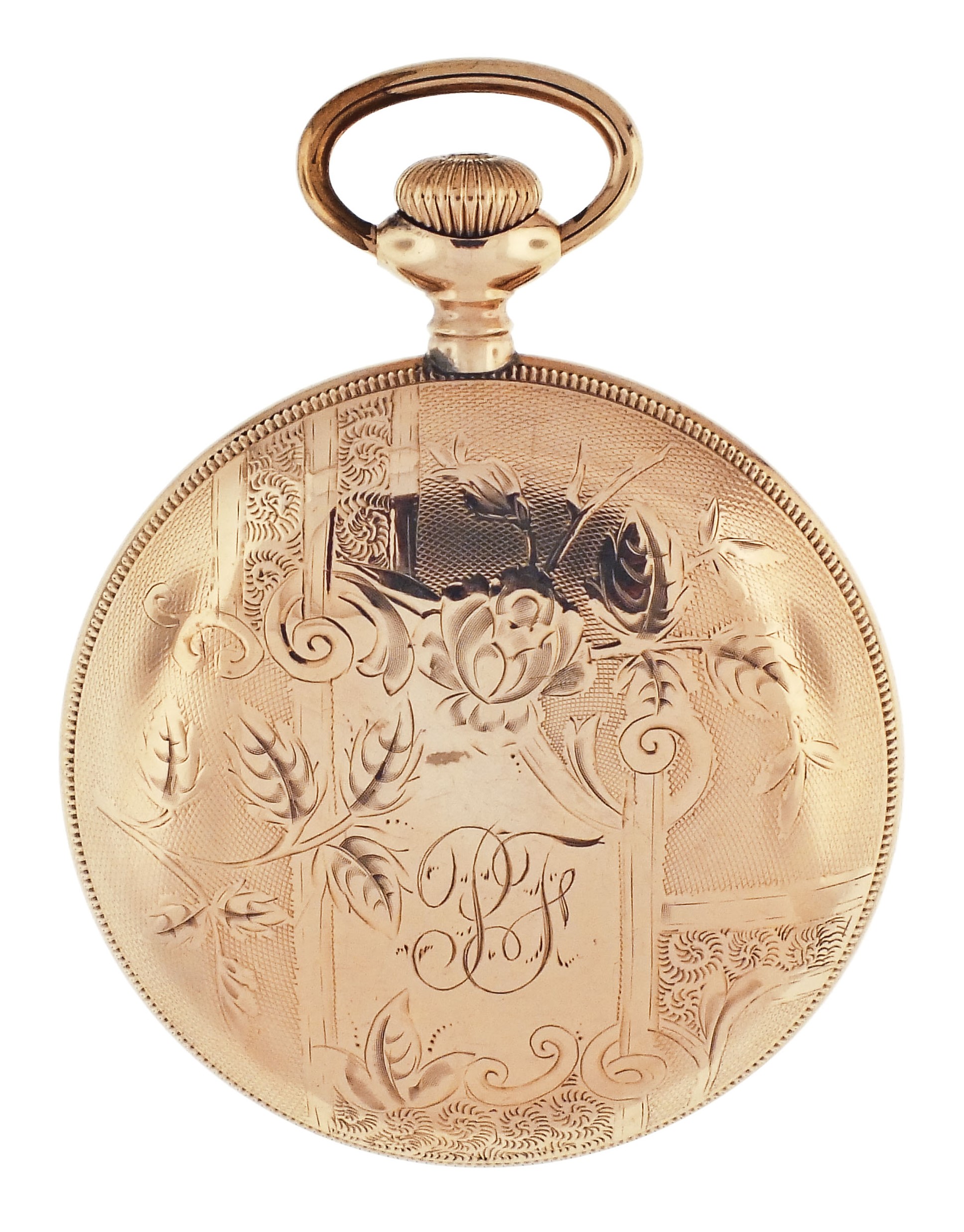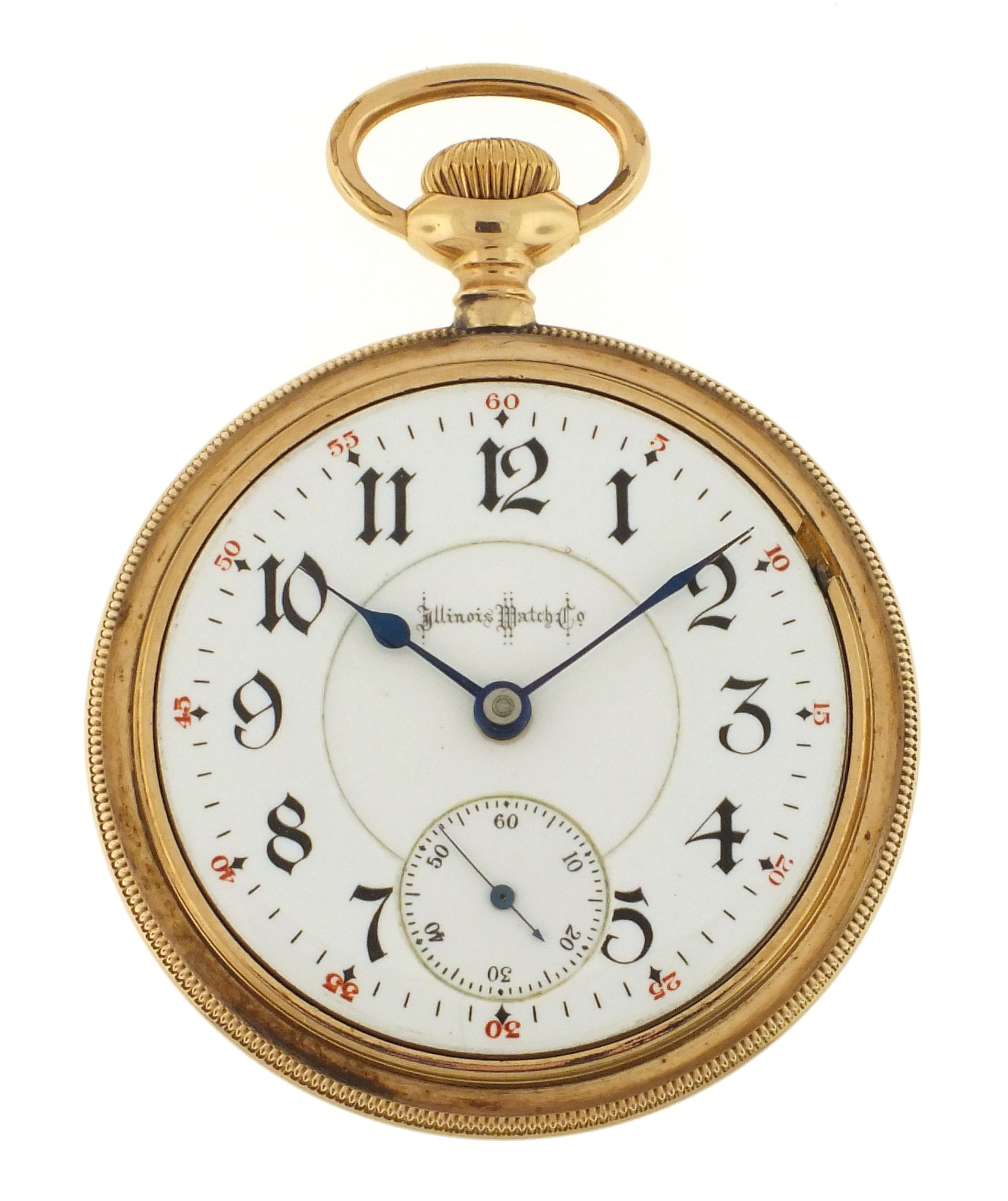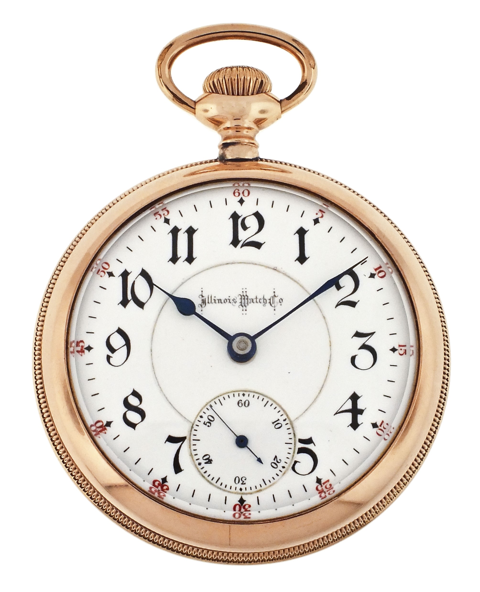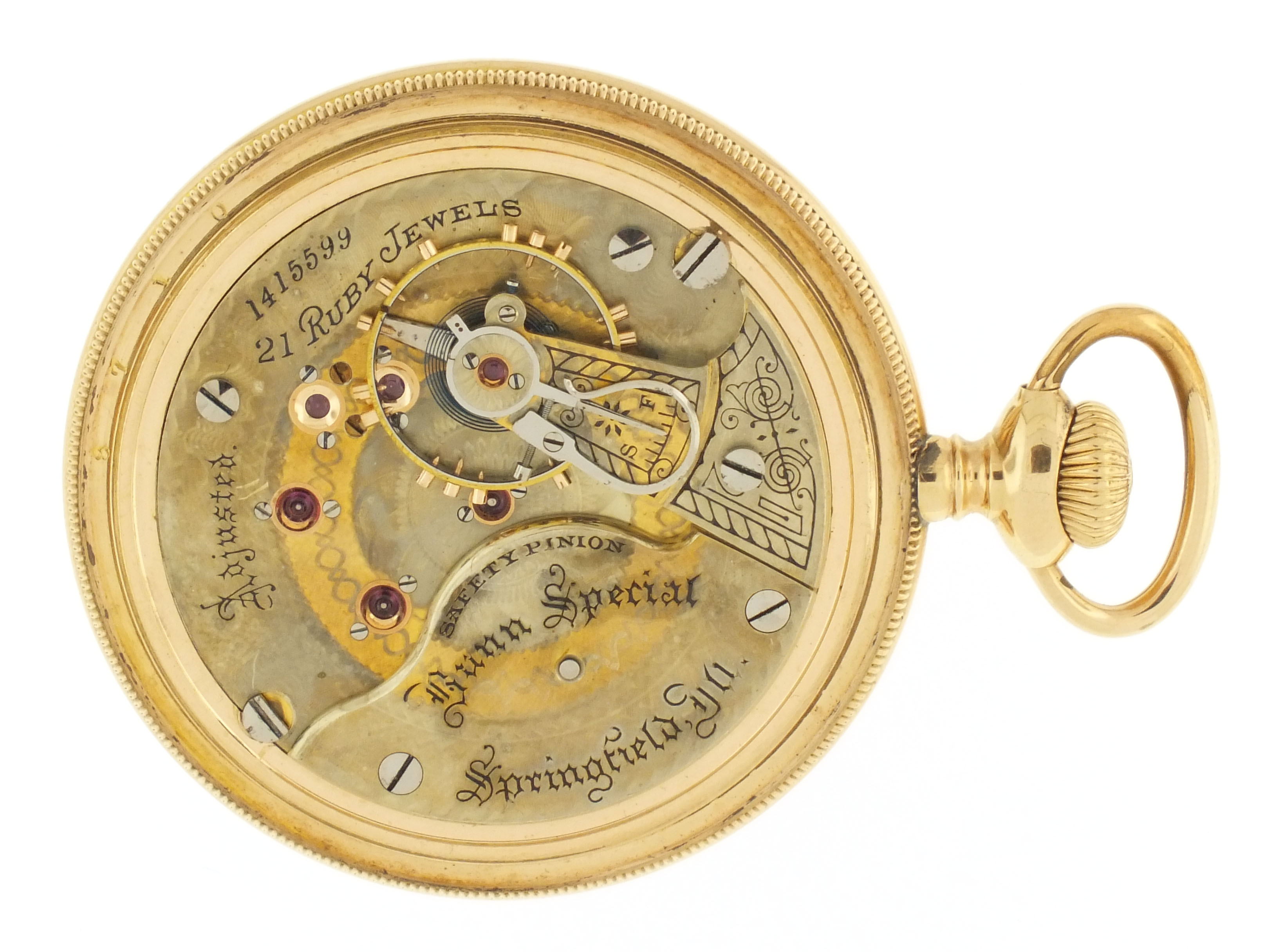 Illinois Watch Co., Springfield, Illinois, "Bunn Special", 18 size, 21 ruby jewels, stem wind, lever set, adjusted to 6 positions, temperature and isochronism, two tone damascened nickel plate movement with lever escapement, cut bimetallic balance with gold screws, gold jewel settings, and whiplash micrometric regulator in a gold filled, screw back and bezel, engine turned and engraved open face case, gothic arabic numeral, outer red 5-minute markers, double sunk white enamel dial with blued steel spade and poker hands, serial #1415599