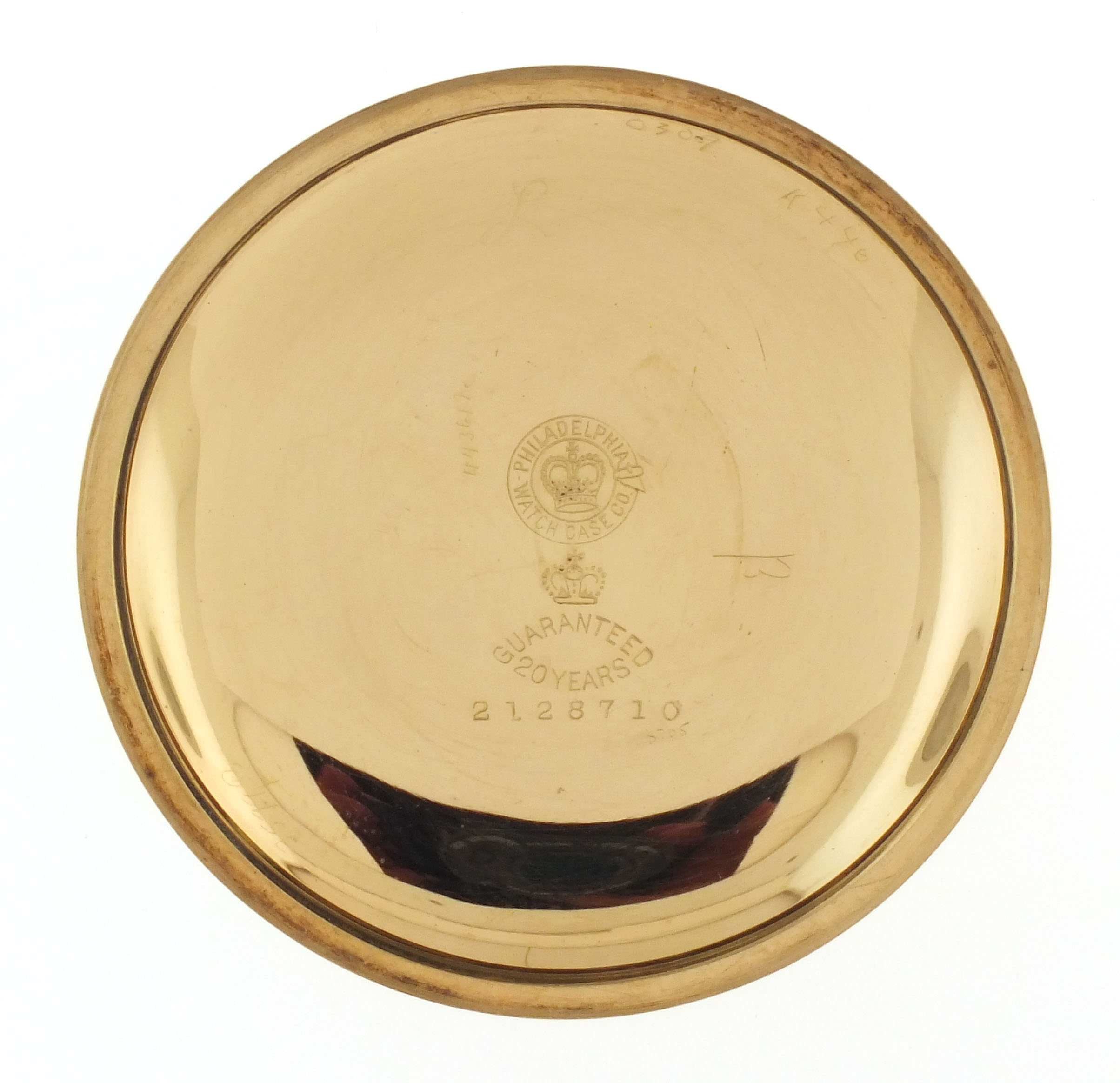 CASE: Minor dings; Fine scratches on outer surface of case; Bow with minor brassing; Crown worn. DIAL: A few fine scratches; Faint hairline, 6:00. HANDS: Oxidation, tip of minute. MOVEMENT PLATES: Very fine scratches on plate; Fine scratches under balance; Two short scratches at "Adjusted"; Small spot of corrosion; Regulator spring with localized specks of oxide. MOVEMENT FUNCTION: Running order (winds, sets and ticks).