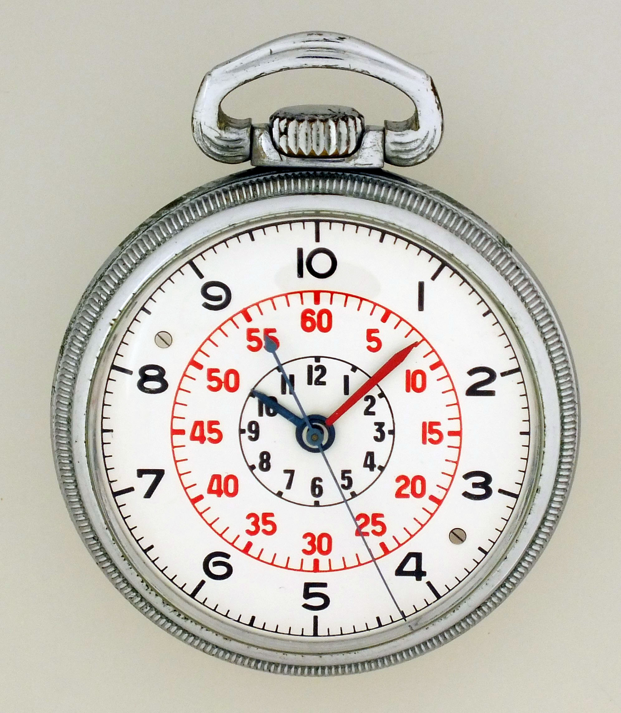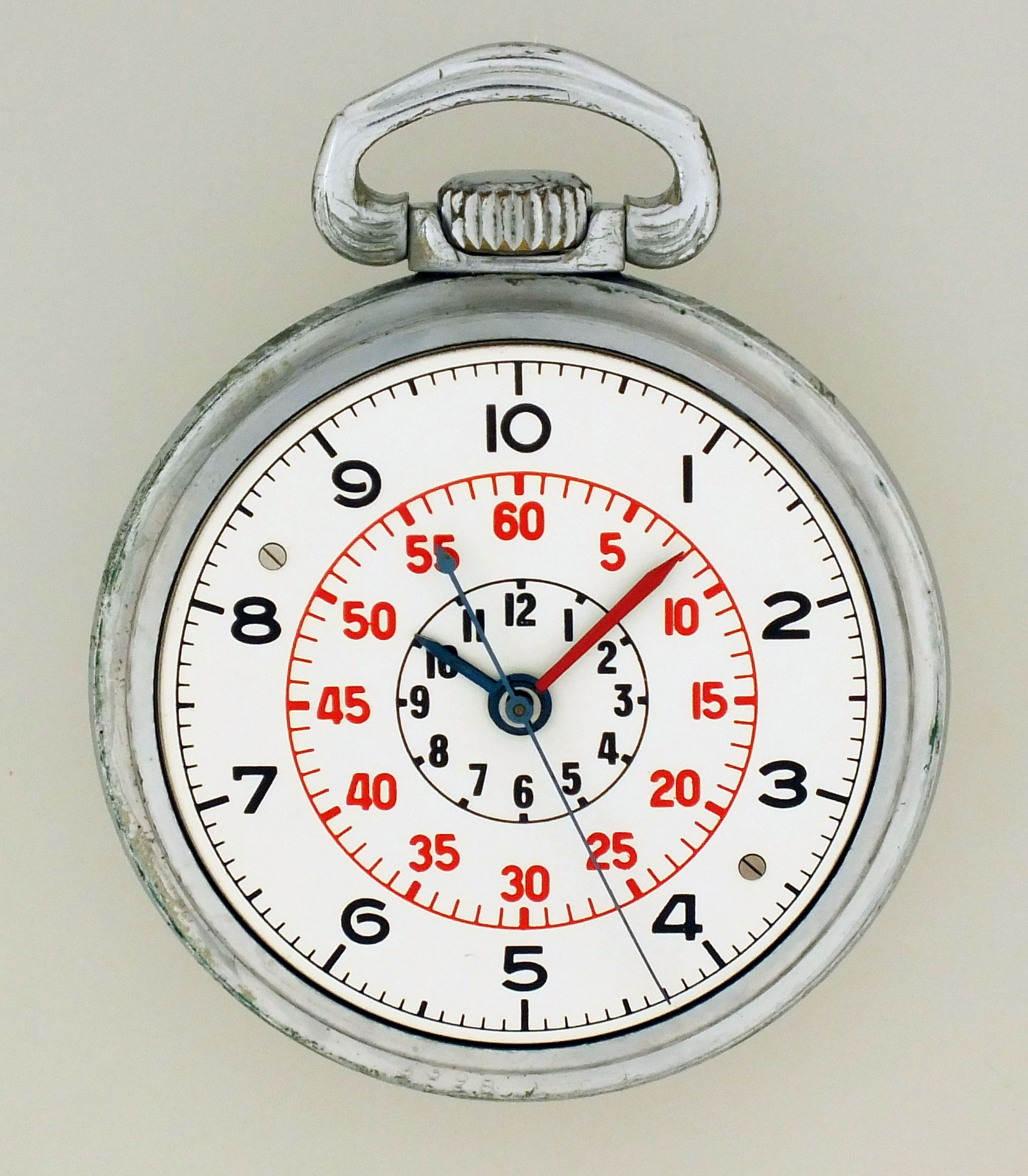 CASE: Numerous dings, marks, and scratches on outer surface of case; Dings; Losses to plating; Bow and crown with scratches, dings, and plating loss; Acrylic crystal. DIAL: Minor mark between 5 and 6:00, otherwise very good. HANDS: Very good. MOVEMENT PLATES: Fine scratches and pin pricks on plate; Crown and ratchet wheel screws blued; Sweep seconds tension spring with scratches and minor bends; A few screw heads with minor marring. MOVEMENT FUNCTION: Running order (winds, sets and ticks); Hacking and setting functional. Box refinished; Dings, minor scrapes and scratches; Foam shock mounts deteriorated, upper liner detached, the lower now rigidly fixed to the bottom.