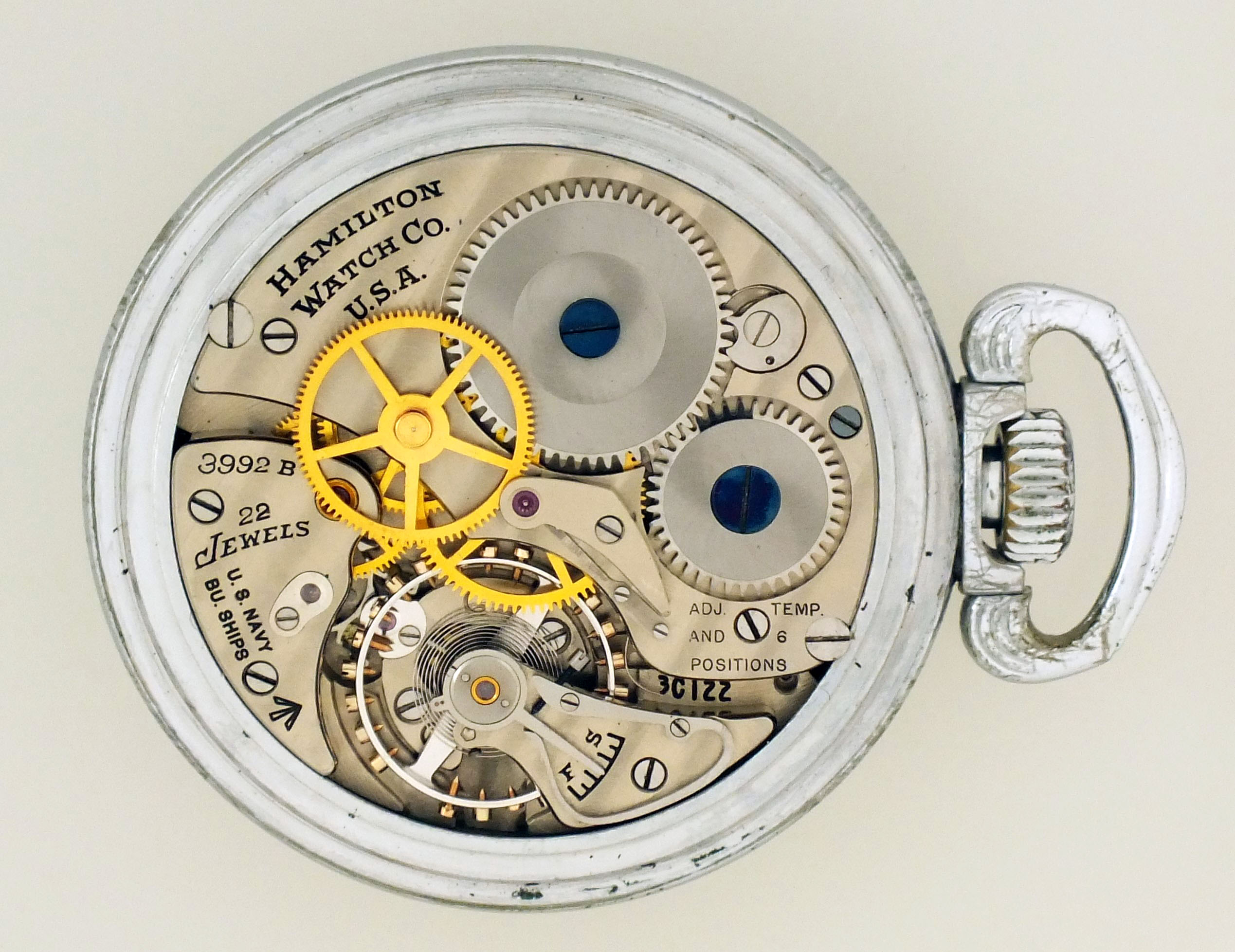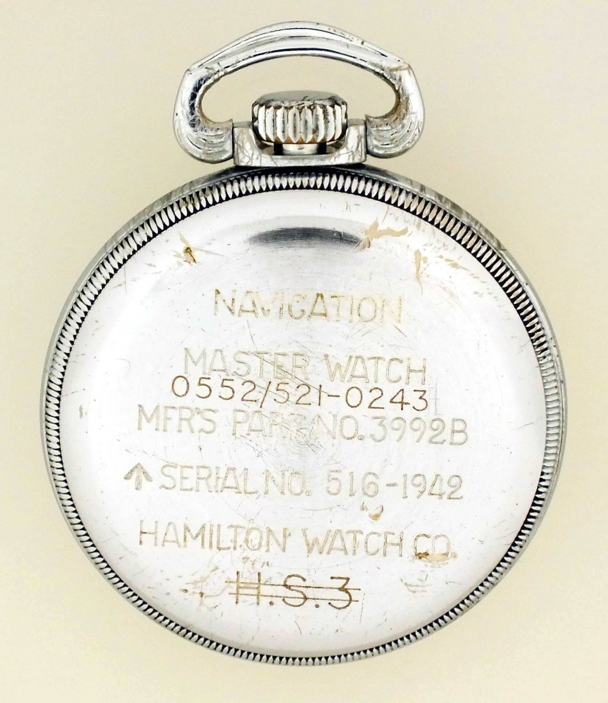 Hamilton Watch Co., Lancaster, Penn., "3992B" Navigation Master Watch for the British navy with box, 16 size, 22 jewels, stem wind and set, adjusted to 6 positions and temperature, straight line damascened nickel plate movement with lever escapement, double roller and whiplash micrometric regulator in a base metal, screw back and bezel, open face case with ordnance department information engraved on case back, and arabic numeral, white painted "Work Study" (NATO) dial, painted steel hands, serial #3C122, c1942, with wooden deck watch box.