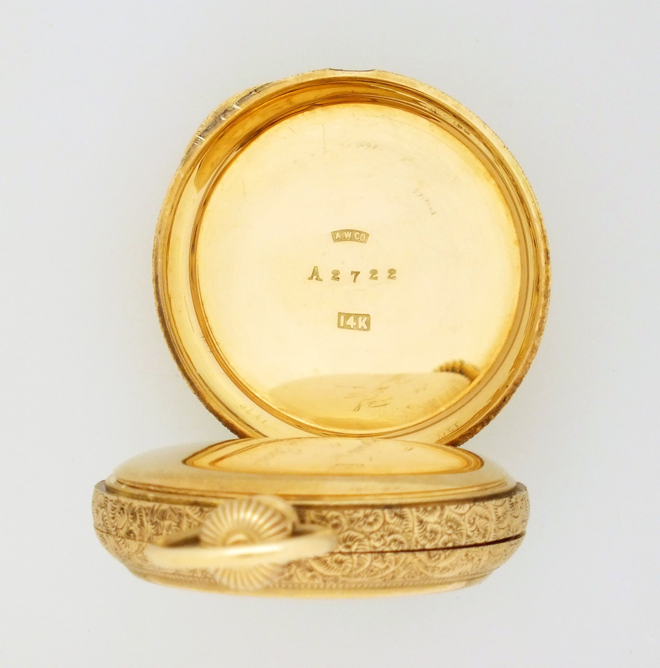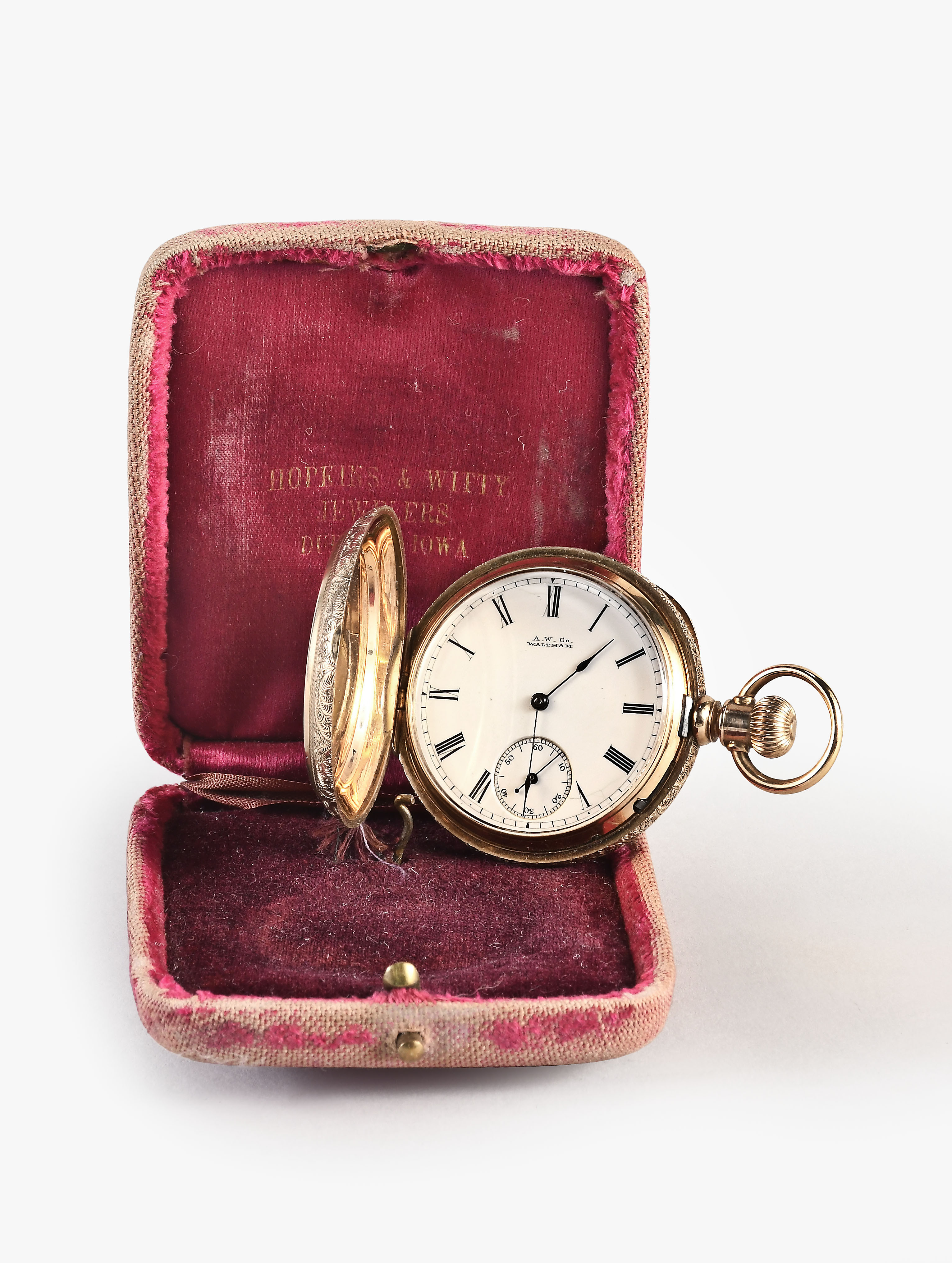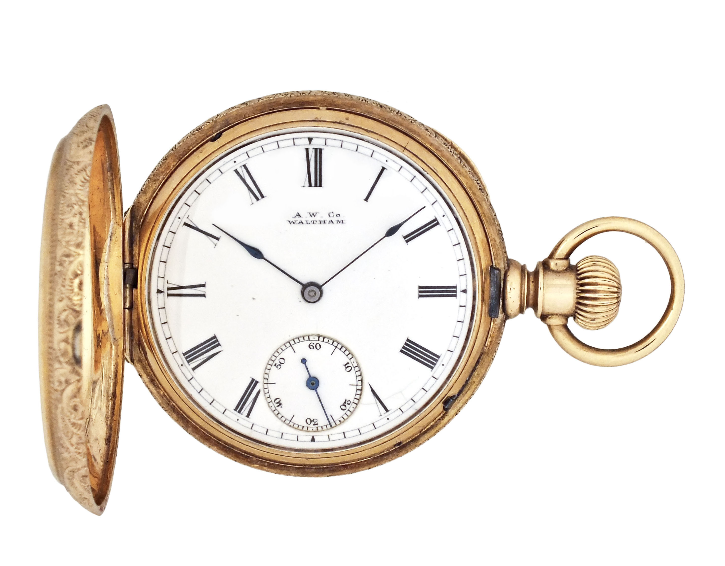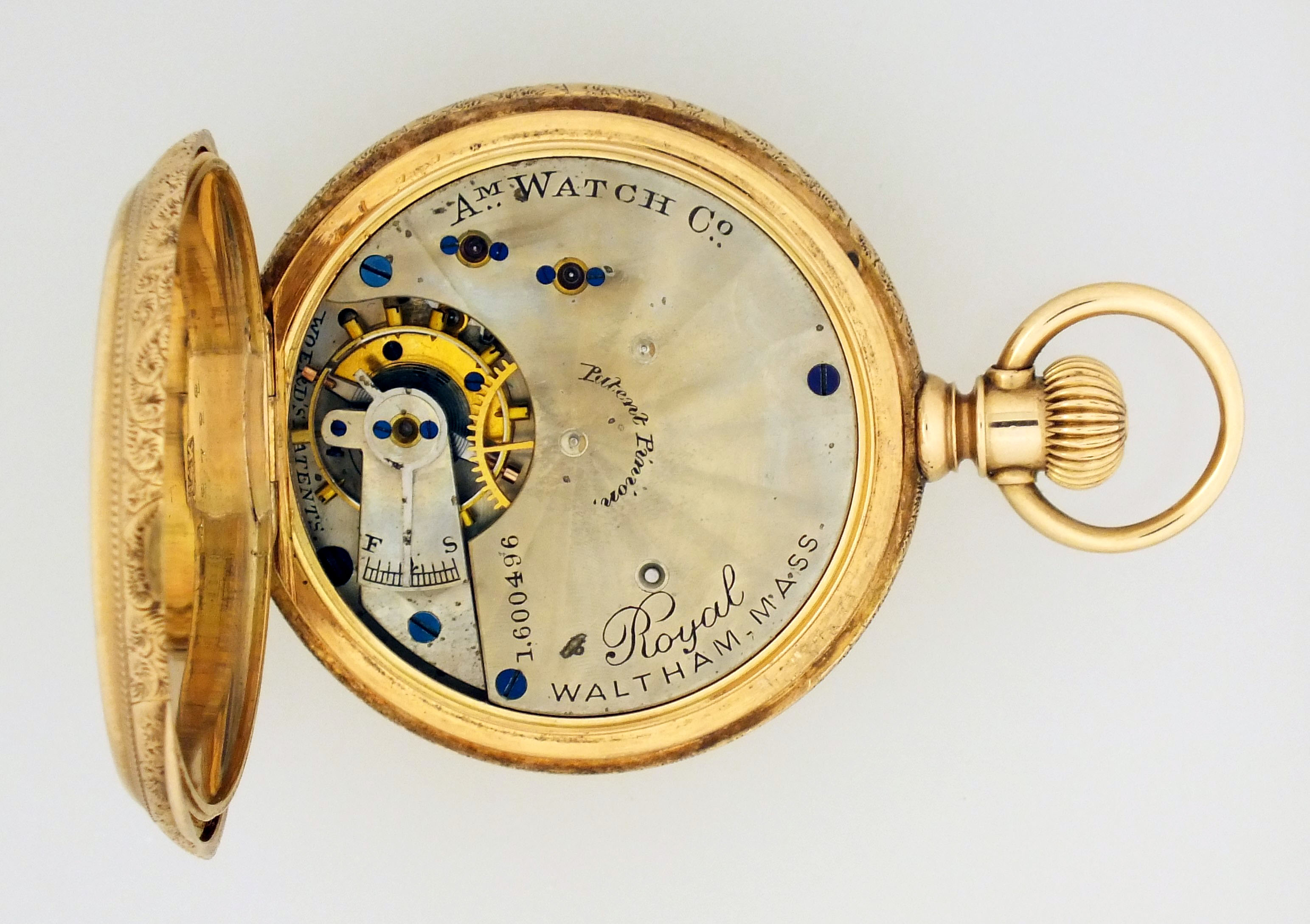 American Waltham Watch Co., Waltham, Mass., a model 1873 "Royal" pocket watch with gold case, 8 size, 13 jewel, stem wind and lever set, sunburst damascened nickel plate movement with lever escapement and cut bimetallic balance in a 14 karat, yellow gold, engraved hunting case with presentation on gold cuvette, roman numeral, single sunk white enamel dial with blued steel spade hands, serial #1600496, 69.8g TW, with jewelers box