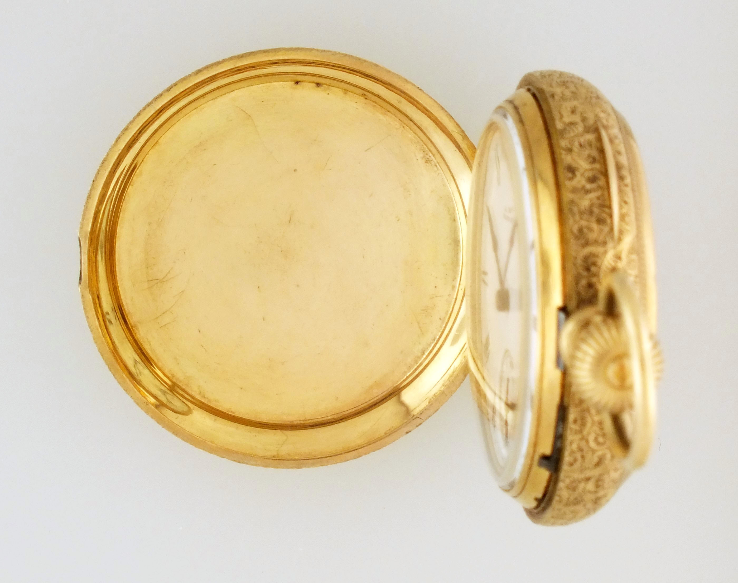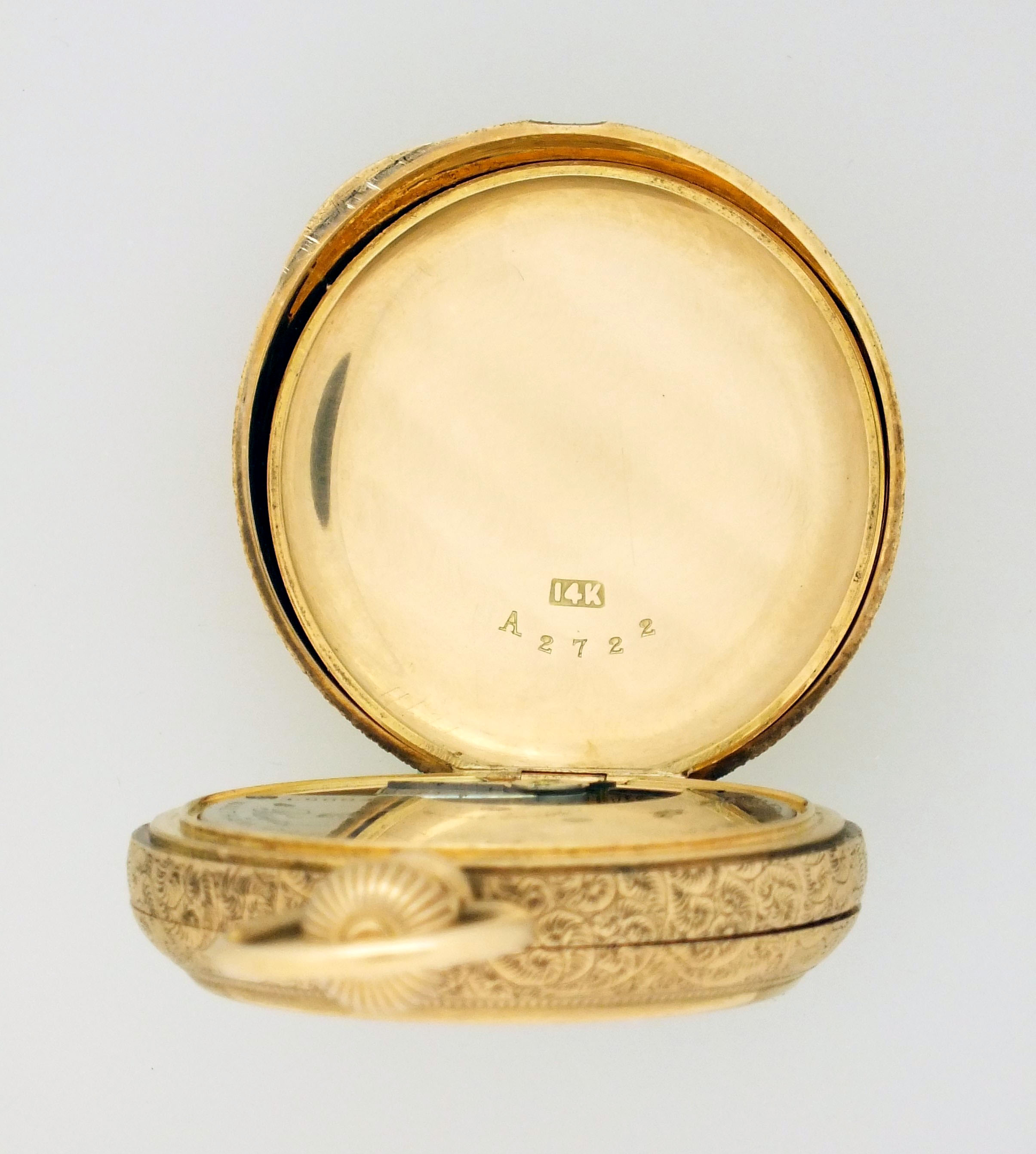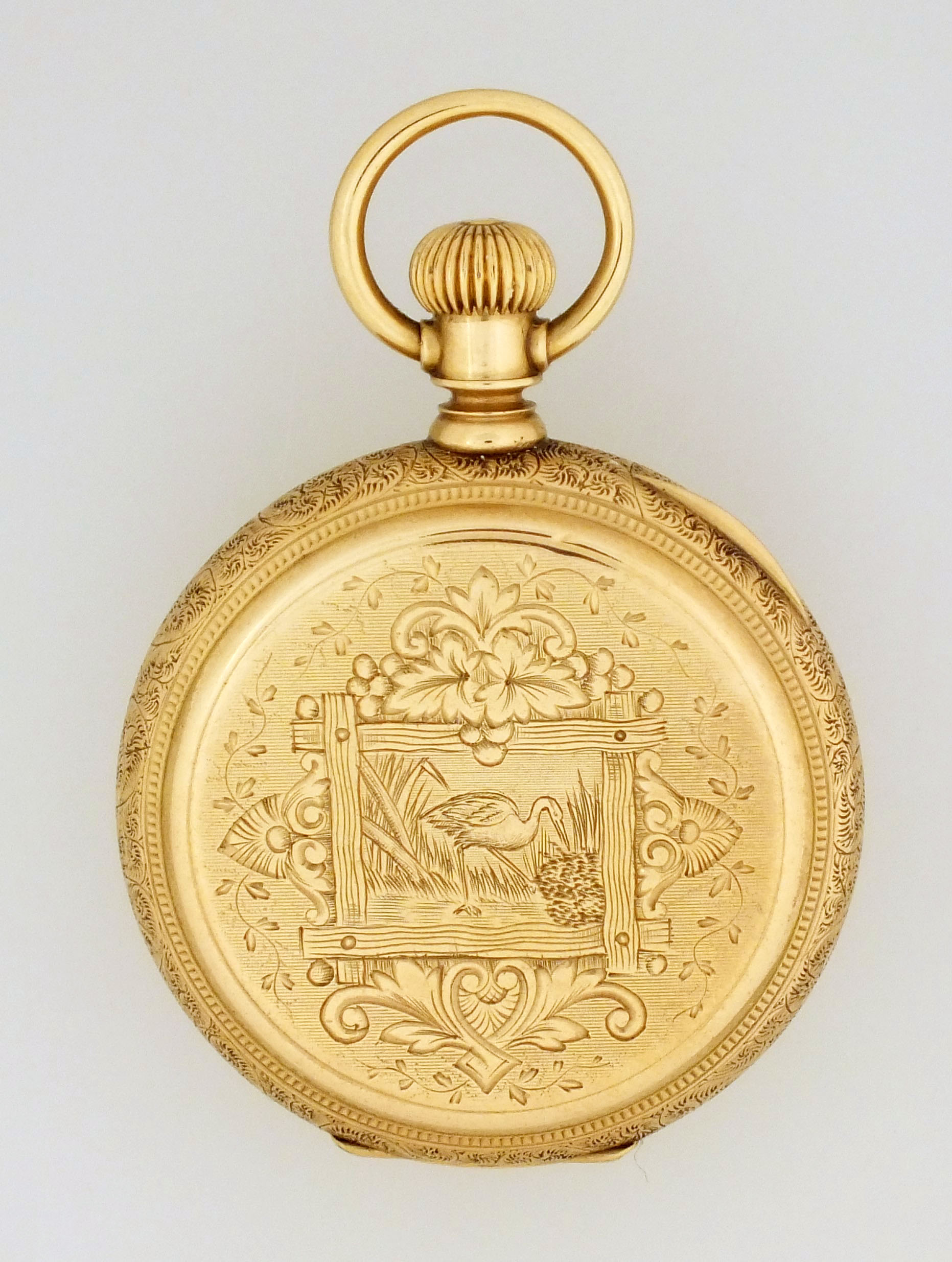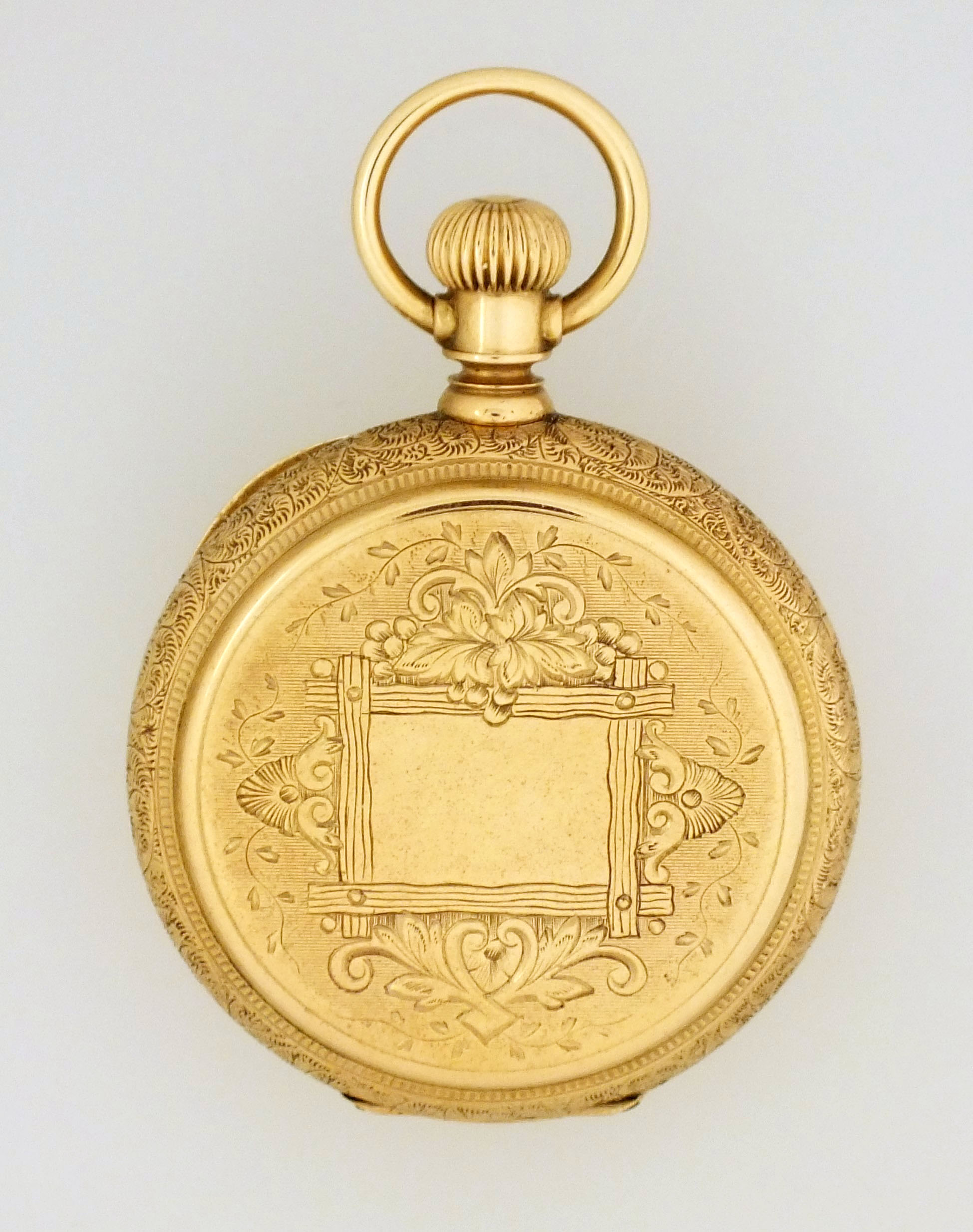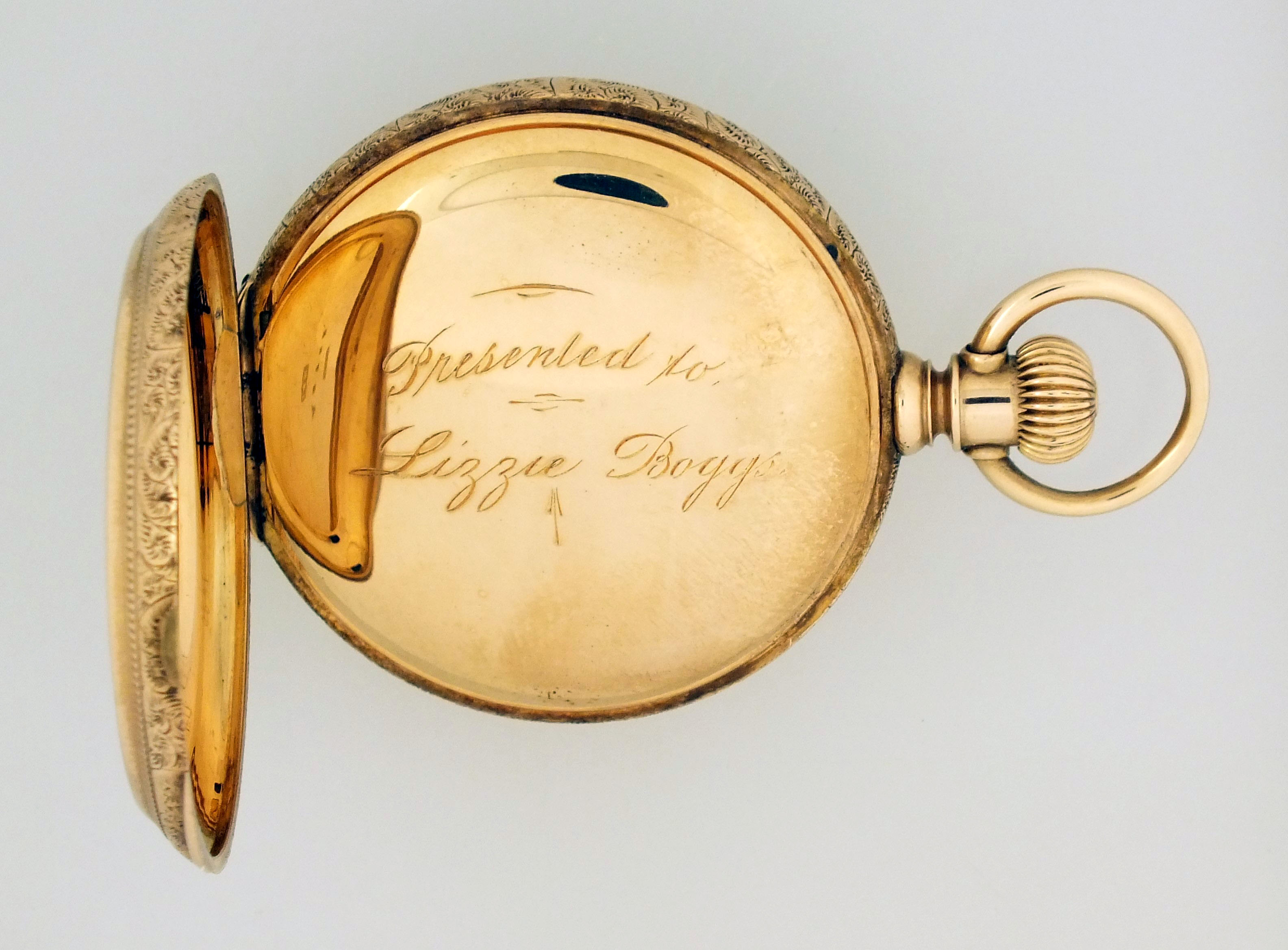 American Waltham Watch Co., Waltham, Mass., a model 1873 "Royal" pocket watch with gold case, 8 size, 13 jewel, stem wind and lever set, sunburst damascened nickel plate movement with lever escapement and cut bimetallic balance in a 14 karat, yellow gold, engraved hunting case with presentation on gold cuvette, roman numeral, single sunk white enamel dial with blued steel spade hands, serial #1600496, 69.8g TW, with jewelers box