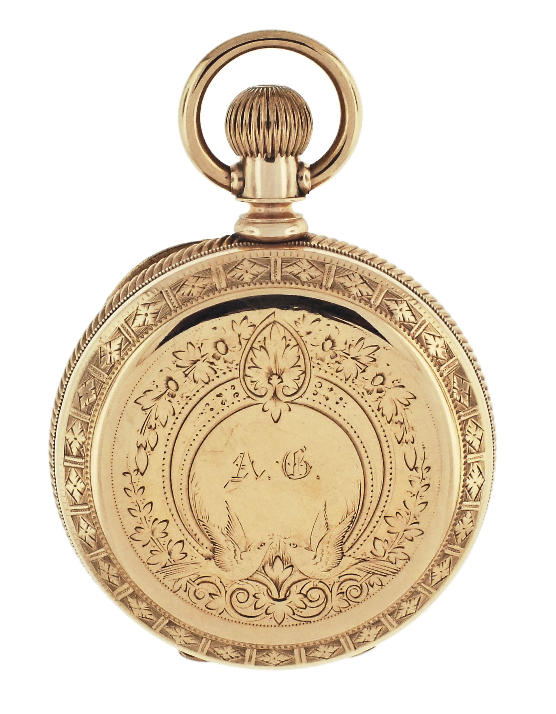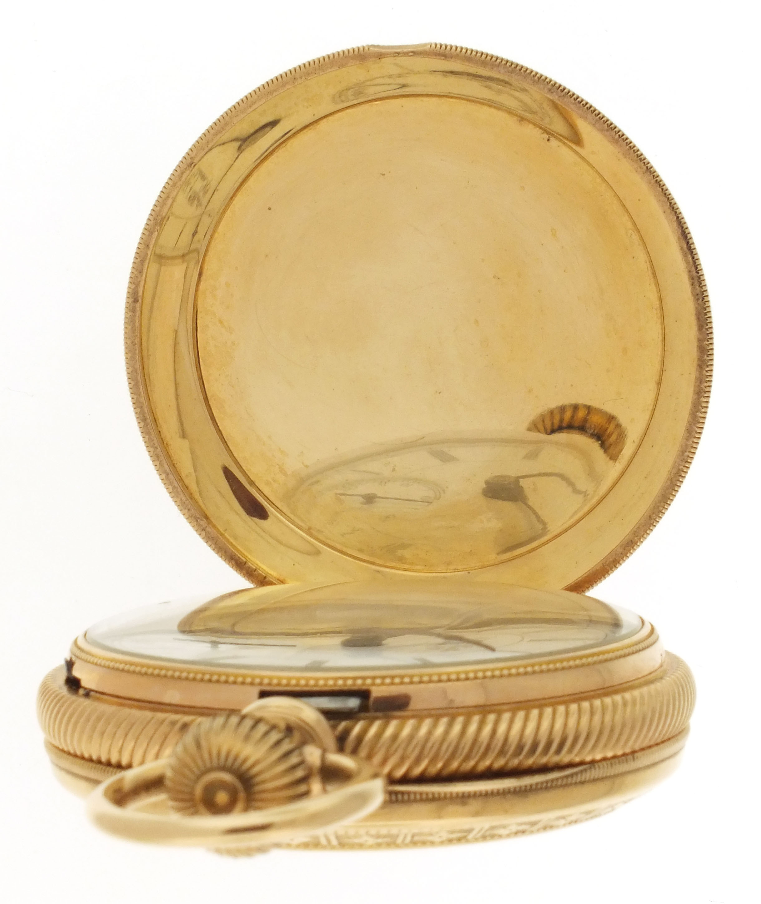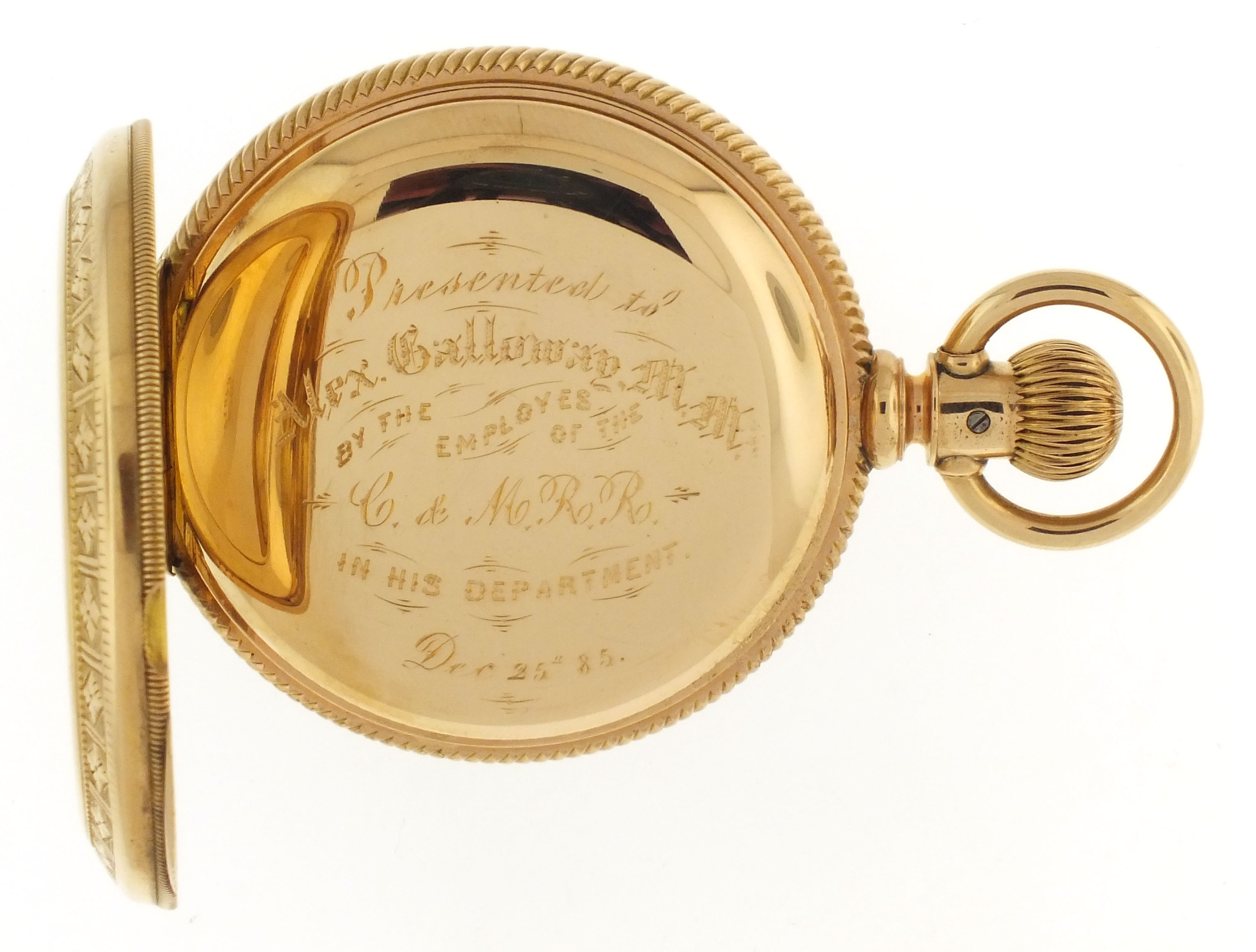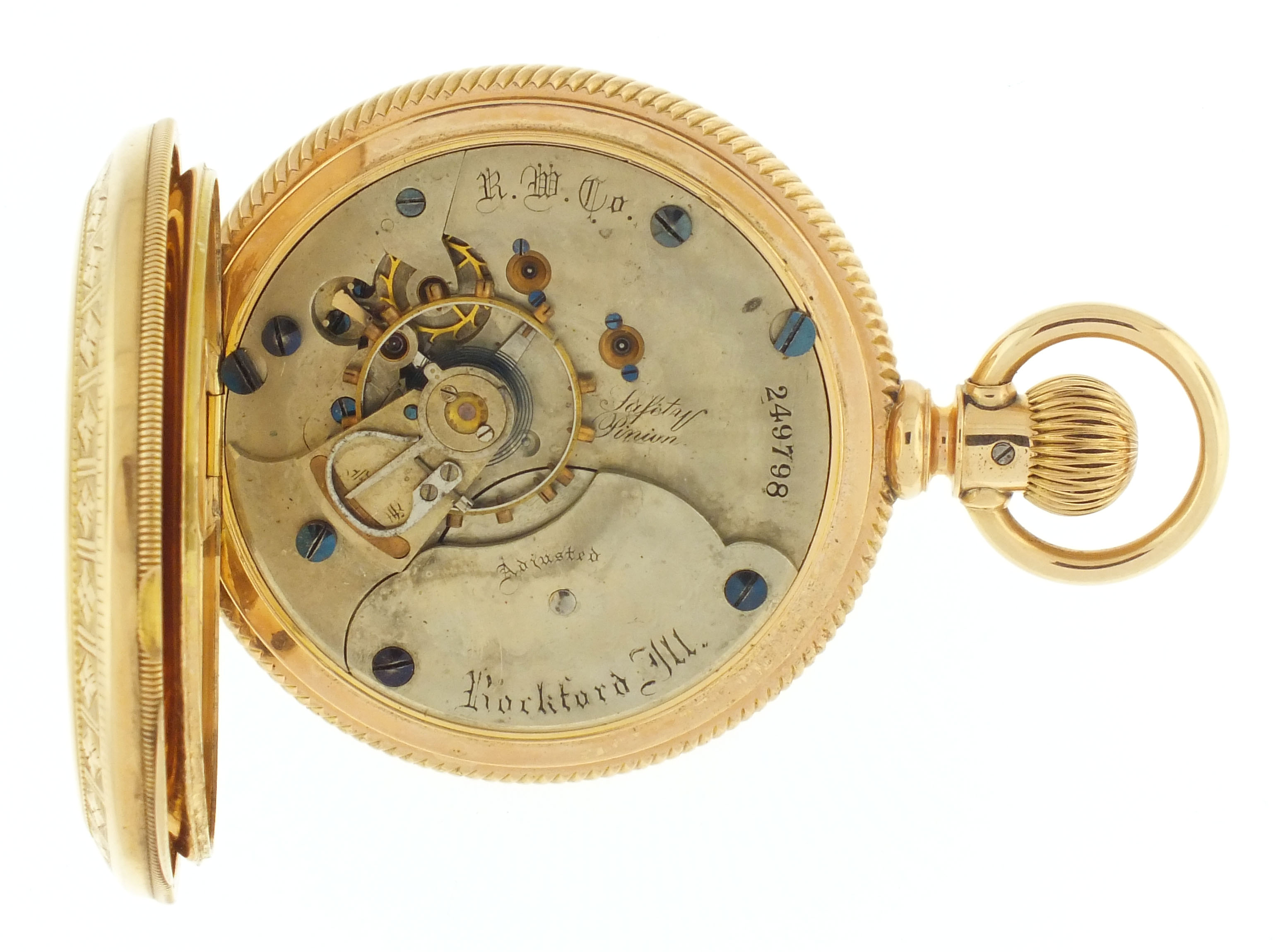 Rockford Watch Co., Rockford, Illinois, a late 19th century grade 49 pocket watch, 18 size, 15 jewels, stem wind and lever set, adjusted, damascened nickel plate movement with exposed lever escapement, cut bimetallic balance and whiplash micrometric regulator in a 14 karat, yellow gold engraved hunting case with initials on front cover, and engraved dedication on gold cuvette, roman numeral, single sunk white enamel dial with blued steel open morning glory hands, serial #249798, 144.6g TW
