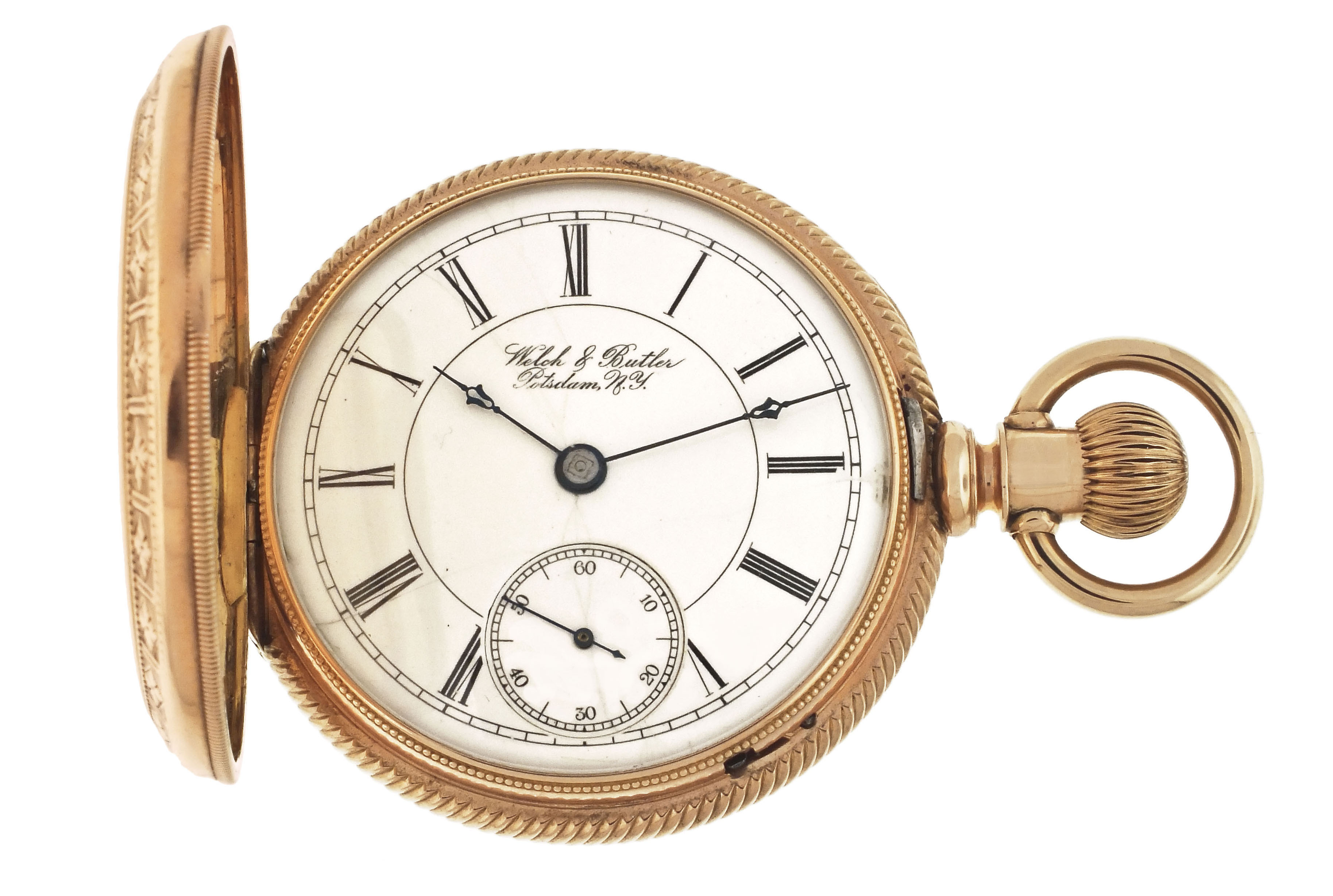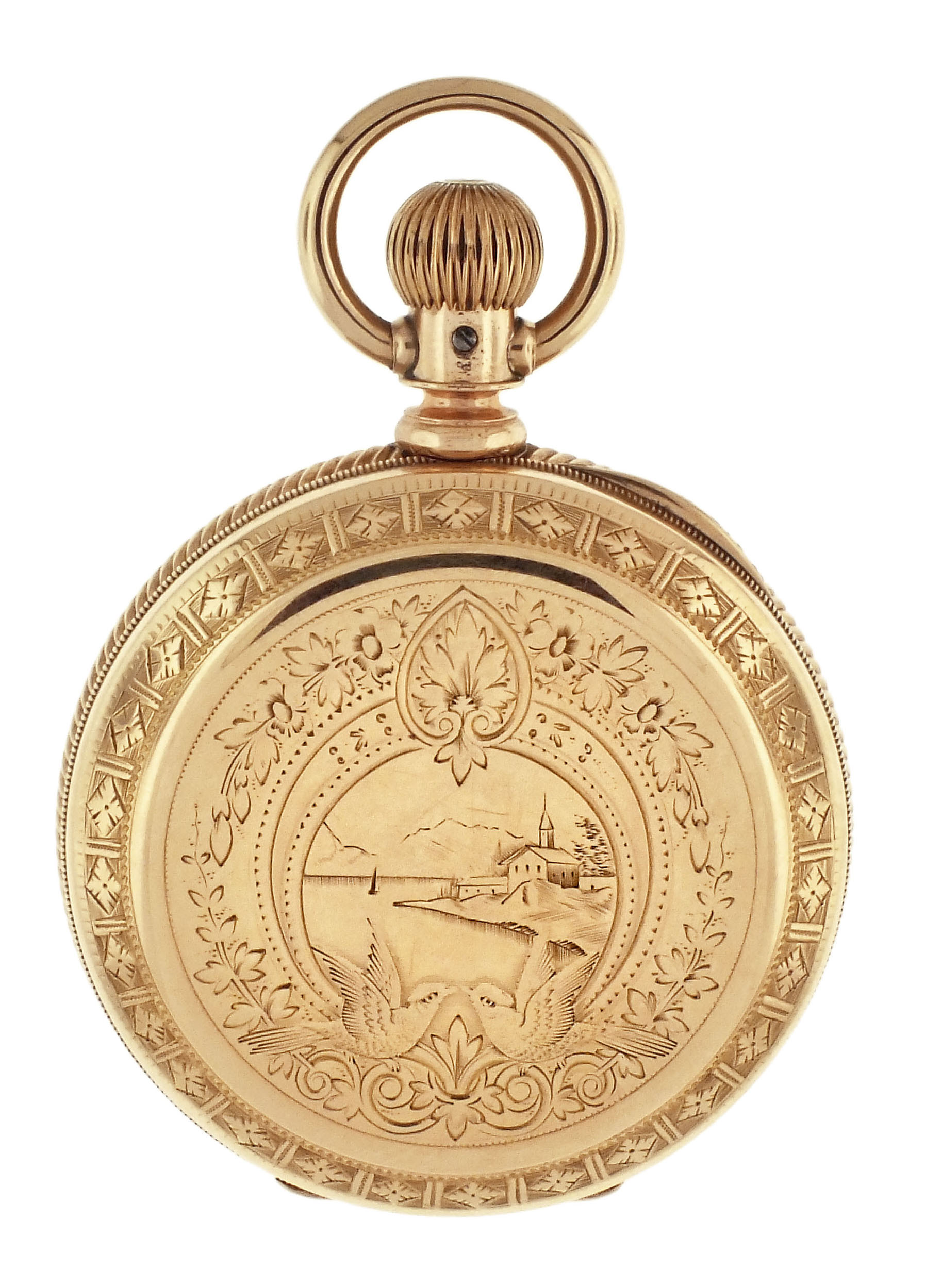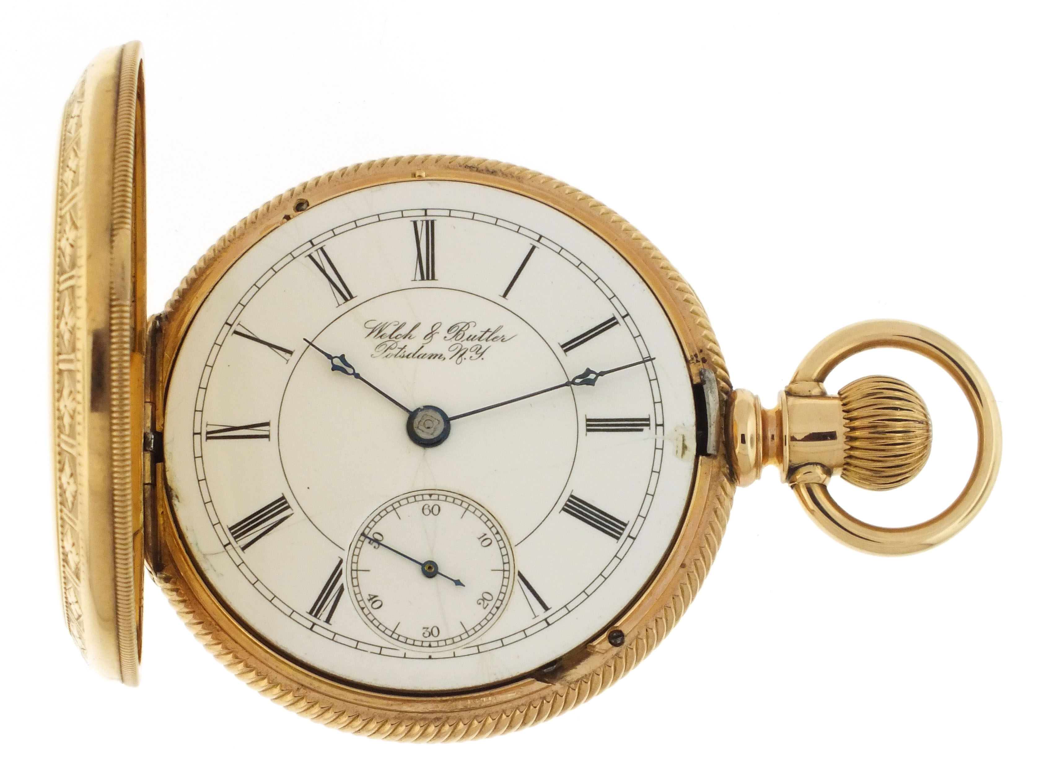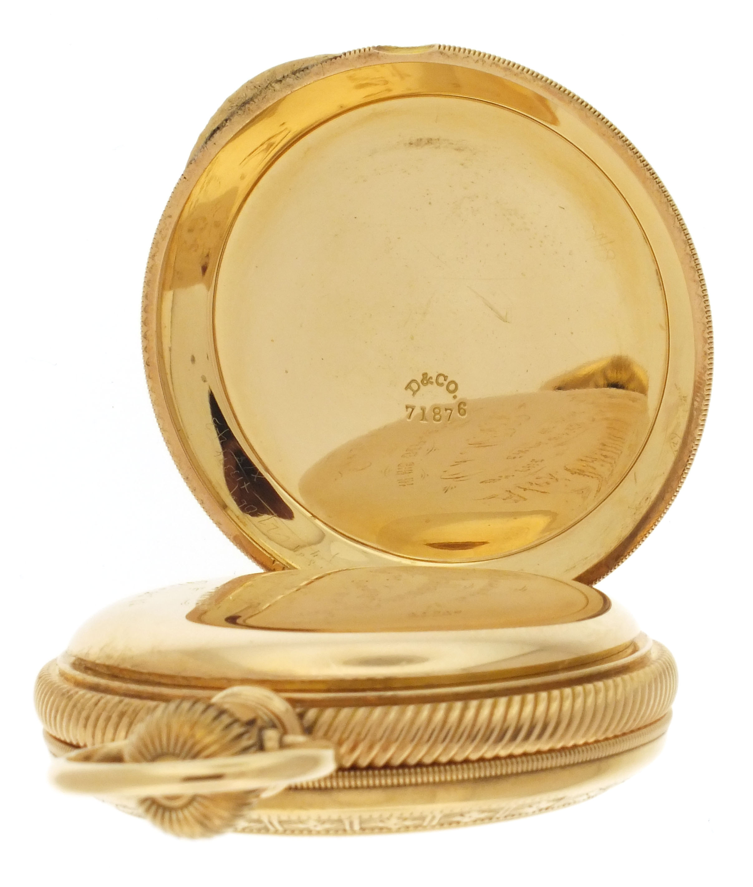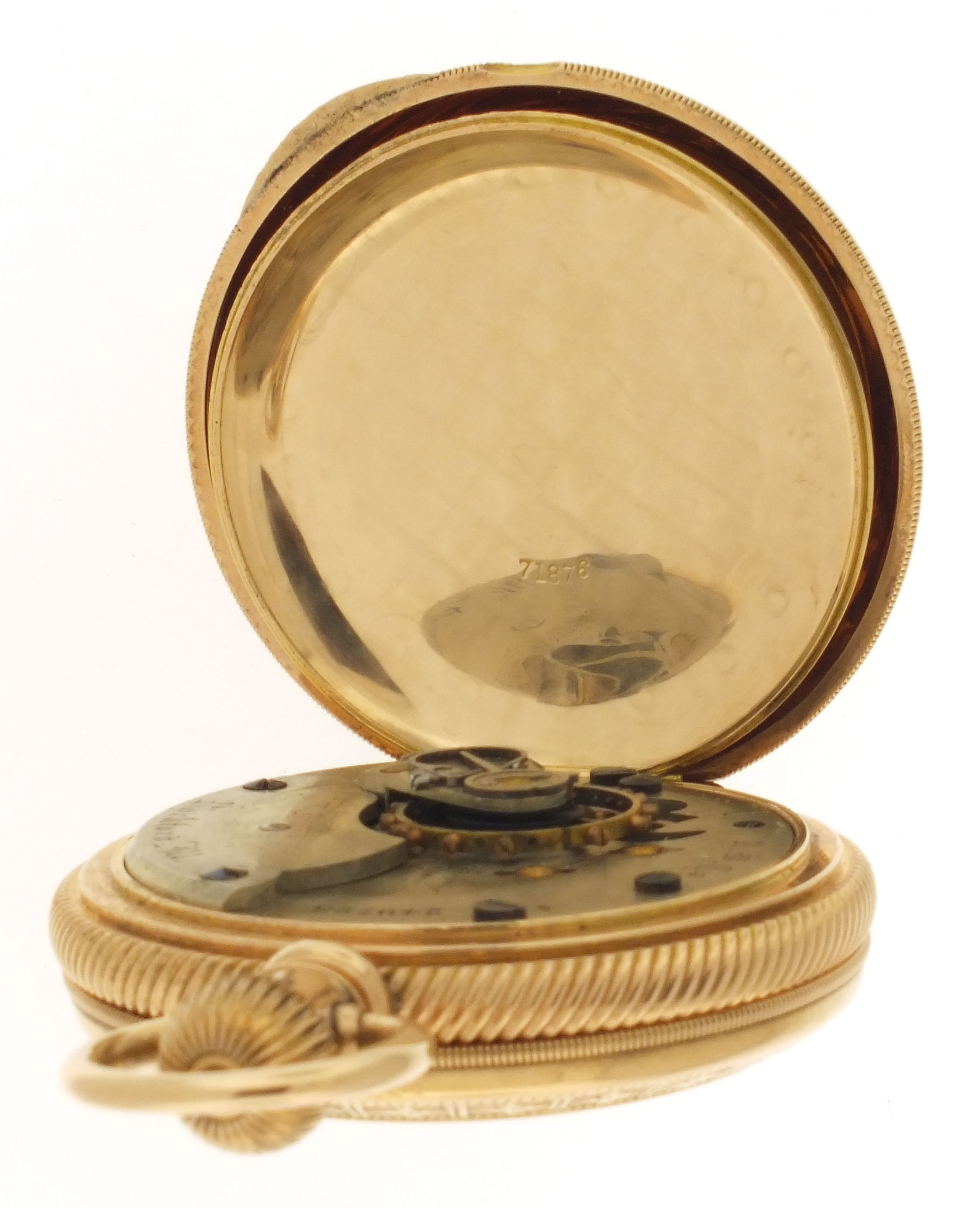 Rockford Watch Co., Rockford, Illinois, a late 19th century grade 49 pocket watch, 18 size, 15 jewels, stem wind and lever set, adjusted, damascened nickel plate movement with exposed lever escapement, cut bimetallic balance and whiplash micrometric regulator in a 14 karat, yellow gold engraved hunting case with initials on front cover, and engraved dedication on gold cuvette, roman numeral, single sunk white enamel dial with blued steel open morning glory hands, serial #249798, 144.6g TW