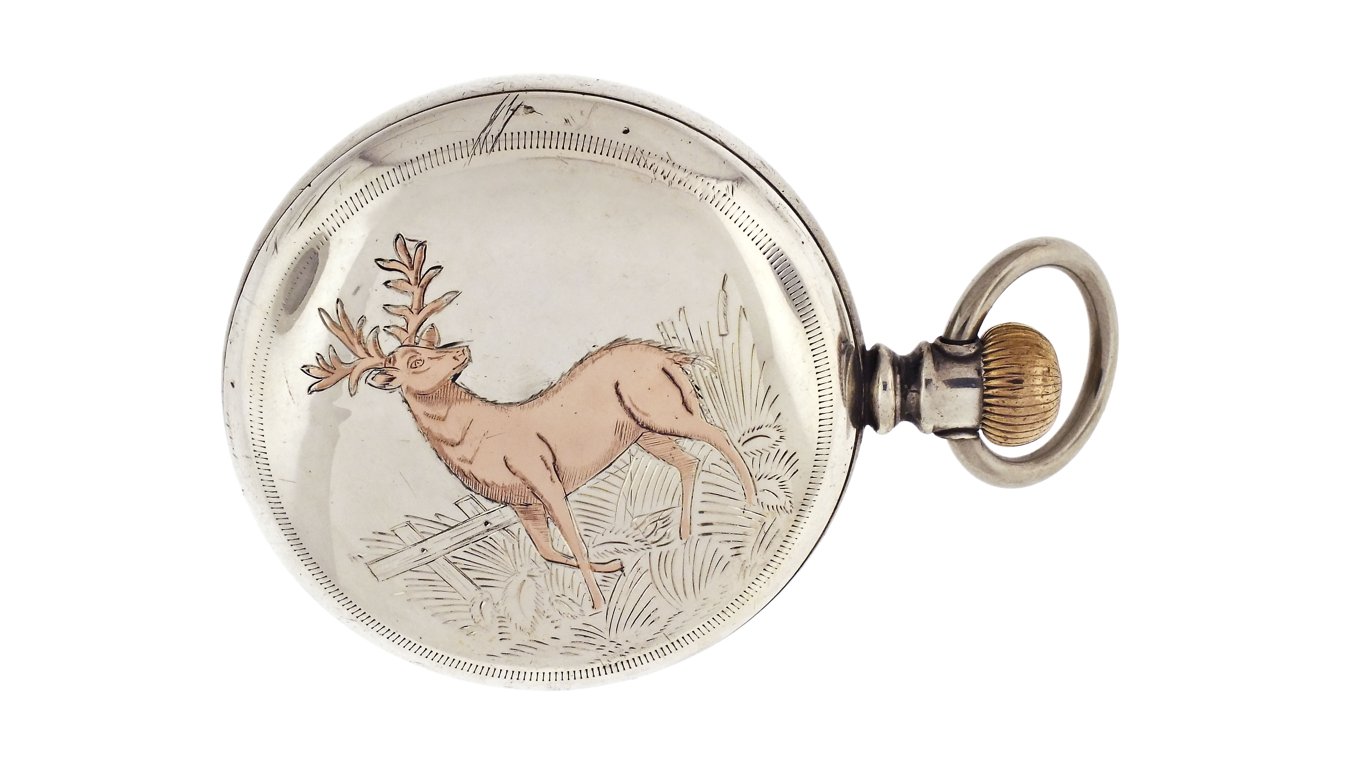 CASE: Shows two extra case screw marks adjacent to case screws; Numerous small dents, dings and pin pricks; Fine scratches on outer surface of case; Interior of case back with black staining, scratches, and punch marks from dent removal; Bow loose; Crown worn and with split shell. DIAL: Wind indicator with faint hairline and small chip. HANDS: Specks of oxide. MOVEMENT PLATES: Very fine scratches on plate; Scattered fine scratches on plate; Crown wheel and core with spot of oxide; Barrel bushing with speck of oxide; Regulator with spot of oxide; One case screw head with abrasion. MOVEMENT FUNCTION: Running order (winds, sets and ticks); Wind indicator functional.
