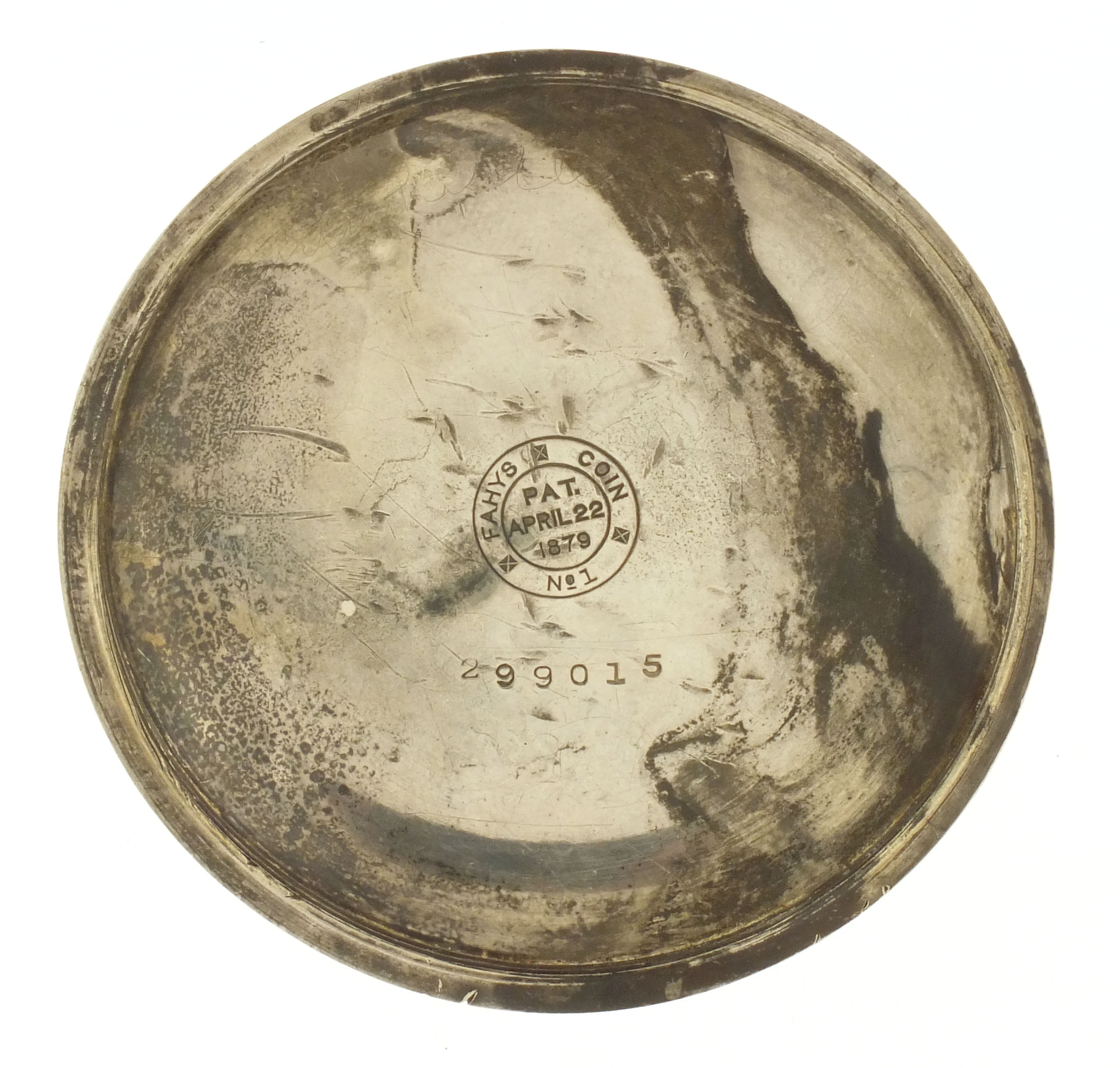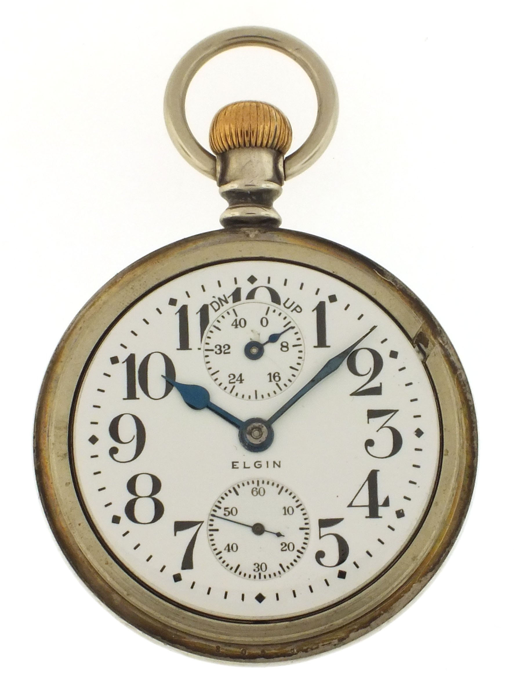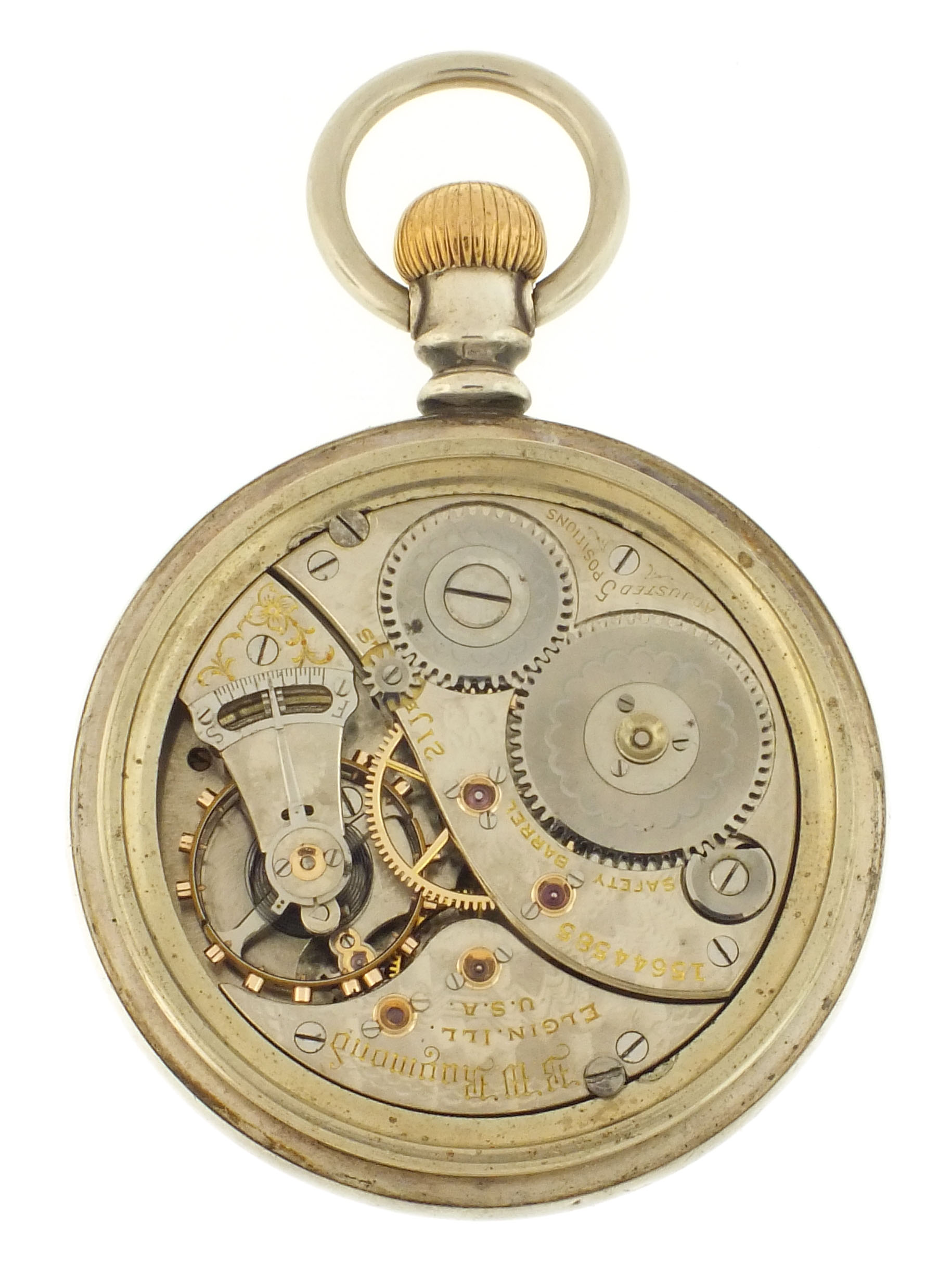 Elgin National Watch Co., Elgin, Illinois, a "B.W Raymond" grade 390 pocket watch with wind indicator, 21 jewels, stem wind and lever set, adjusted to 5 positions, temperature and isochronism, damascened nickel plate movement with lever escapement, cut bimetallic balance with gold screws and diamond endstone, gold jewel settings, and micrometric regulator in a nickel, screw back and bezel open face case with gold buck on back, arabic numeral, double sunk white enamel dial with blued steel spade and poker hands, serial #15644585