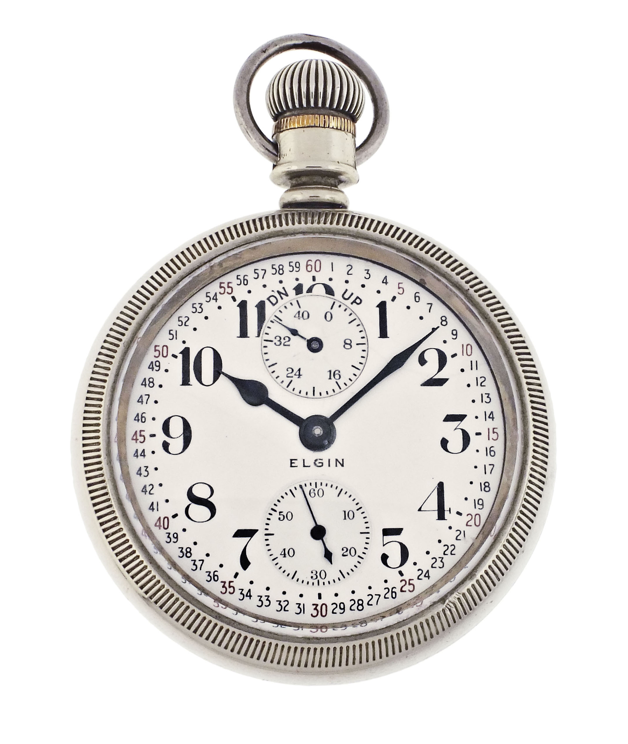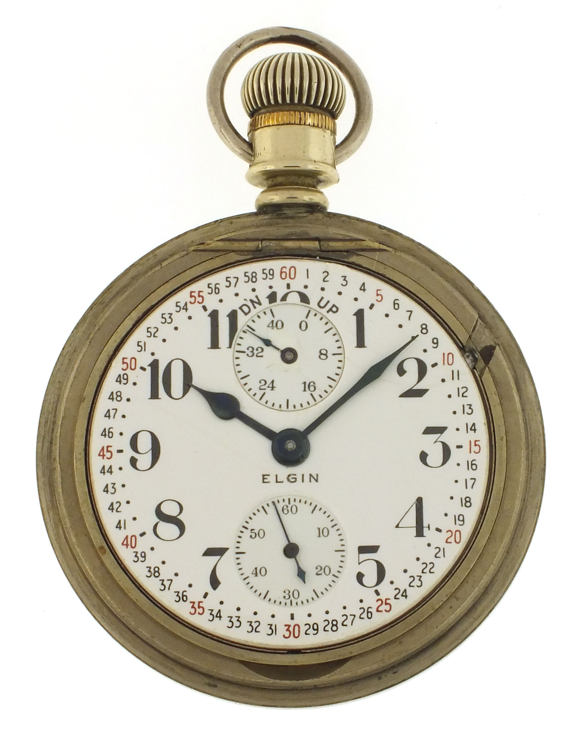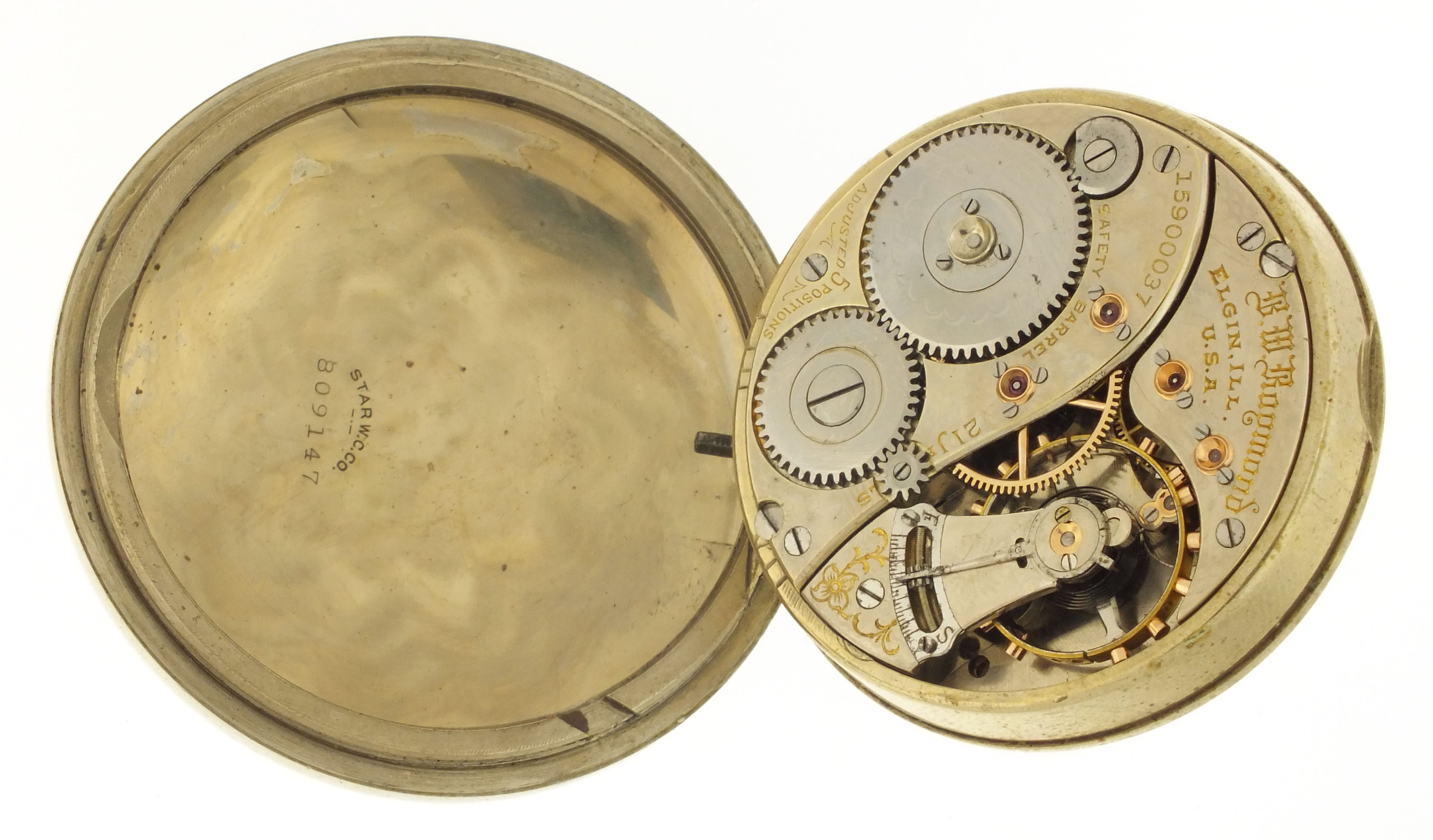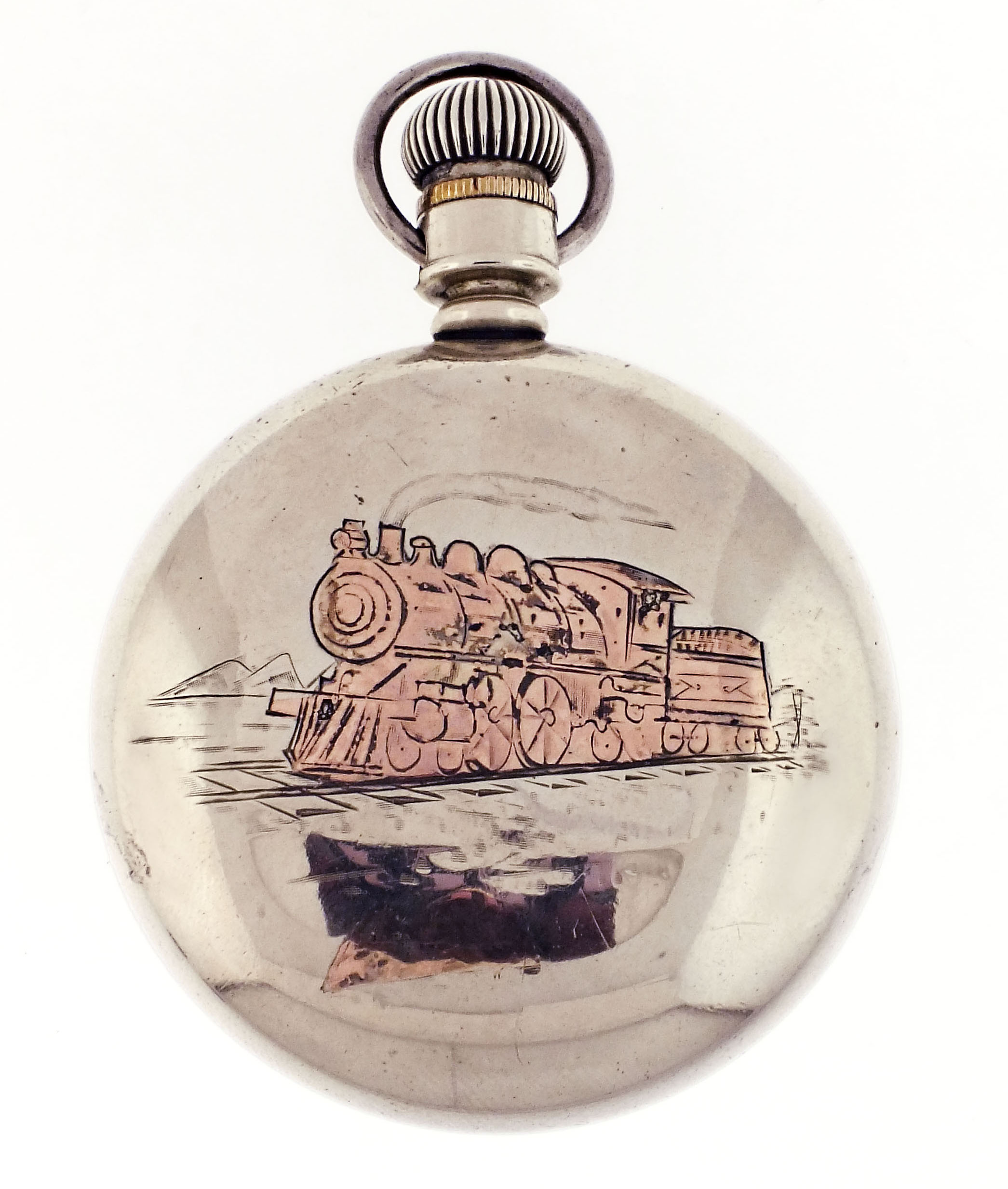Elgin National Watch Co., Elgin, Illinois, a "B.W Raymond" grade 390 pocket watch with wind indicator, 21 jewels, stem wind and lever set, adjusted to 5 positions, temperature and isochronism, damascened nickel plate movement with lever escapement, cut bimetallic balance with gold screws and diamond endstone, gold jewel settings, and micrometric regulator in a nickel, swingout open face case with gold locomotive on back, Montgomery arabic numeral, double sunk white enamel dial with blued steel hands, serial #15900037