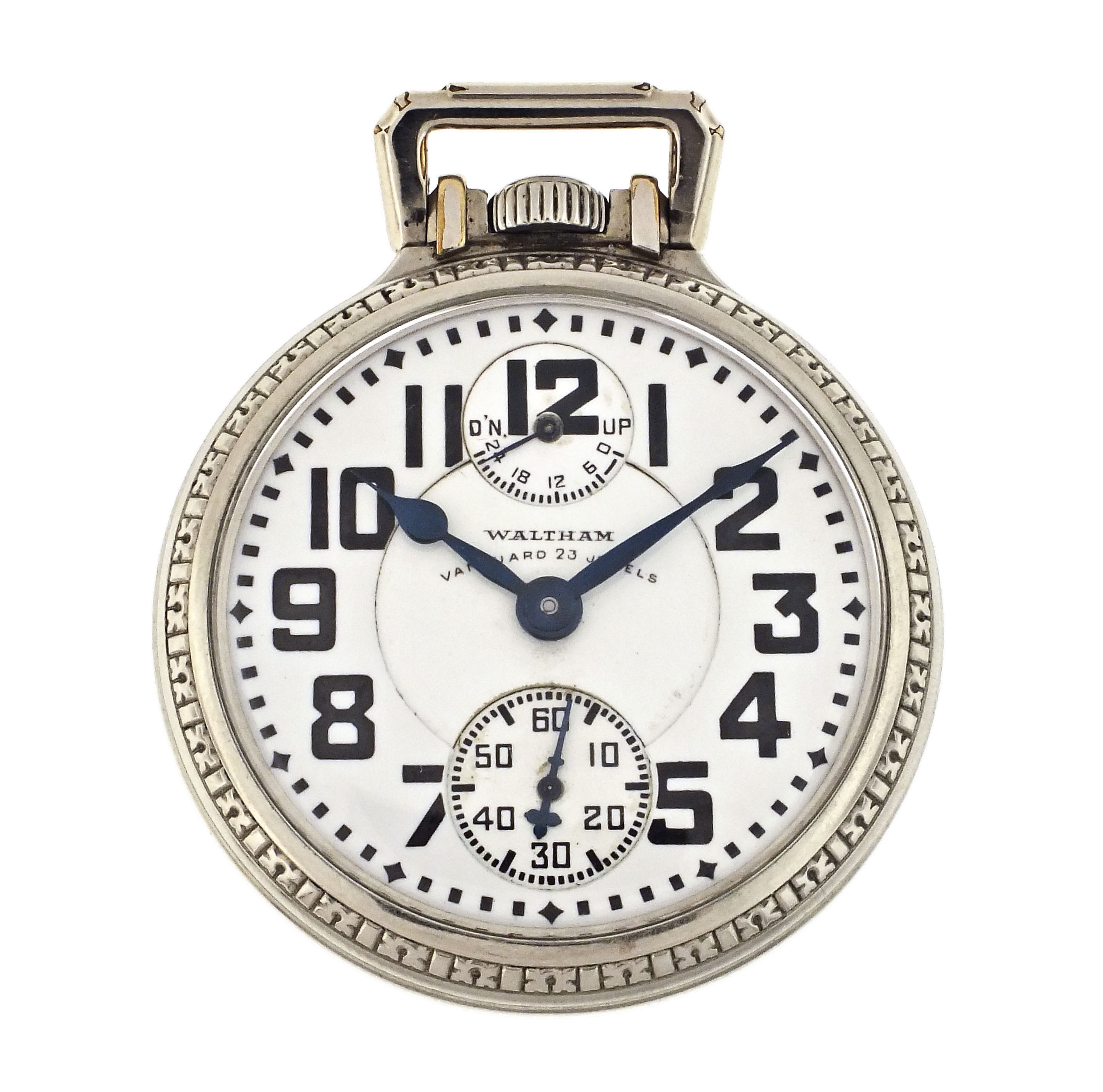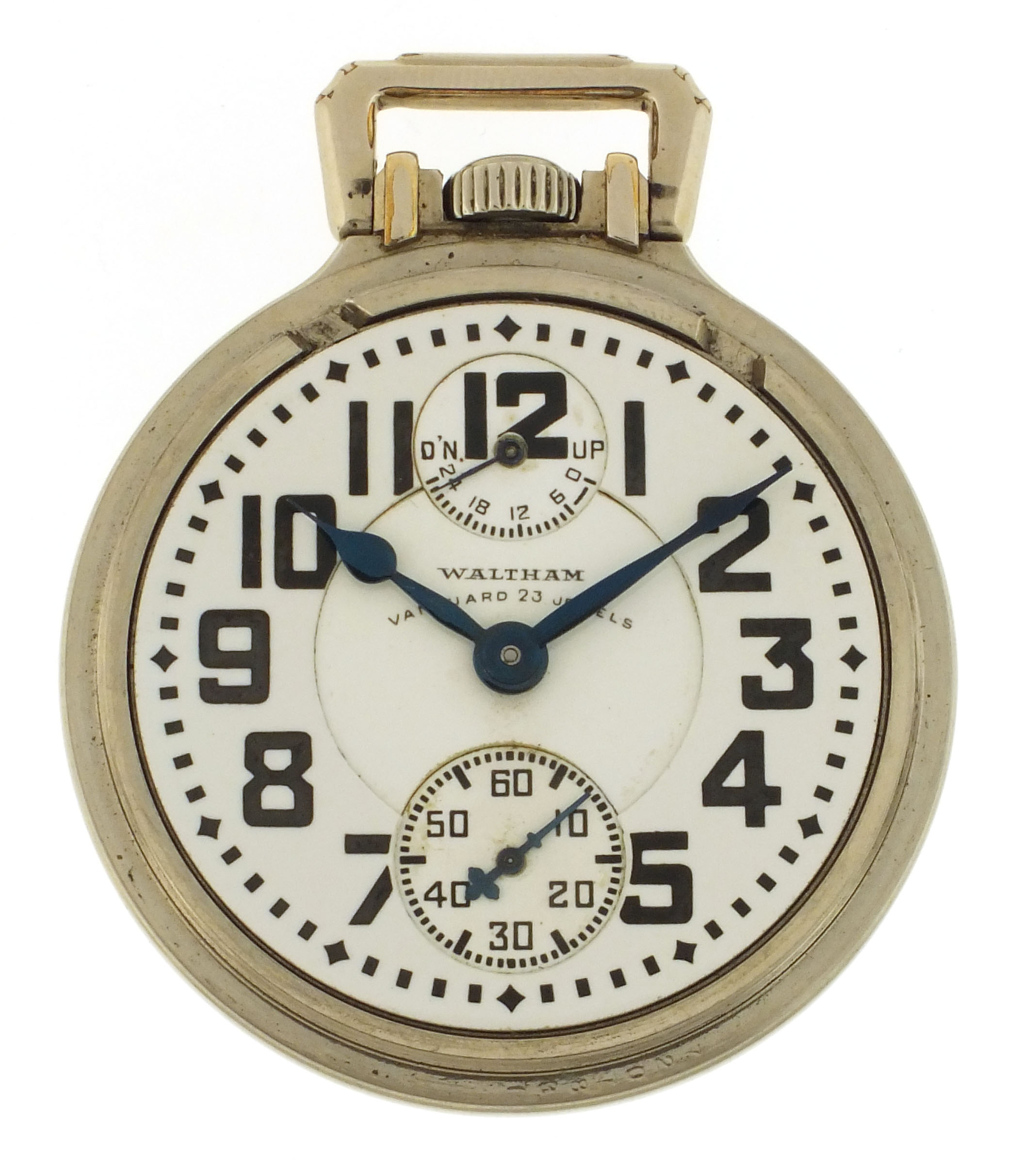 American Waltham Watch Co., Waltham, Mass., a model 1908 "Vanguard" pocket watch with wind indicator, 23 jewels, stem wind and lever set, adjusted to 6 positions and temperature, damascened nickel plate movement with lever escapement, cut bimetallic balance with gold screws, gold jewel settings, and Ohlson micrometric regulator in a gold filled, screw back and bezel, engraved open face case, arabic numeral, triple sunk white enamel dial with blued steel spade and poker hands, serial #26965041