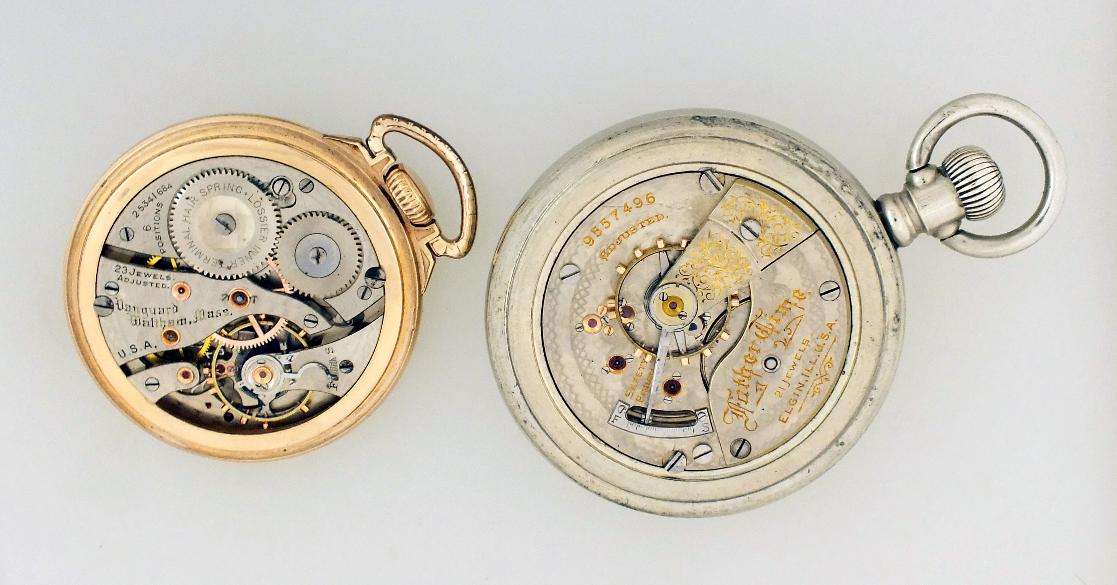 2 (Two) American pocket watches, arabic numeral enamel dials, damascened nickel movements, including an Elgin, 18 size, model 7, grade 252," Father Time", 21 jewel, silverode open face case with gold stag, serial #9557496, and a Waltham, 16 size, model 1908, "Vanguard", 23 jewel, gold filled open face case, serial #25341684