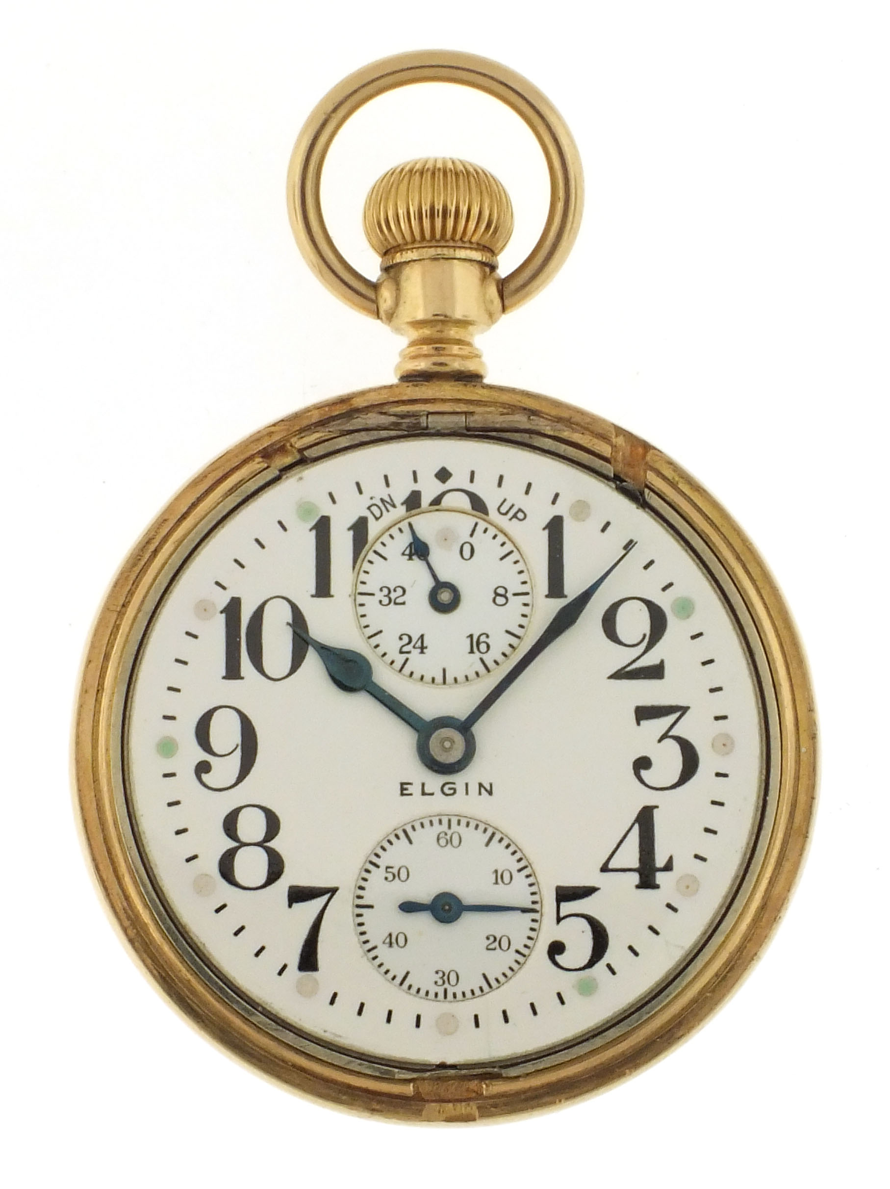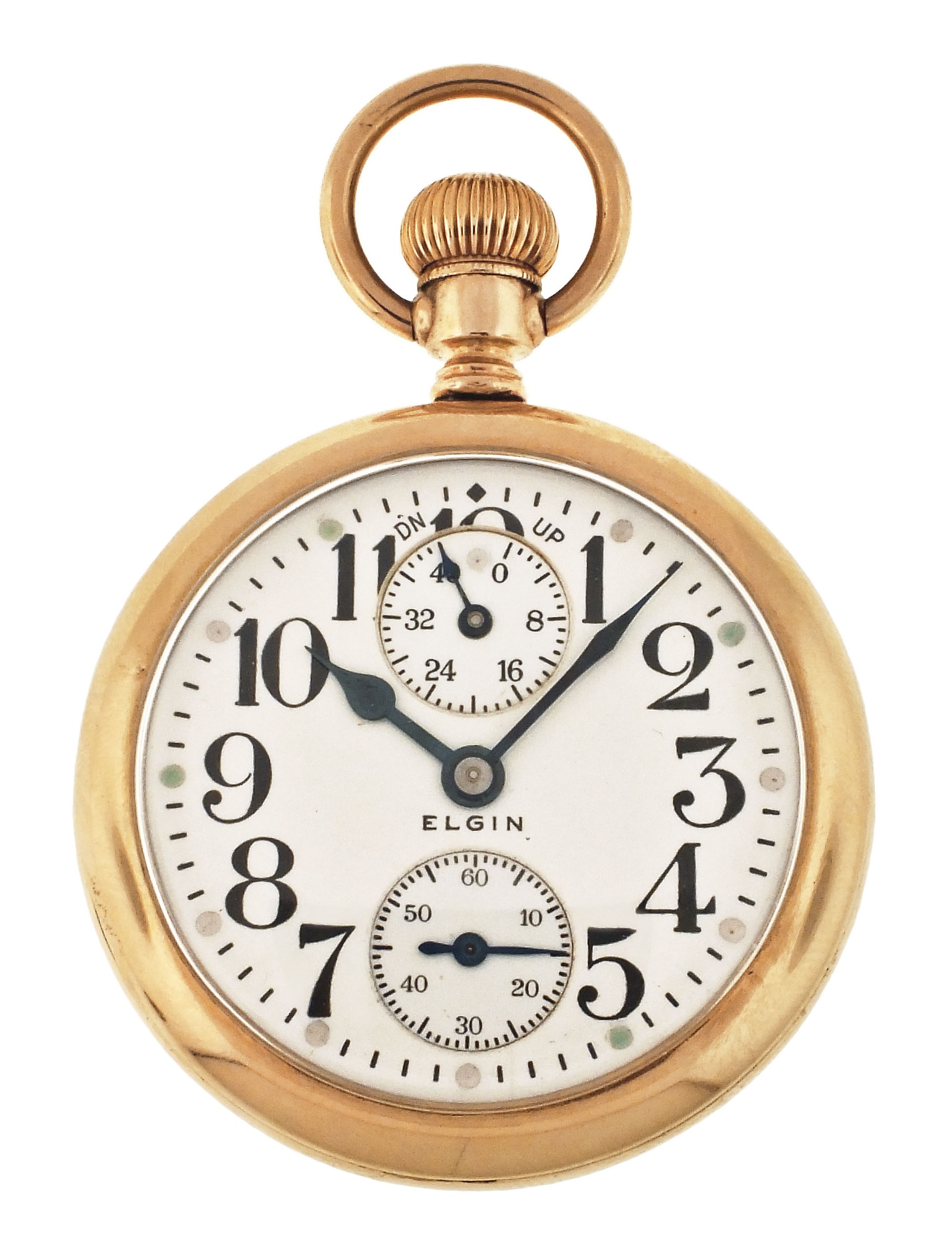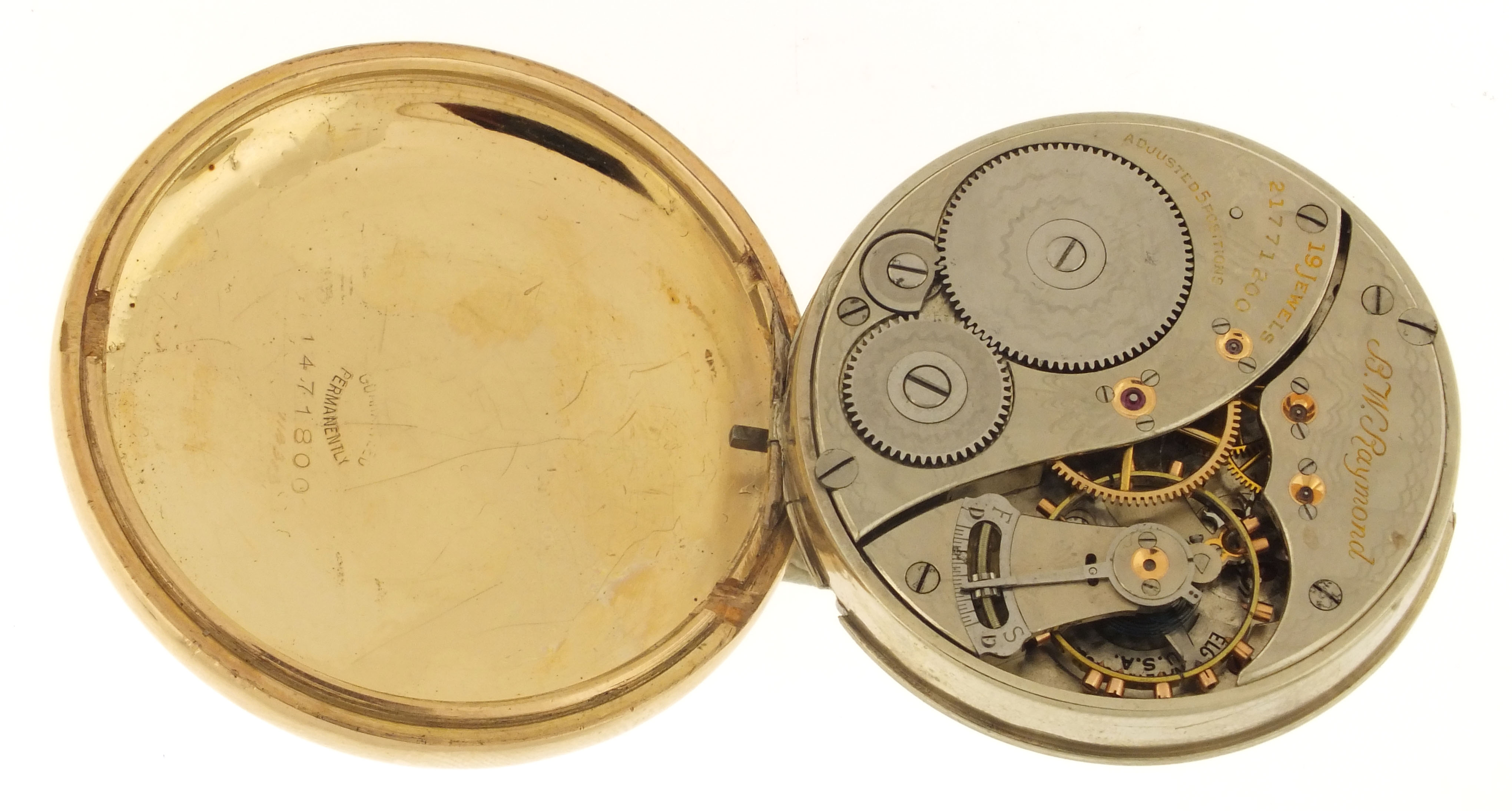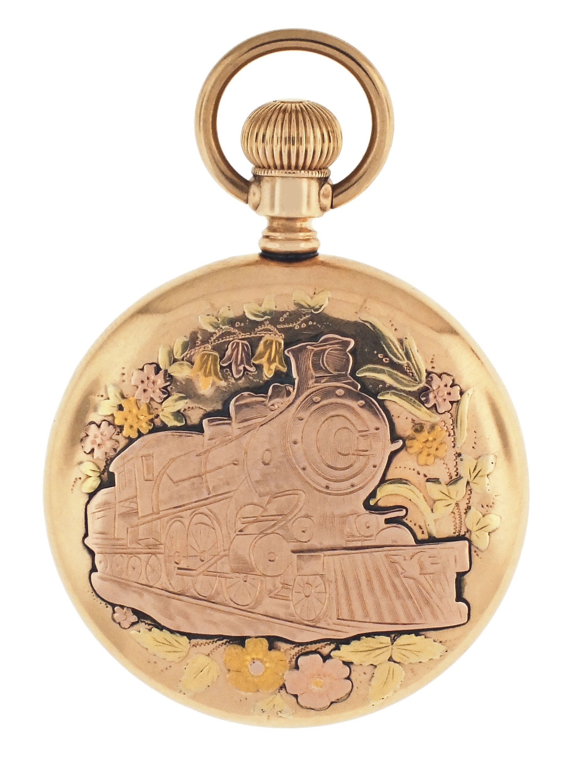 Elgin National Watch Co., Elgin, Illinois, a "B.W. Raymond" pocket watch with wind indicator, 16 size, 19 jewels, stem wind and lever set, adjusted to 5 positions, temperature and isochronism, damascened nickel plate movement with lever escapement, cut bimetallic balance with gold screws, gold jewel settings, and micrometric regulator in a gold filled, swingout open face case, the back with rose gold locomotive, surrounded by applied, four color gold flowers and foliage, arabic numeral, double sunk white enamel dial with depressions for luminous compound at the hours, and blued steel spade and poker hands, serial #21771200